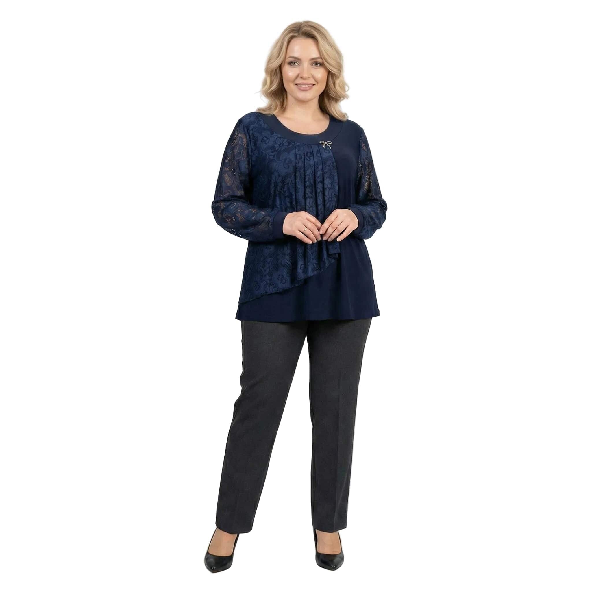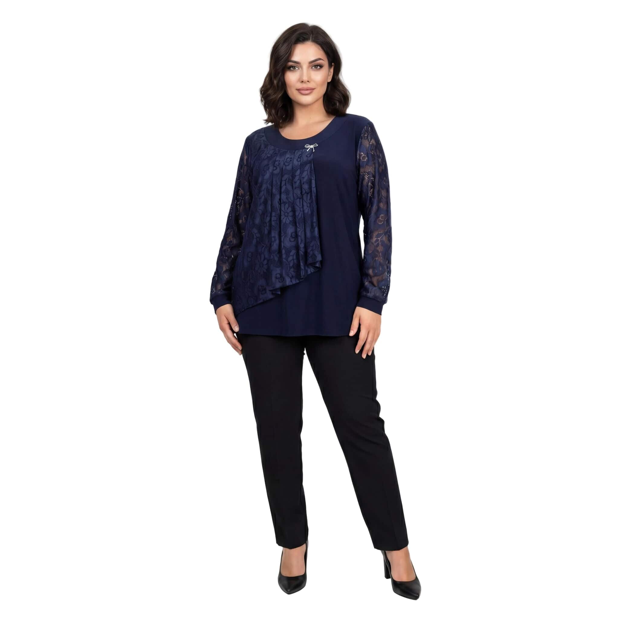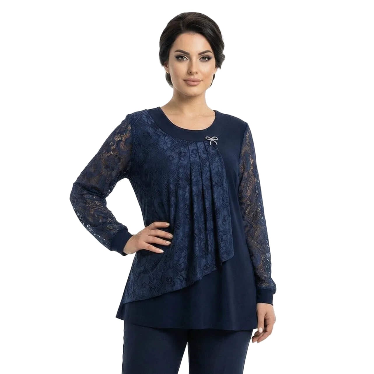 Подарете си изтънчена визия и безупречен комфорт с тази официална макси туника в класическо тъмносиньо. Моделът е създаден с мисъл за дамите, които ценят елегантността, съчетавайки гладко и падащо тежко трико с ефирни елементи от нежна флорална дантела. Асиметричният дантелен панел в предната част и прозрачните дантелени ръкави с плътни маншети придават фееричност и дълбочина на силуета. Дискретната брошка на деколтето добавя финален щрих на лукс, превръщайки тази туника в перфектния избор за официални събития, празнични вечери или стилни коктейли през есенно-зимния сезон. Меката и еластична материя осигурява свобода на движението, подчертавайки женствеността с грация и стил.