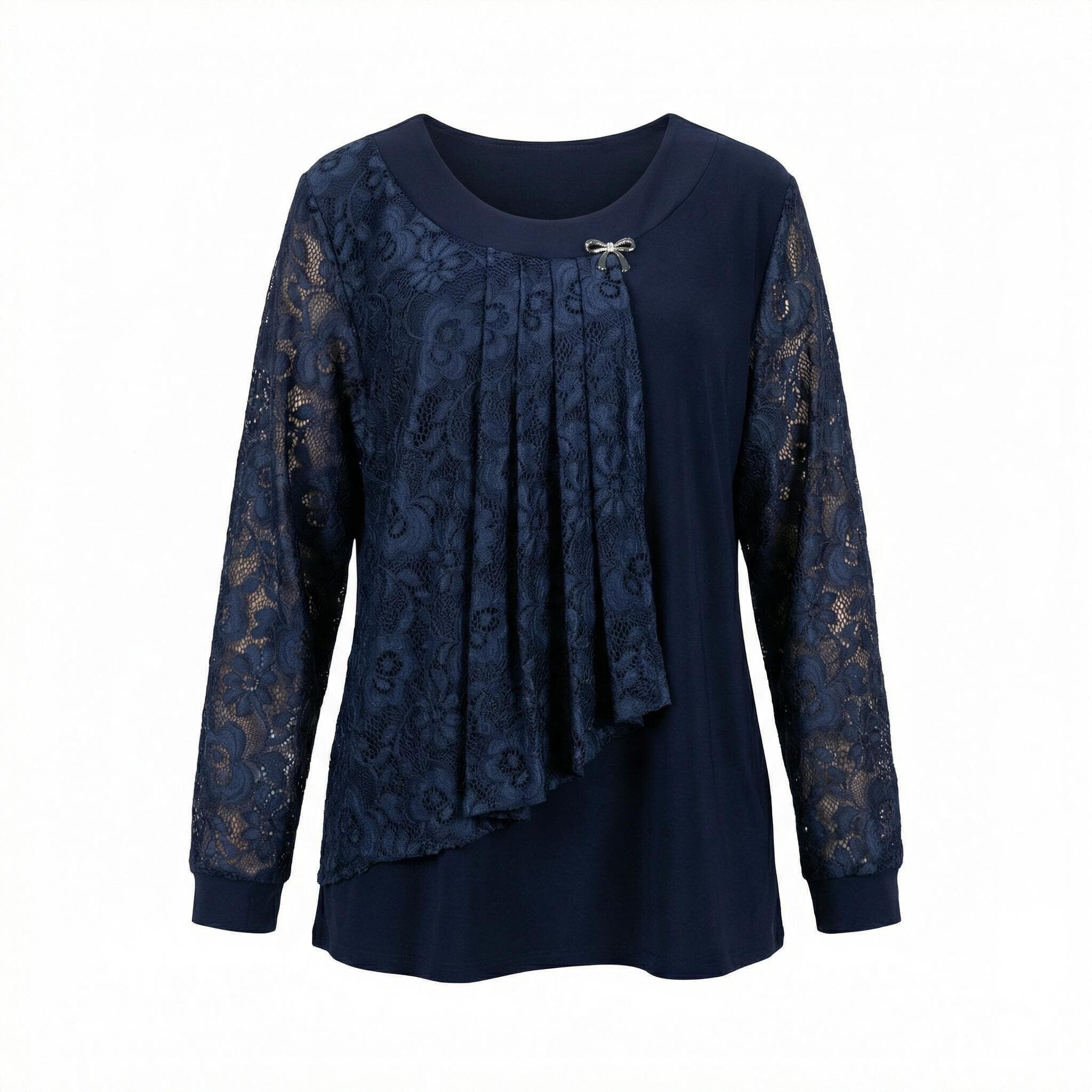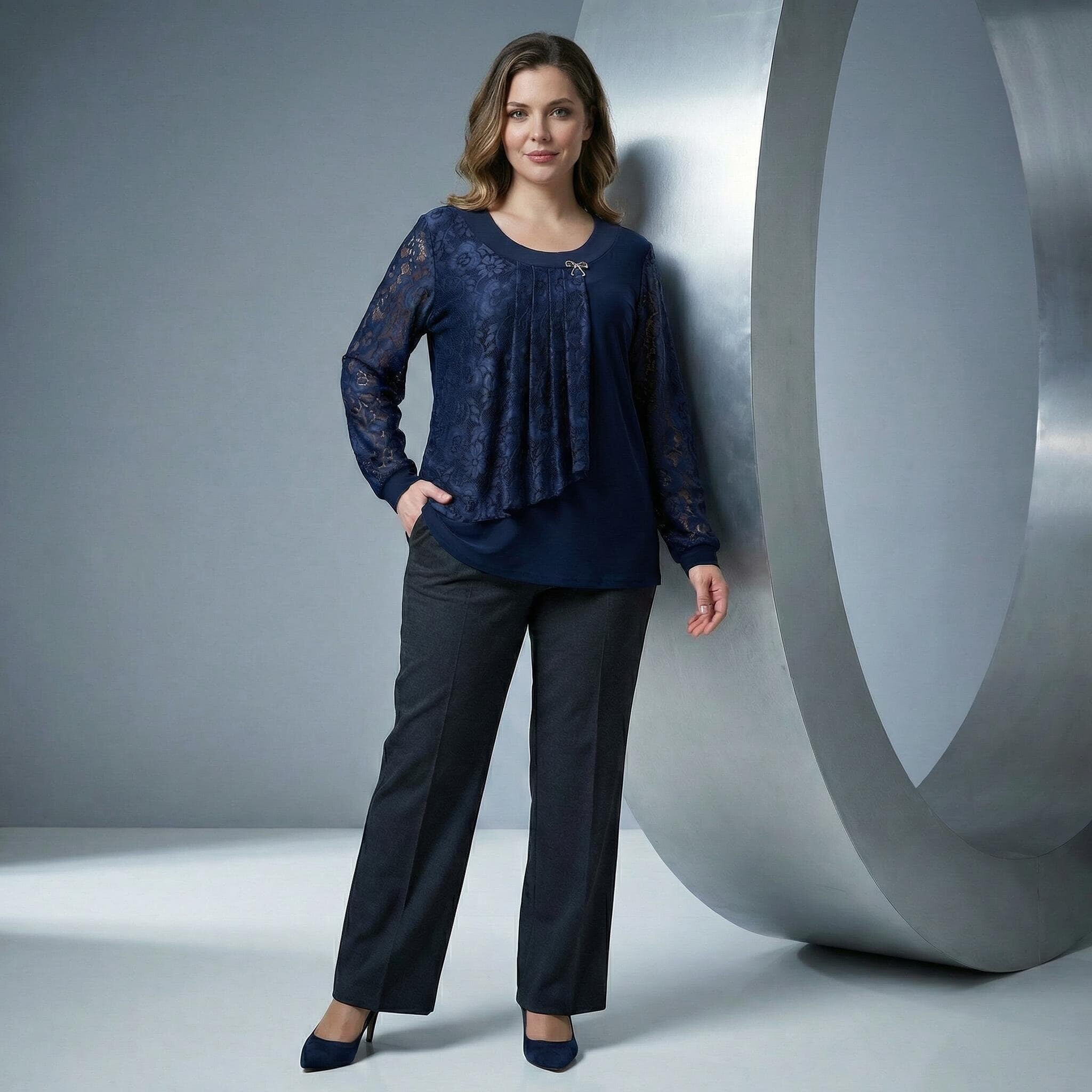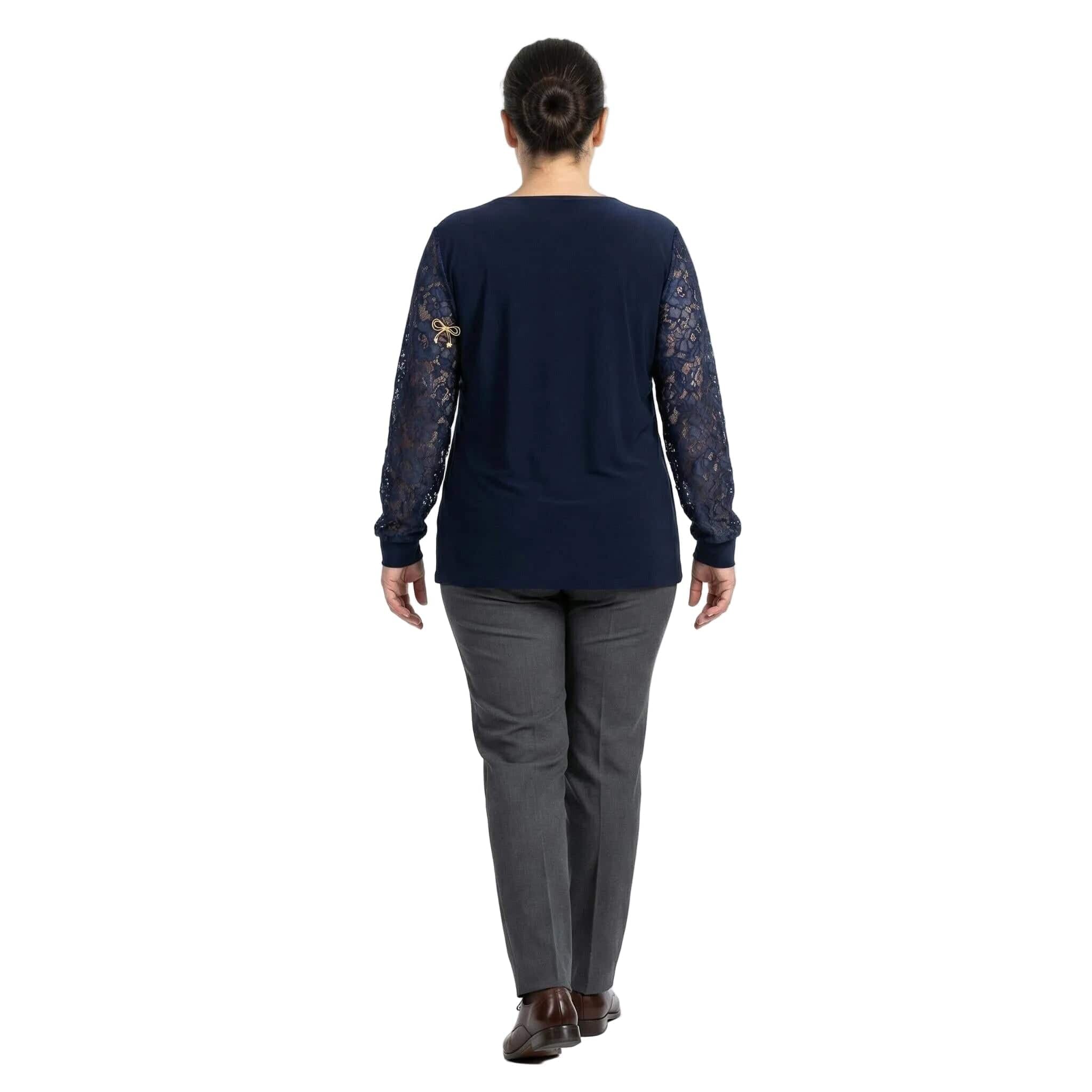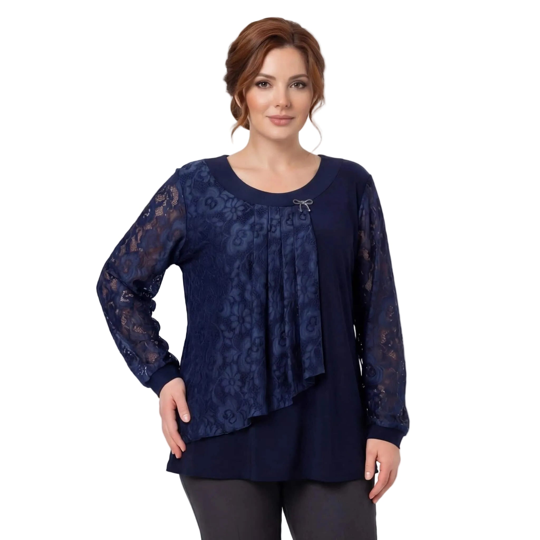 Подарете си изтънчена визия и безупречен комфорт с тази официална макси туника в класическо тъмносиньо. Моделът е създаден с мисъл за дамите, които ценят елегантността, съчетавайки гладко и падащо тежко трико с ефирни елементи от нежна флорална дантела. Асиметричният дантелен панел в предната част и прозрачните дантелени ръкави с плътни маншети придават фееричност и дълбочина на силуета. Дискретната брошка на деколтето добавя финален щрих на лукс, превръщайки тази туника в перфектния избор за официални събития, празнични вечери или стилни коктейли през есенно-зимния сезон. Меката и еластична материя осигурява свобода на движението, подчертавайки женствеността с грация и стил.