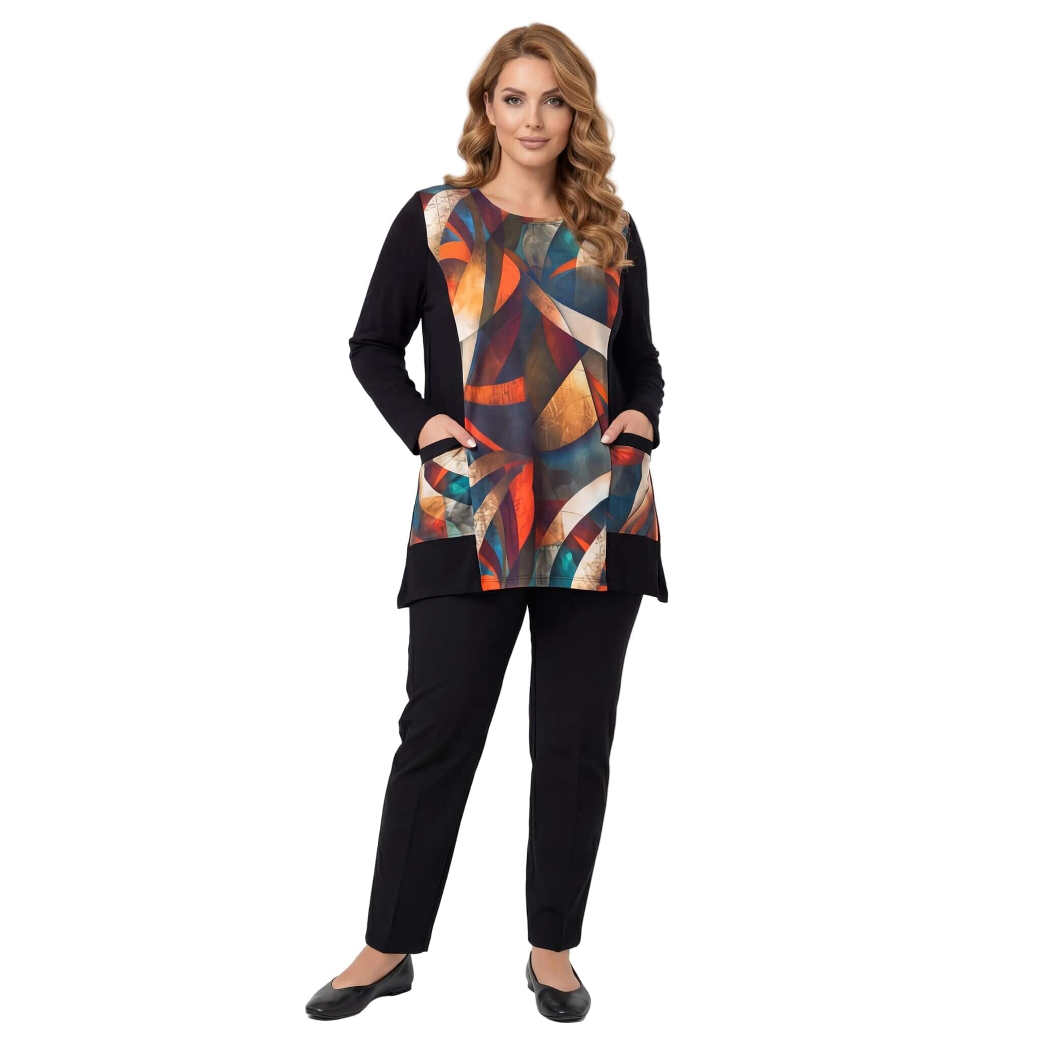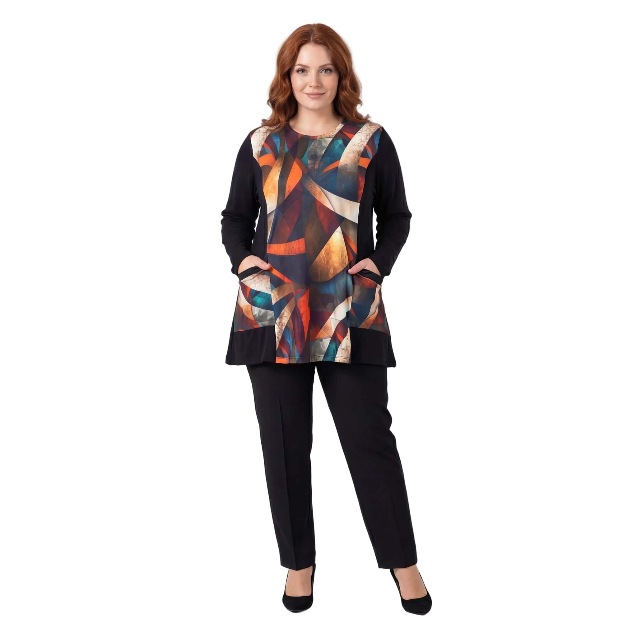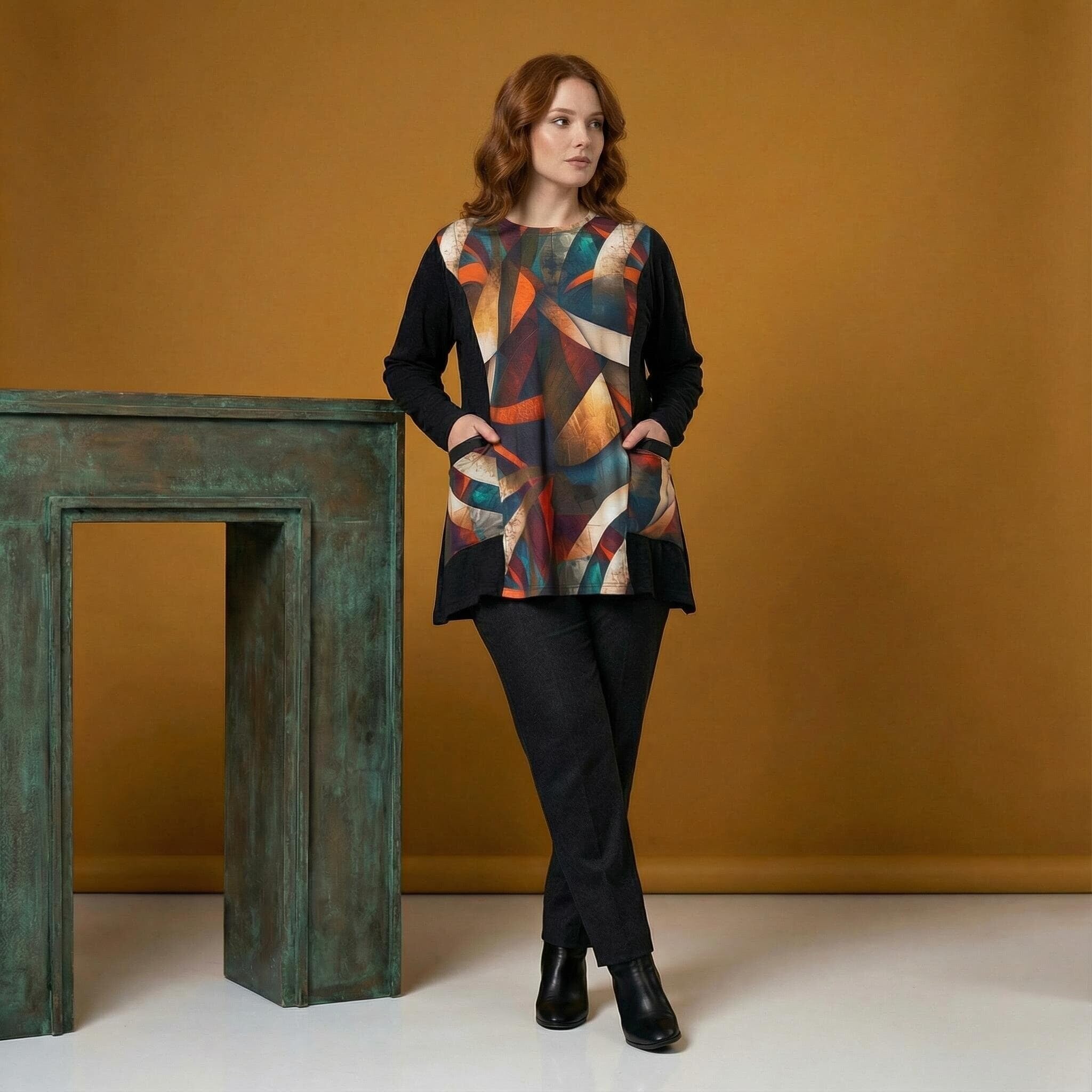Открийте перфектния баланс между комфорт и артистичен шик с нашата нова есенно-зимна туника. Създадена специално за дамата, която иска да изглежда изискано, без да жертва удобството, този модел впечатлява със своя дизайн. Черната основа визуално издължава силуета, докато предният панел с абстрактен геометричен принт в оранжево, тюркоазено и бежово привлича погледа и добавя модерно, артистично излъчване. Меката плетена материя с високо съдържание на памук пада тежко и гладко, осигурявайки топлина и нежна прегръдка за кожата.