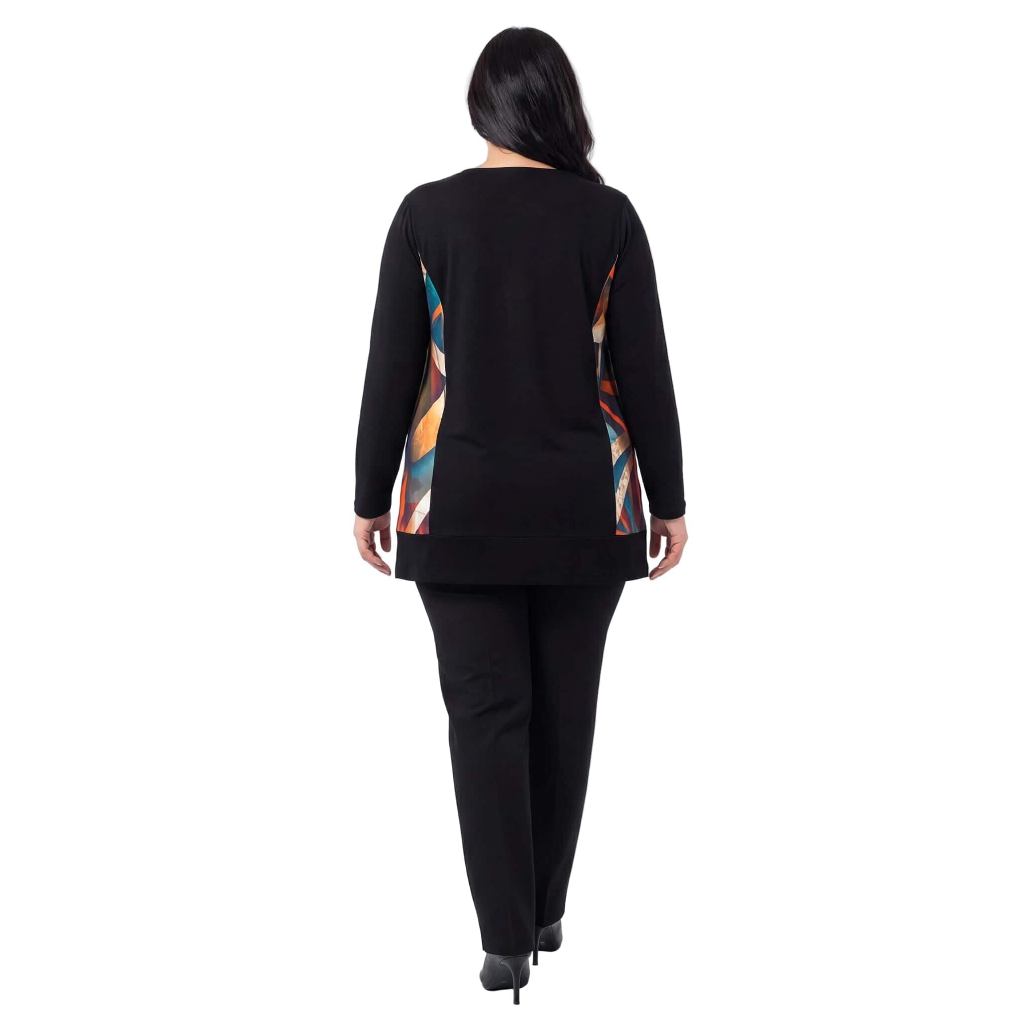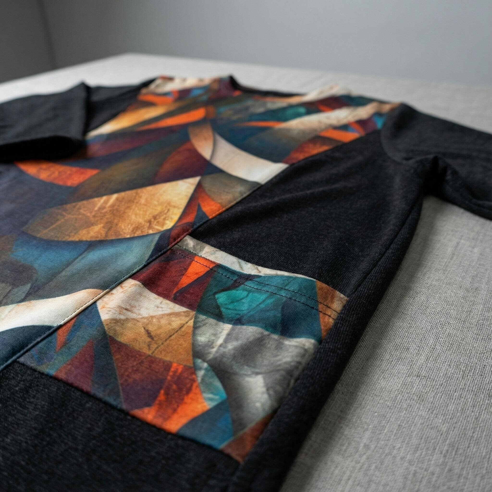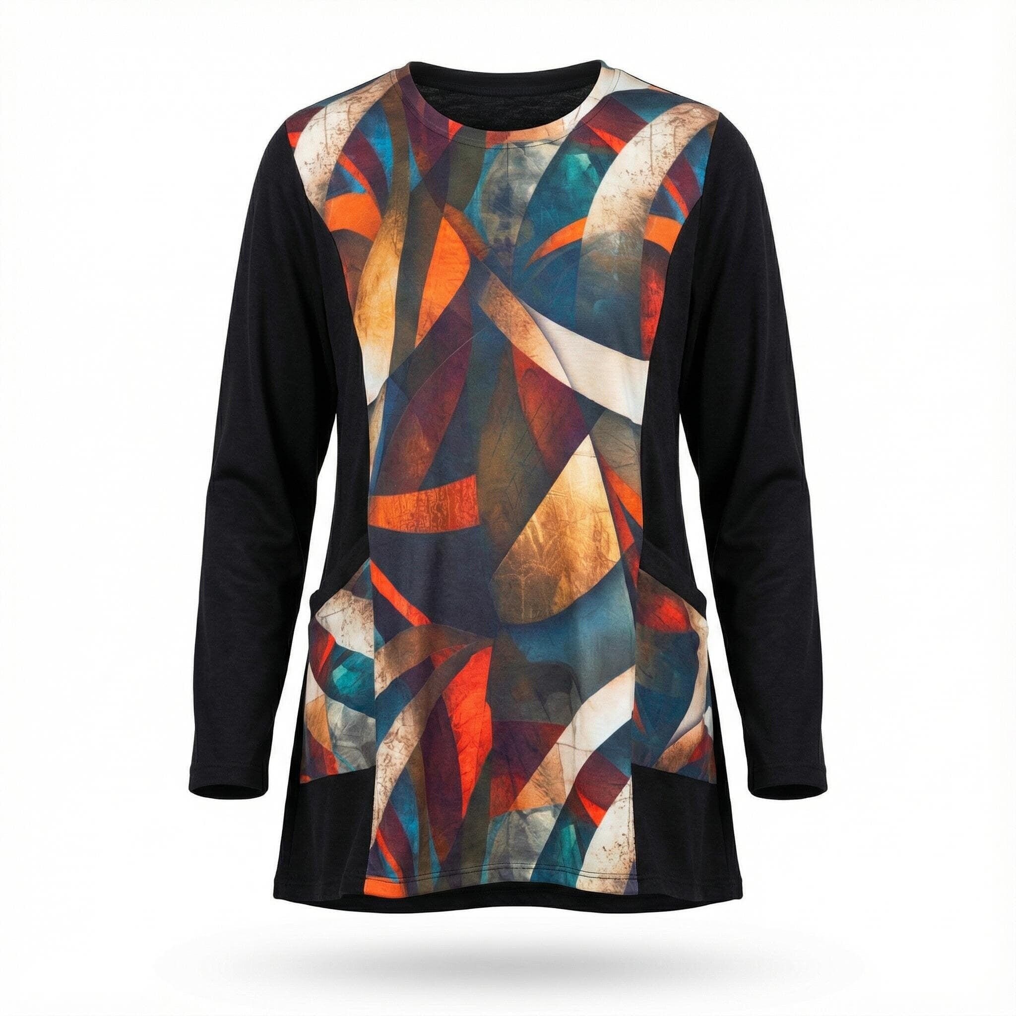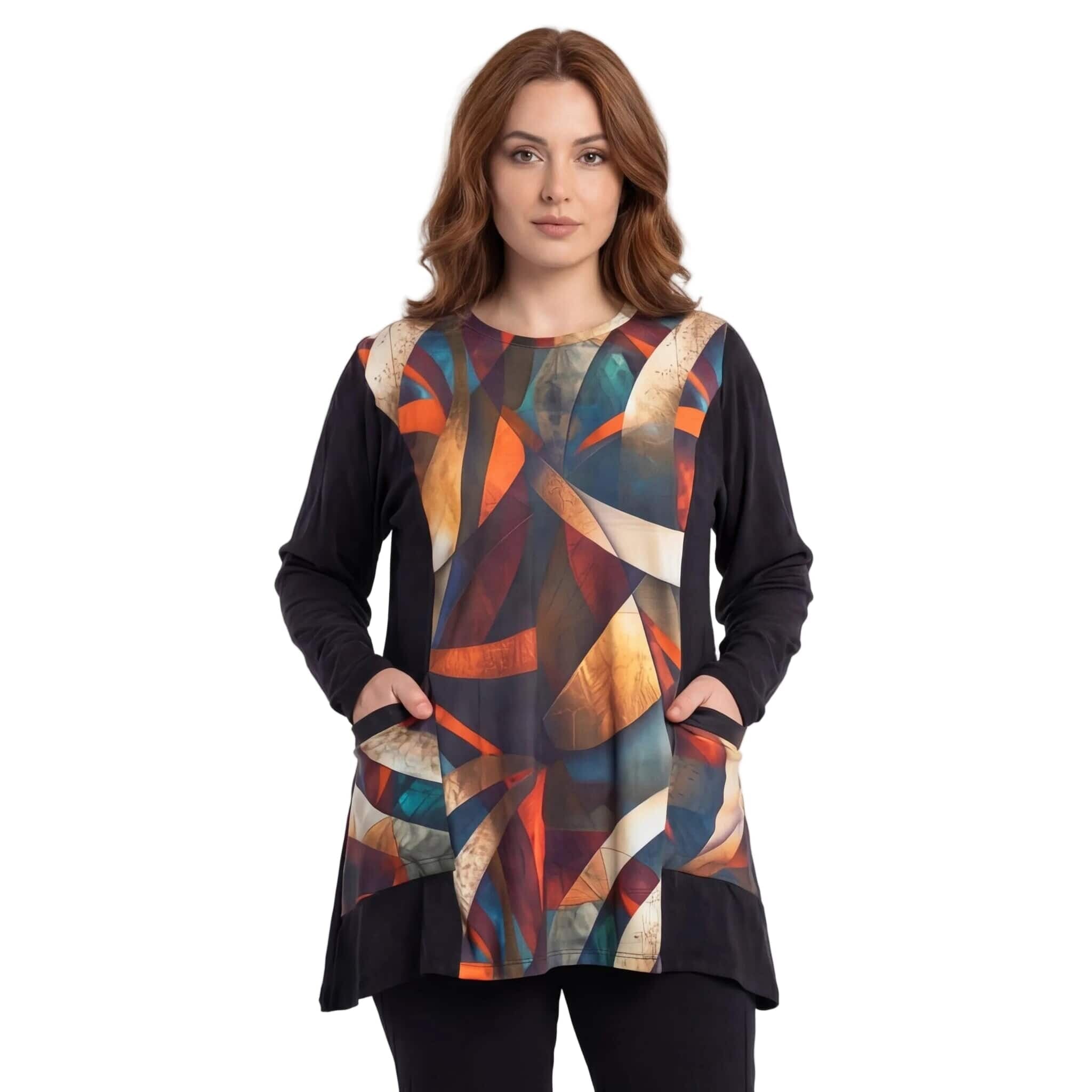 Открийте перфектния баланс между комфорт и артистичен шик с нашата нова есенно-зимна туника. Създадена специално за дамата, която иска да изглежда изискано, без да жертва удобството, този модел впечатлява със своя дизайн. Черната основа визуално издължава силуета, докато предният панел с абстрактен геометричен принт в оранжево, тюркоазено и бежово привлича погледа и добавя модерно, артистично излъчване. Меката плетена материя с високо съдържание на памук пада тежко и гладко, осигурявайки топлина и нежна прегръдка за кожата.