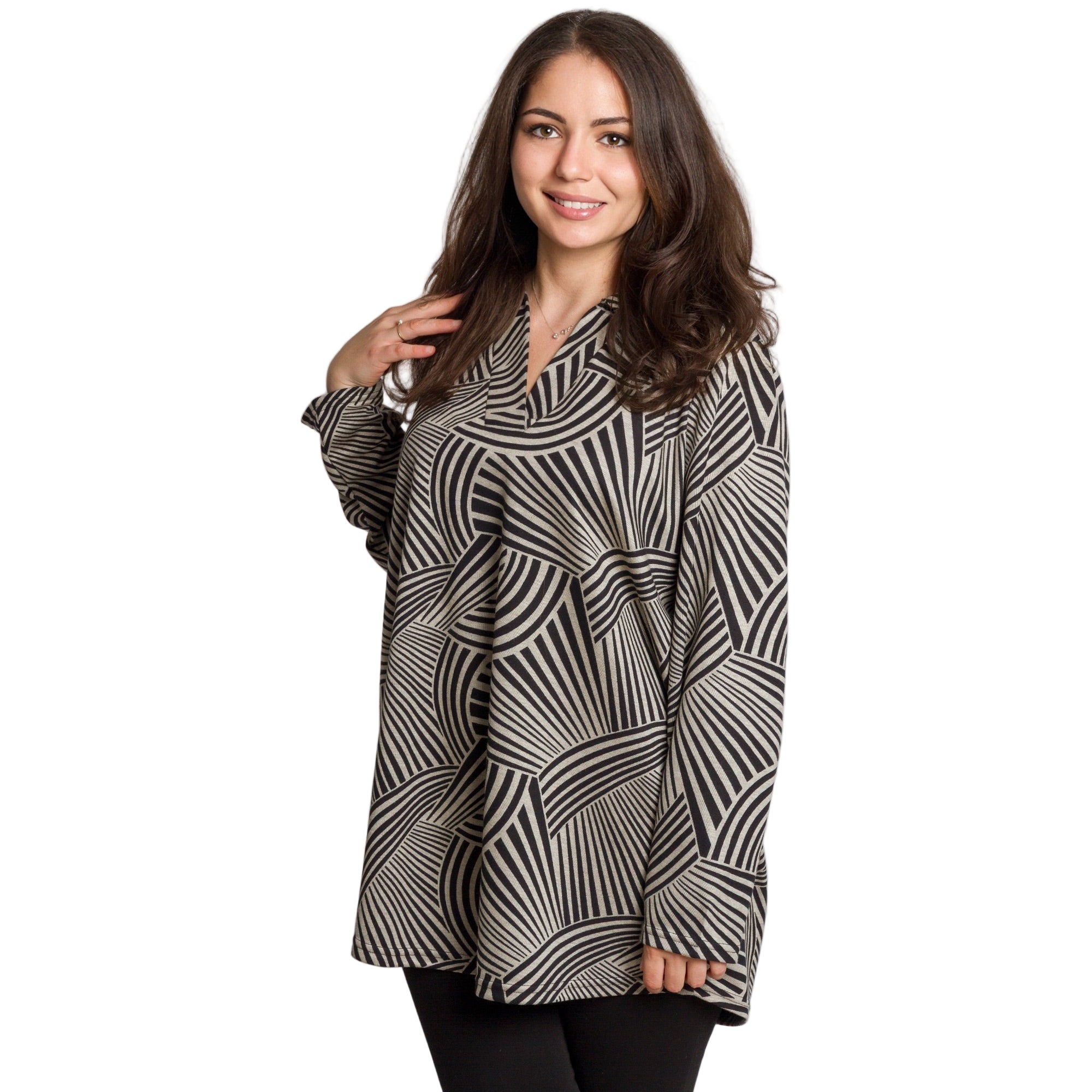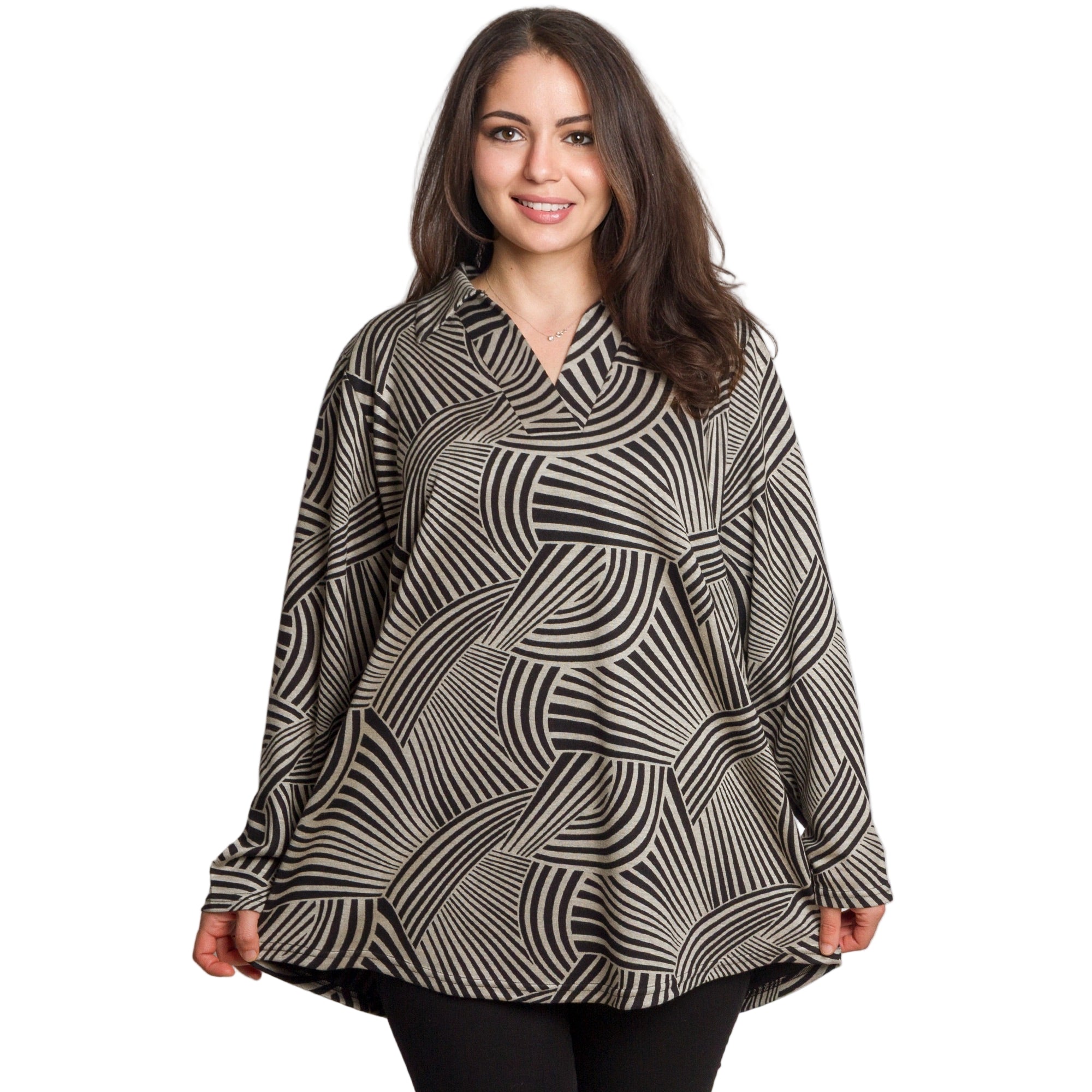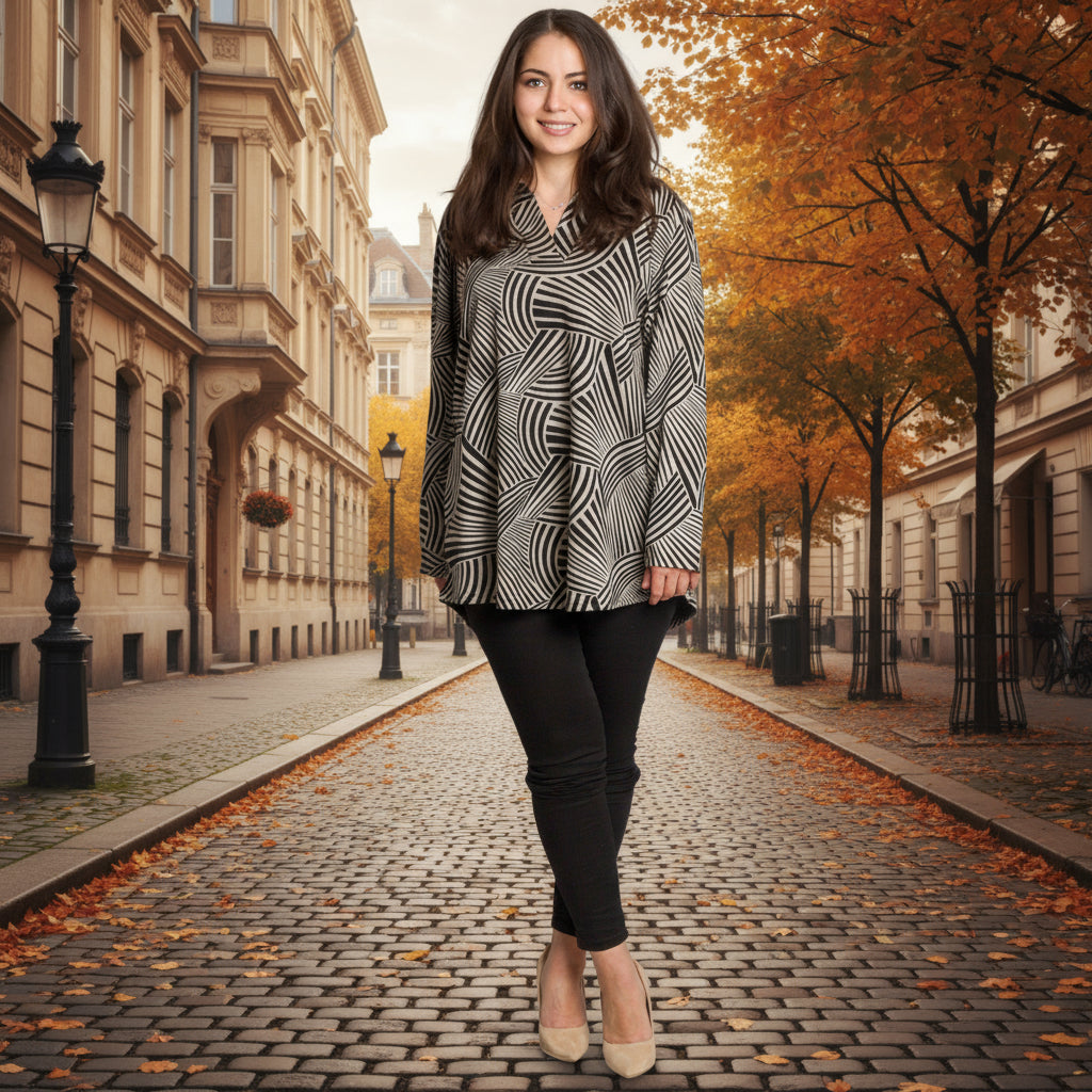 Елегантна туника в големи размери, изработена от висококачествена еластична материя, която осигурява комфорт и свобода на движение. Моделът впечатлява с изискан черно-бял геометричен принт с вълнообразни линии, които визуално издължават силуета. Туниката е с права кройка, V-образно деколте с яка и дълги ръкави — идеален избор за есенно-зимния сезон. Подходяща е както за ежедневието, така и за официални поводи, като лесно се комбинира с панталони, клин или пола.