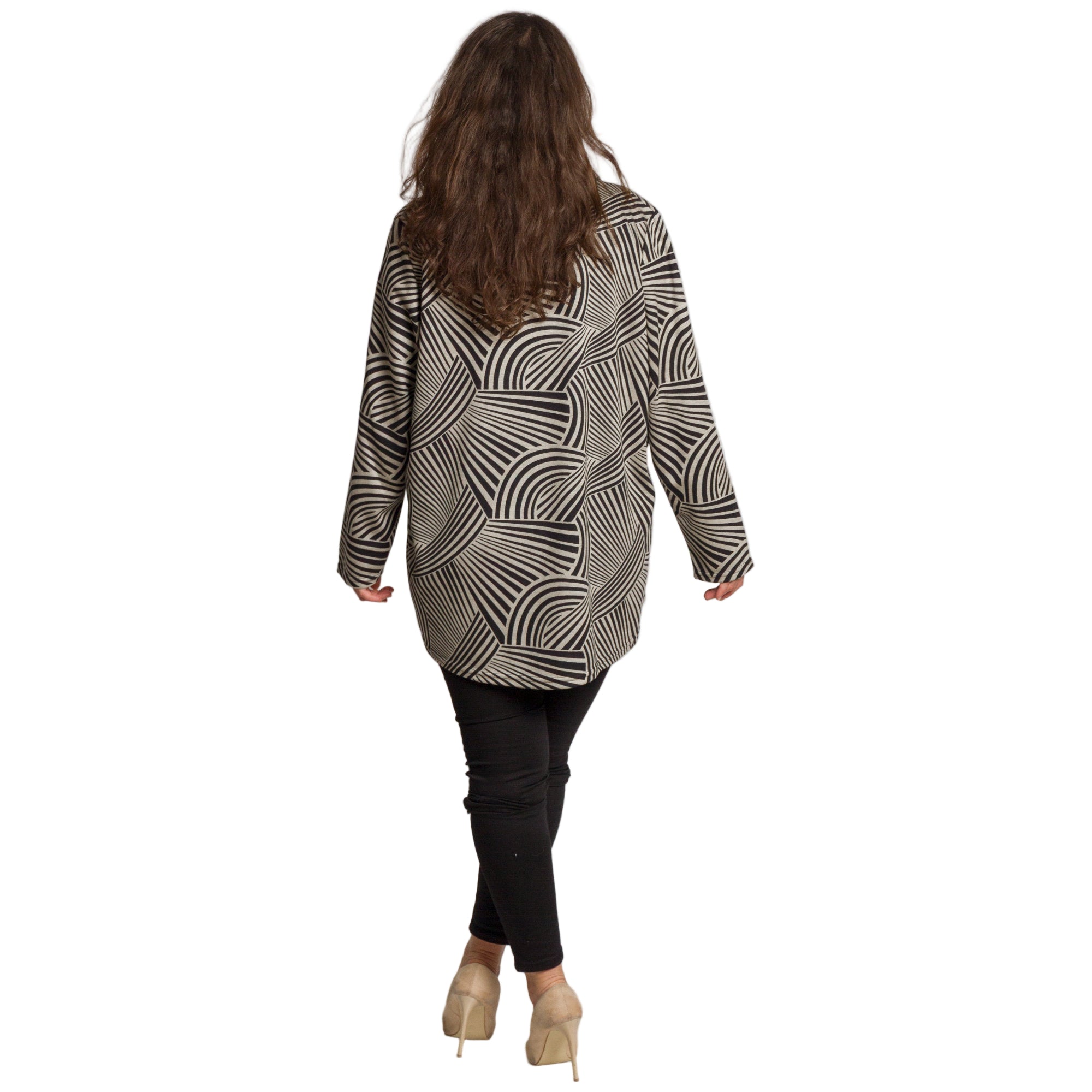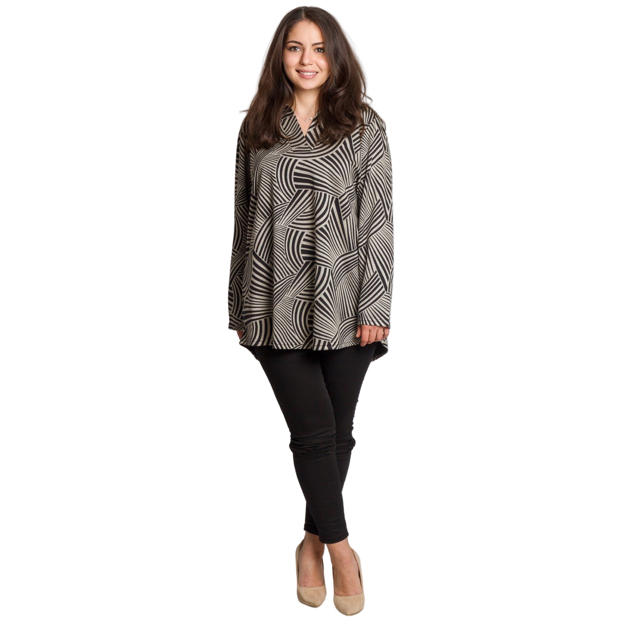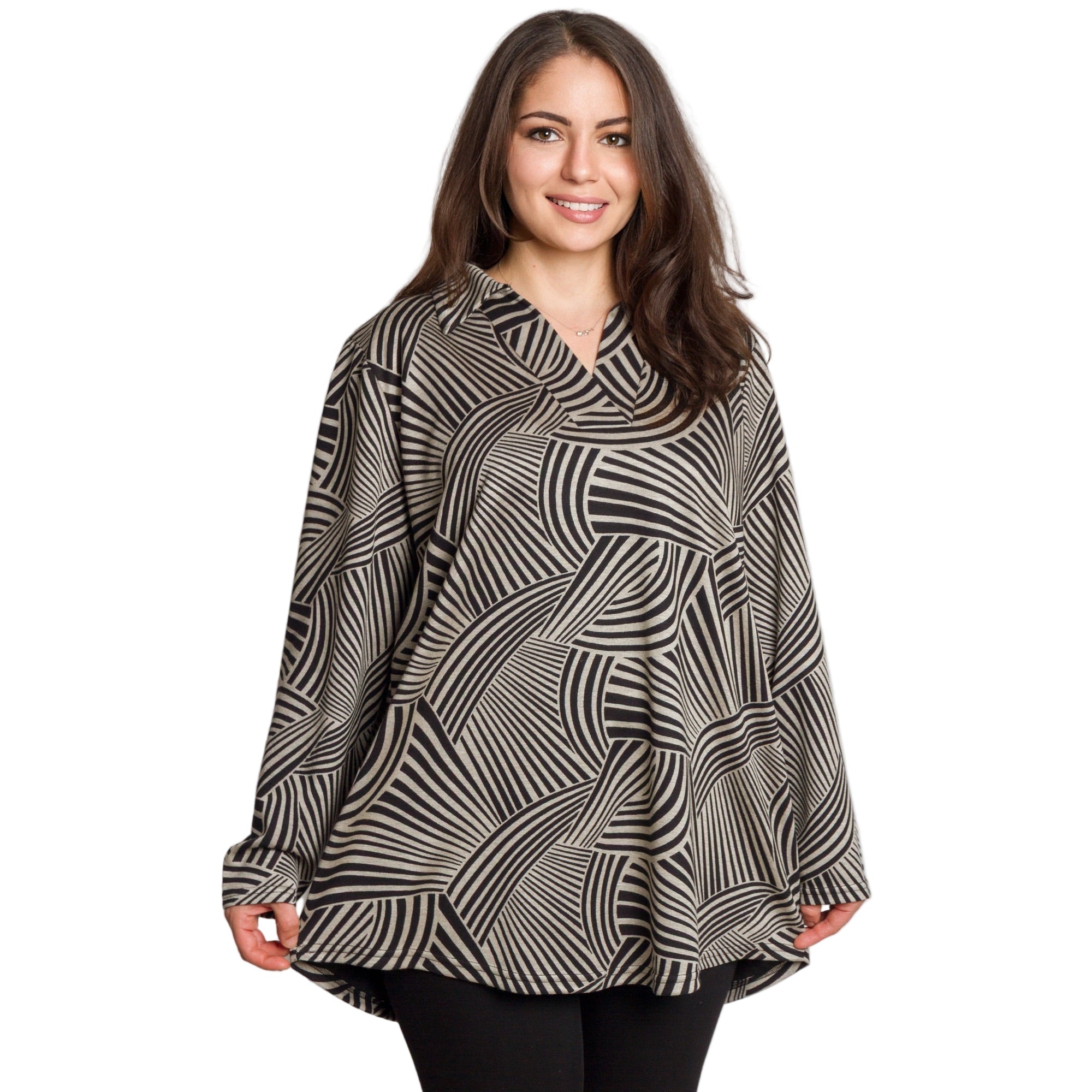 Елегантна туника в големи размери, изработена от висококачествена еластична материя, която осигурява комфорт и свобода на движение. Моделът впечатлява с изискан черно-бял геометричен принт с вълнообразни линии, които визуално издължават силуета. Туниката е с права кройка, V-образно деколте с яка и дълги ръкави — идеален избор за есенно-зимния сезон. Подходяща е както за ежедневието, така и за официални поводи, като лесно се комбинира с панталони, клин или пола.