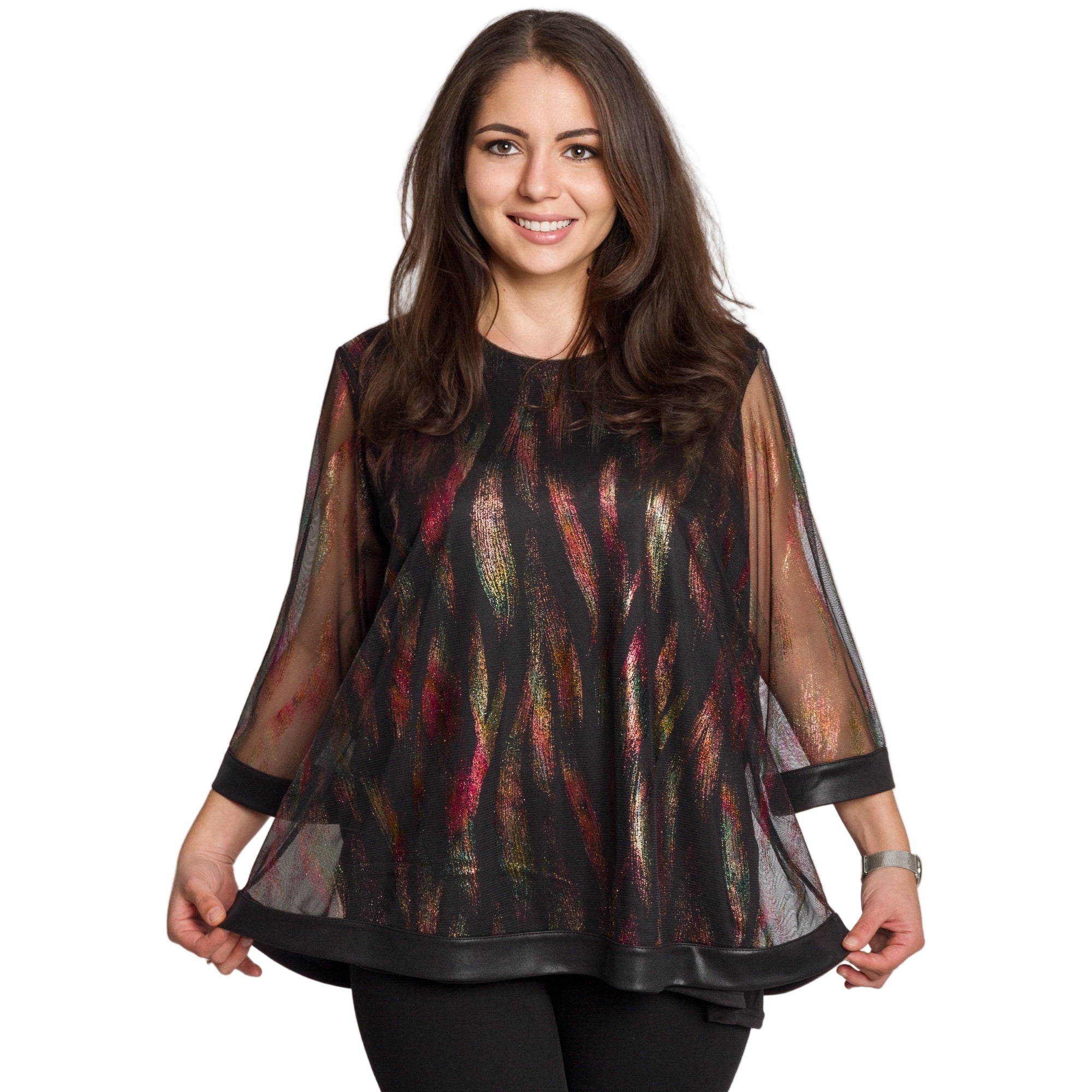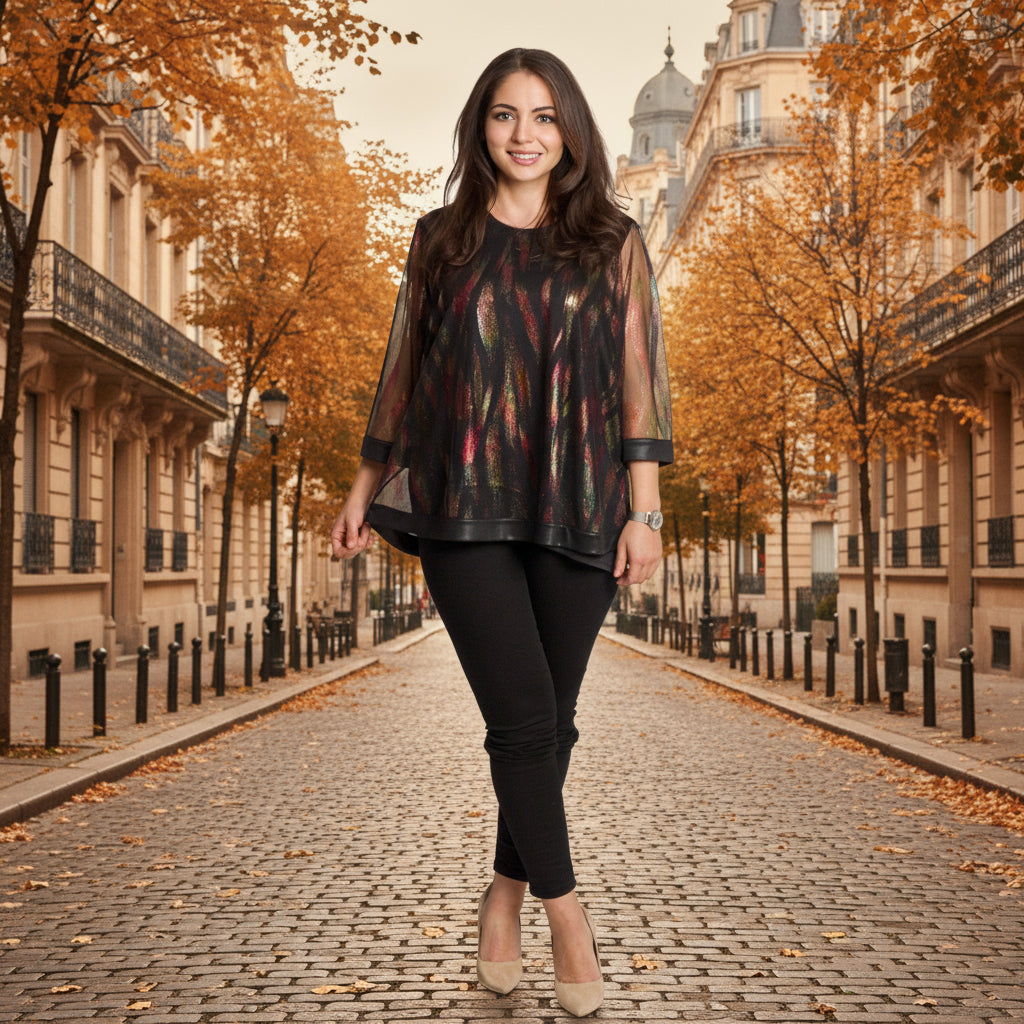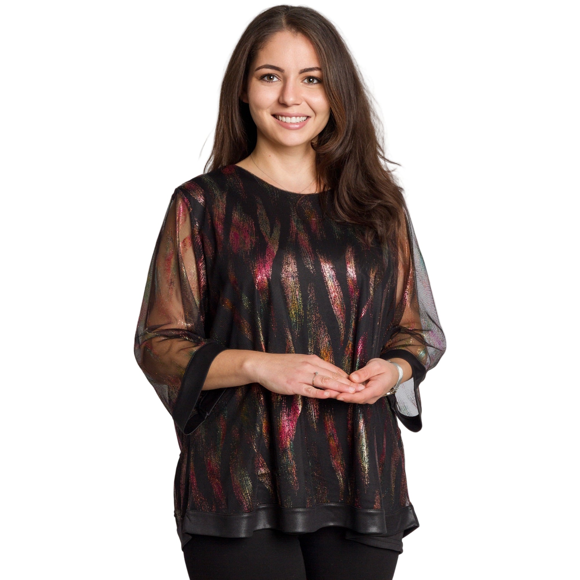 Тази елегантна туника в черен цвят е идеалният избор за официални поводи през есенно-зимния сезон. Изработена е от висококачествена материя с полиамид, полиестер и ликра, което я прави едновременно мека, еластична и удобна. Разкроената кройка подчертава силуета, без да ограничава движенията, а 3/4 ръкавите и обло деколте придават изтънчен и женствен вид. Подходяща е за комбинация с панталон или пола, както за вечерни излизания, така и за специални събития.