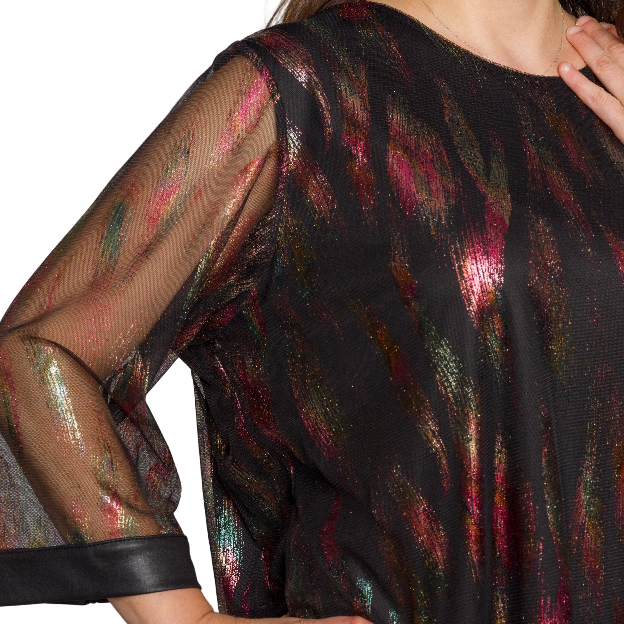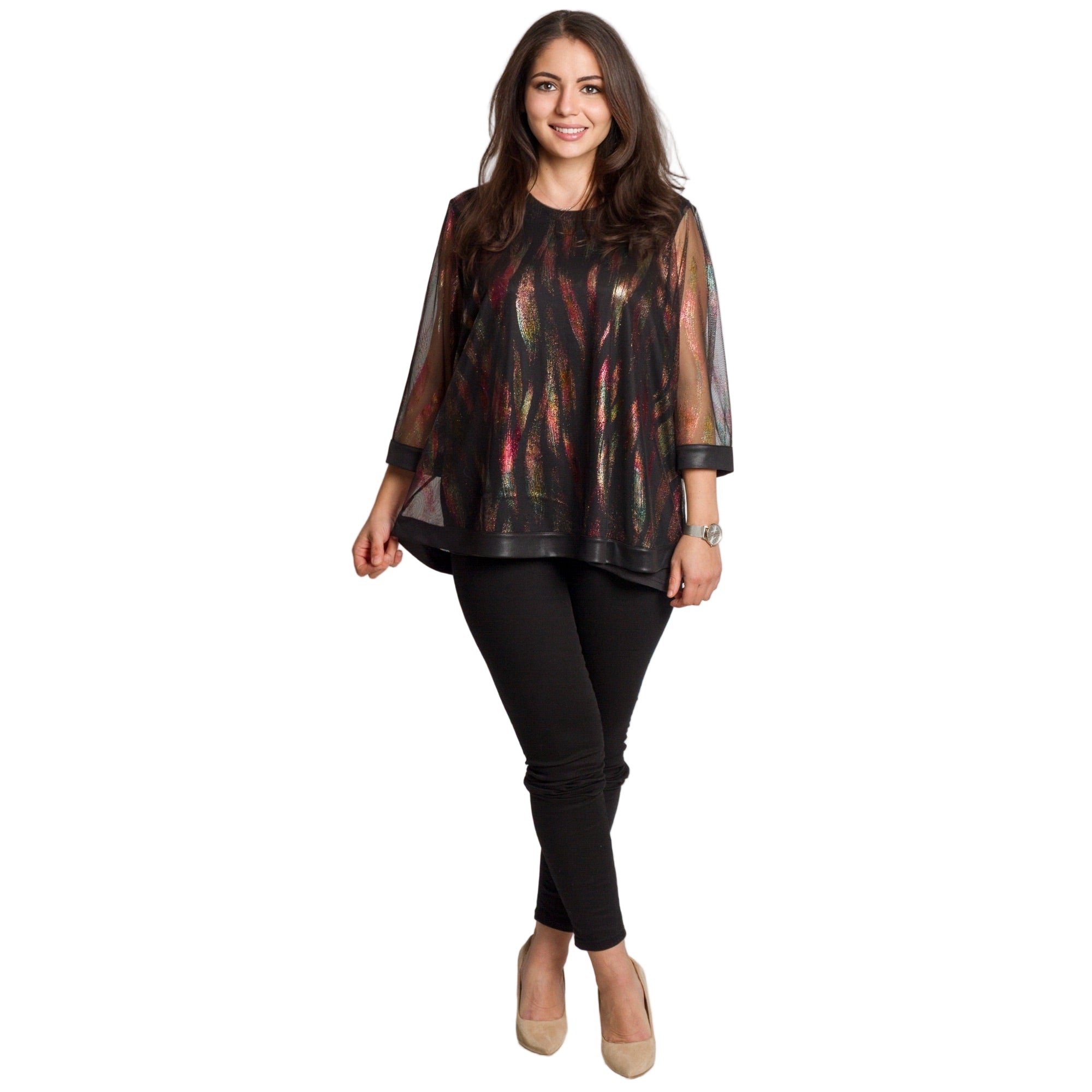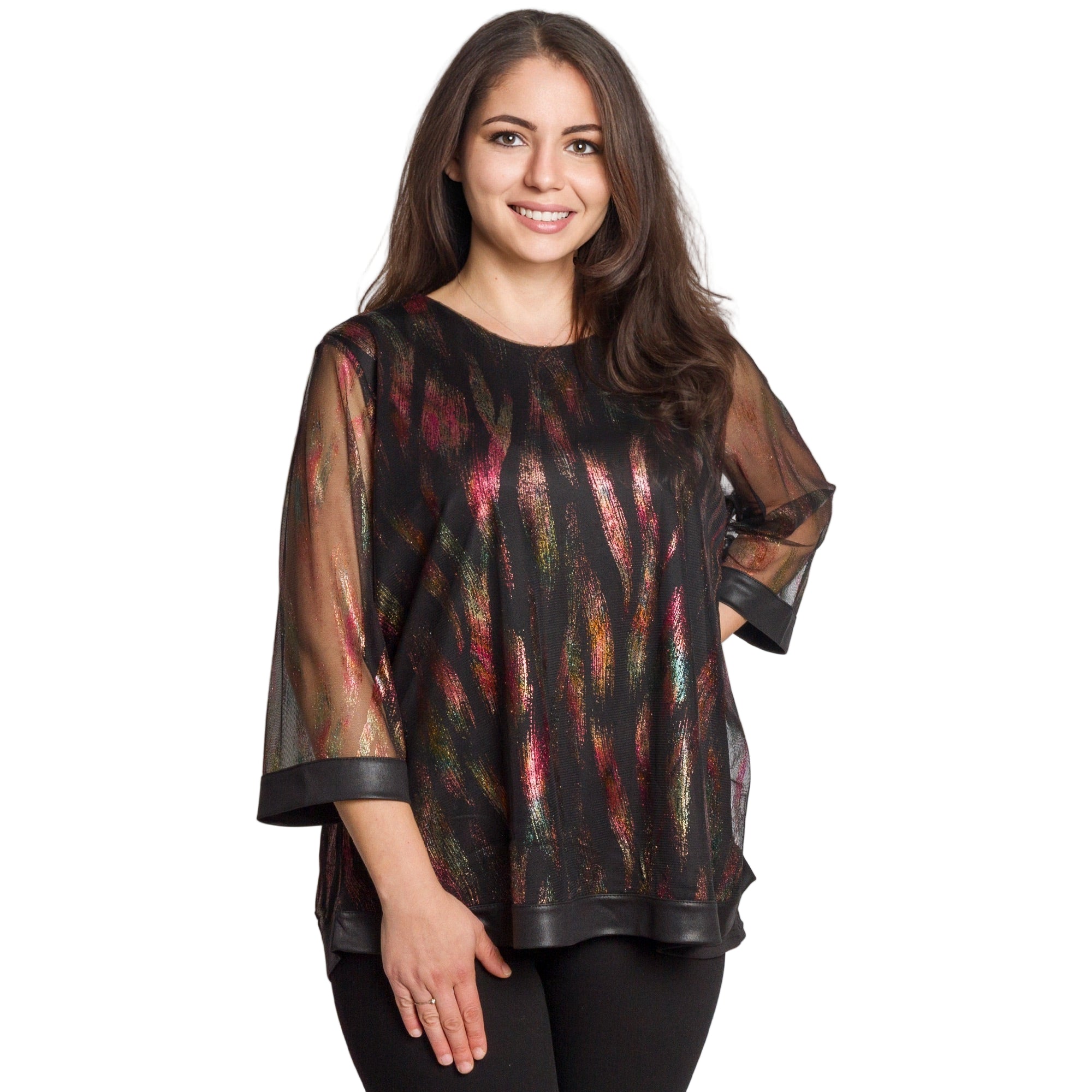 Тази елегантна туника в черен цвят е идеалният избор за официални поводи през есенно-зимния сезон. Изработена е от висококачествена материя с полиамид, полиестер и ликра, което я прави едновременно мека, еластична и удобна. Разкроената кройка подчертава силуета, без да ограничава движенията, а 3/4 ръкавите и обло деколте придават изтънчен и женствен вид. Подходяща е за комбинация с панталон или пола, както за вечерни излизания, така и за специални събития.