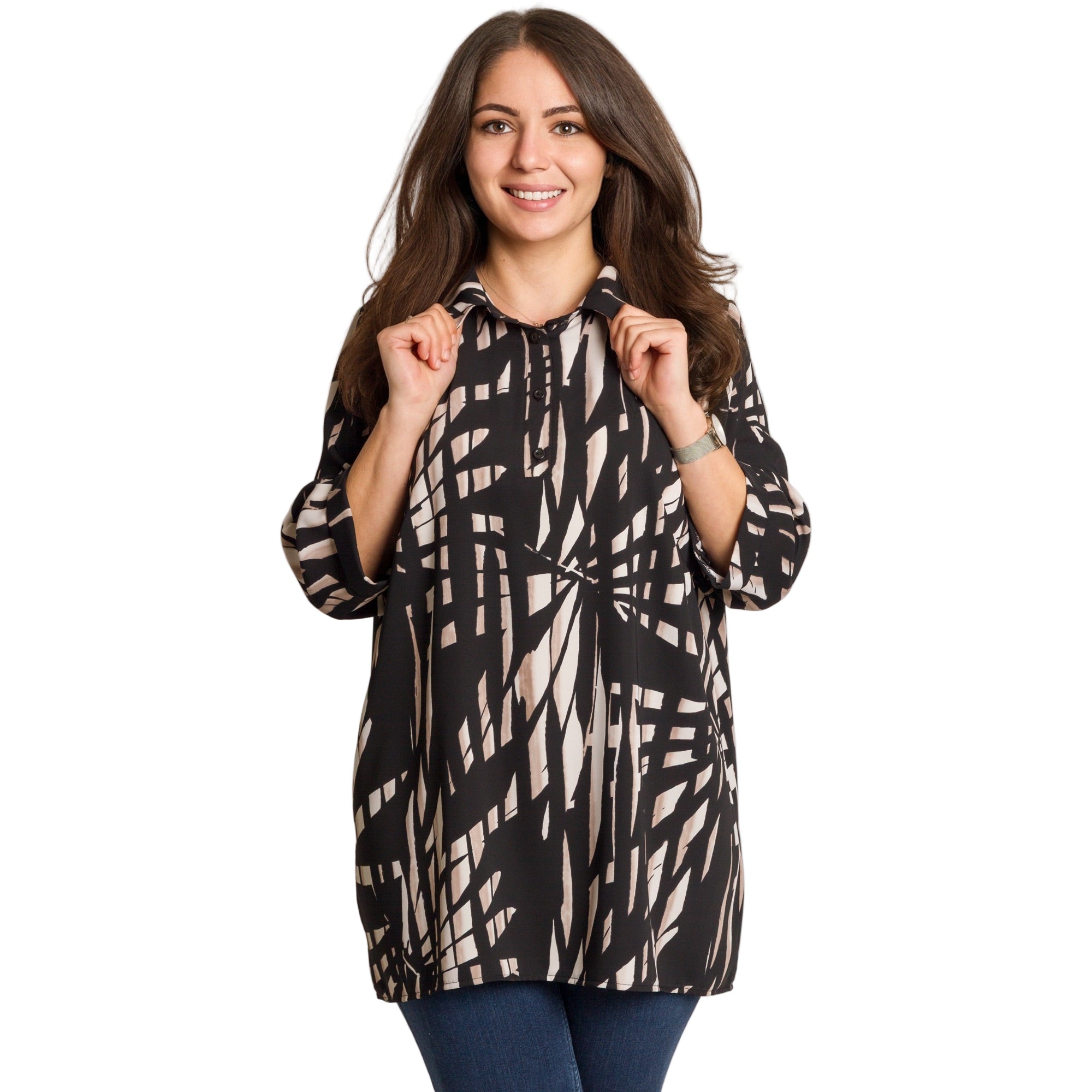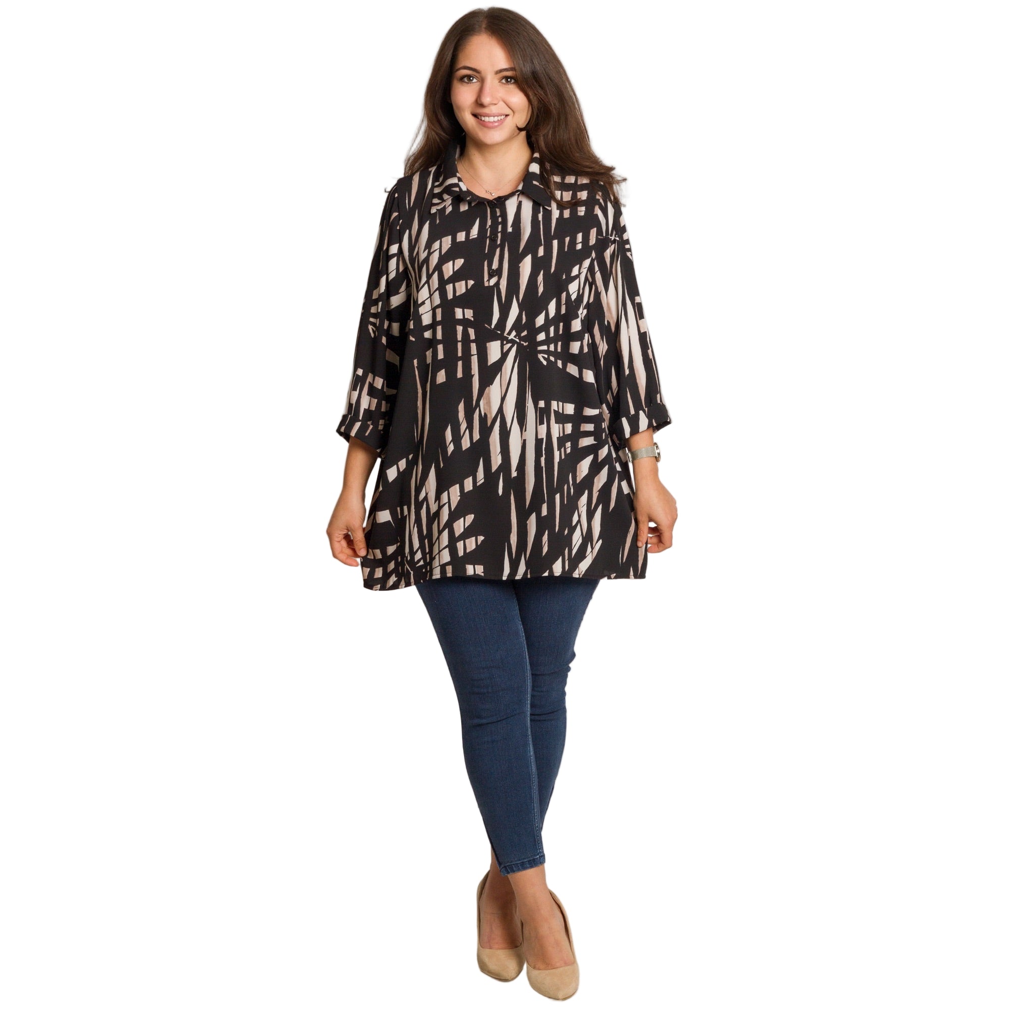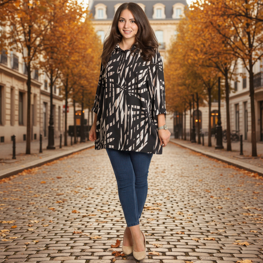 Елегантна дамска риза в черен цвят с ефектен геометричен принт в бежови тонове. Моделът е изработен от 100% памук – лека, дишаща и комфортна материя, подходяща за целодневно носене. Кройката е свободна, осигуряваща свобода на движение и удобство. Ризата има класическа яка и частично закопчаване с копчета, което я прави подходяща както за ежедневни визии, така и за по-официални поводи.