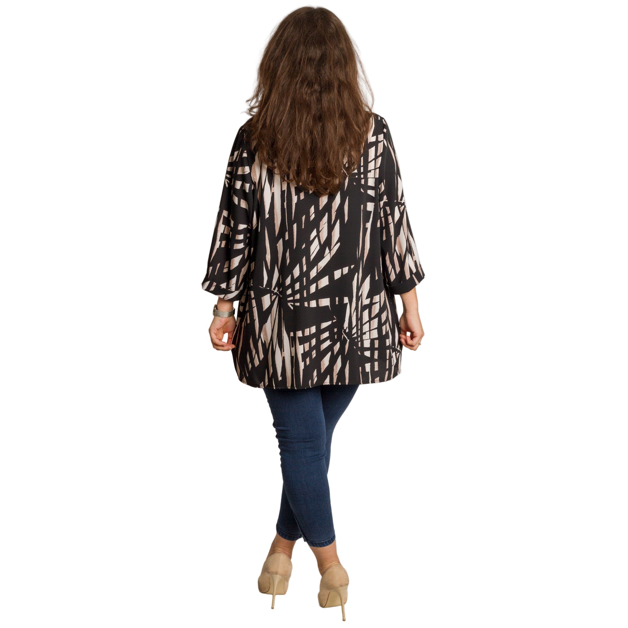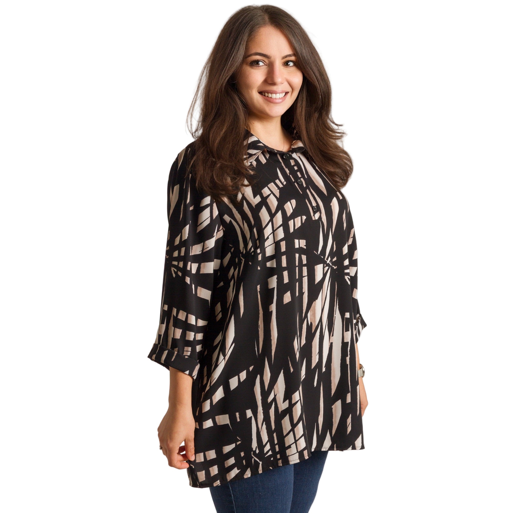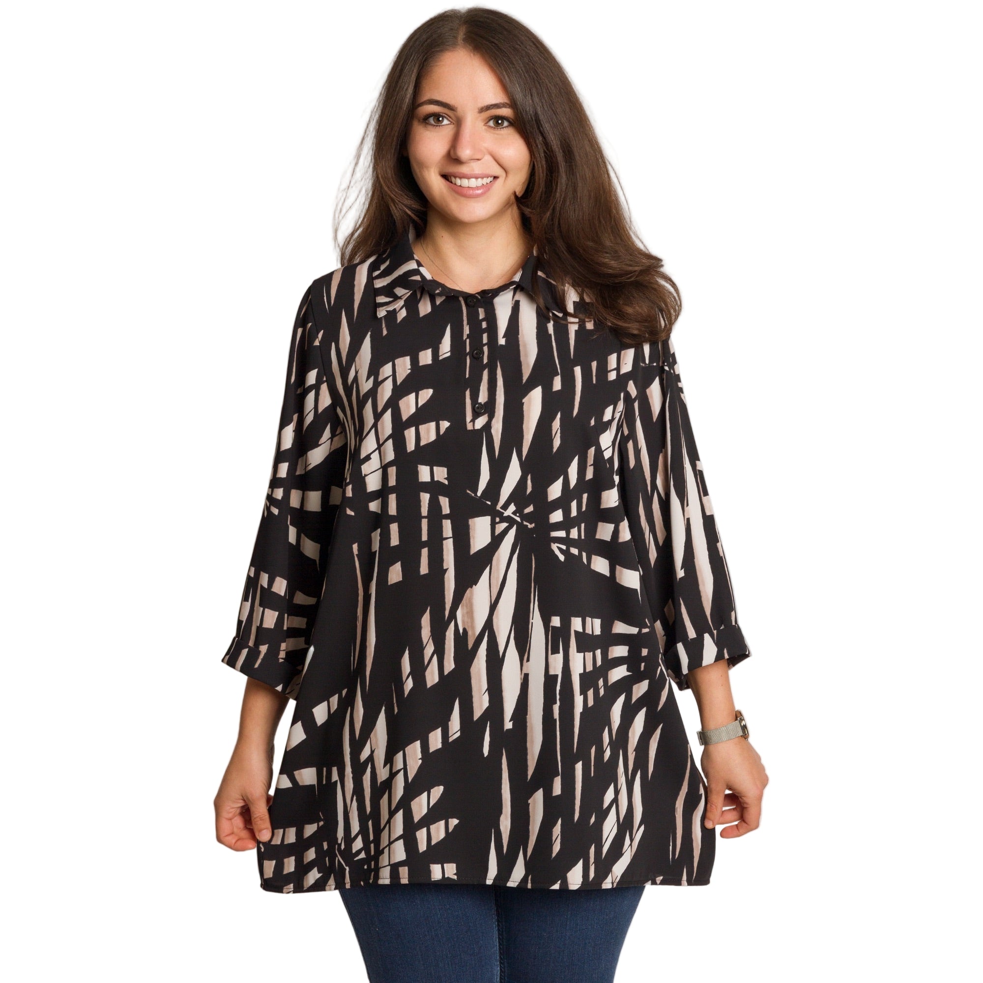 Елегантна дамска риза в черен цвят с ефектен геометричен принт в бежови тонове. Моделът е изработен от 100% памук – лека, дишаща и комфортна материя, подходяща за целодневно носене. Кройката е свободна, осигуряваща свобода на движение и удобство. Ризата има класическа яка и частично закопчаване с копчета, което я прави подходяща както за ежедневни визии, така и за по-официални поводи.