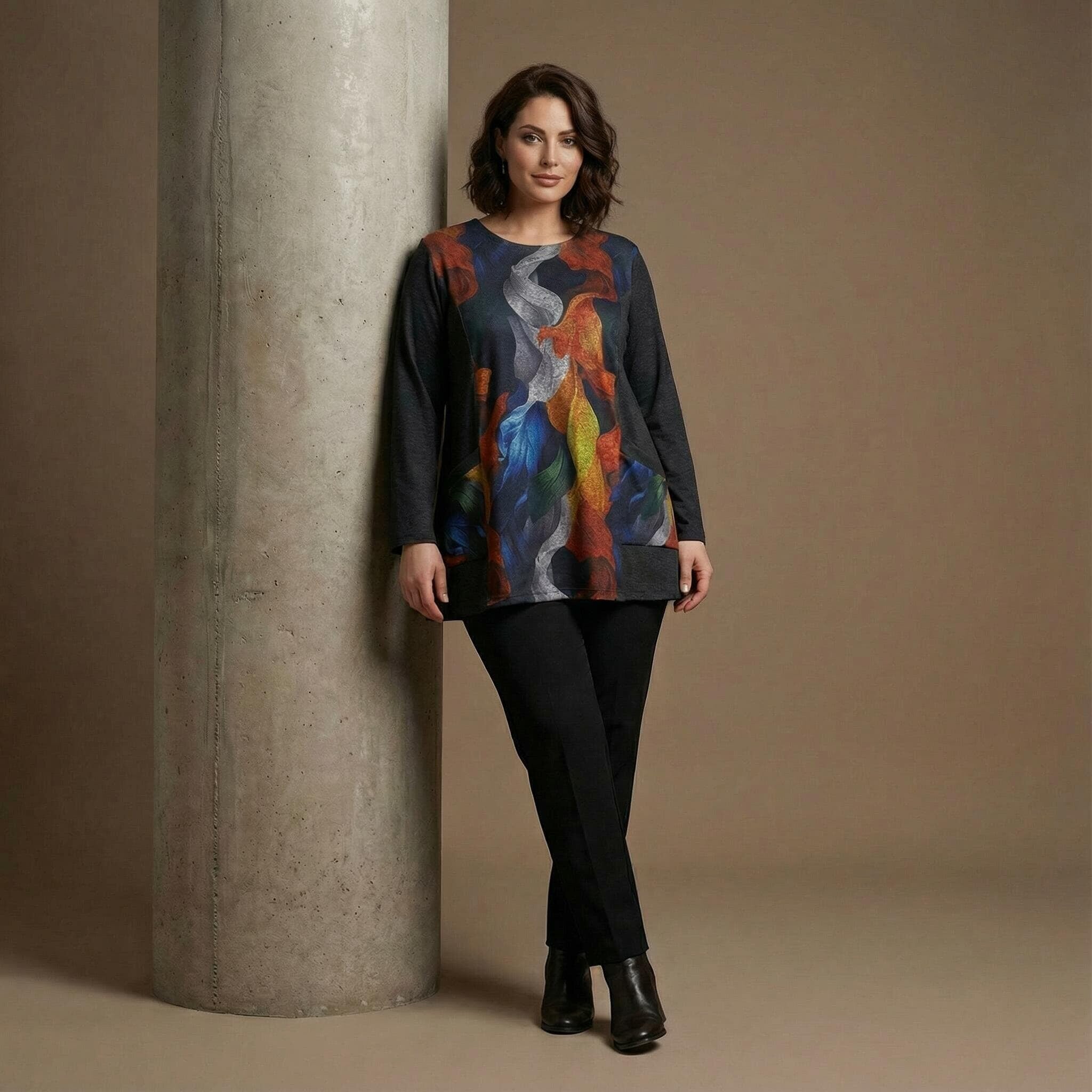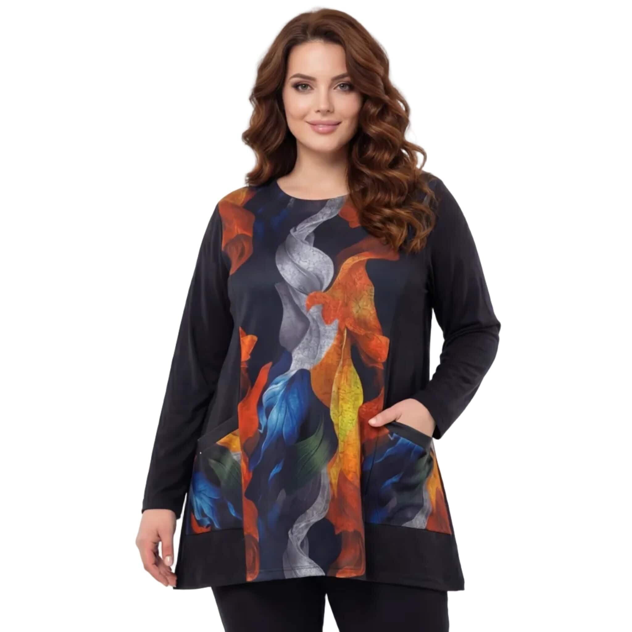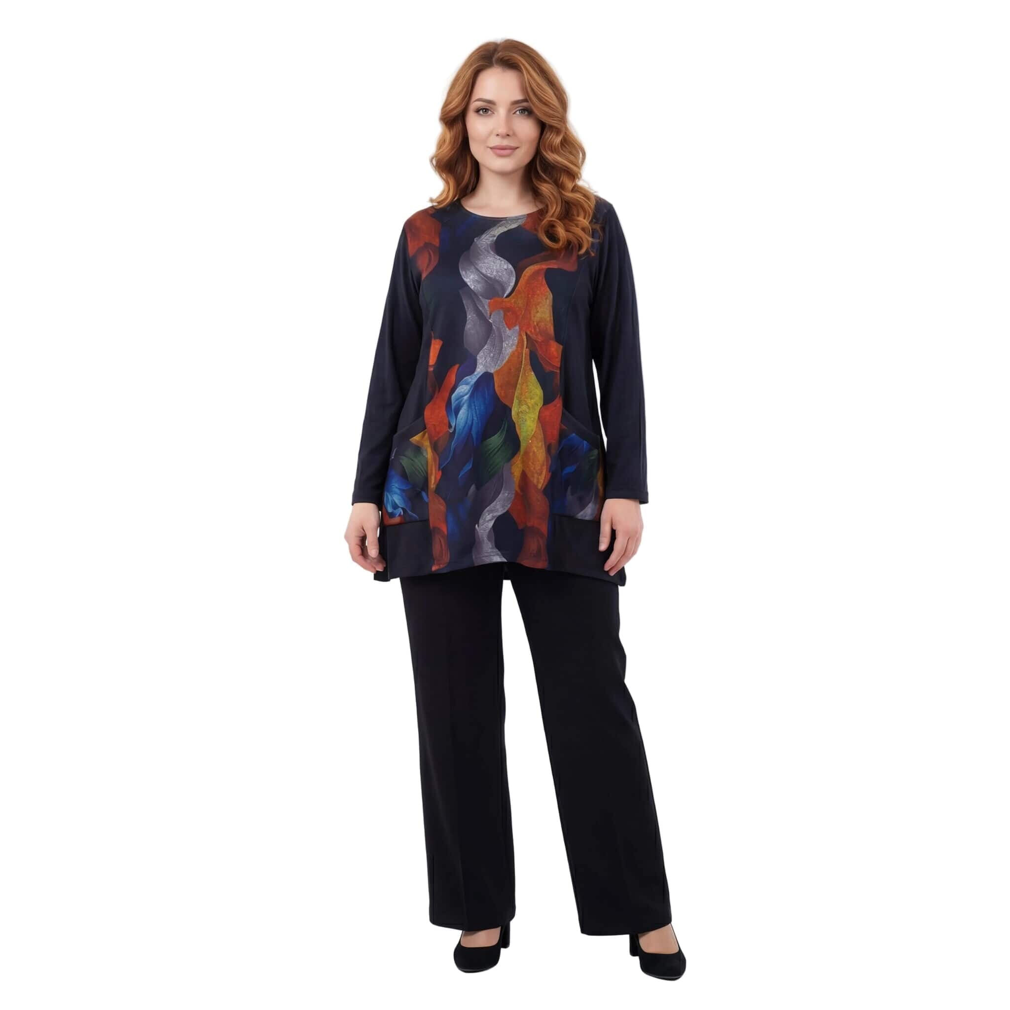 Открийте перфектния баланс между изкуство и комфорт с нашата нова елегантна туника, създадена специално за дамите с извивки. Този модел е истинско бижу за есенно-зимния гардероб, съчетаващ класическото черно с централна част от артистични абстрактни листа в топли нюанси на оранжево, синьо и жълто. Дизайнът е замислен така, че да издължава силуета и да привлича погледа, докато едноцветните странични части придават изтънченост и елегантност.