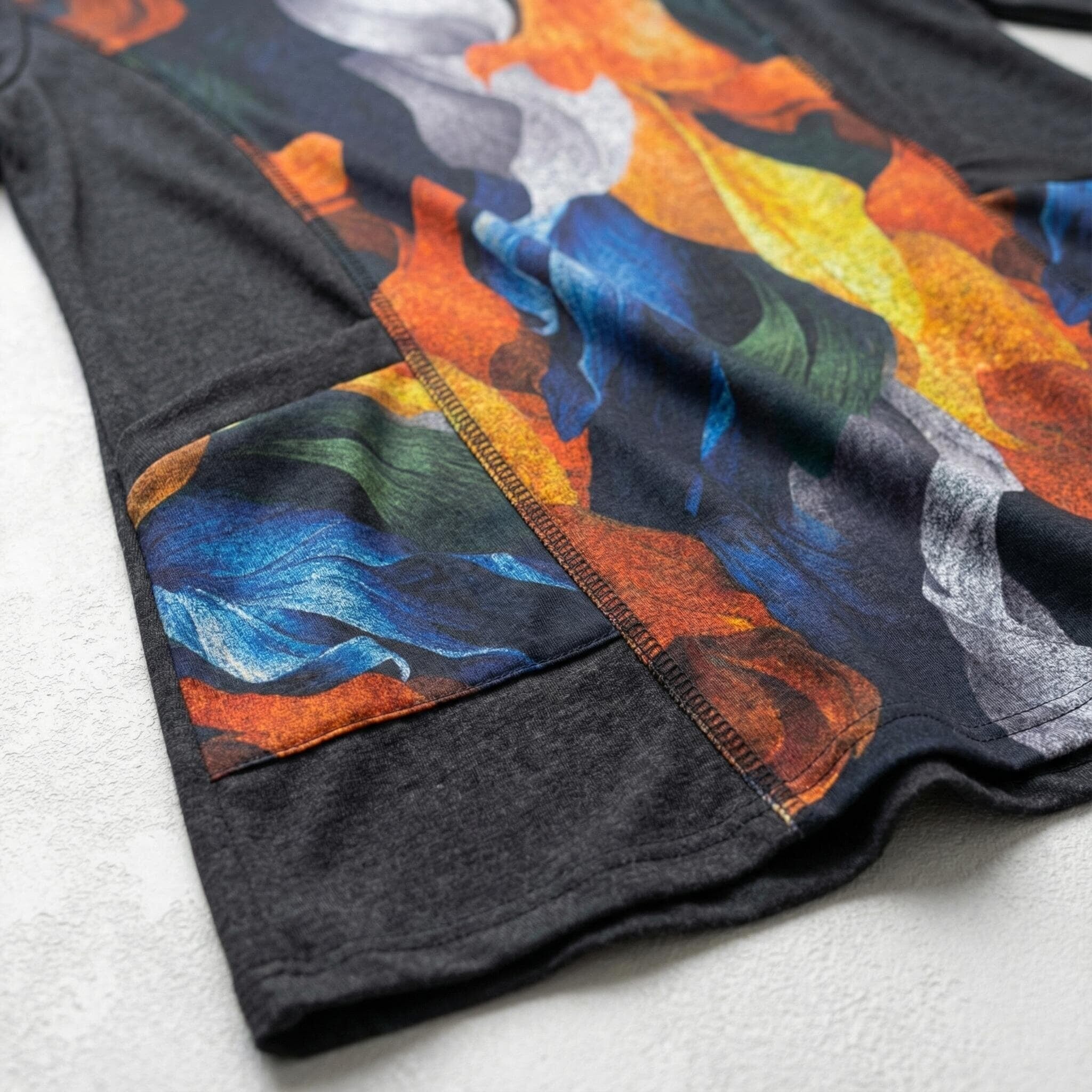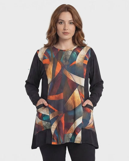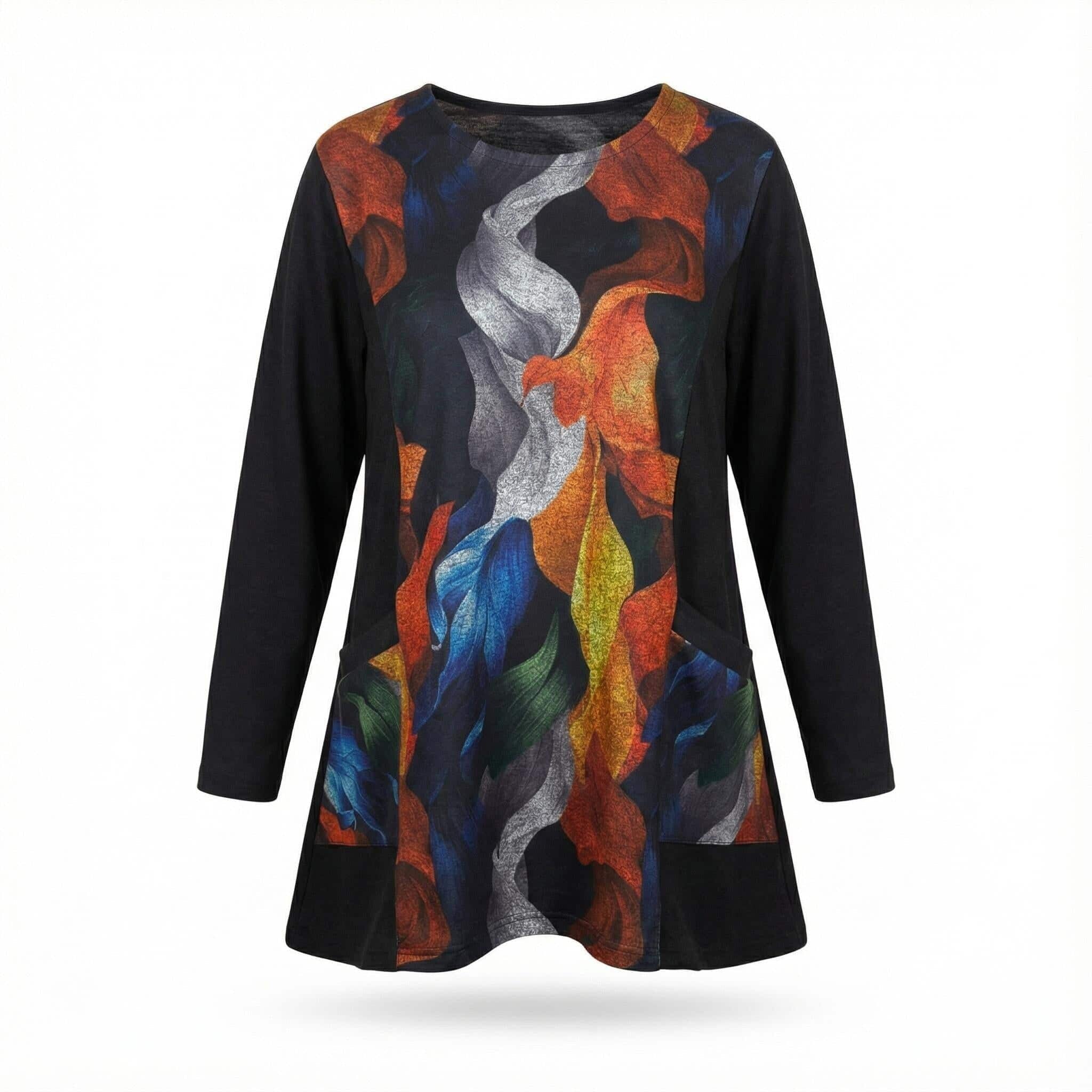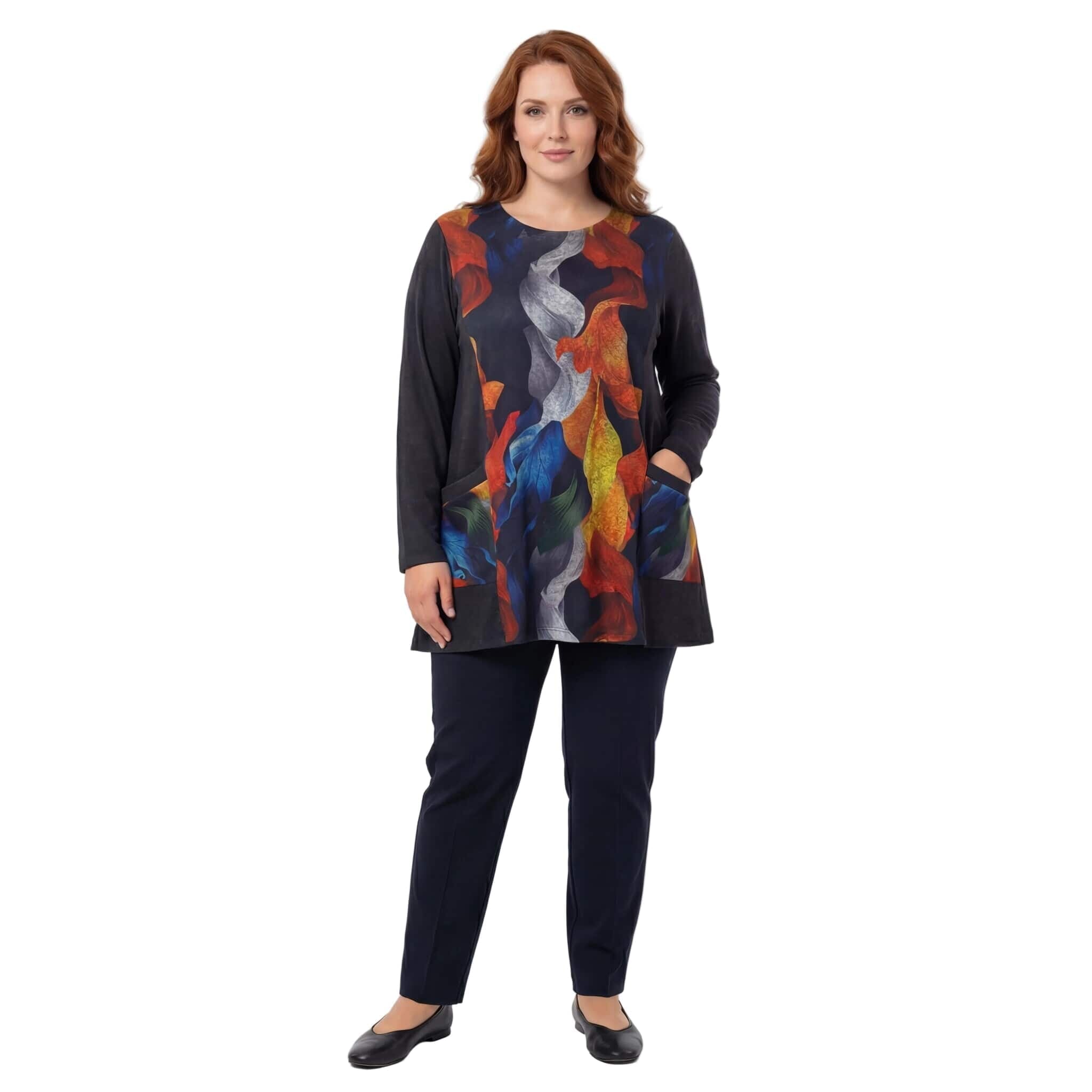 Открийте перфектния баланс между изкуство и комфорт с нашата нова елегантна туника, създадена специално за дамите с извивки. Този модел е истинско бижу за есенно-зимния гардероб, съчетаващ класическото черно с централна част от артистични абстрактни листа в топли нюанси на оранжево, синьо и жълто. Дизайнът е замислен така, че да издължава силуета и да привлича погледа, докато едноцветните странични части придават изтънченост и елегантност.