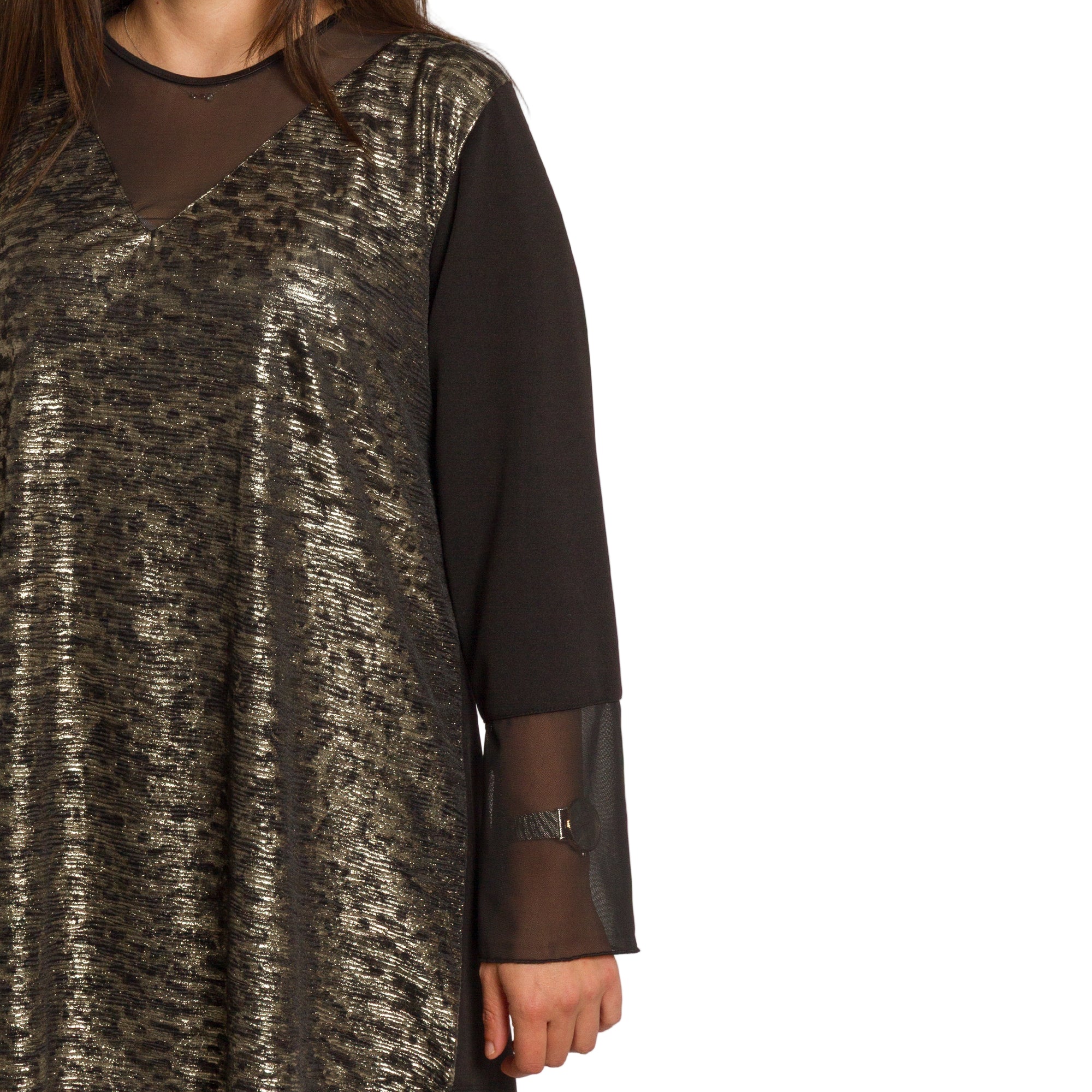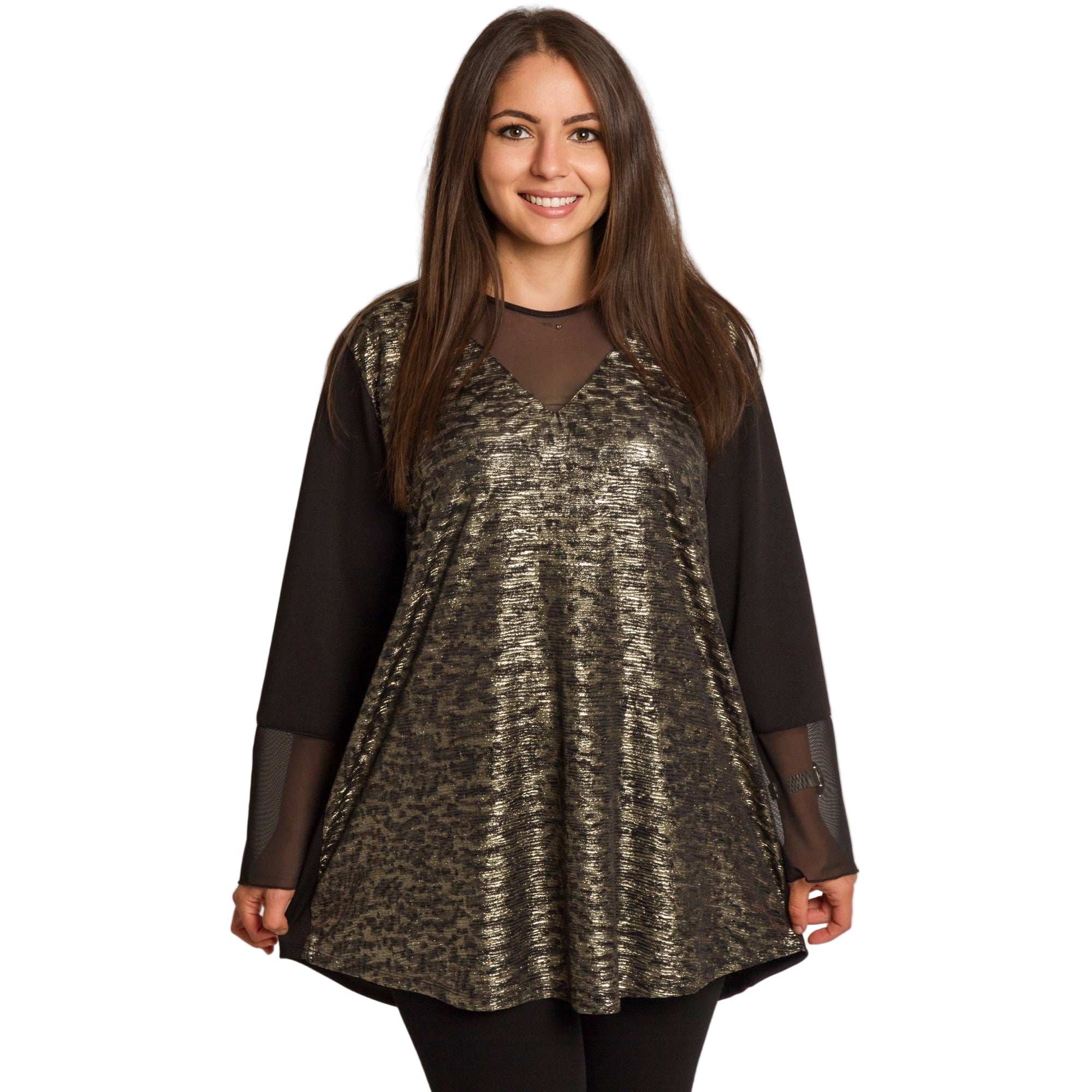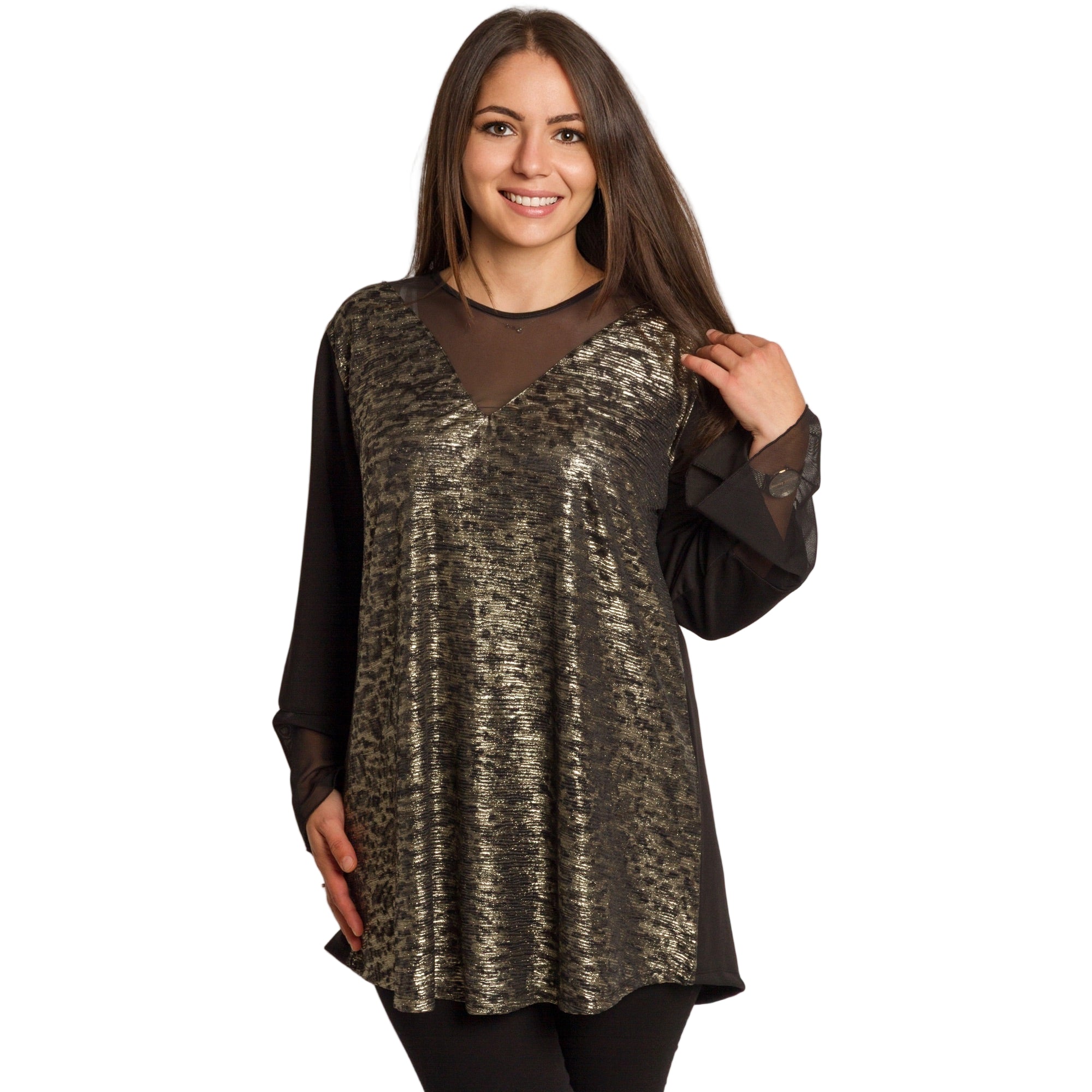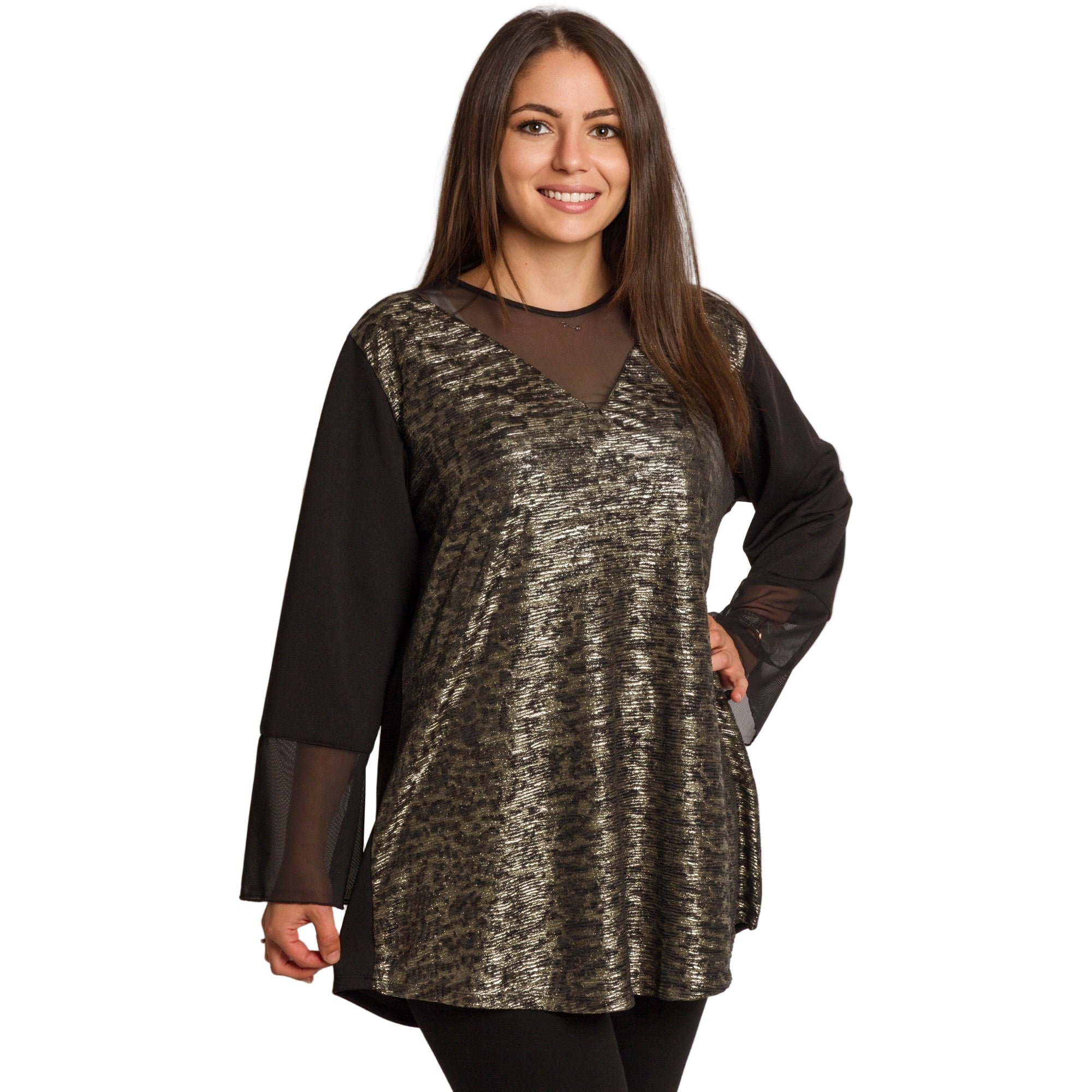 Елегантна туника в големи размери, съчетаваща стил и комфорт. Моделът е изработен от висококачествена материя с ефектен златист десен, който придава изискан и празничен вид. Деколтето е обло с акцент от фин тюл, създаващ модерно и женствено излъчване. Ръкавите са дълги и завършени с тюлени детайли, които добавят лекота и елегантност. Кройката е свободна, осигуряваща комфорт и свобода на движение. Туниката е подходяща както за ежедневни излизания, така и за официални поводи през есенно-зимния сезон.