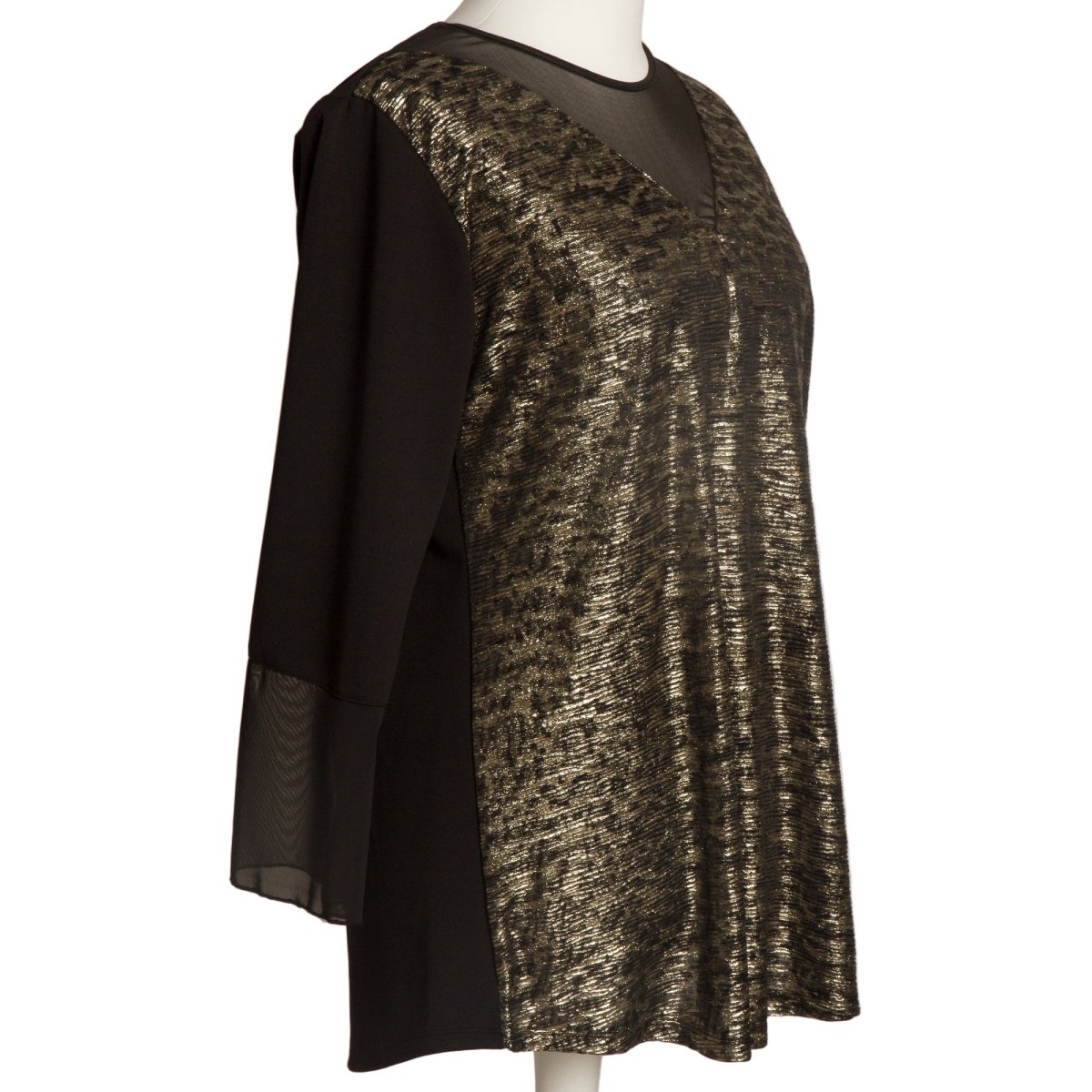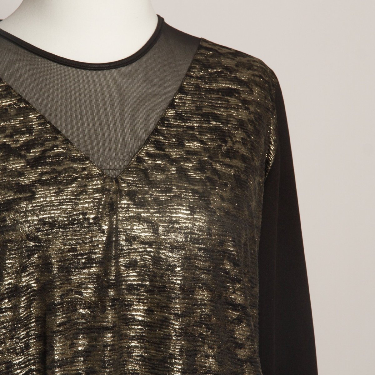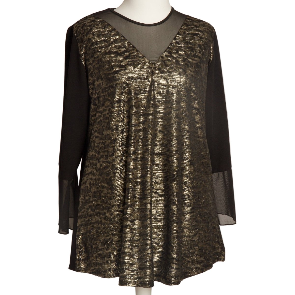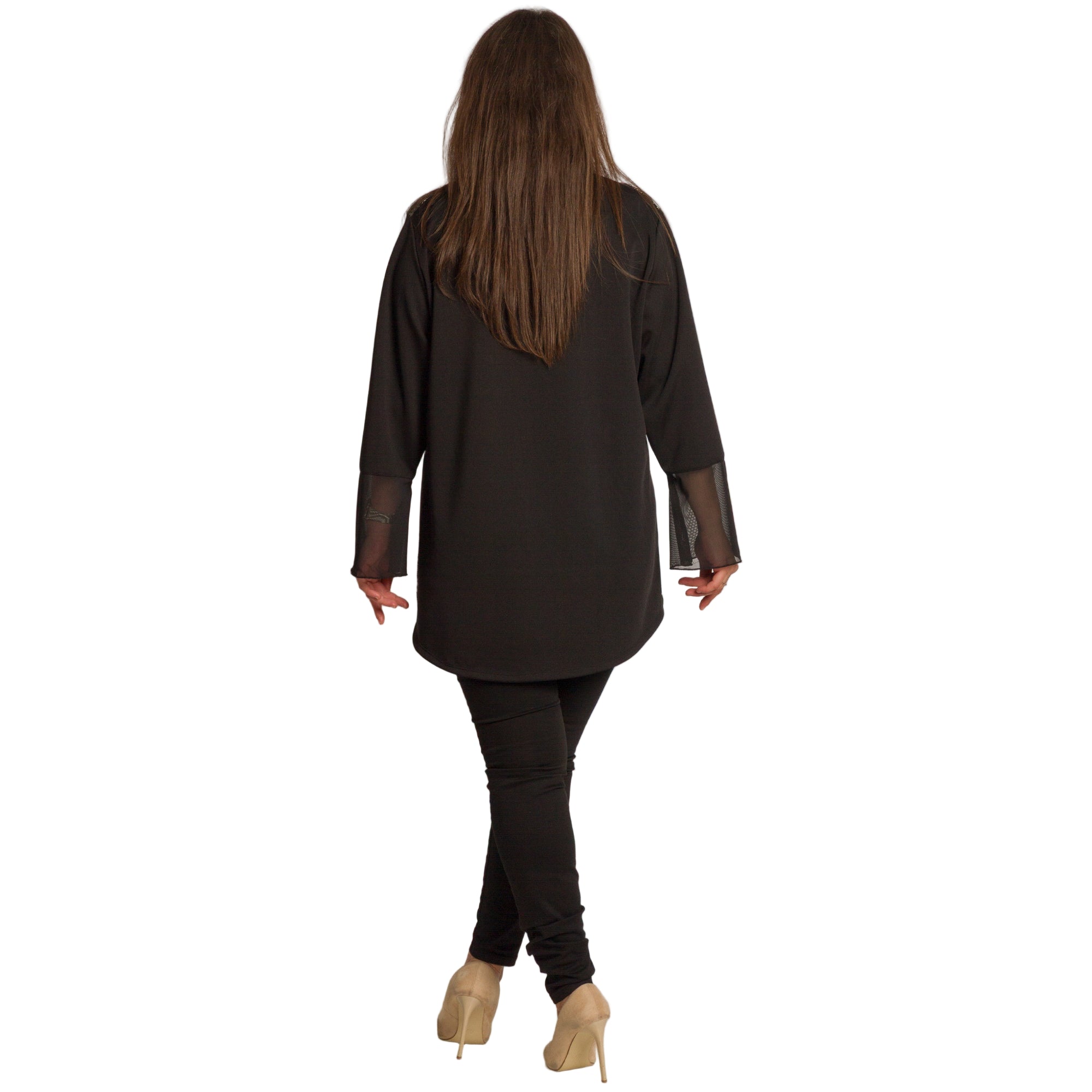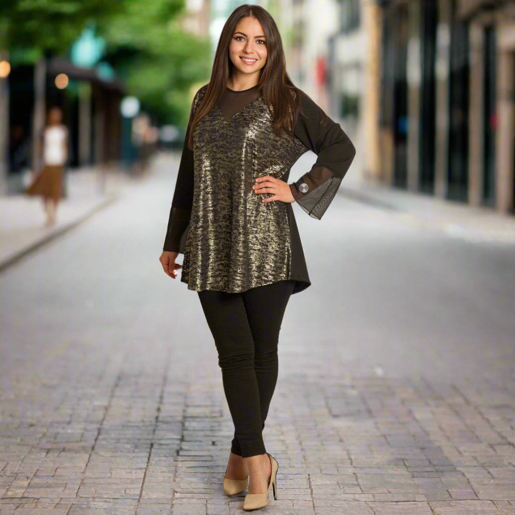 Елегантна туника в големи размери, съчетаваща стил и комфорт. Моделът е изработен от висококачествена материя с ефектен златист десен, който придава изискан и празничен вид. Деколтето е обло с акцент от фин тюл, създаващ модерно и женствено излъчване. Ръкавите са дълги и завършени с тюлени детайли, които добавят лекота и елегантност. Кройката е свободна, осигуряваща комфорт и свобода на движение. Туниката е подходяща както за ежедневни излизания, така и за официални поводи през есенно-зимния сезон.