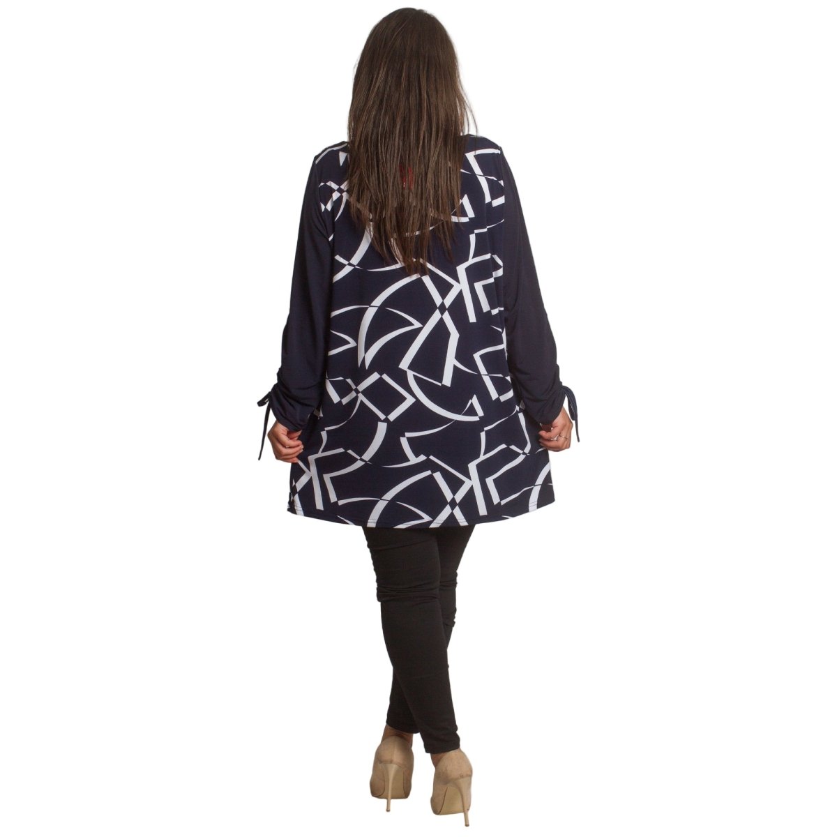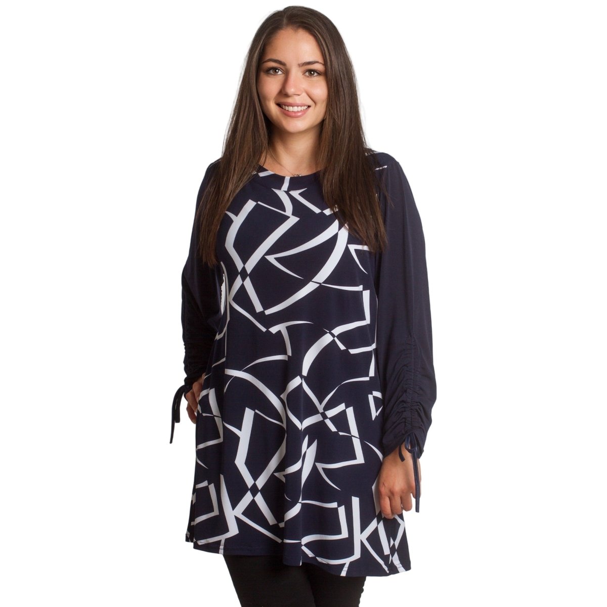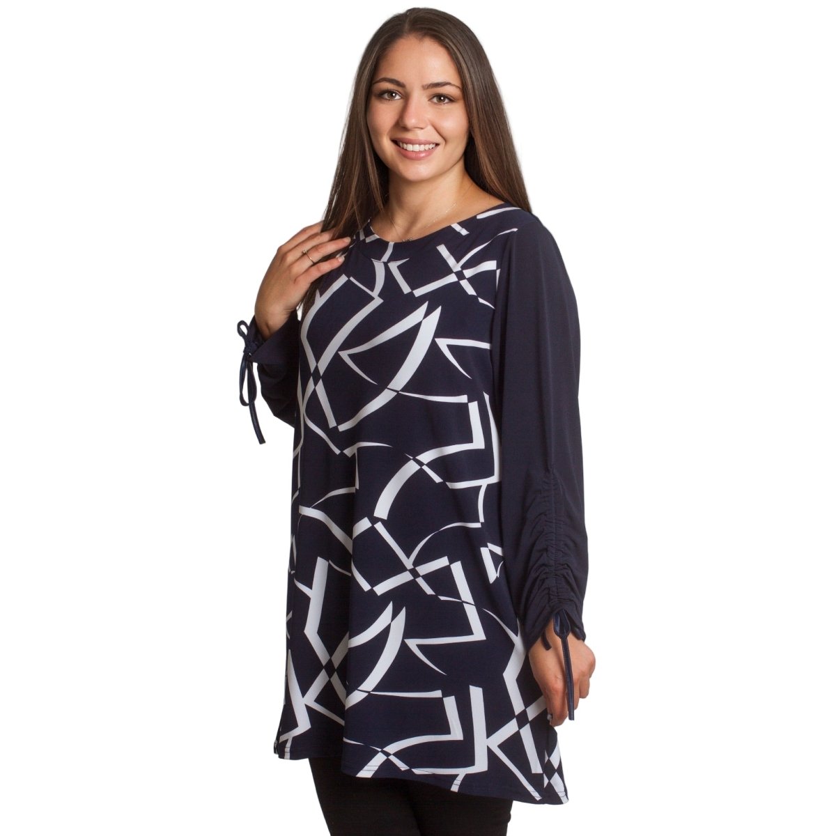 Стилна и удобна туника, изработена от висококачествена материя с еластичност за максимален комфорт. Моделът е със свободна кройка, лодка деколте и дълги ръкави с връзки за елегантен акцент. Подходяща е както за ежедневието, така и за официални поводи. Геометричният многоцветен десен внася модерна визия и лесно се комбинира с панталони или поли.
