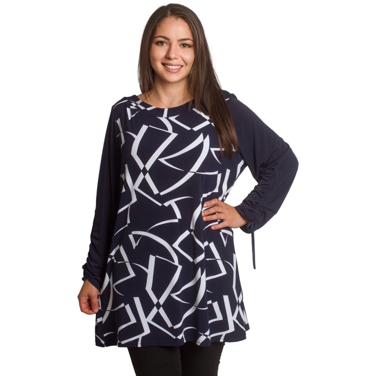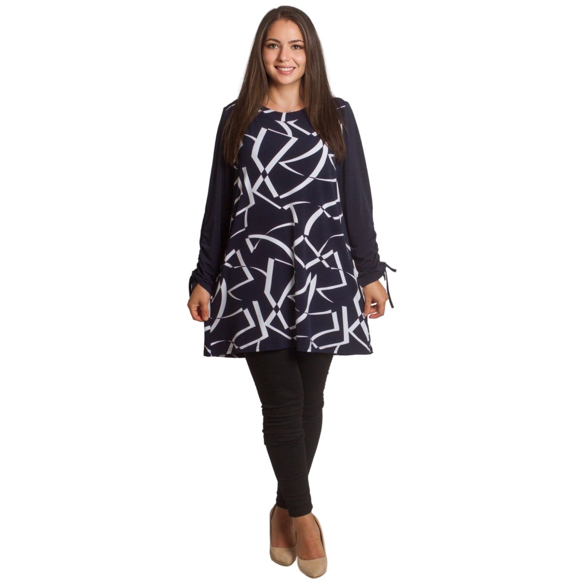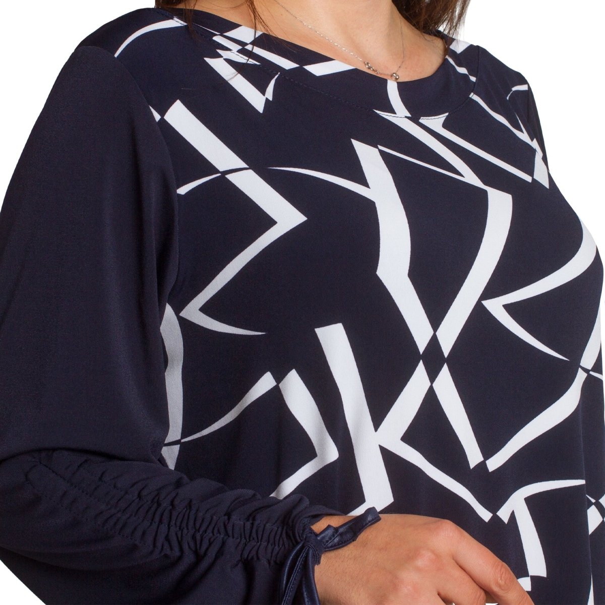 Стилна и удобна туника, изработена от висококачествена материя с еластичност за максимален комфорт. Моделът е със свободна кройка, лодка деколте и дълги ръкави с връзки за елегантен акцент. Подходяща е както за ежедневието, така и за официални поводи. Геометричният многоцветен десен внася модерна визия и лесно се комбинира с панталони или поли.