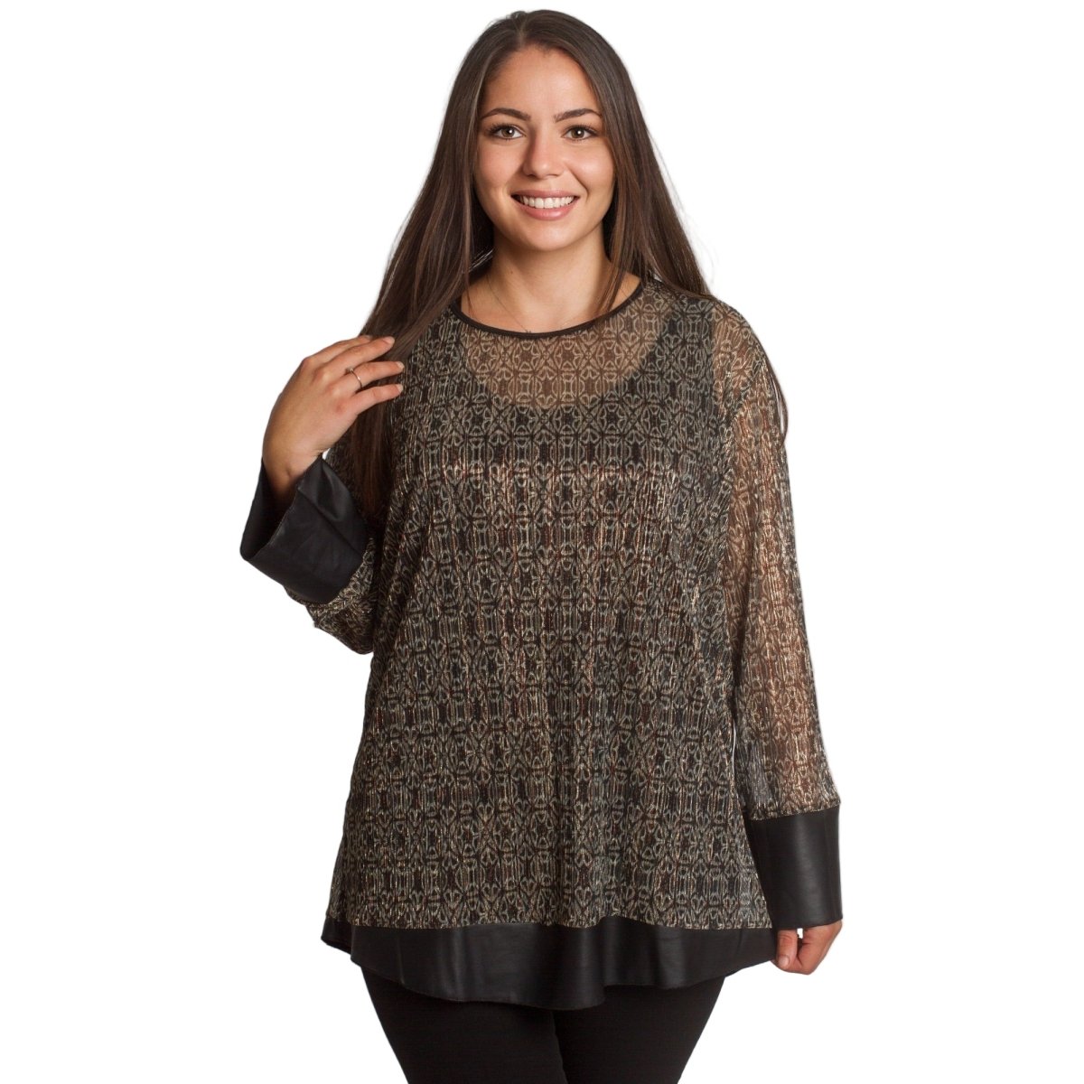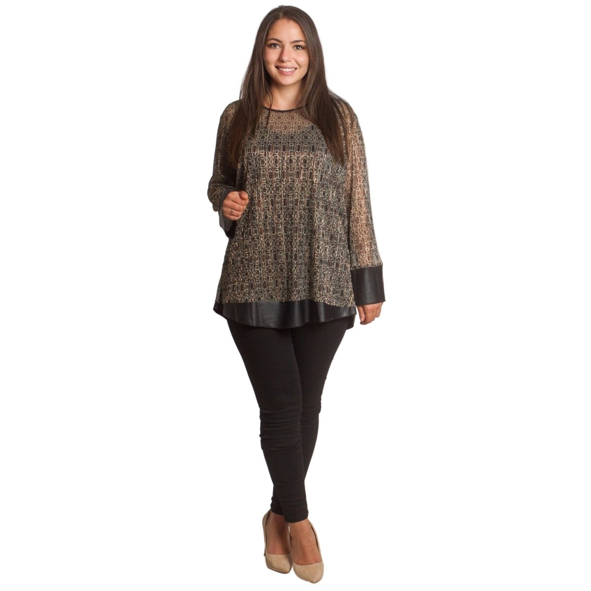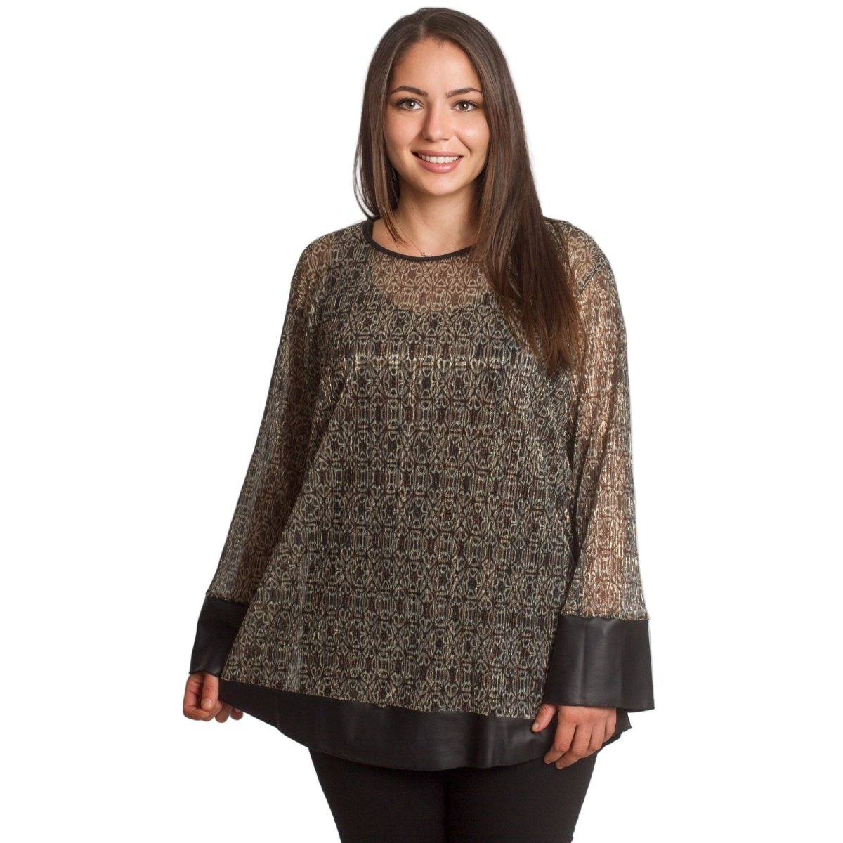 Стилна туника в наситен многоцветен абстрактен десен с преобладаващи лилави и тъмни тонове. Моделът е с права кройка и кръгло деколте, което подчертава класическата линия. Към туниката е включен потник отдолу за повече комфорт и практичност. Изработена от удобна еластична материя, туниката пада свободно по тялото, а декоративният кант в долната част и маншетите придават модерен завършек. Подходяща е както за ежедневието, така и за официални поводи.