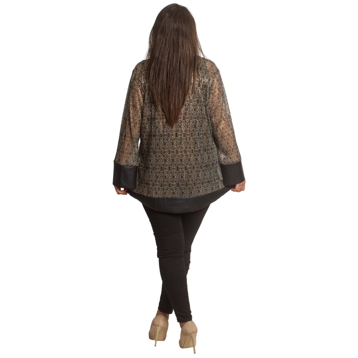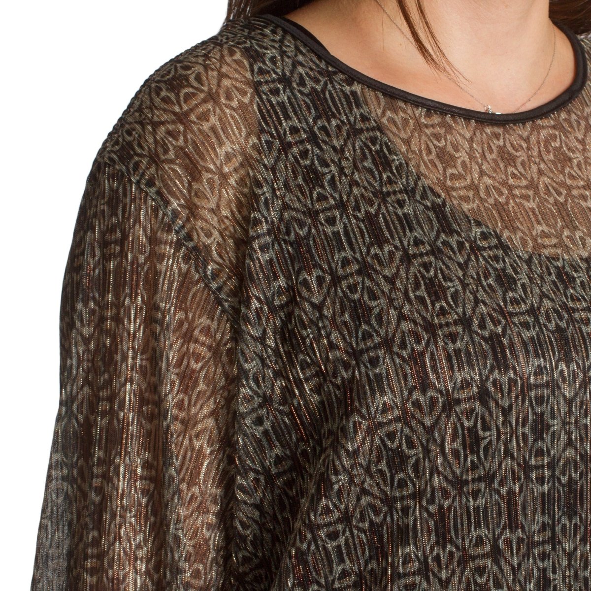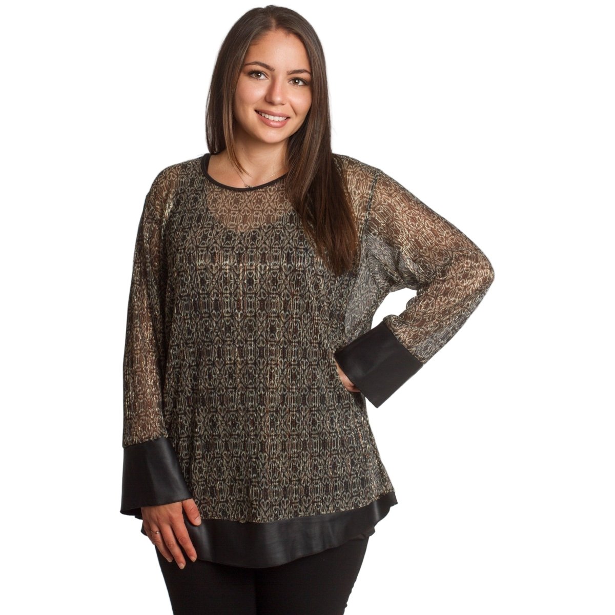 Стилна туника в наситен многоцветен абстрактен десен с преобладаващи лилави и тъмни тонове. Моделът е с права кройка и кръгло деколте, което подчертава класическата линия. Към туниката е включен потник отдолу за повече комфорт и практичност. Изработена от удобна еластична материя, туниката пада свободно по тялото, а декоративният кант в долната част и маншетите придават модерен завършек. Подходяща е както за ежедневието, така и за официални поводи.