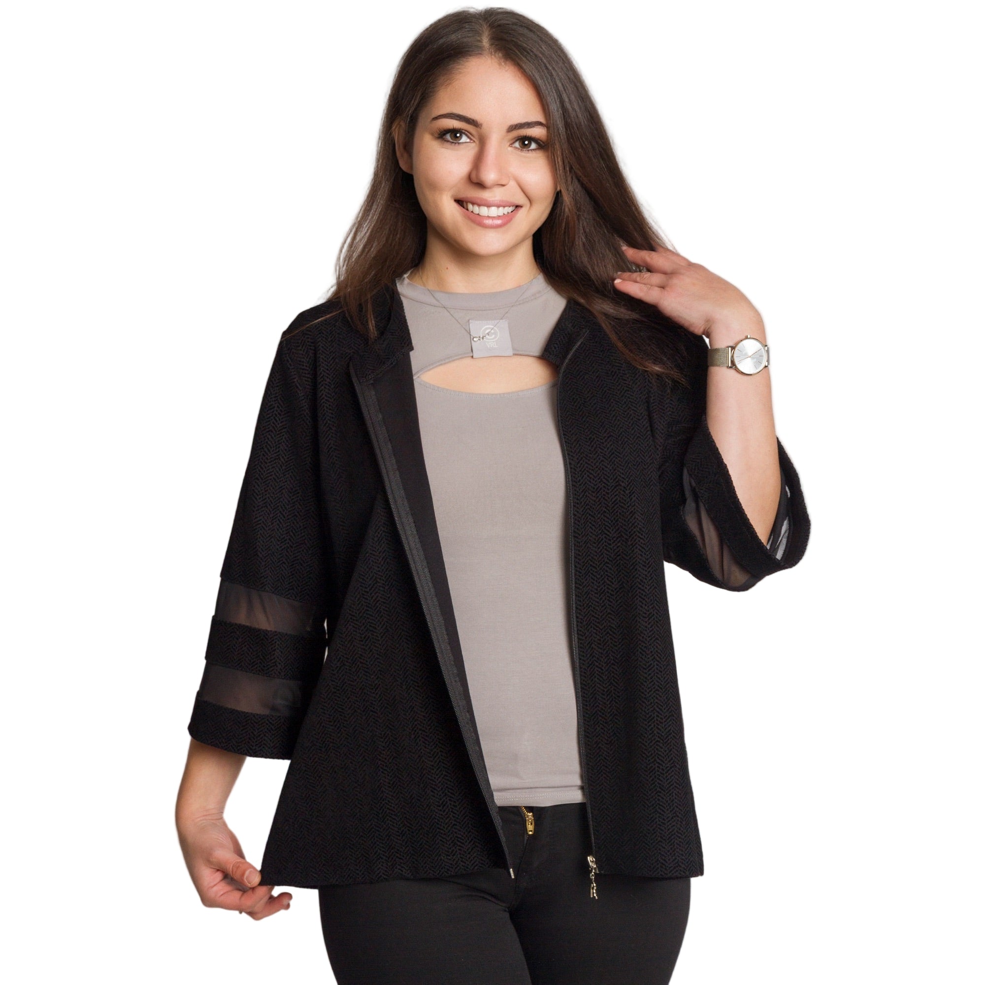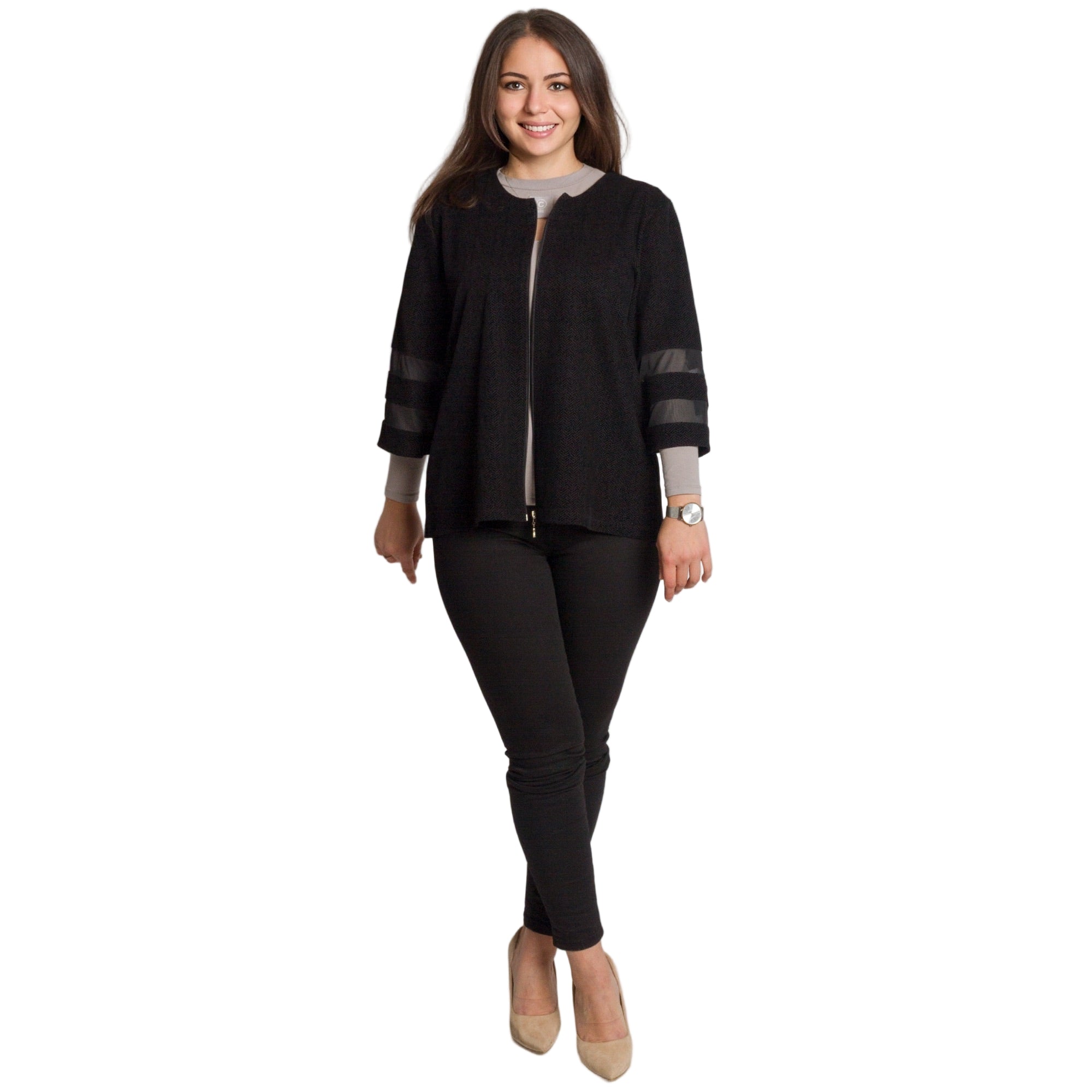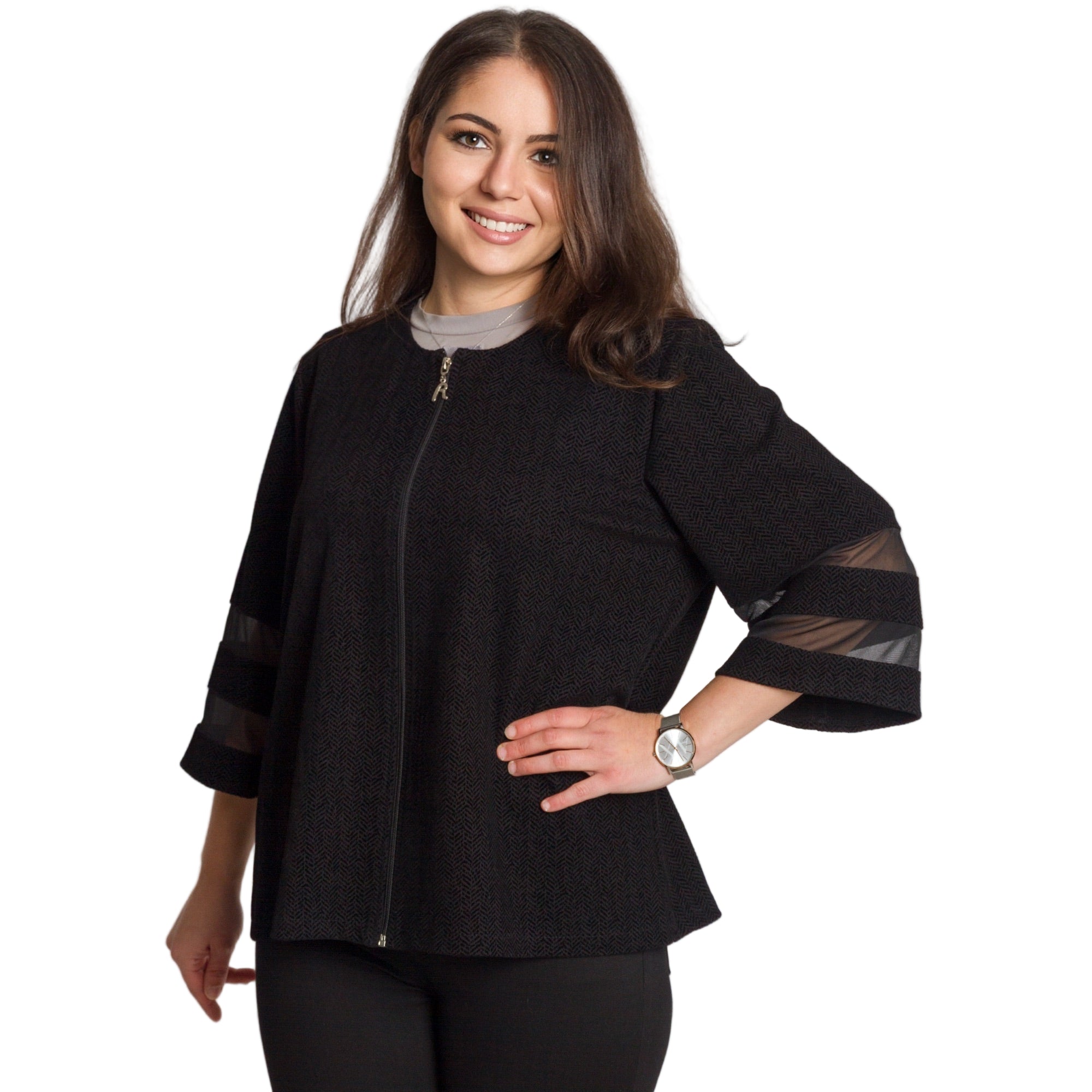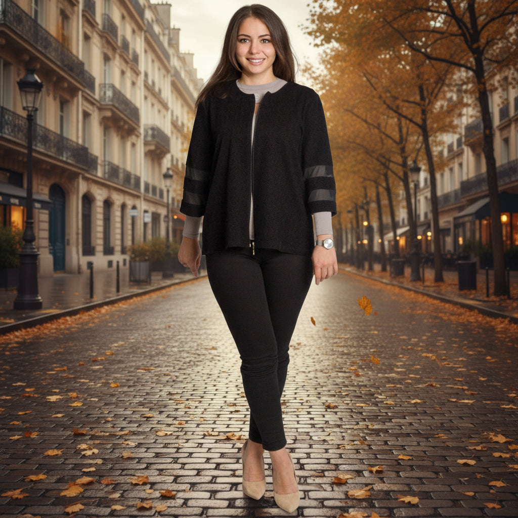 Това елегантно черно сако е идеален избор за официални поводи и изискани събития. Моделът е изработен от висококачествен полиестер, който осигурява комфорт и лекота при носене. Свободната кройка подчертава силуета, без да пристяга, а 3/4 ръкавите с прозрачни декоративни ленти придават модерен и женствен акцент. Закопчава се с цип по цялата дължина и се комбинира отлично както с панталон, така и с пола.