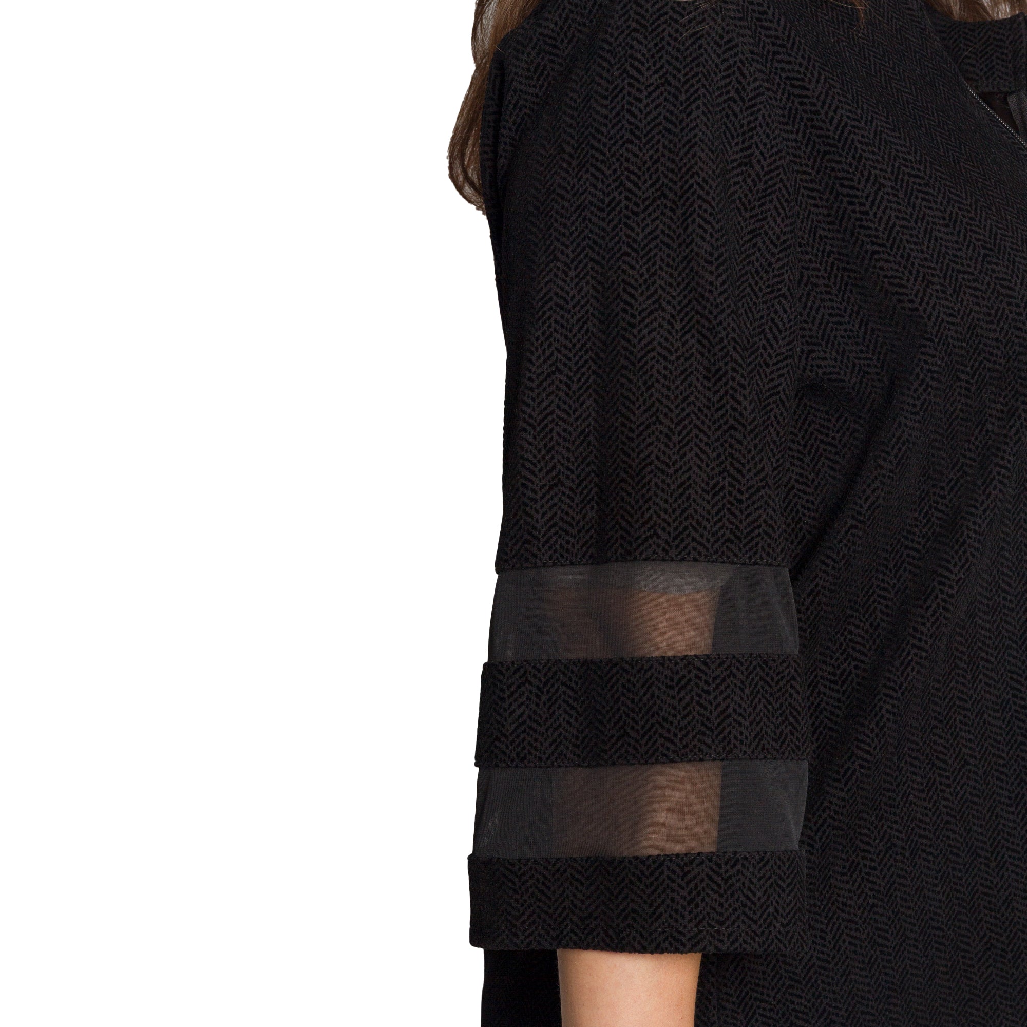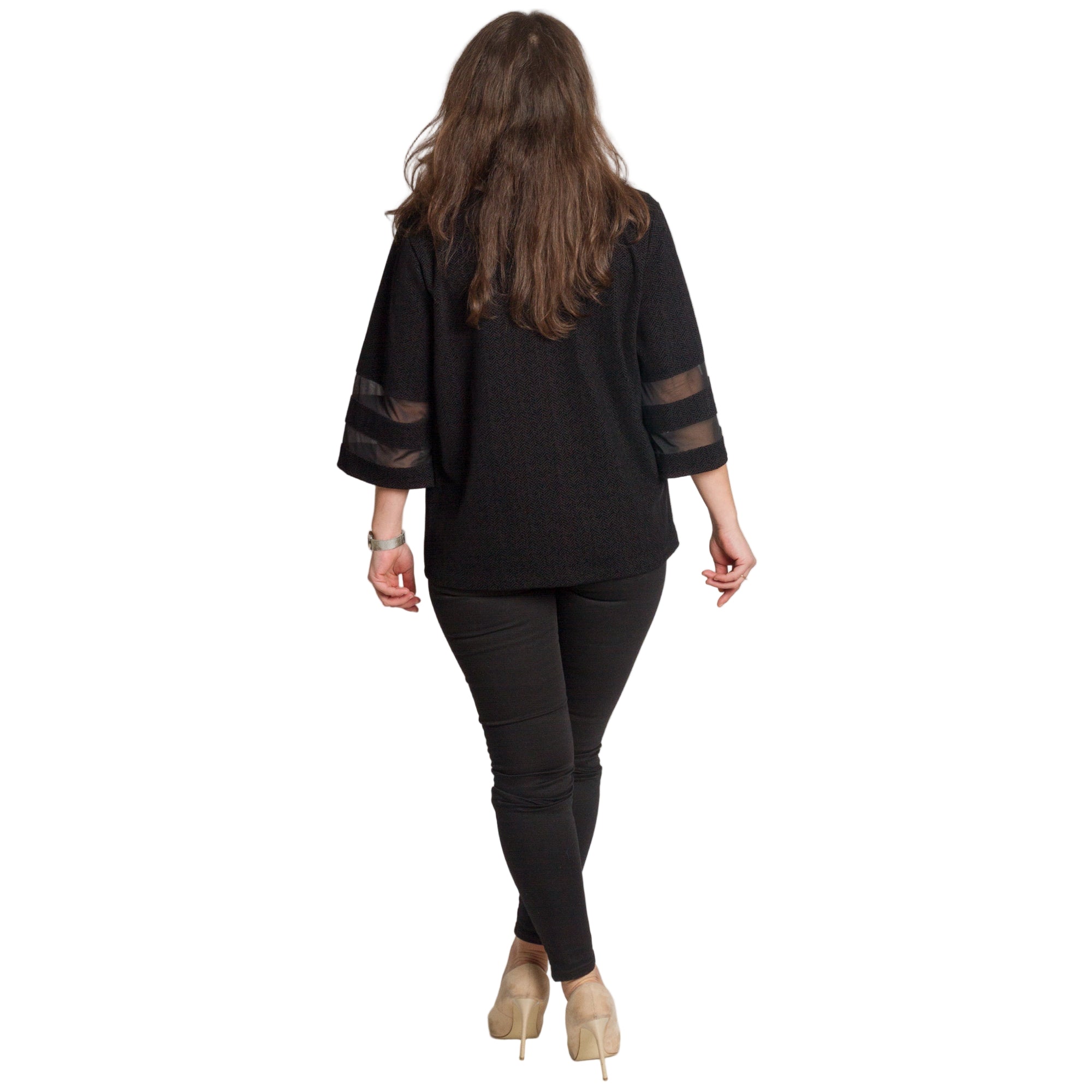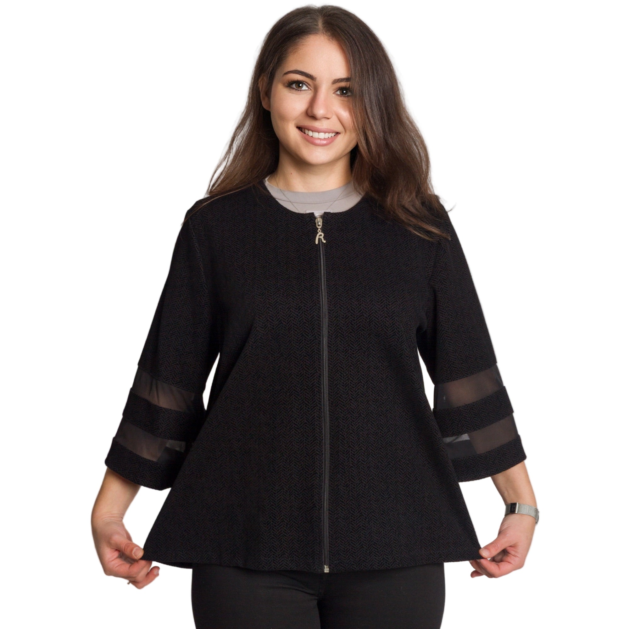 Това елегантно черно сако е идеален избор за официални поводи и изискани събития. Моделът е изработен от висококачествен полиестер, който осигурява комфорт и лекота при носене. Свободната кройка подчертава силуета, без да пристяга, а 3/4 ръкавите с прозрачни декоративни ленти придават модерен и женствен акцент. Закопчава се с цип по цялата дължина и се комбинира отлично както с панталон, така и с пола.