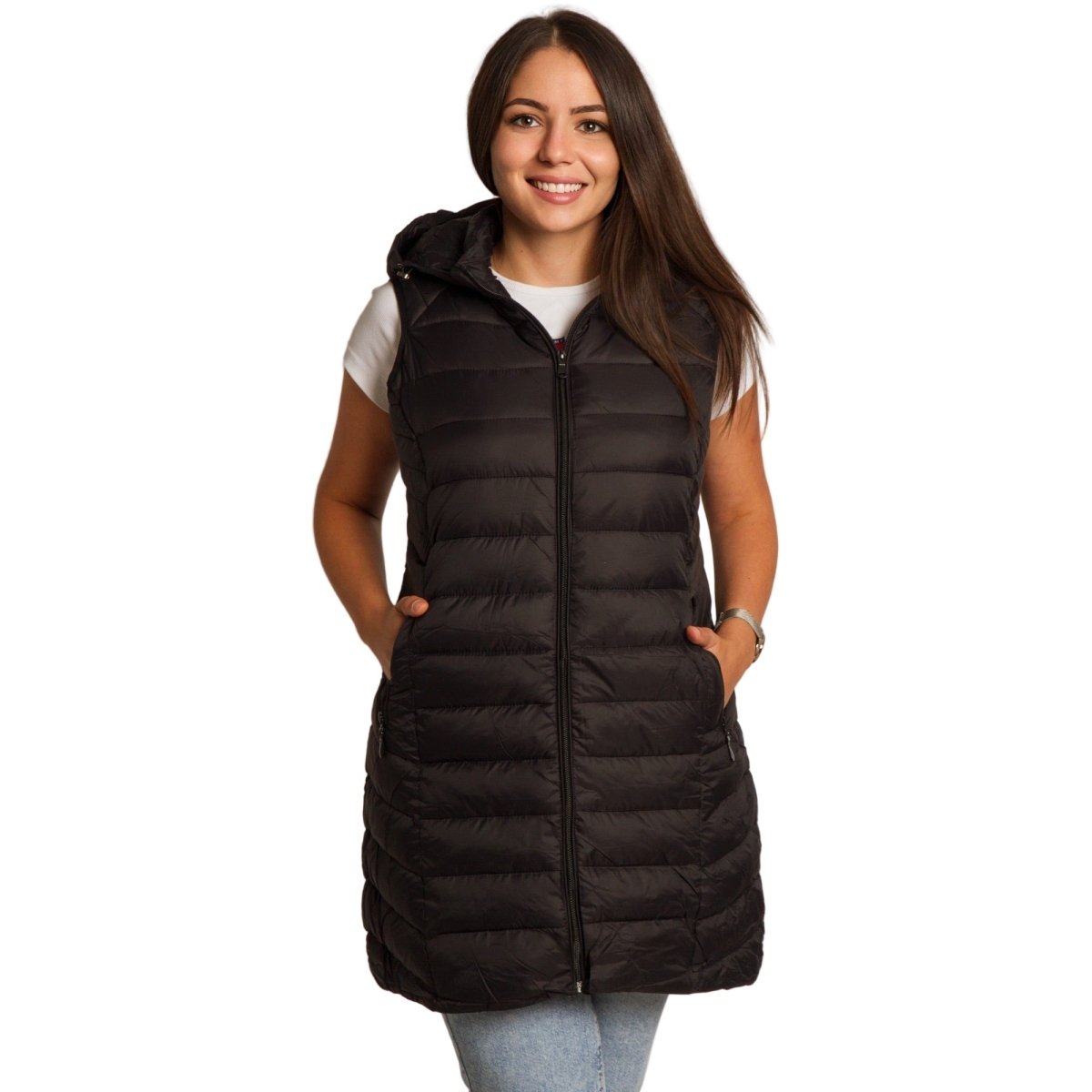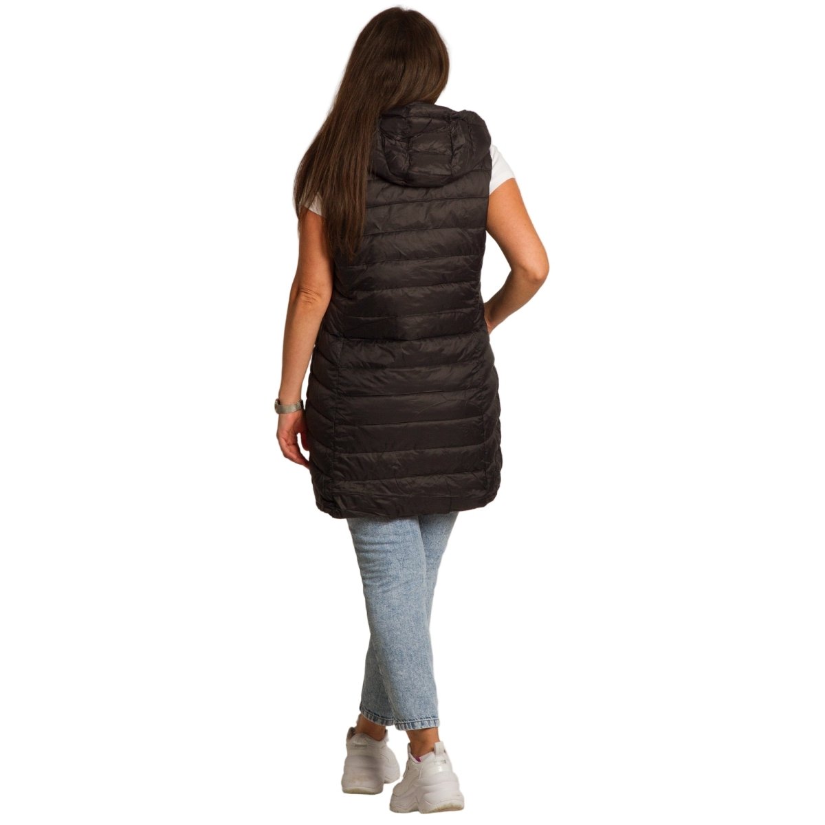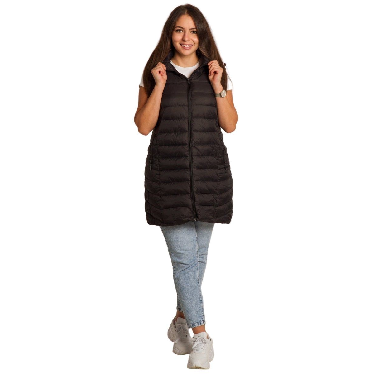 Универсален и практичен елек в големи размери, изработен за удобство и стил през студените дни. Черният цвят го прави лесен за комбиниране с всякакви тоалети, а висококачественият полиестер осигурява лекота и топлина. Моделът е с права кройка и закопчаване с цип, което гарантира удобство при носене. Двата странични джоба с цип са практично решение за съхранение на малки вещи. Качулката добавя комфорт и защита от вятър и студ, което прави елека подходящ както за ежедневни, така и за по-елегантни визии през есенно-зимния сезон.