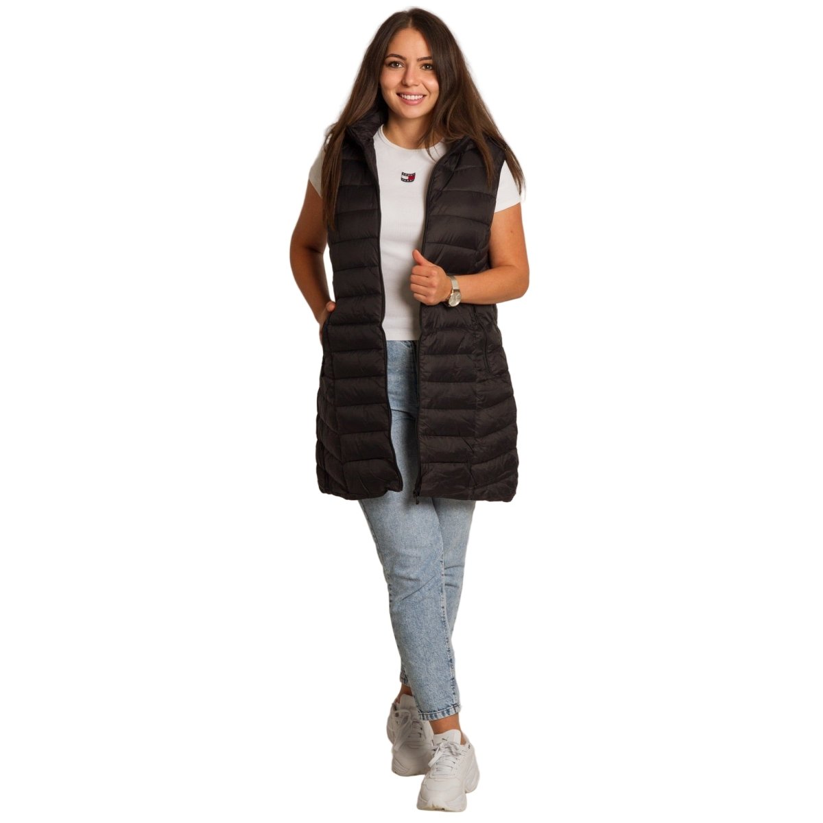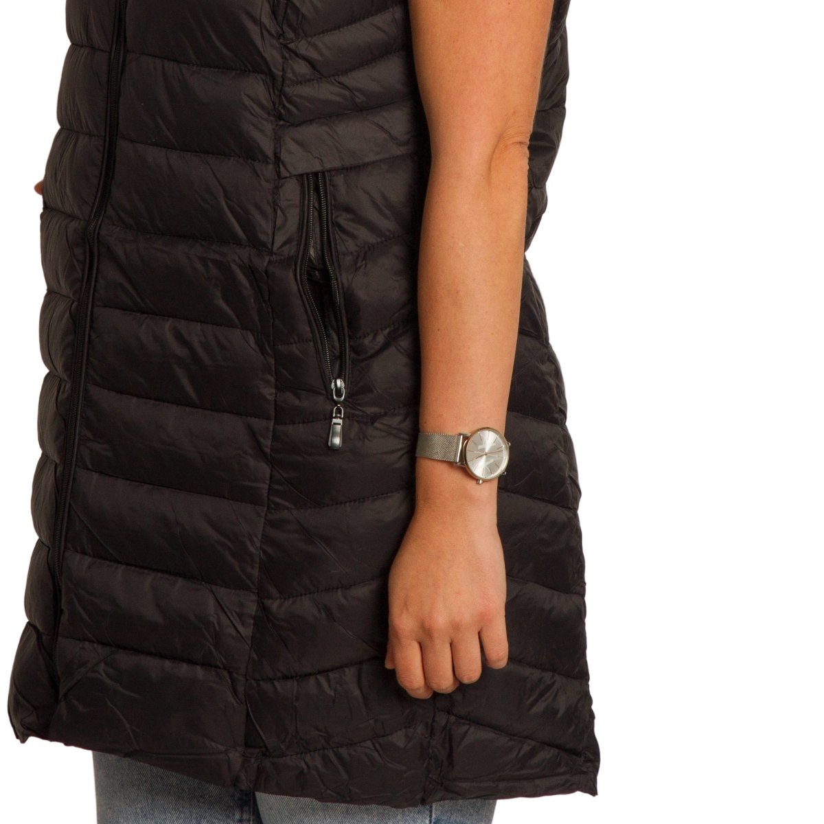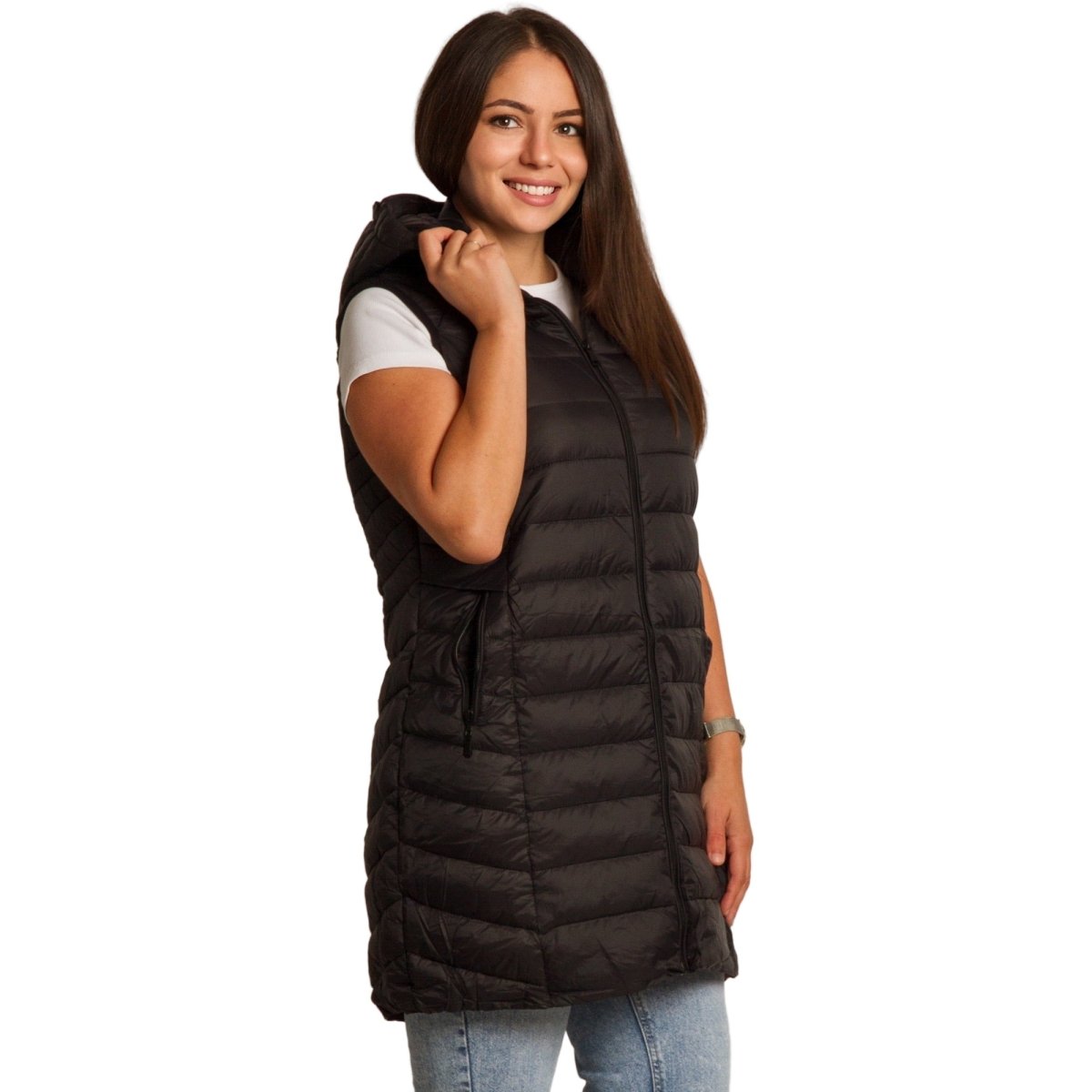 Универсален и практичен елек в големи размери, изработен за удобство и стил през студените дни. Черният цвят го прави лесен за комбиниране с всякакви тоалети, а висококачественият полиестер осигурява лекота и топлина. Моделът е с права кройка и закопчаване с цип, което гарантира удобство при носене. Двата странични джоба с цип са практично решение за съхранение на малки вещи. Качулката добавя комфорт и защита от вятър и студ, което прави елека подходящ както за ежедневни, така и за по-елегантни визии през есенно-зимния сезон.