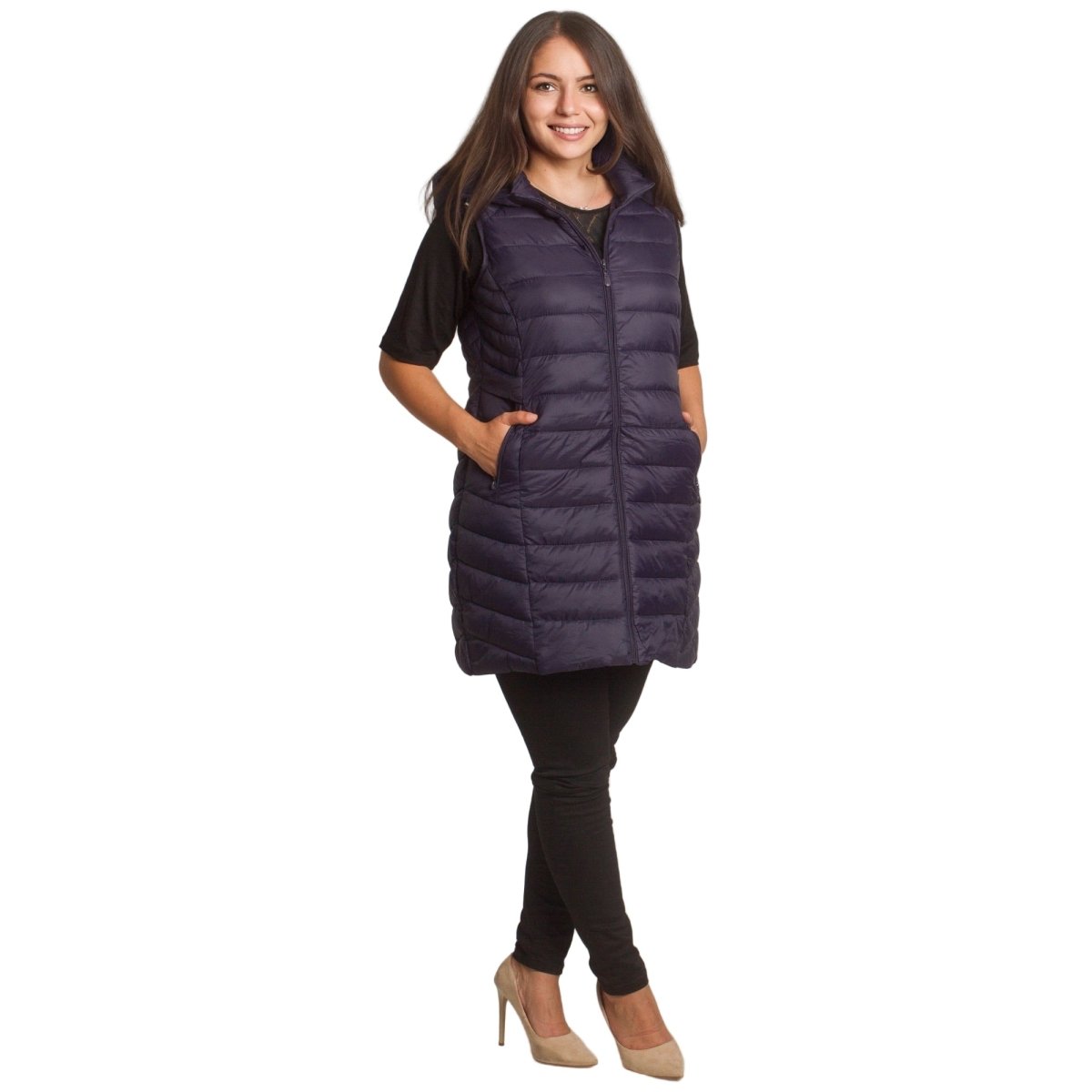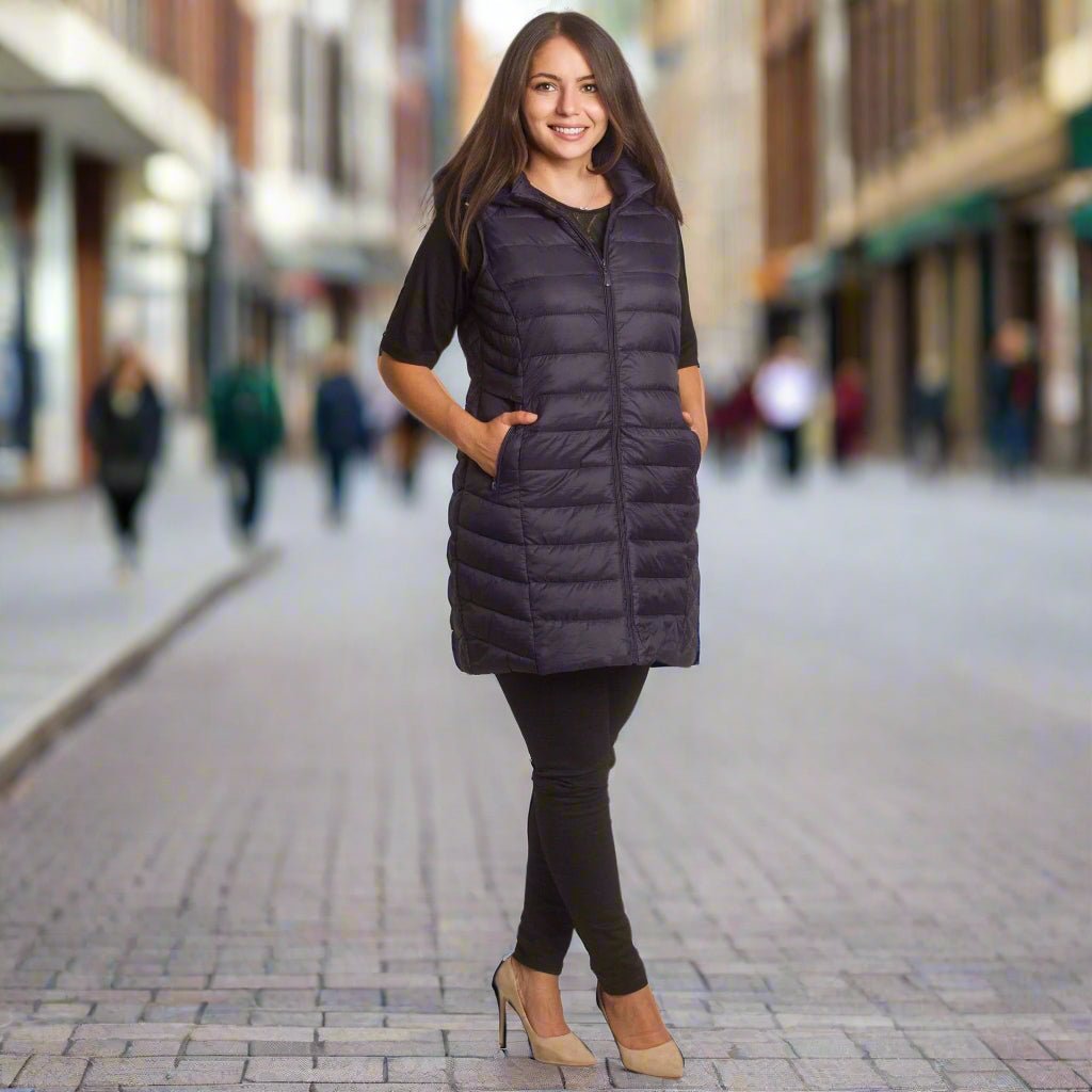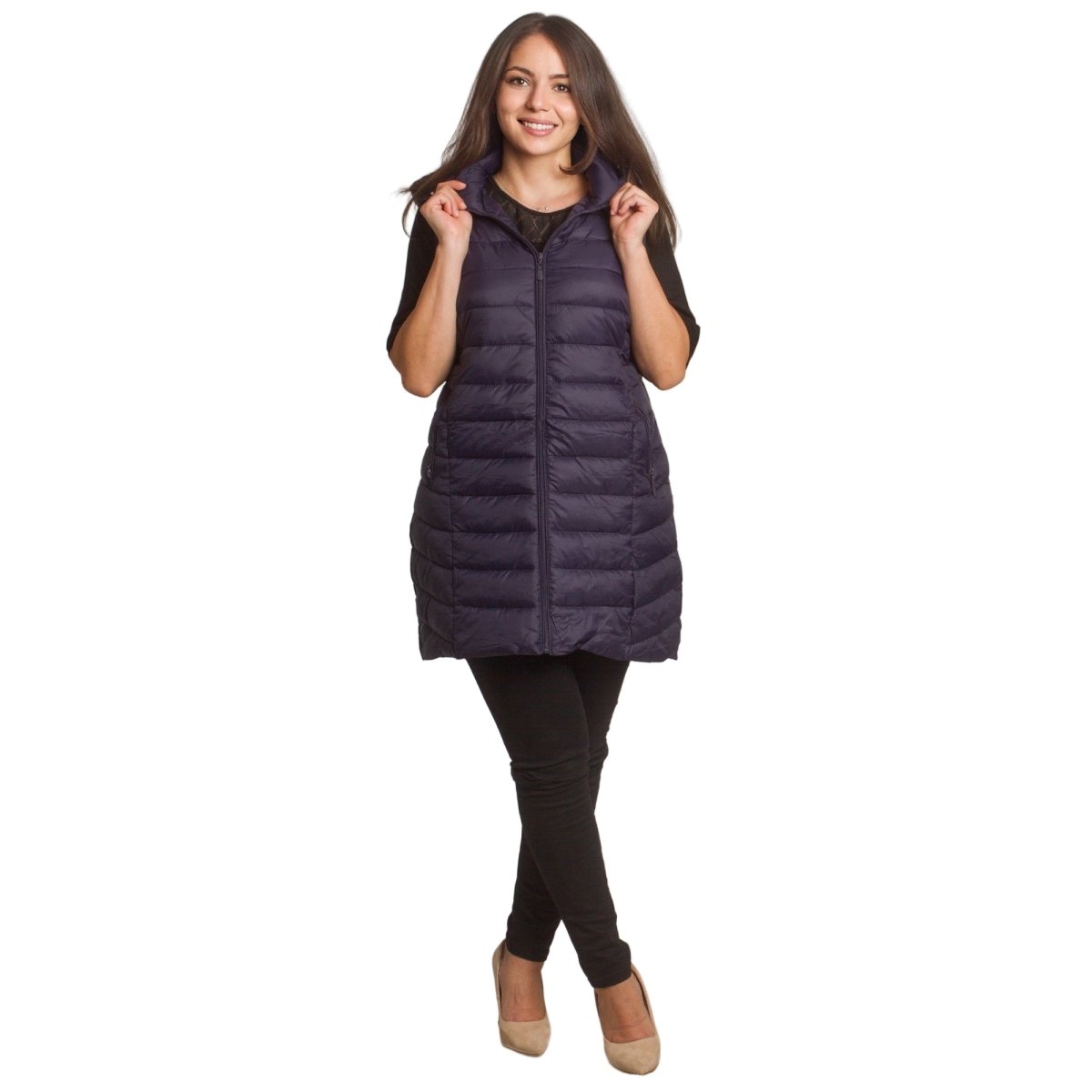 Стилен дълъг елек в тъмносин цвят, подходящ за ежедневието и по-елегантни поводи. Моделът е с права кройка, която осигурява комфорт и свобода на движението. Изработен е от 100% полиестер, което го прави лек и удобен за носене. Елекът е с практичен цип отпред и два странични джоба с цип за повече удобство. Дизайнът е подплатен с хоризонтални шевове, които подчертават модерната му визия. Подходящ за есенно-зимния сезон, както за разходка, така и за ежедневно комбиниране с туники, пуловери или блузи.