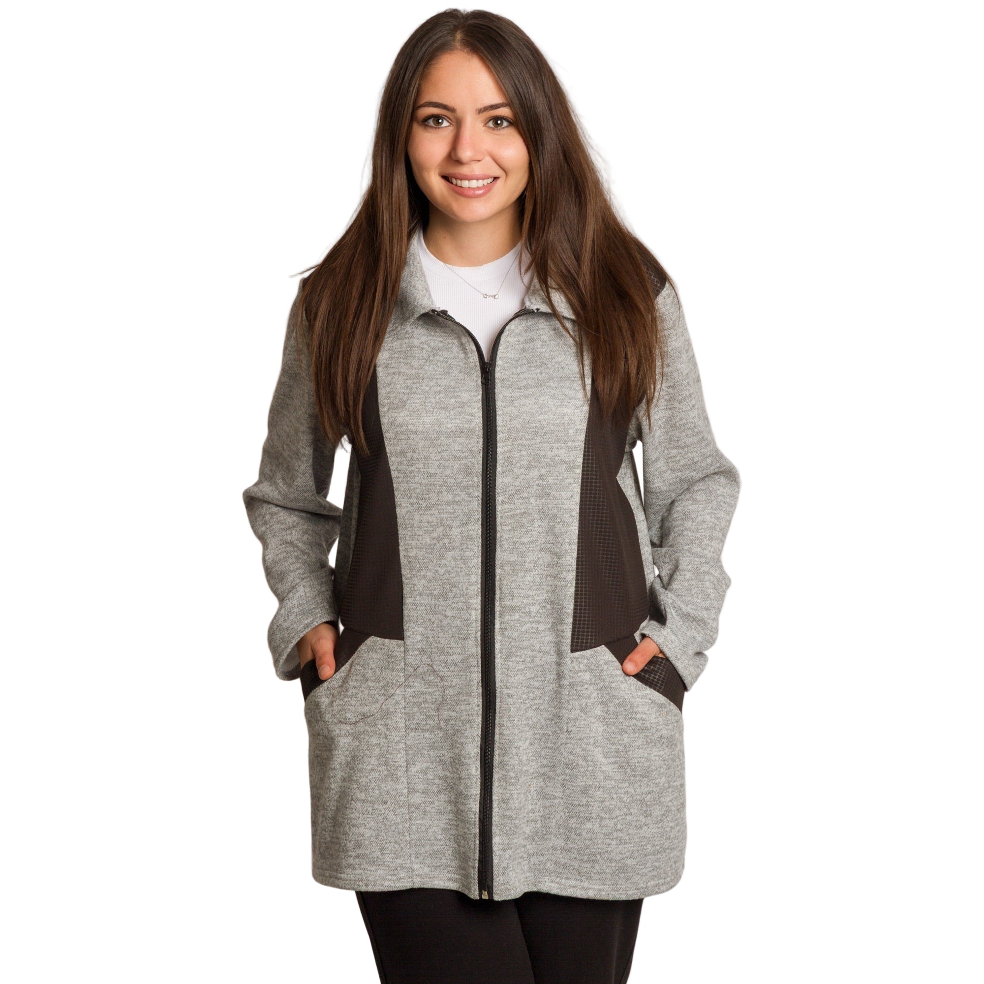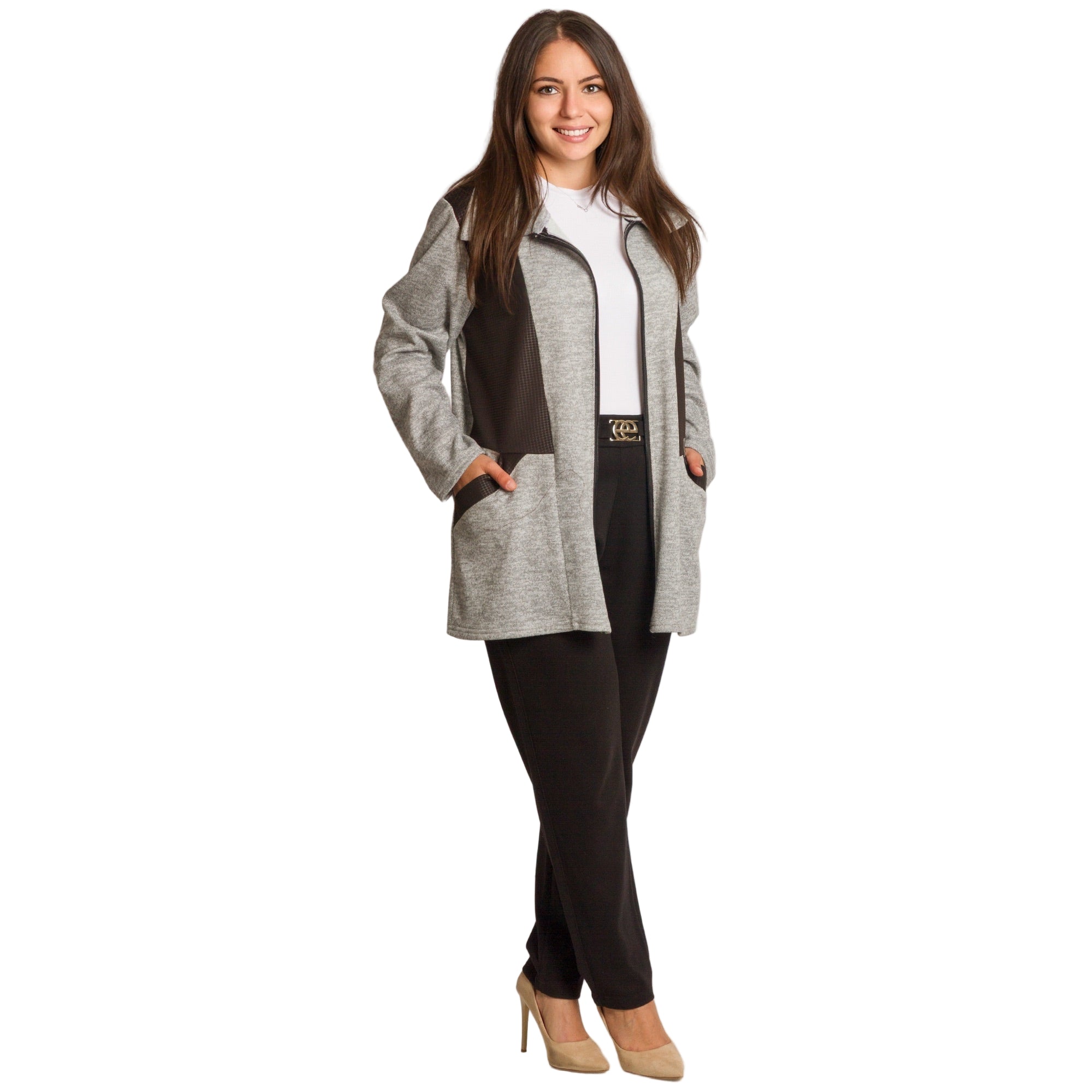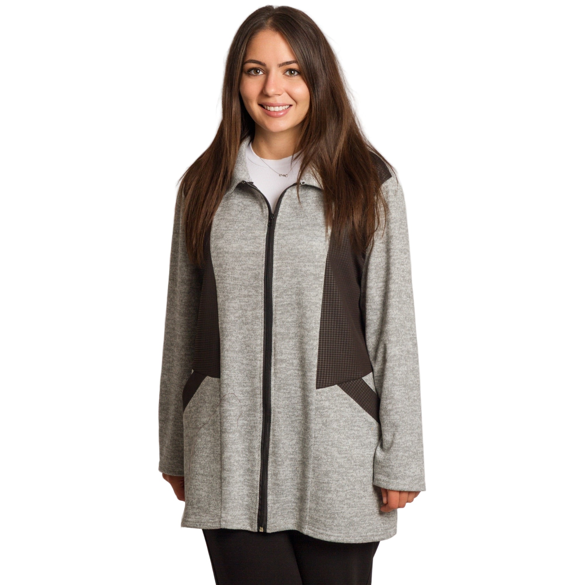 Стилен и практичен жакет в големи размери, подходящ както за ежедневието, така и за официални поводи. Моделът е изработен от мека и еластична материя с високо съдържание на вискоза, която осигурява комфорт и свобода на движенията. Основата е в сив цвят, а контрастните черни панели отпред и по ръкавите придават модерна и елегантна визия. Жакетът е със свободна кройка и практично закопчаване с цип, което улеснява носенето. Подходящ за комбинация с панталони, поли или рокли, този модел е отличен избор за есенно-зимния сезон.