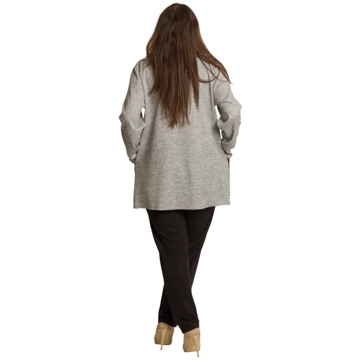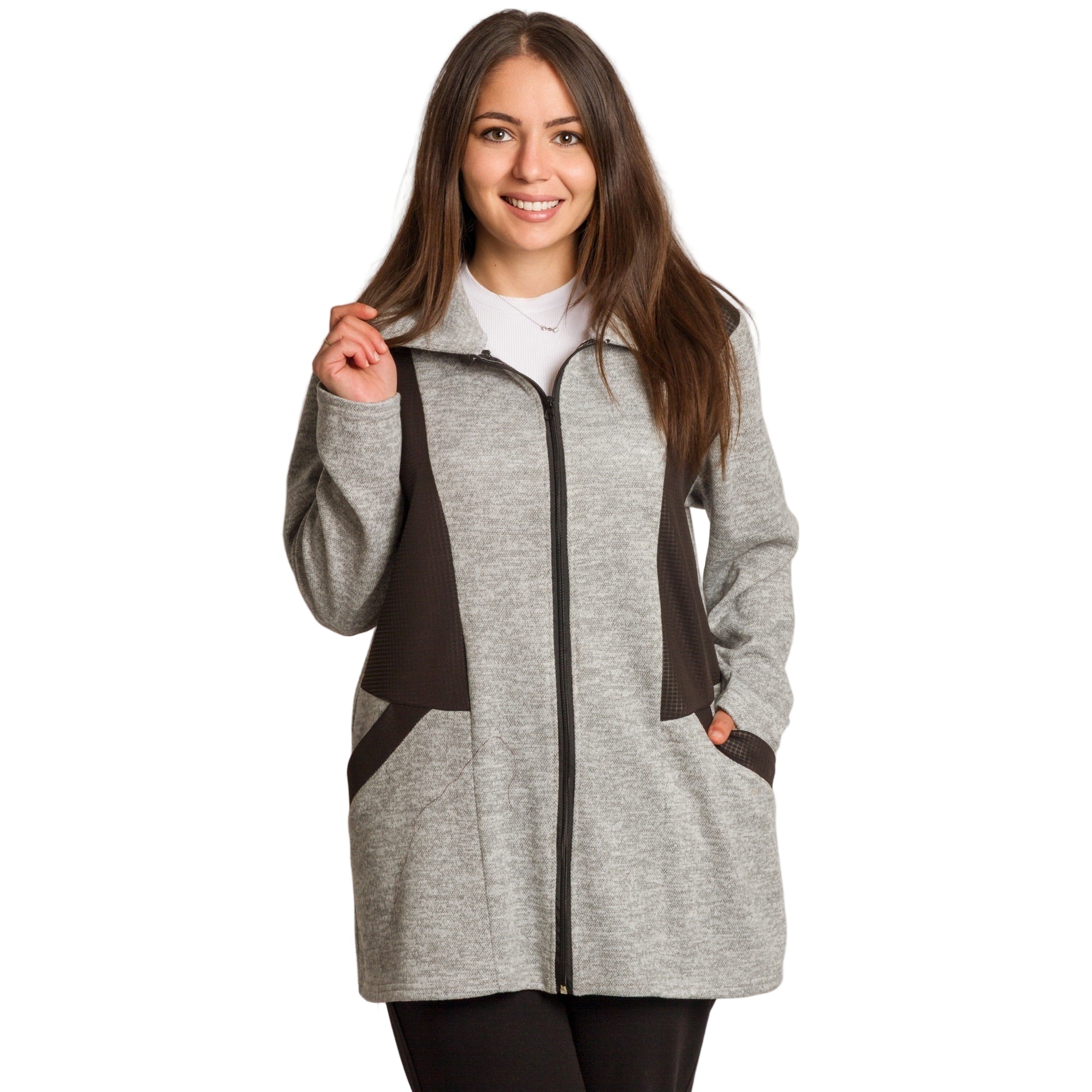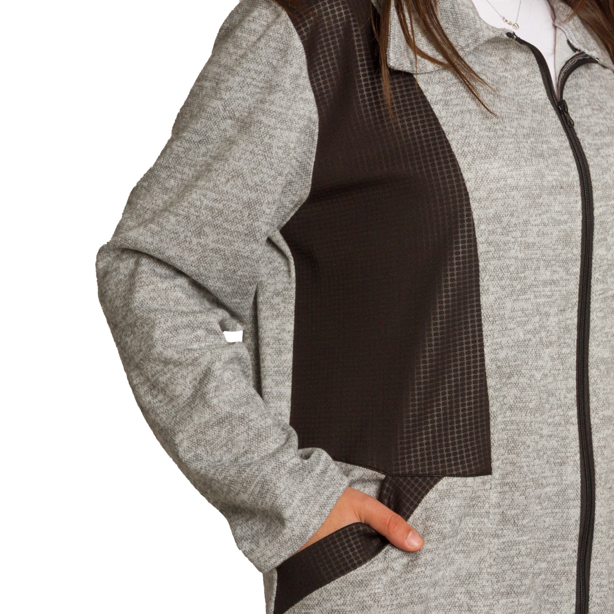 Стилен и практичен жакет в големи размери, подходящ както за ежедневието, така и за официални поводи. Моделът е изработен от мека и еластична материя с високо съдържание на вискоза, която осигурява комфорт и свобода на движенията. Основата е в сив цвят, а контрастните черни панели отпред и по ръкавите придават модерна и елегантна визия. Жакетът е със свободна кройка и практично закопчаване с цип, което улеснява носенето. Подходящ за комбинация с панталони, поли или рокли, този модел е отличен избор за есенно-зимния сезон.