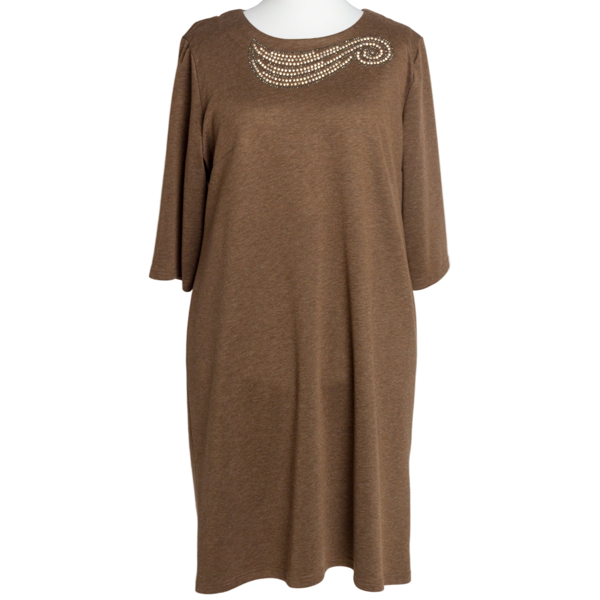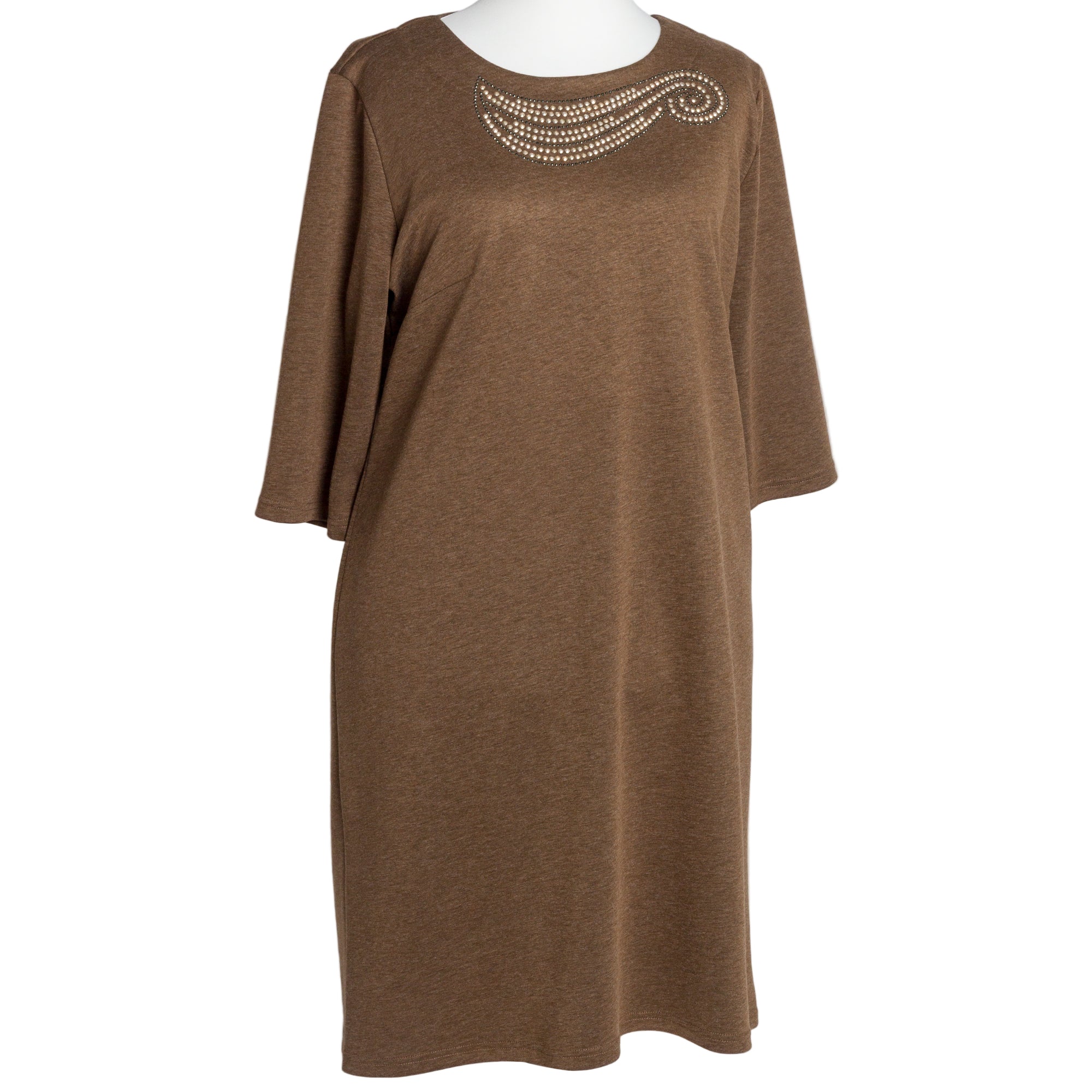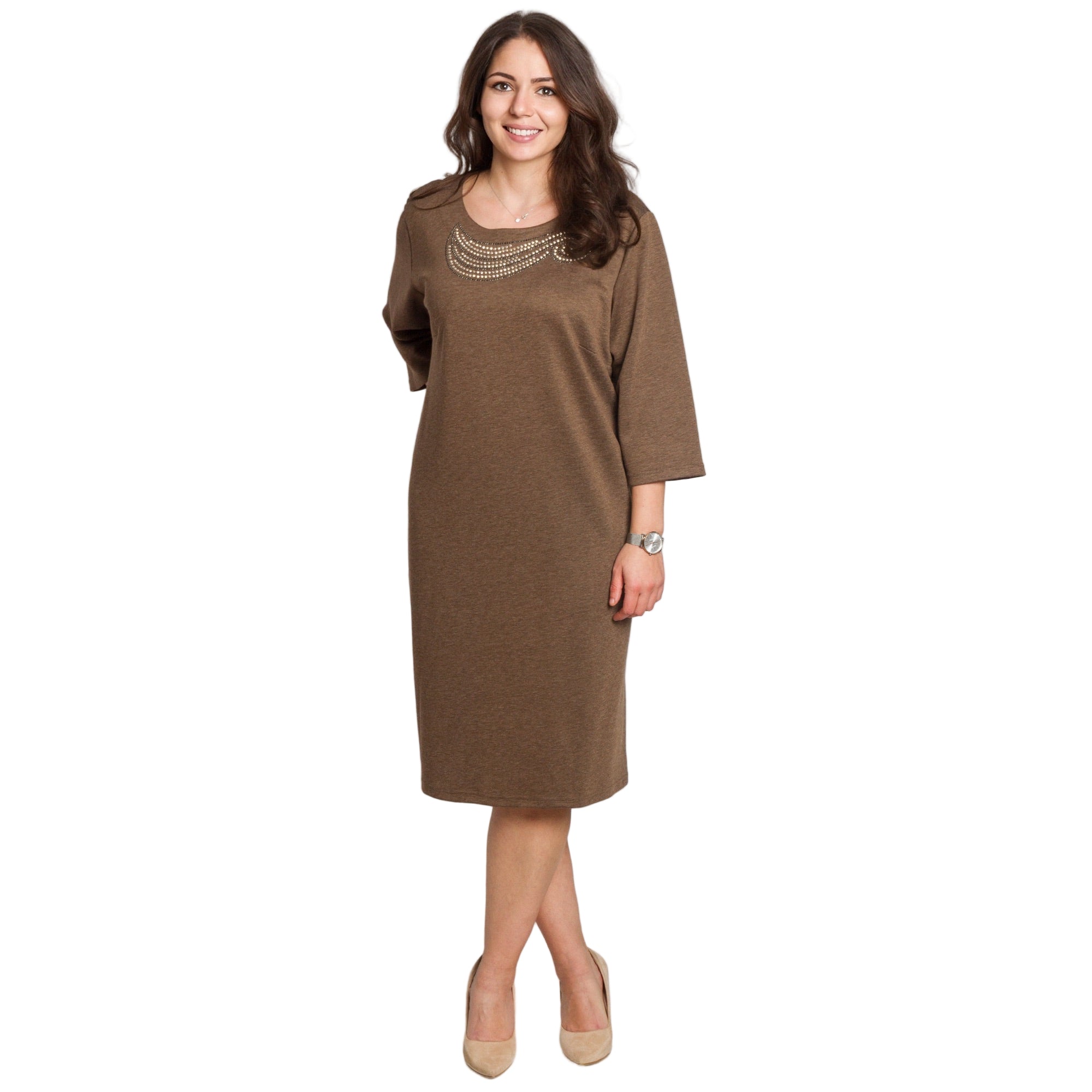 Тази кафява рокля съчетава стил и комфорт в едно. Материята е мека, еластична и приятна на допир, което я прави подходяща за ежедневно носене, но детайлът от декоративни камъни около деколтето добавя елегантност и я превръща в отличен избор и за официални случаи. Правата кройка пада свободно по тялото и стои добре на фигури с извивки, като осигурява комфорт и свобода на движение. Облото деколте визуално издължава силуета и подчертава лицето. Роклята е универсален модел, който лесно може да бъде комбиниран както с ежедневни обувки, така и с по-елегантни аксесоари за специални моменти.