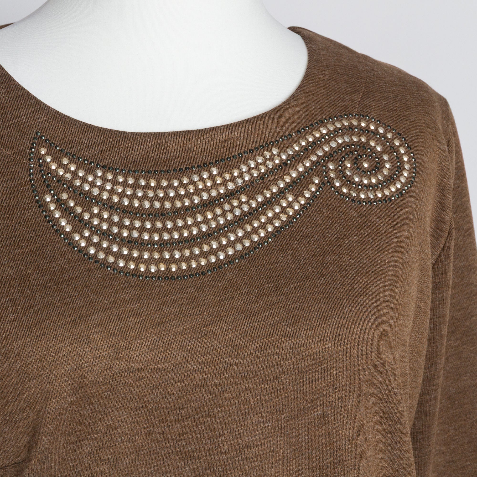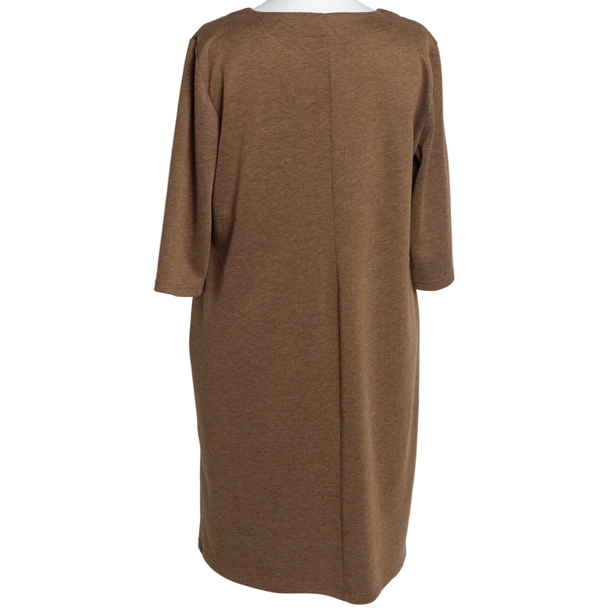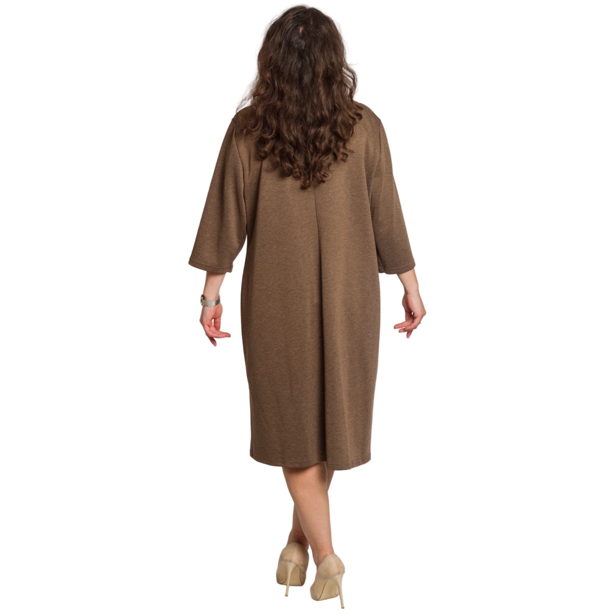Тази кафява рокля съчетава стил и комфорт в едно. Материята е мека, еластична и приятна на допир, което я прави подходяща за ежедневно носене, но детайлът от декоративни камъни около деколтето добавя елегантност и я превръща в отличен избор и за официални случаи. Правата кройка пада свободно по тялото и стои добре на фигури с извивки, като осигурява комфорт и свобода на движение. Облото деколте визуално издължава силуета и подчертава лицето. Роклята е универсален модел, който лесно може да бъде комбиниран както с ежедневни обувки, така и с по-елегантни аксесоари за специални моменти.