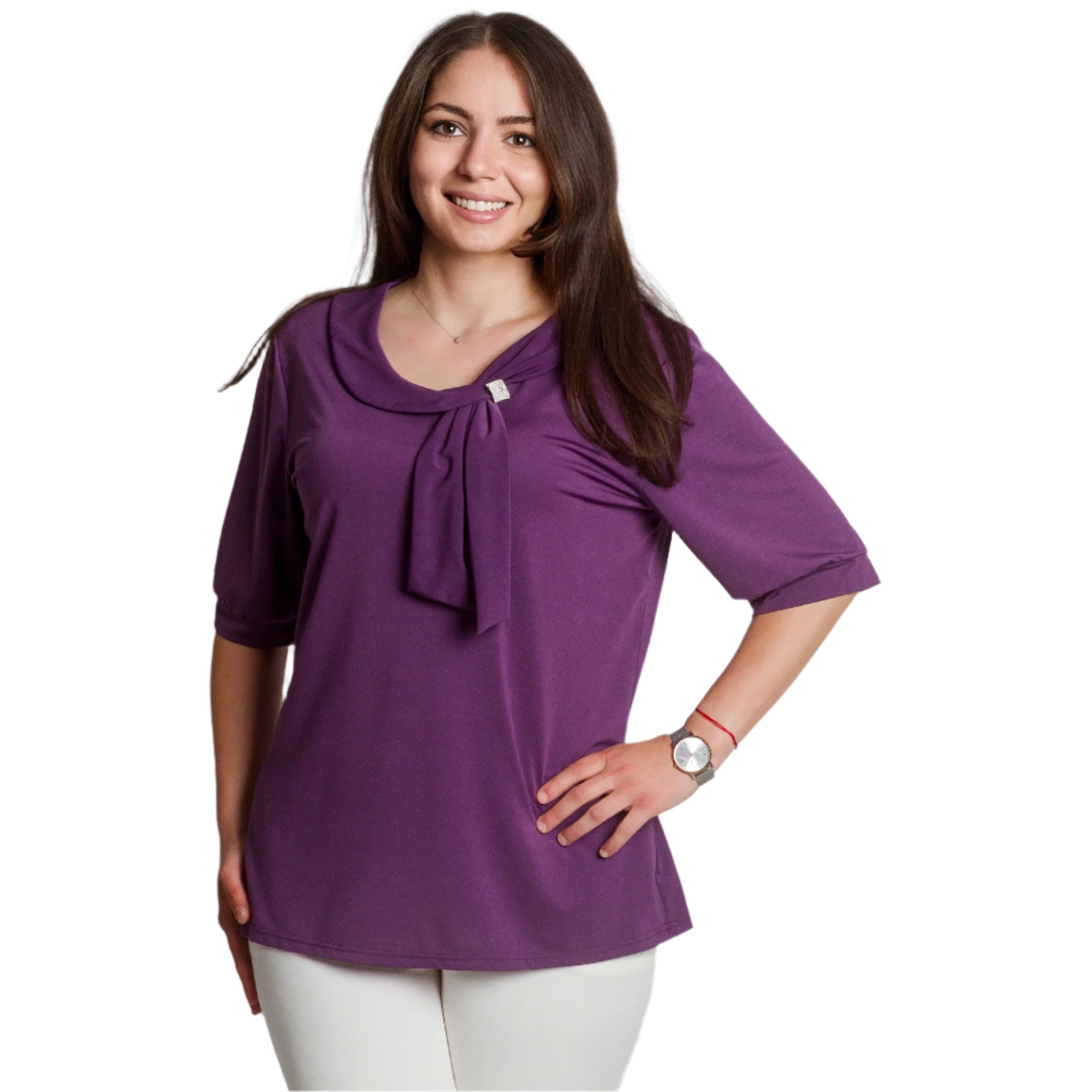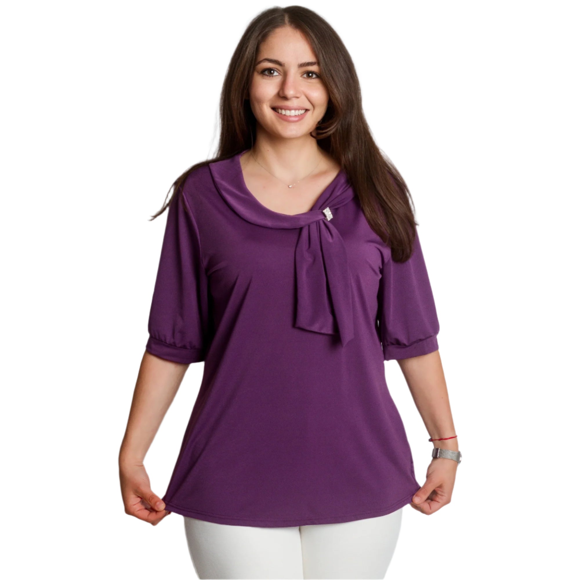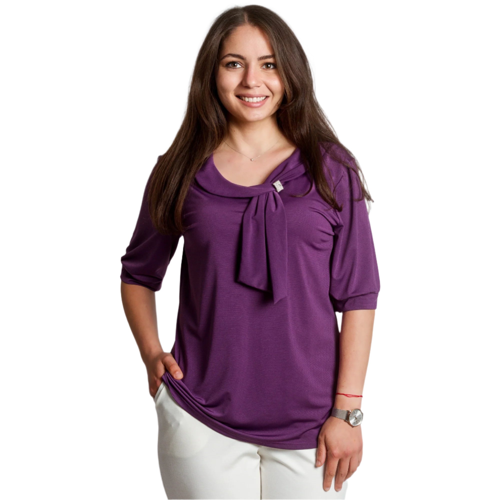 Елегантна туника в наситен лилав цвят, изработена от мекa и еластичнa материя с високо съдържание на вискоза. Моделът е със свободна линия, която обгръща нежно тялото и осигурява максимален комфорт. Кръглото деколте е украсено с декоративен елемент и впечатляваща детайлност, които придават стил и изисканост. Подходяща е както за ежедневни, така и за по-официални поводи през пролетта и лятото.