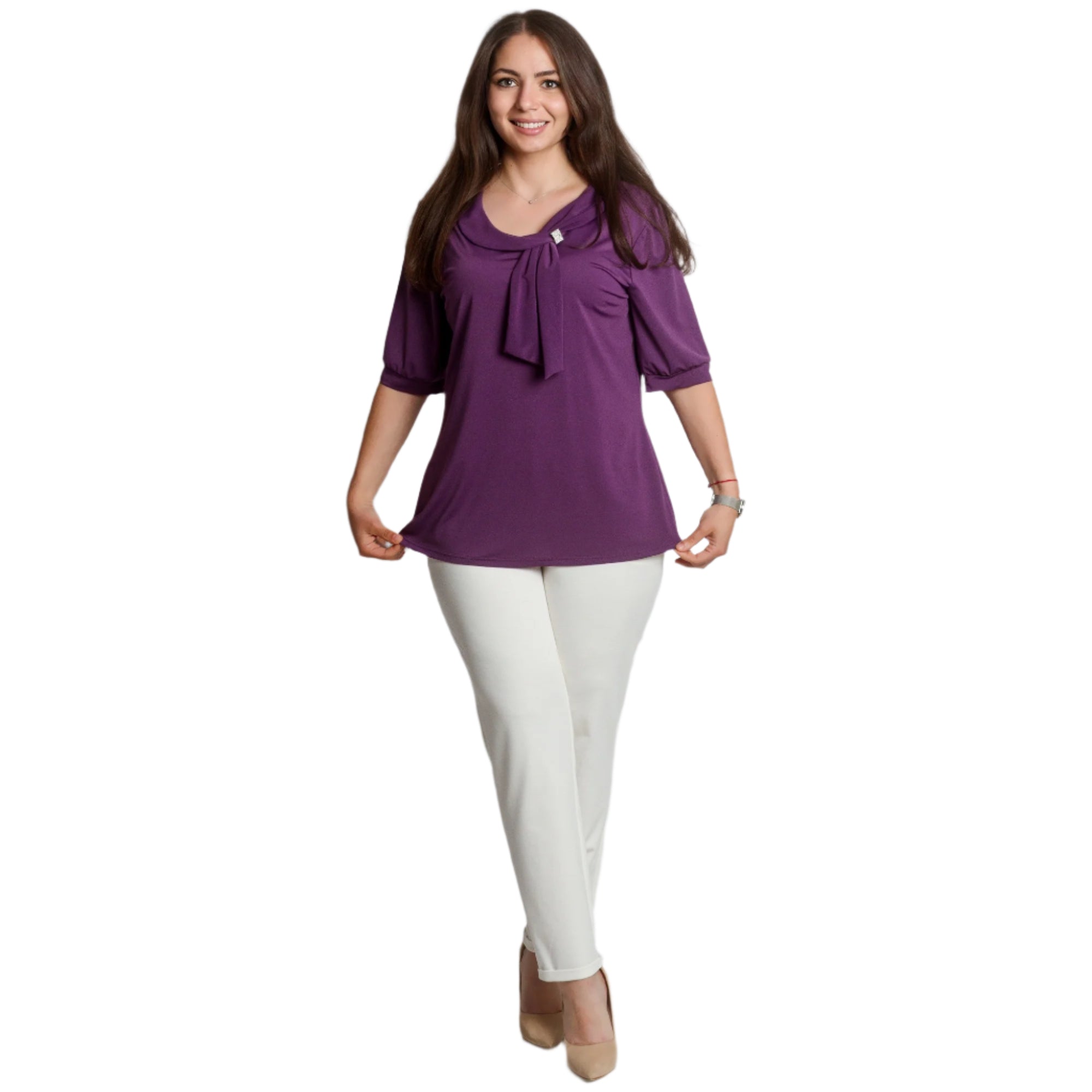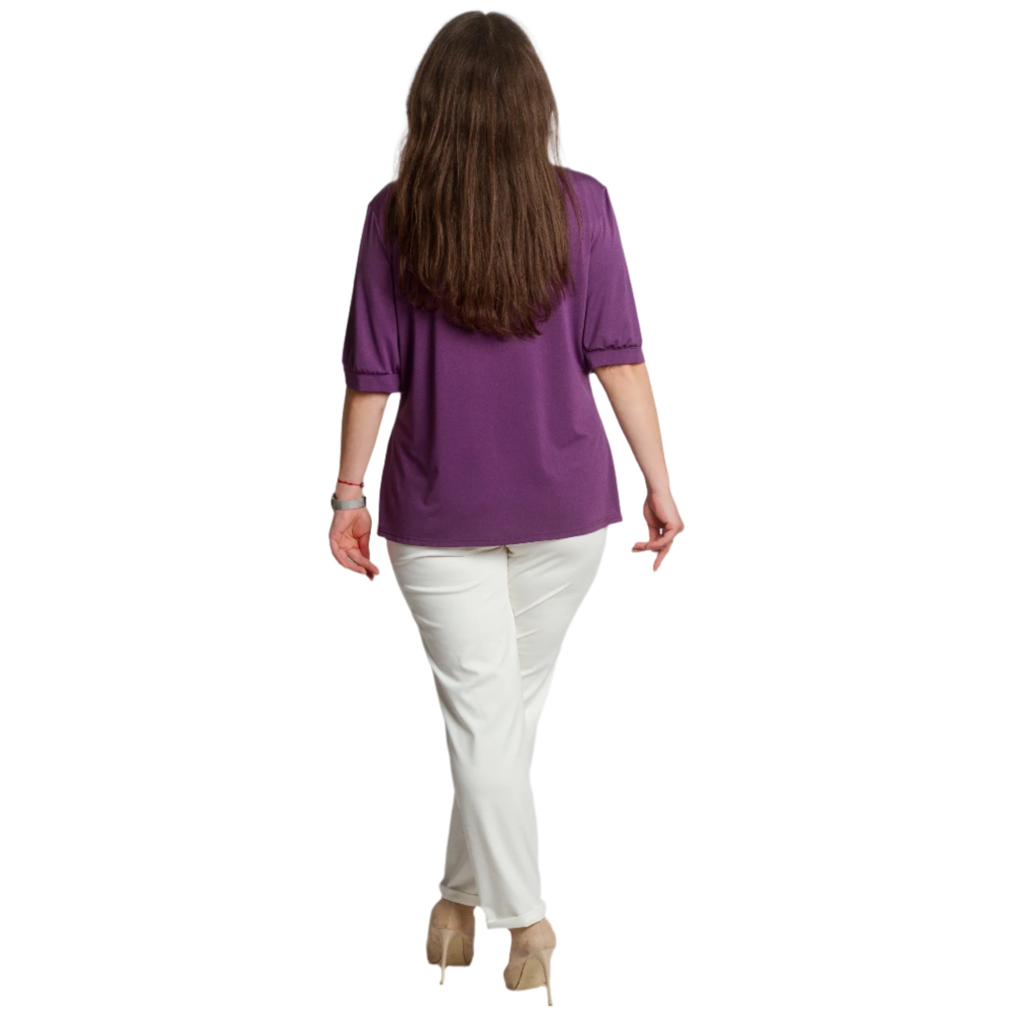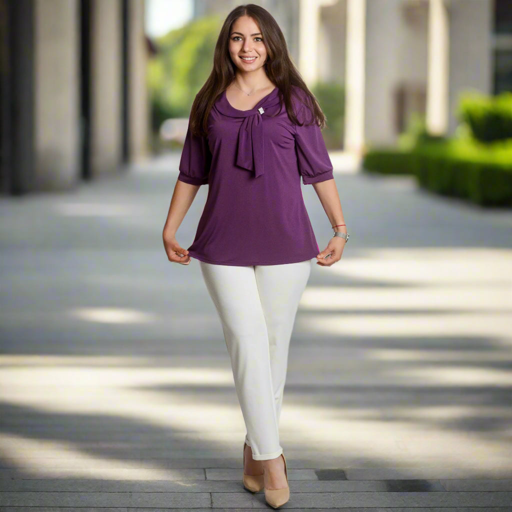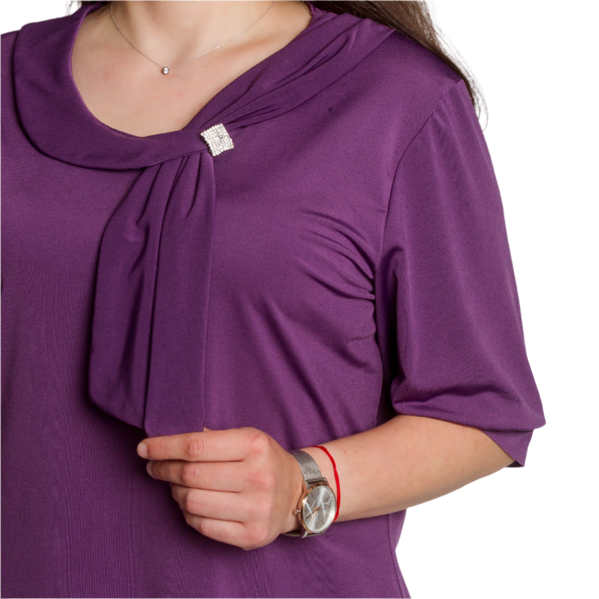 Елегантна туника в наситен лилав цвят, изработена от мекa и еластичнa материя с високо съдържание на вискоза. Моделът е със свободна линия, която обгръща нежно тялото и осигурява максимален комфорт. Кръглото деколте е украсено с декоративен елемент и впечатляваща детайлност, които придават стил и изисканост. Подходяща е както за ежедневни, така и за по-официални поводи през пролетта и лятото.