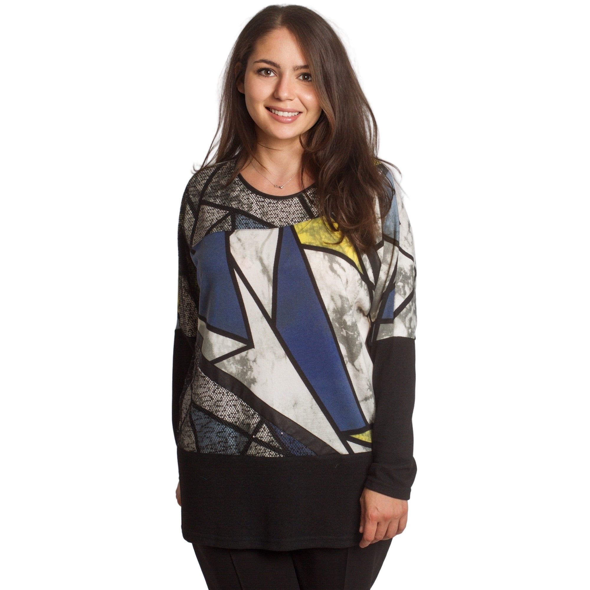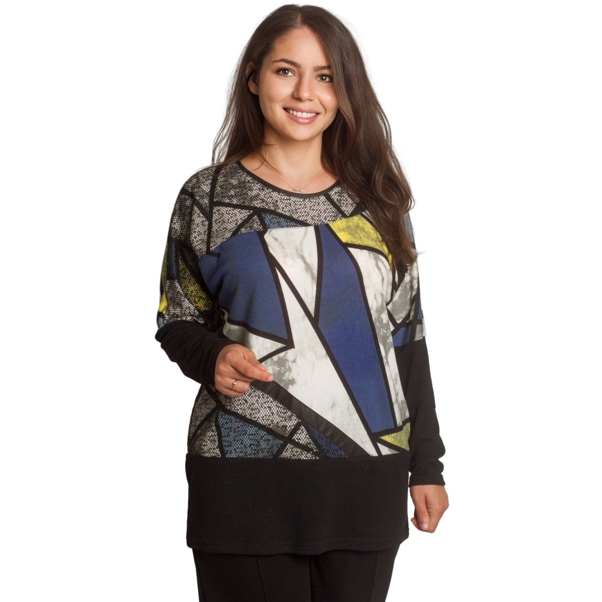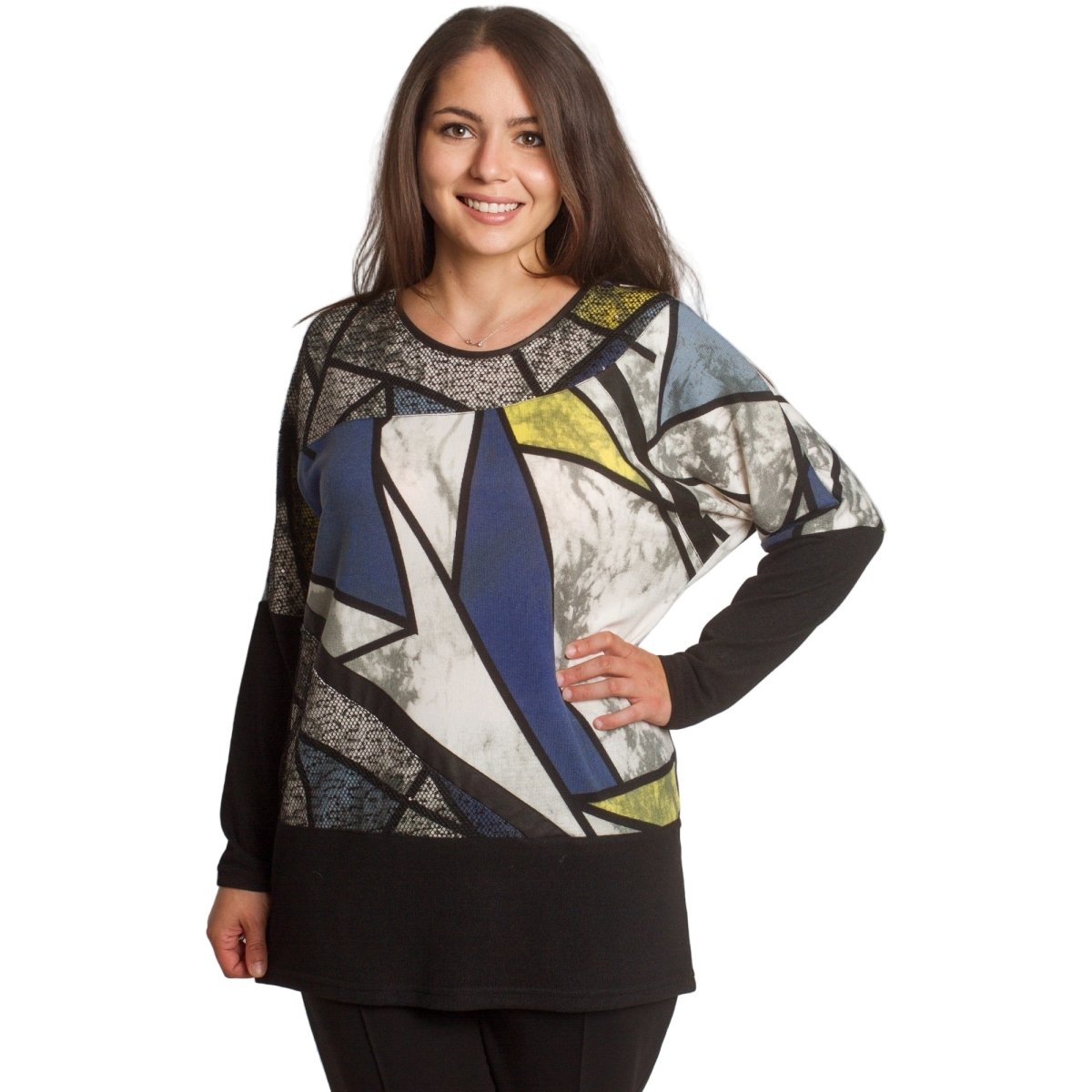 Елегантна туника в големи размери с изчистена права кройка и модерна геометрична щампа в синьо, жълто, бяло и черно. Изработена от мека и еластична материя, която осигурява комфорт и свобода на движението. Кръглото деколте е подчертано с декоративен акцент, придаващ стилен завършек. Подходяща е както за ежедневието, така и за официални поводи през есенно-зимния сезон.