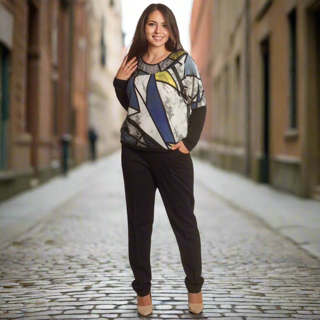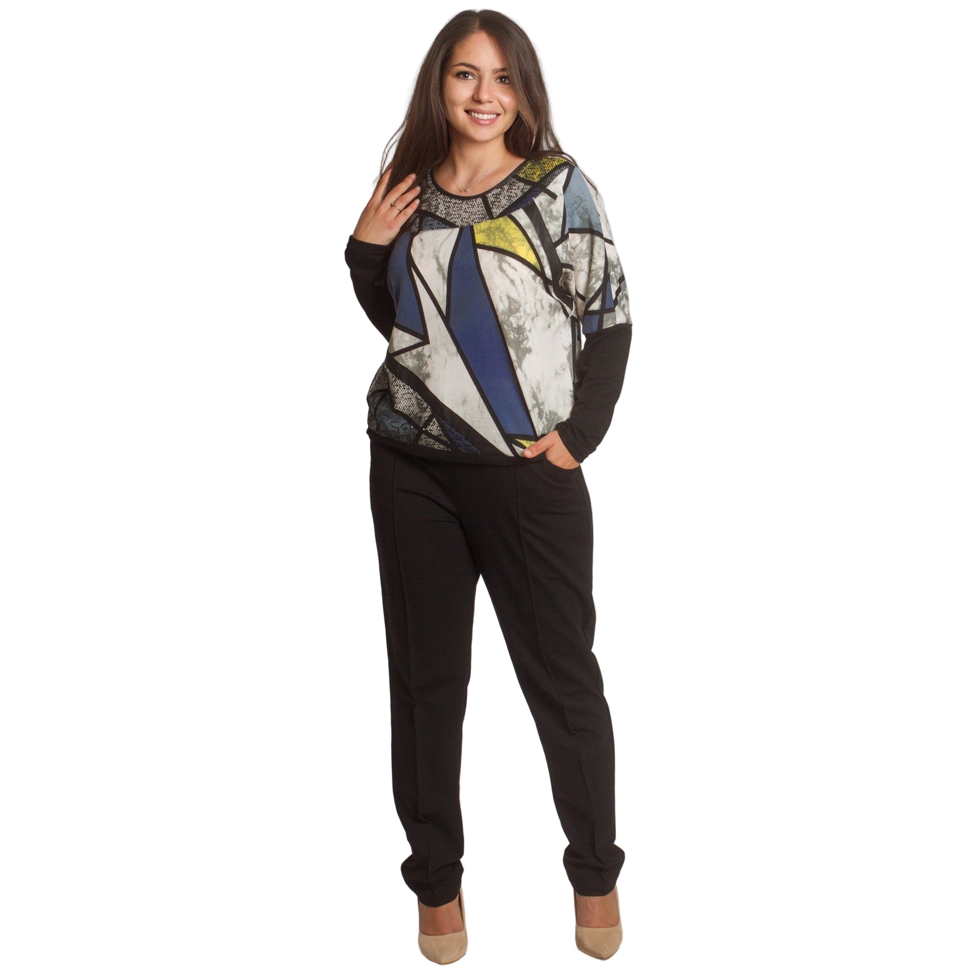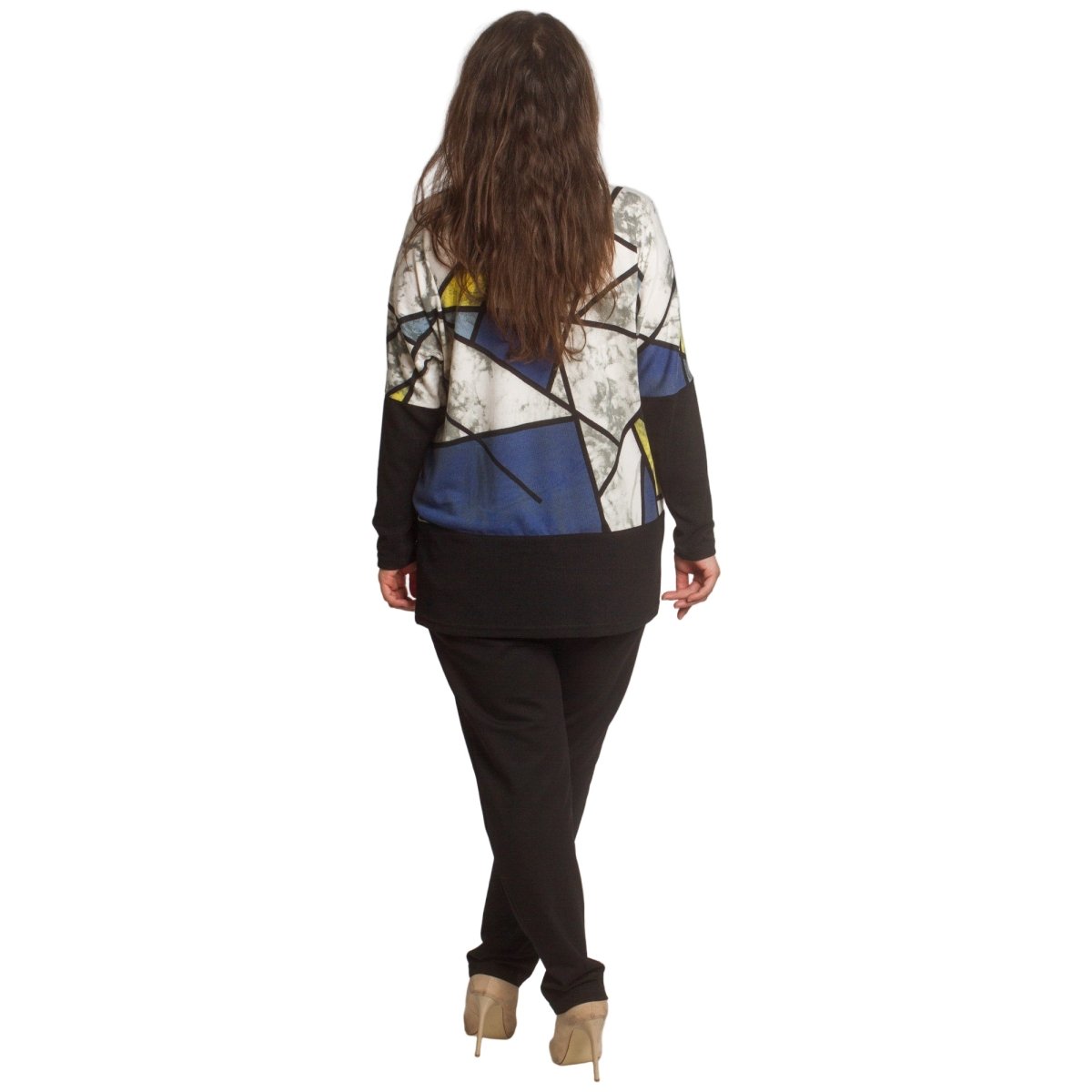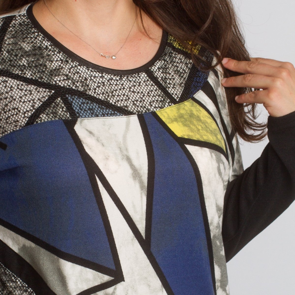 Елегантна туника в големи размери с изчистена права кройка и модерна геометрична щампа в синьо, жълто, бяло и черно. Изработена от мека и еластична материя, която осигурява комфорт и свобода на движението. Кръглото деколте е подчертано с декоративен акцент, придаващ стилен завършек. Подходяща е както за ежедневието, така и за официални поводи през есенно-зимния сезон.
