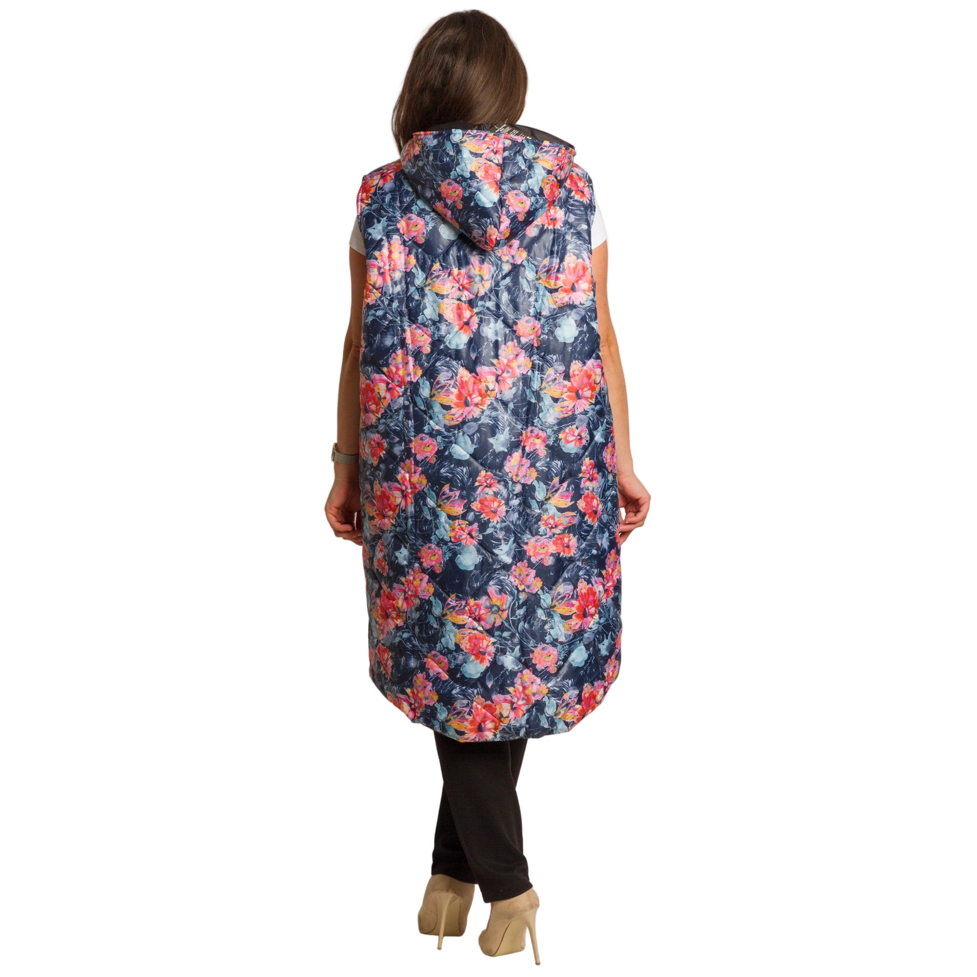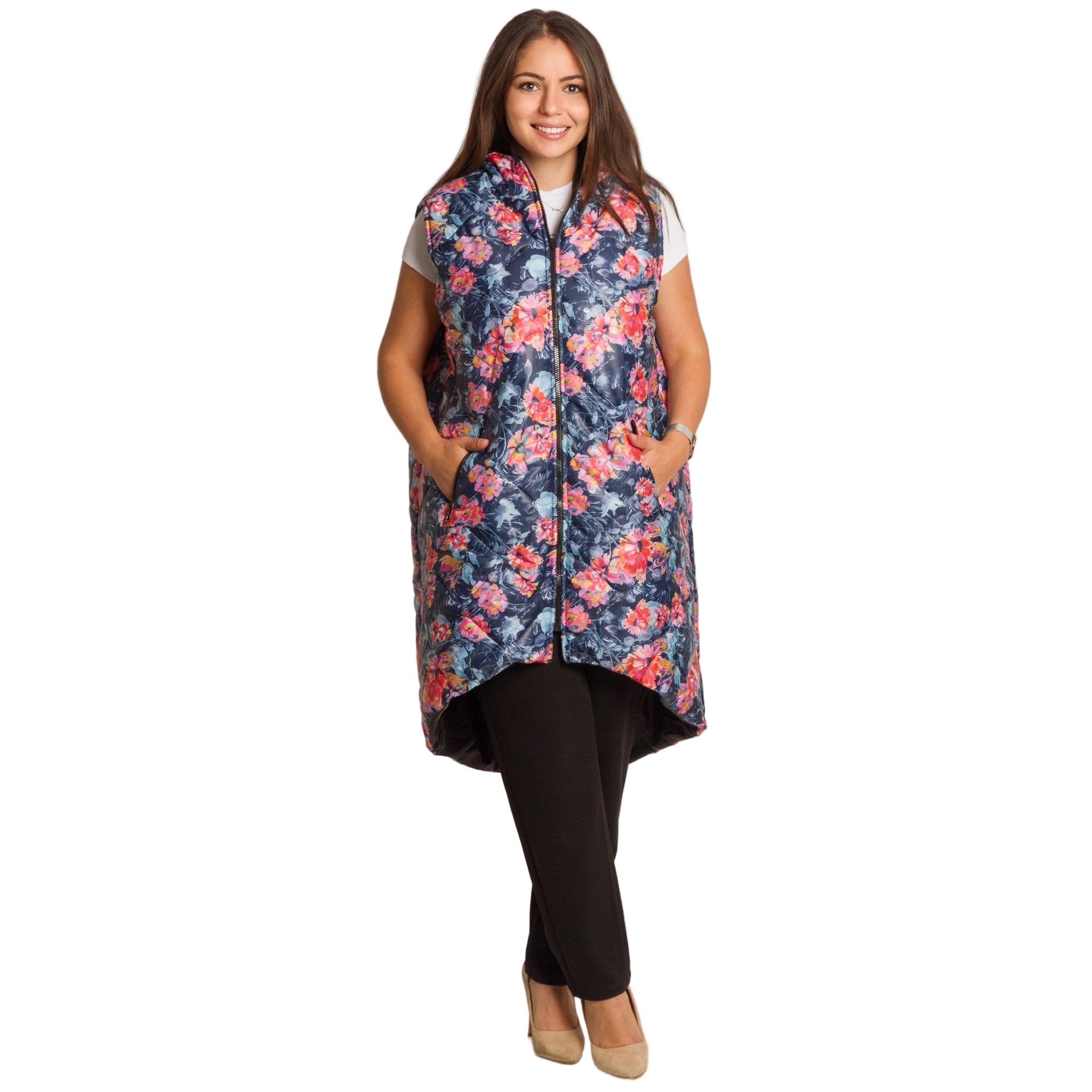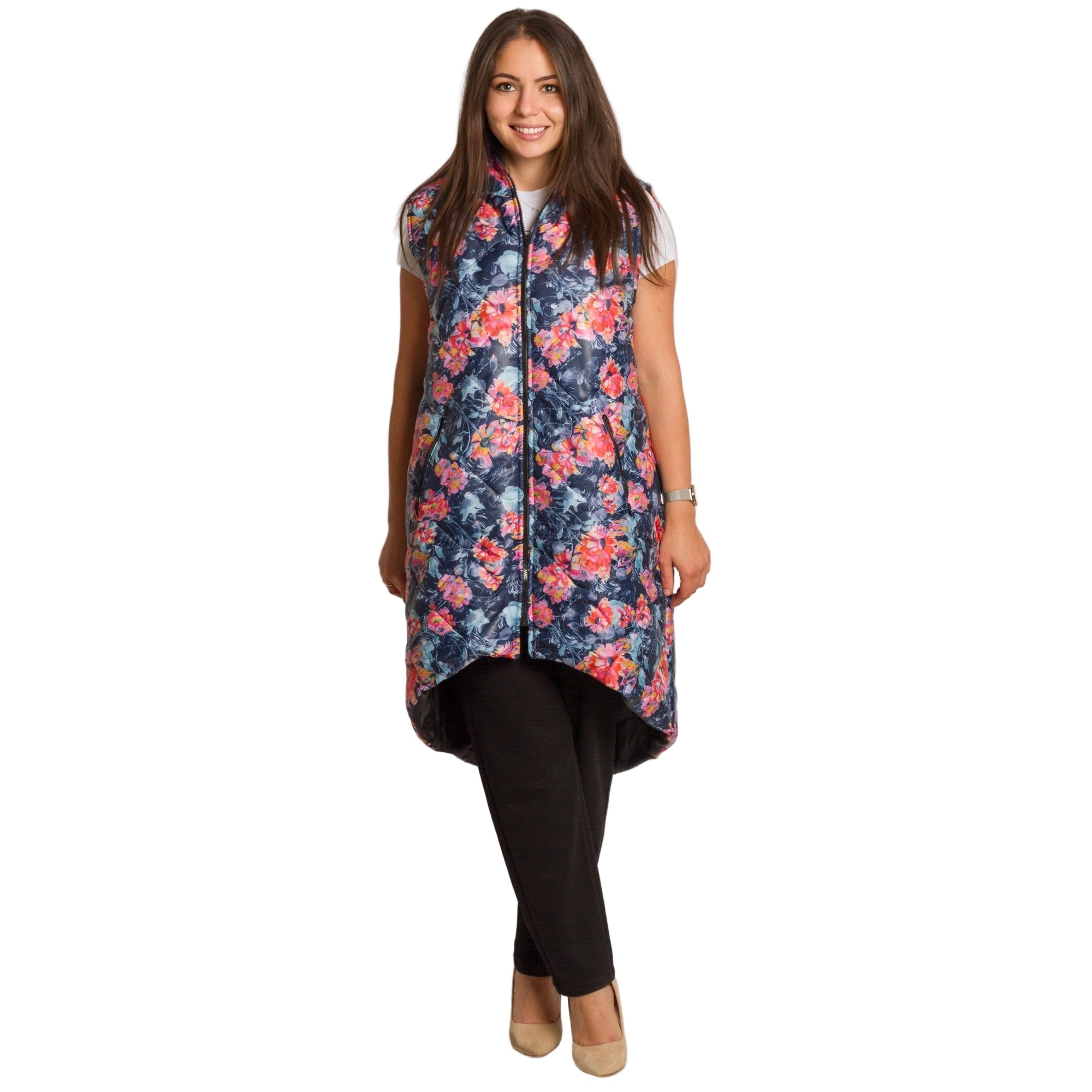Елегантен и удобен елек в многоцветен флорален десен, подходящ за ежедневието и по-елегантни визии. Изработен от мека и еластична материя с вискоза, която осигурява комфорт и свобода на движение. Моделът е с разкроена кройка, която прикрива силуета и придава женственост. Закопчава се с цип и разполага с практични джобове отстрани. Отличен избор за есенно-зимния сезон, който внася свежест и стил във всяка визия.