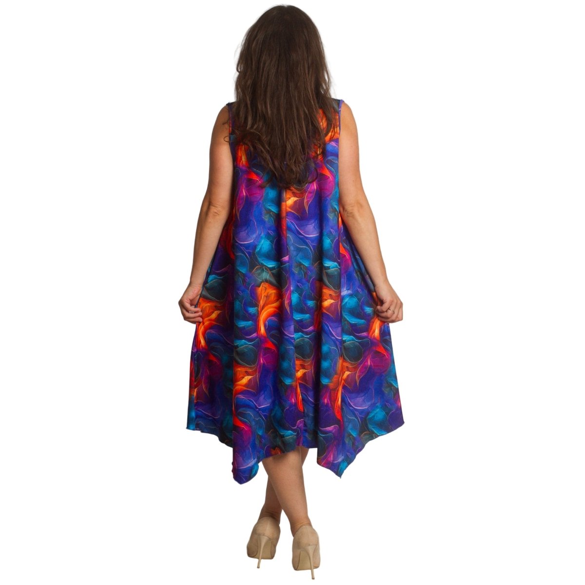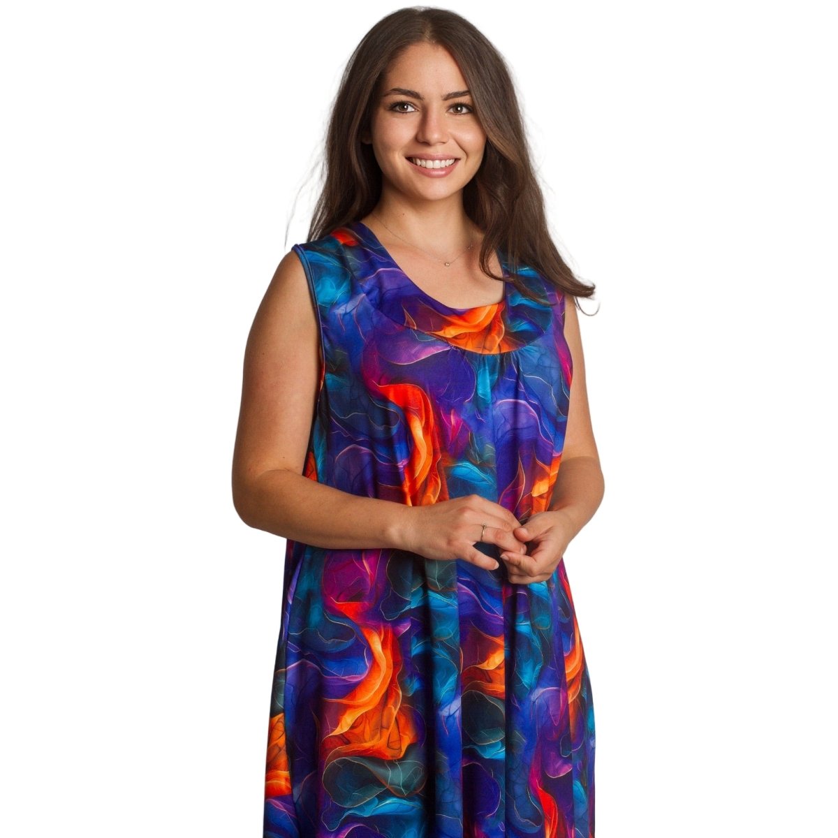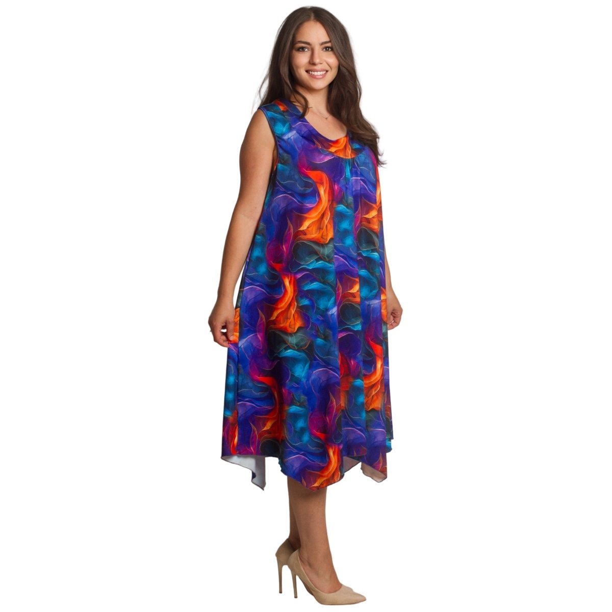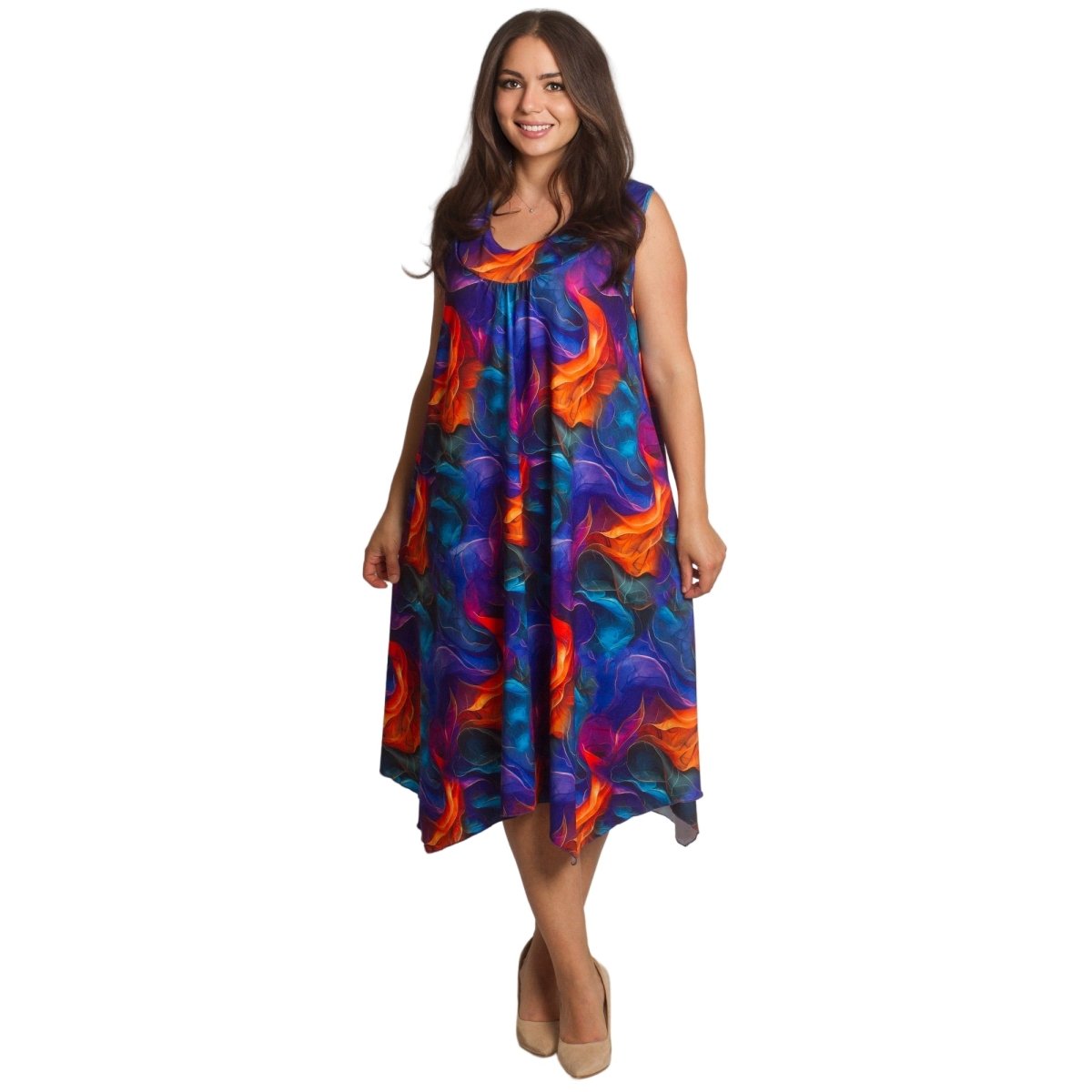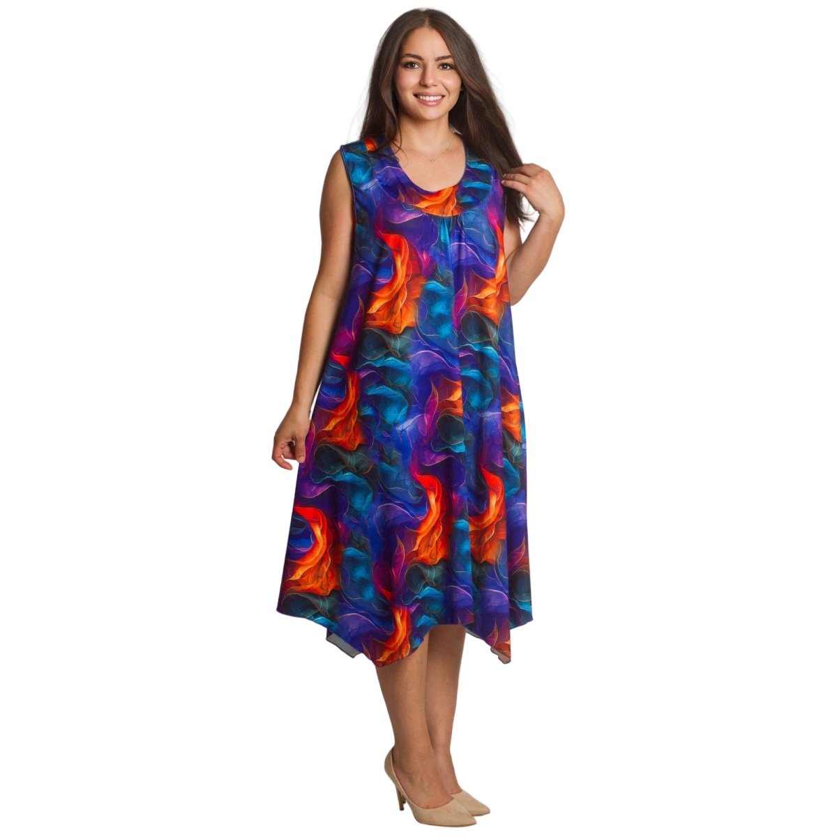 Елегантна и удобна рокля в големи размери, изработена от висококачествен памук с еластан за комфорт и лекота. Моделът е с обло деколте и разкроена кройка, която създава ефирно усещане и красиво пада по тялото. Дължината е под коляното, което я прави подходяща както за ежедневието, така и за по-специални моменти през пролетно-летния сезон. Живописният многоцветен десен добавя настроение и стил към всяка визия.