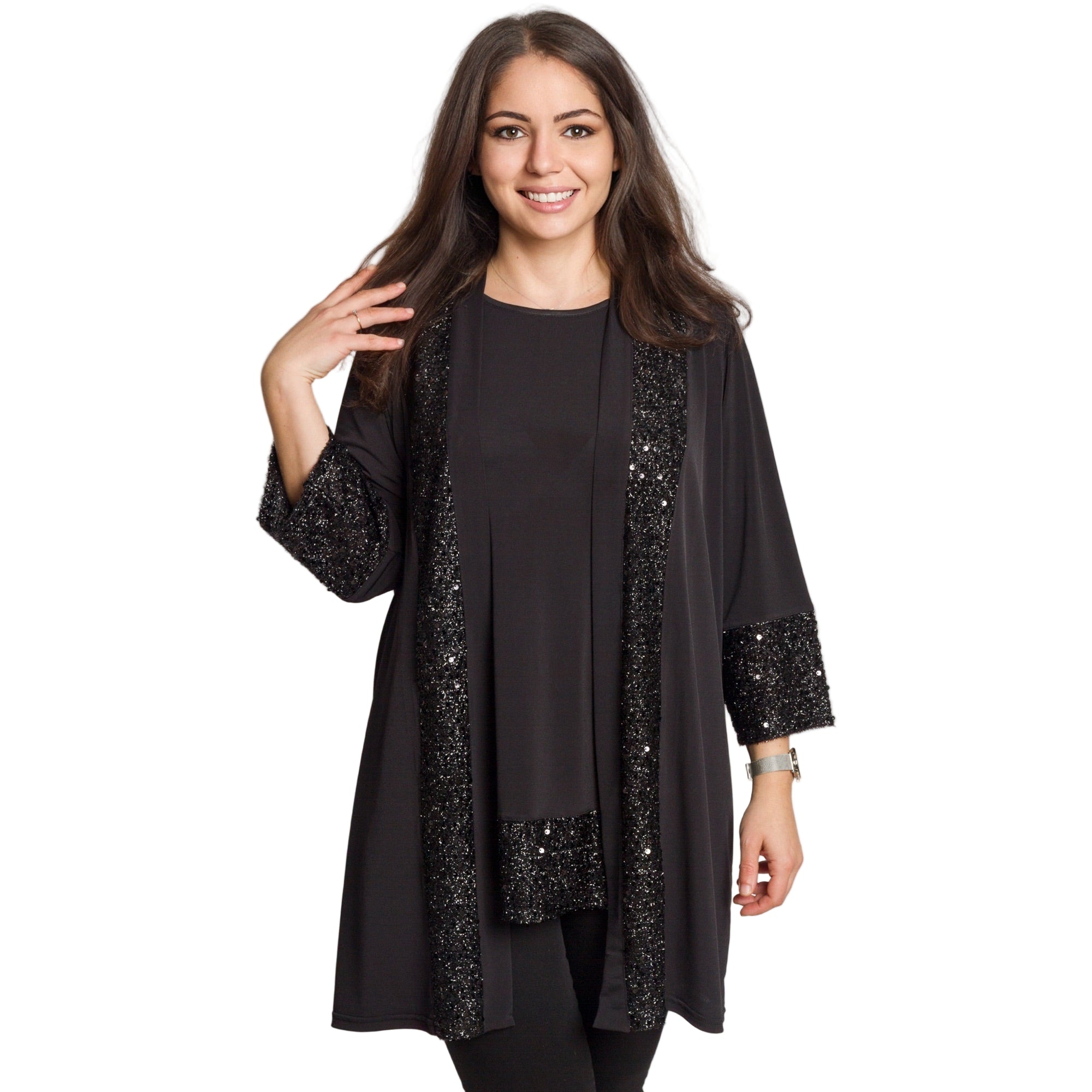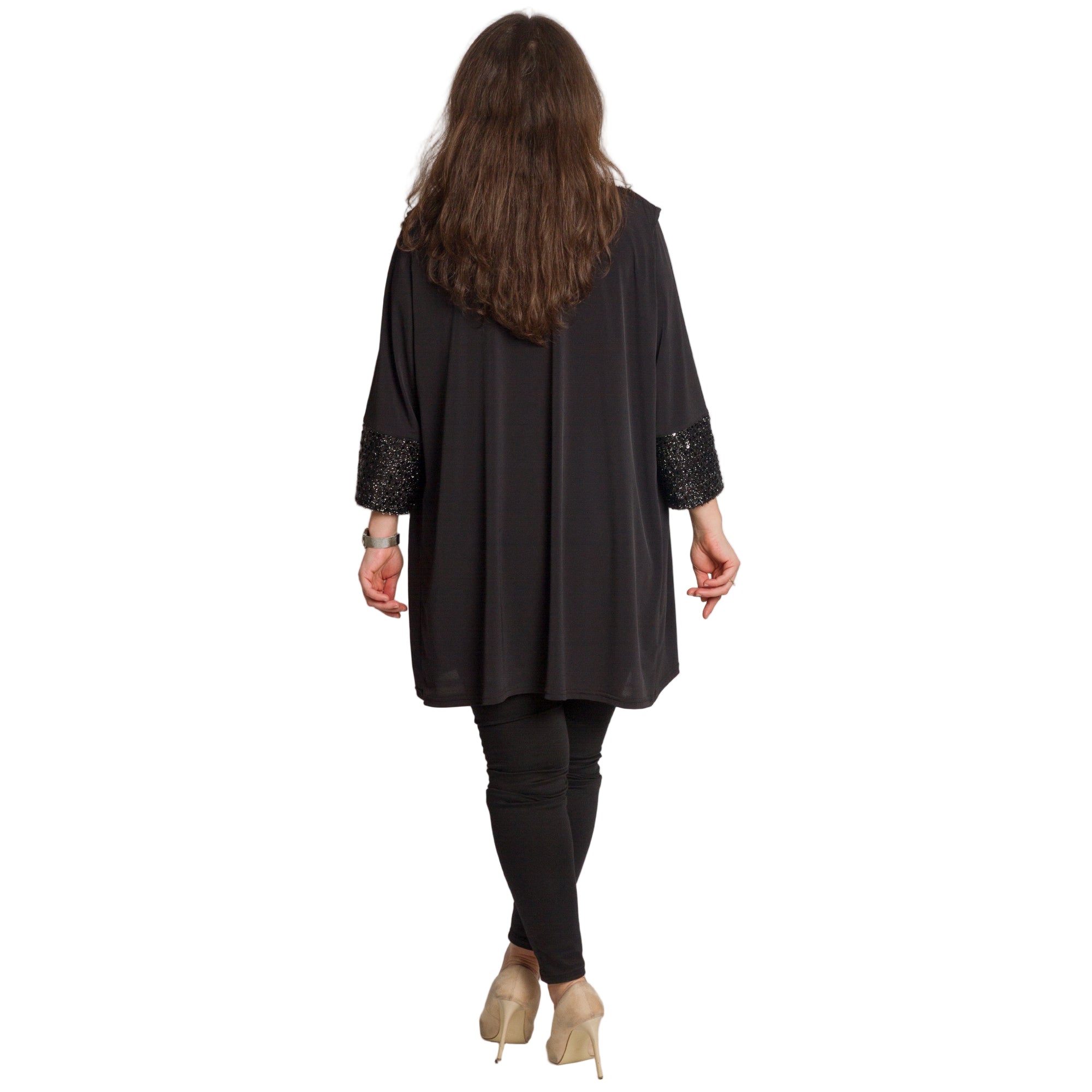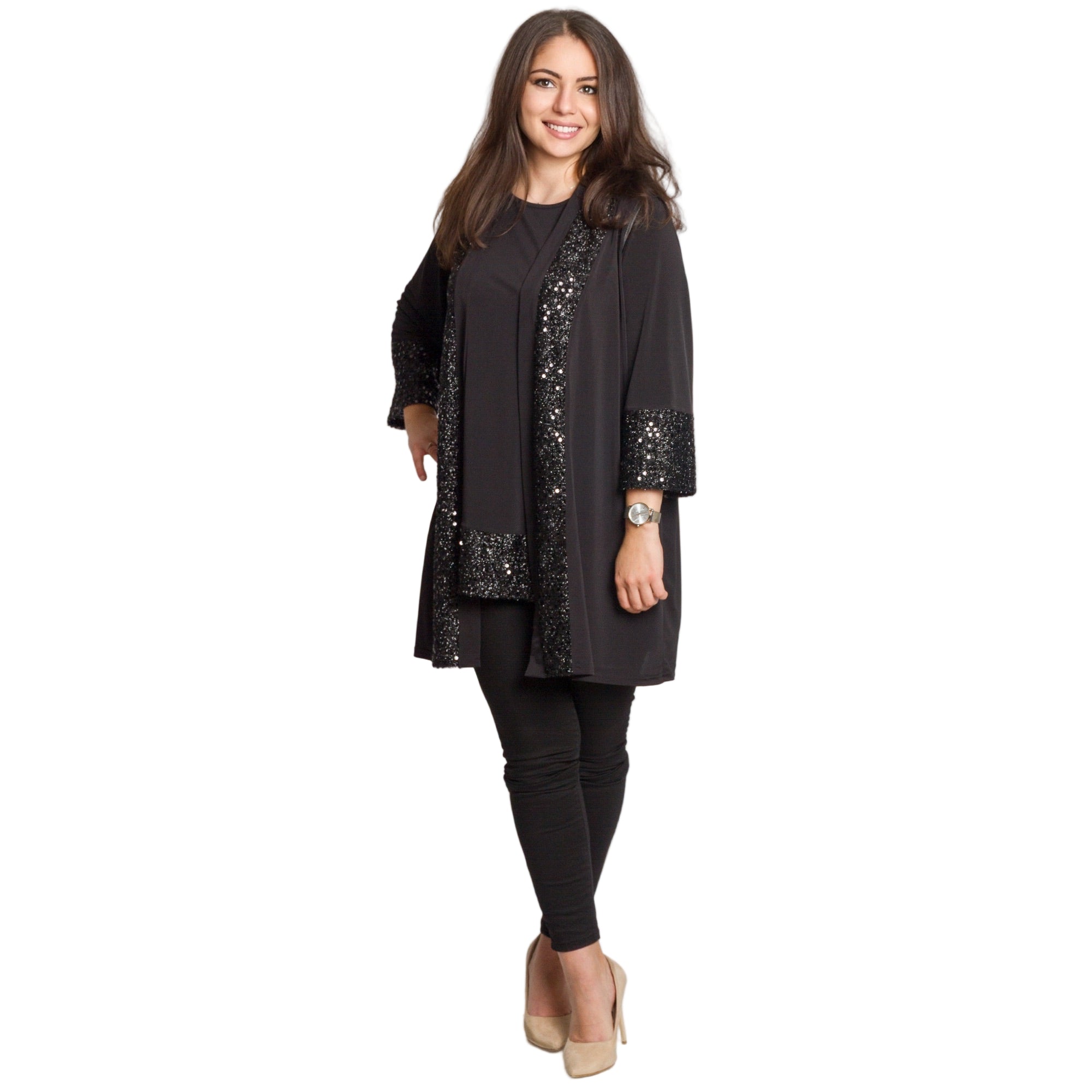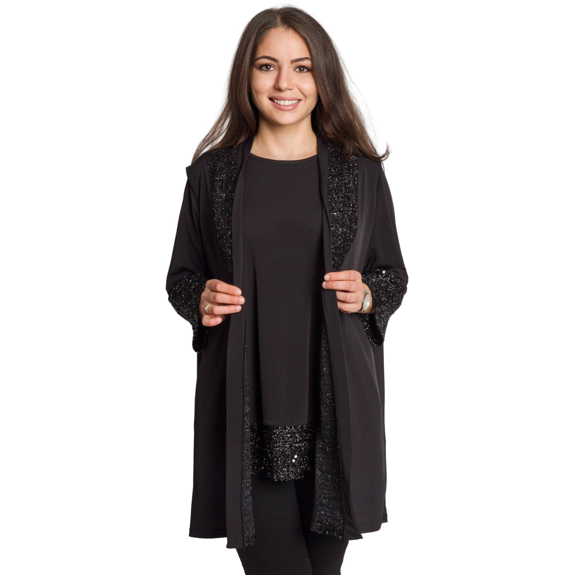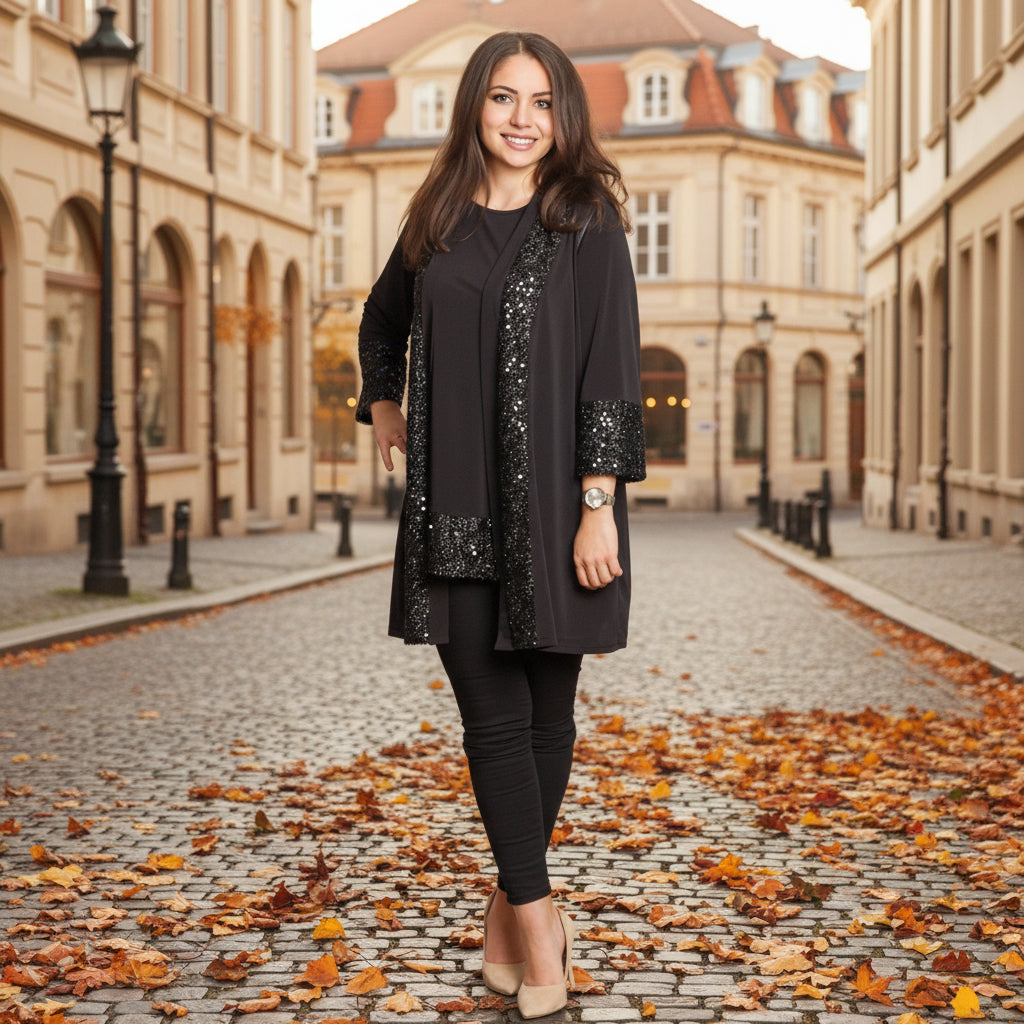 Елегантен макси комплект, състоящ се от туника и елек, изработени от мека и еластична материя с луксозни детайли от пайети. Туниката е с обло деколте и 3/4 ръкави, украсени с черна бляскава лента по ръкавите и в долната част. Елекът е в същия стил – без закопчаване, със свободна кройка и пайетени кантове, които подчертават линията на тялото. Моделът е идеален избор за официални поводи, вечерни събития и празнични моменти.