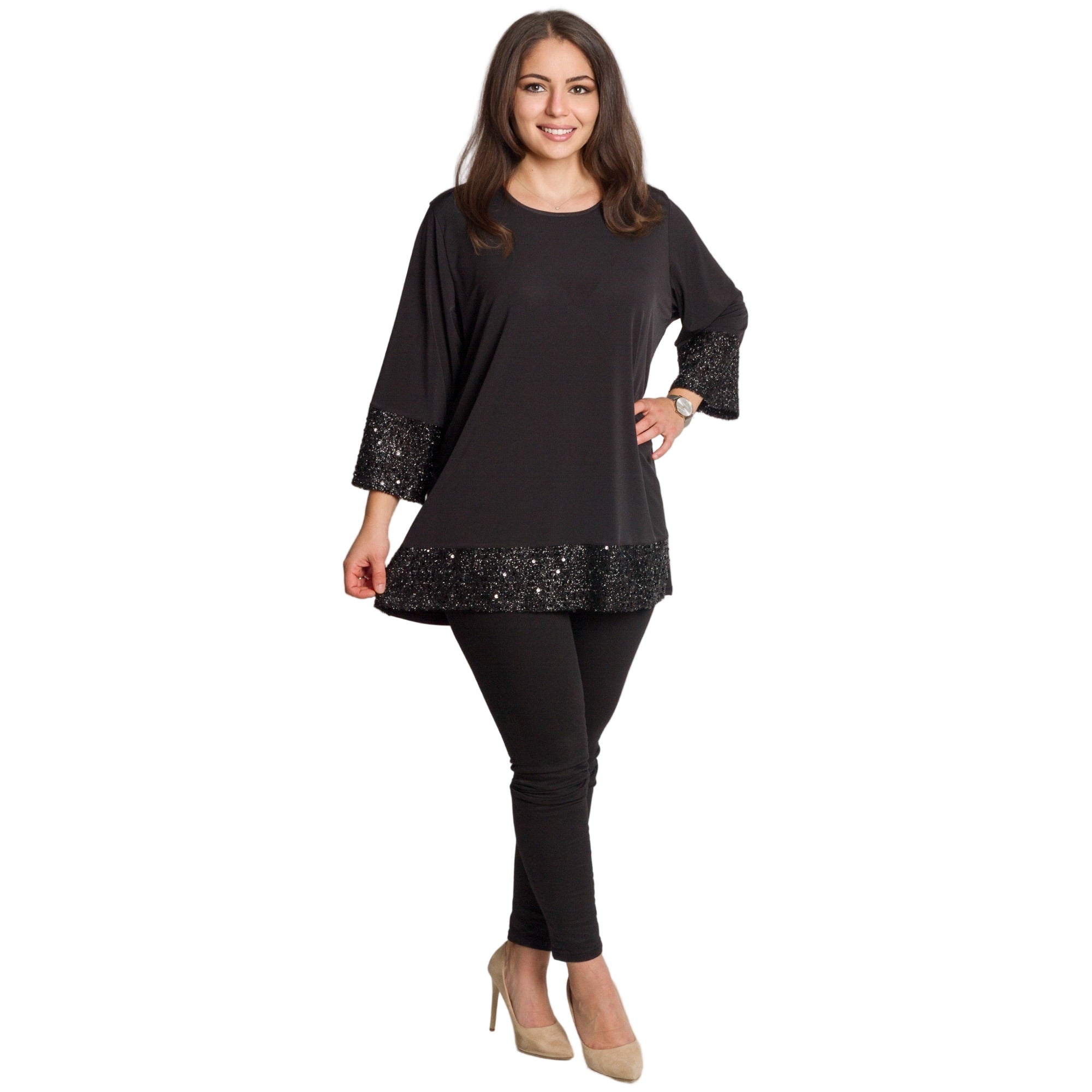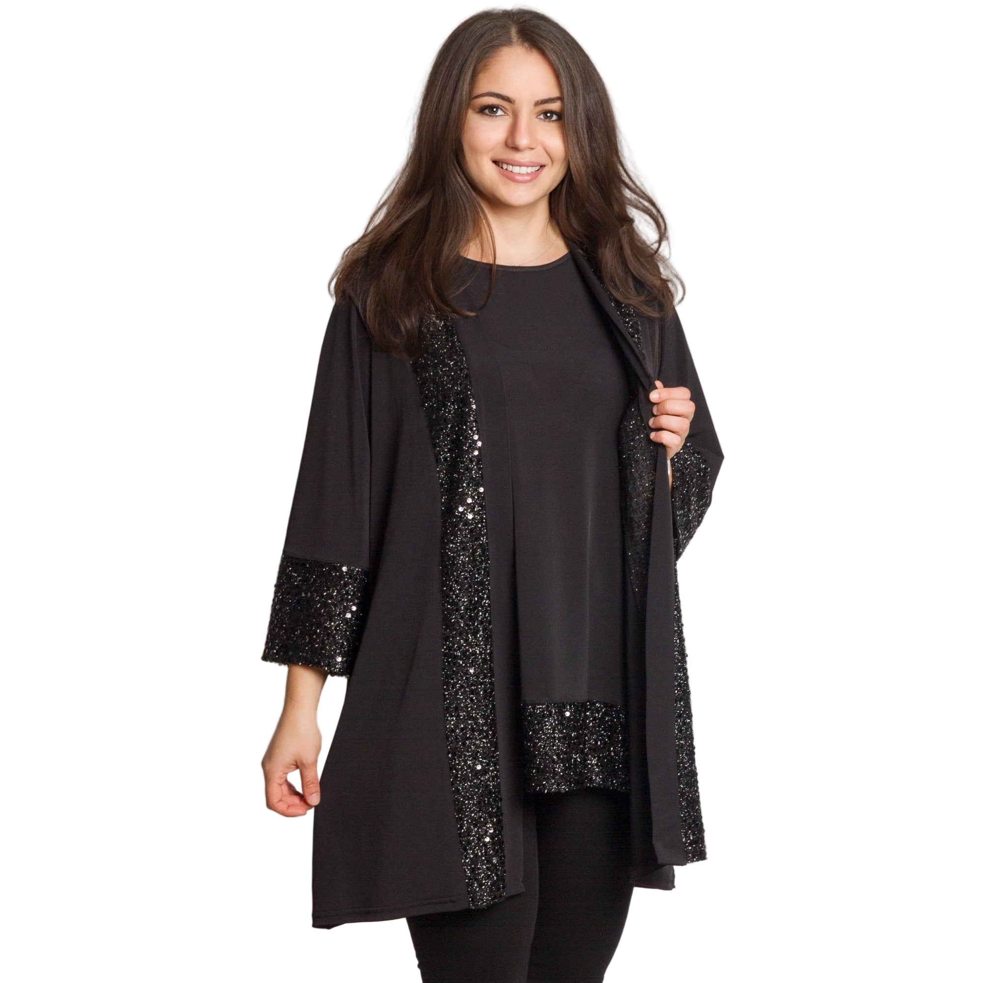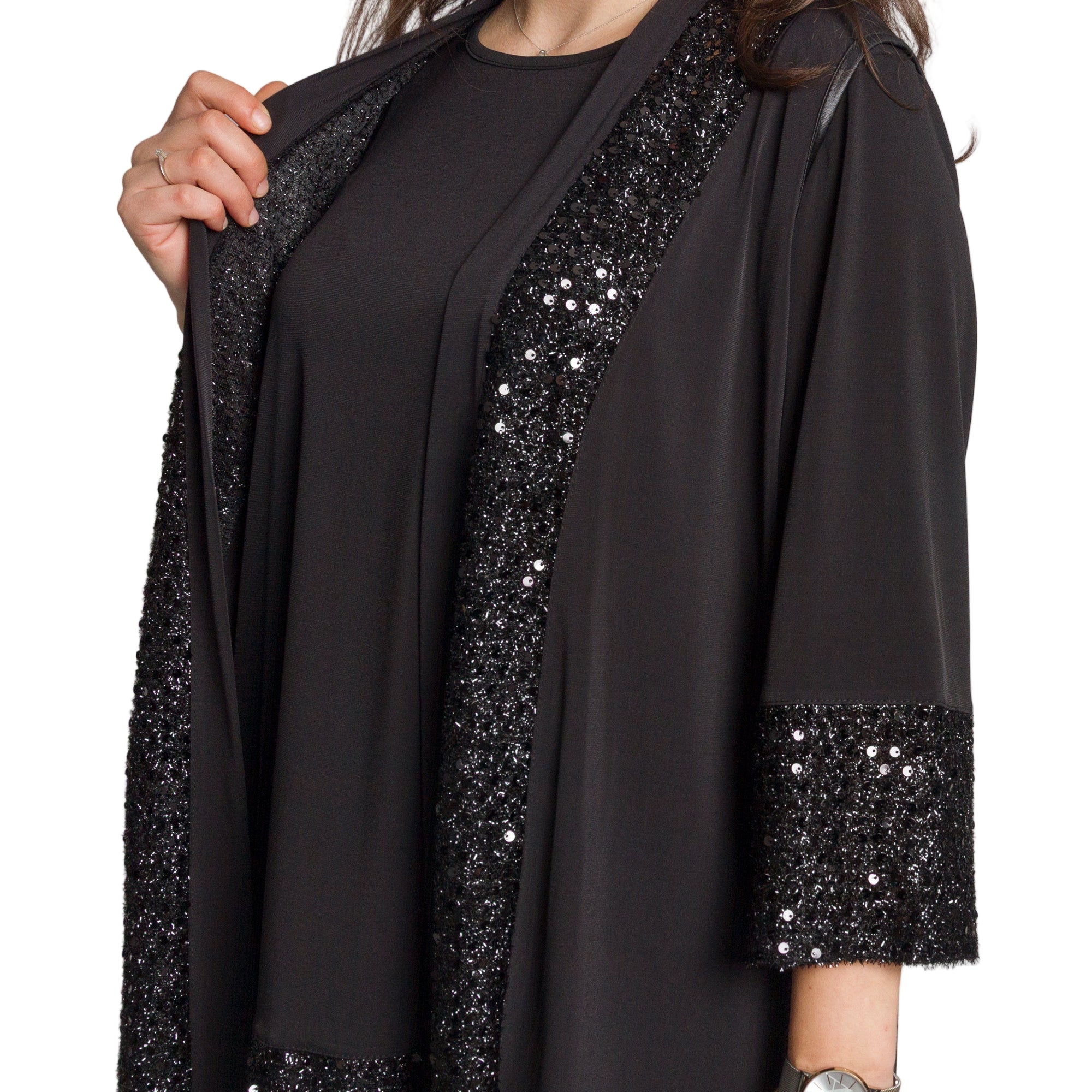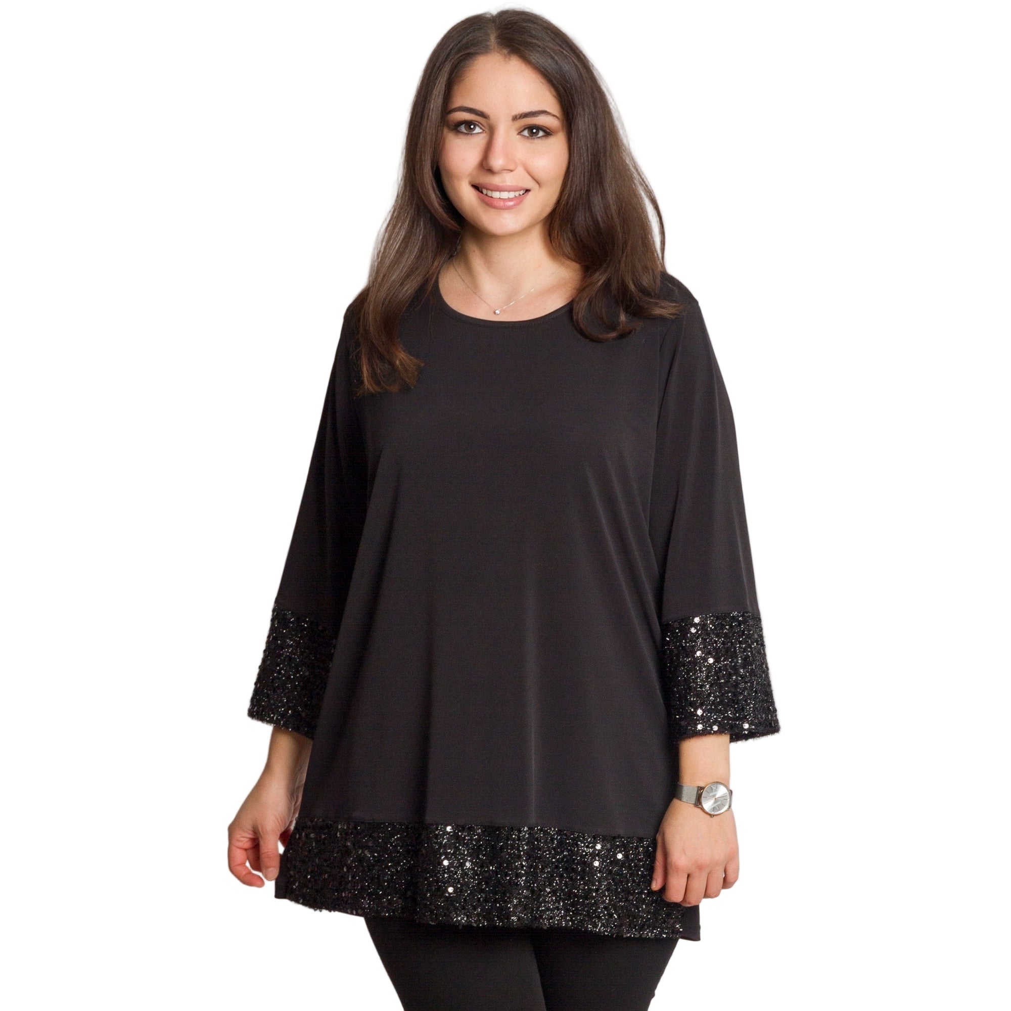 Елегантен макси комплект, състоящ се от туника и елек, изработени от мека и еластична материя с луксозни детайли от пайети. Туниката е с обло деколте и 3/4 ръкави, украсени с черна бляскава лента по ръкавите и в долната част. Елекът е в същия стил – без закопчаване, със свободна кройка и пайетени кантове, които подчертават линията на тялото. Моделът е идеален избор за официални поводи, вечерни събития и празнични моменти.
