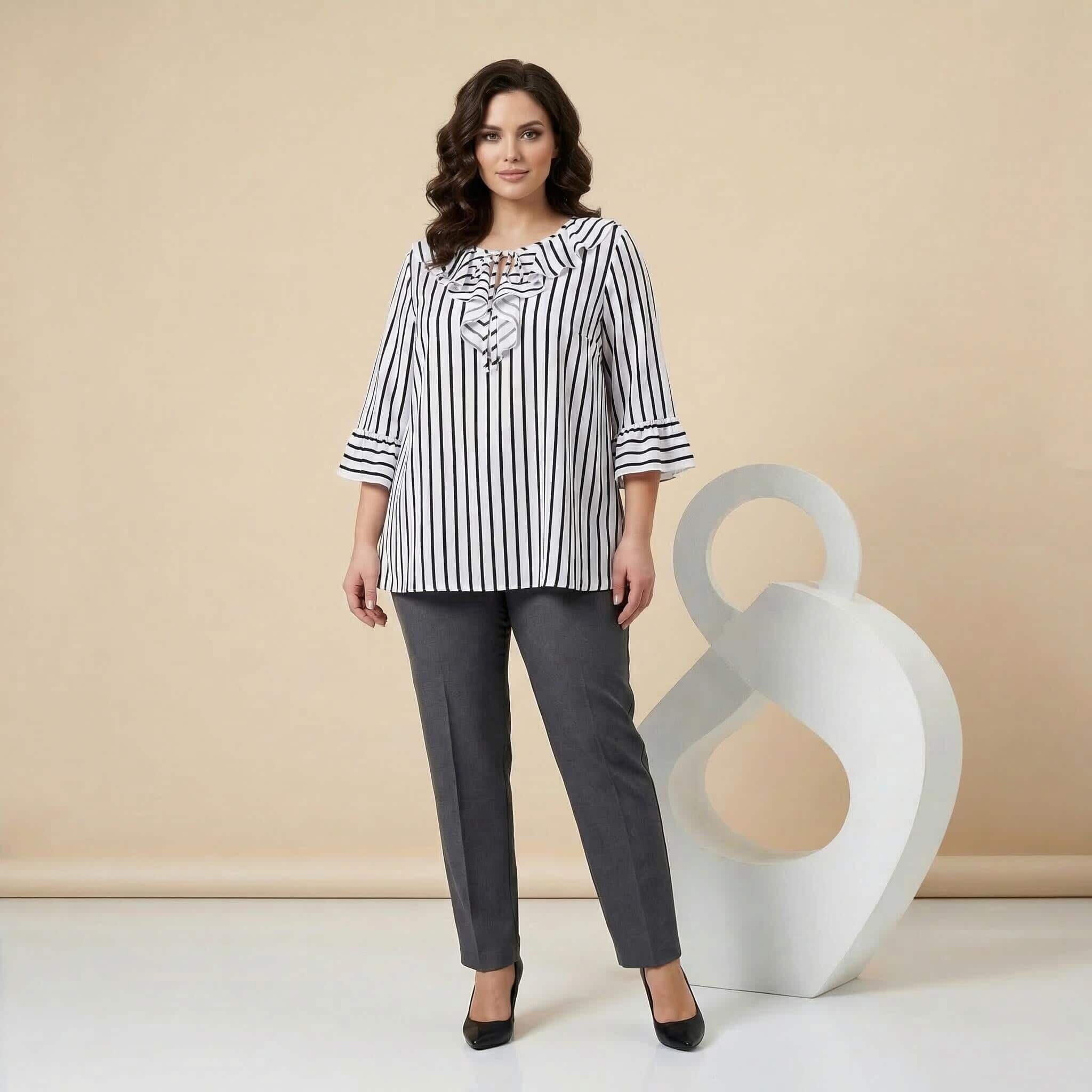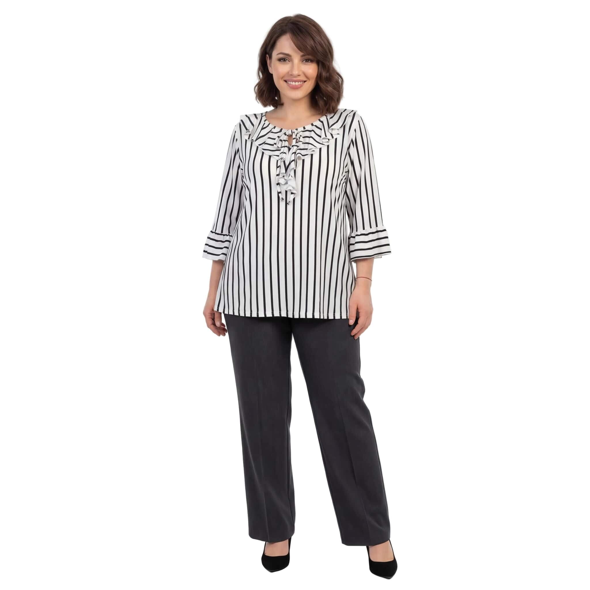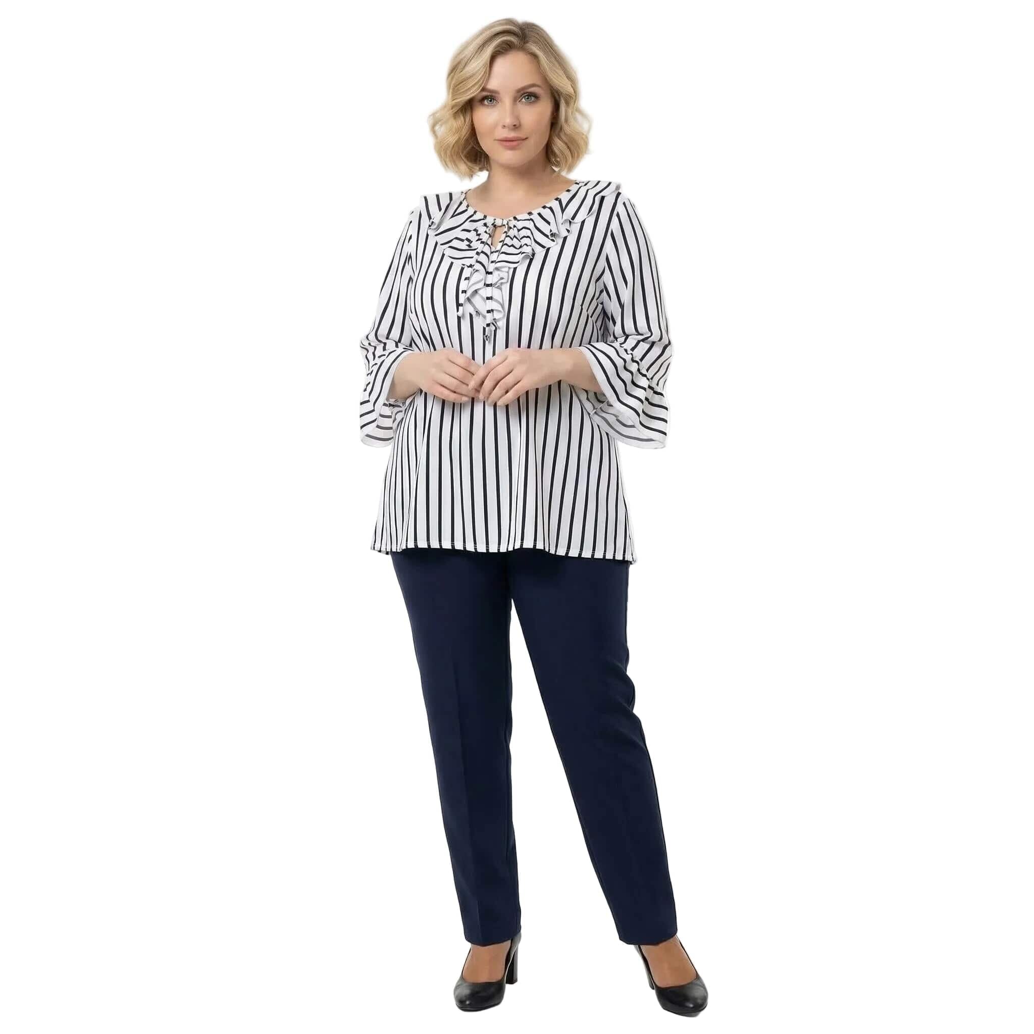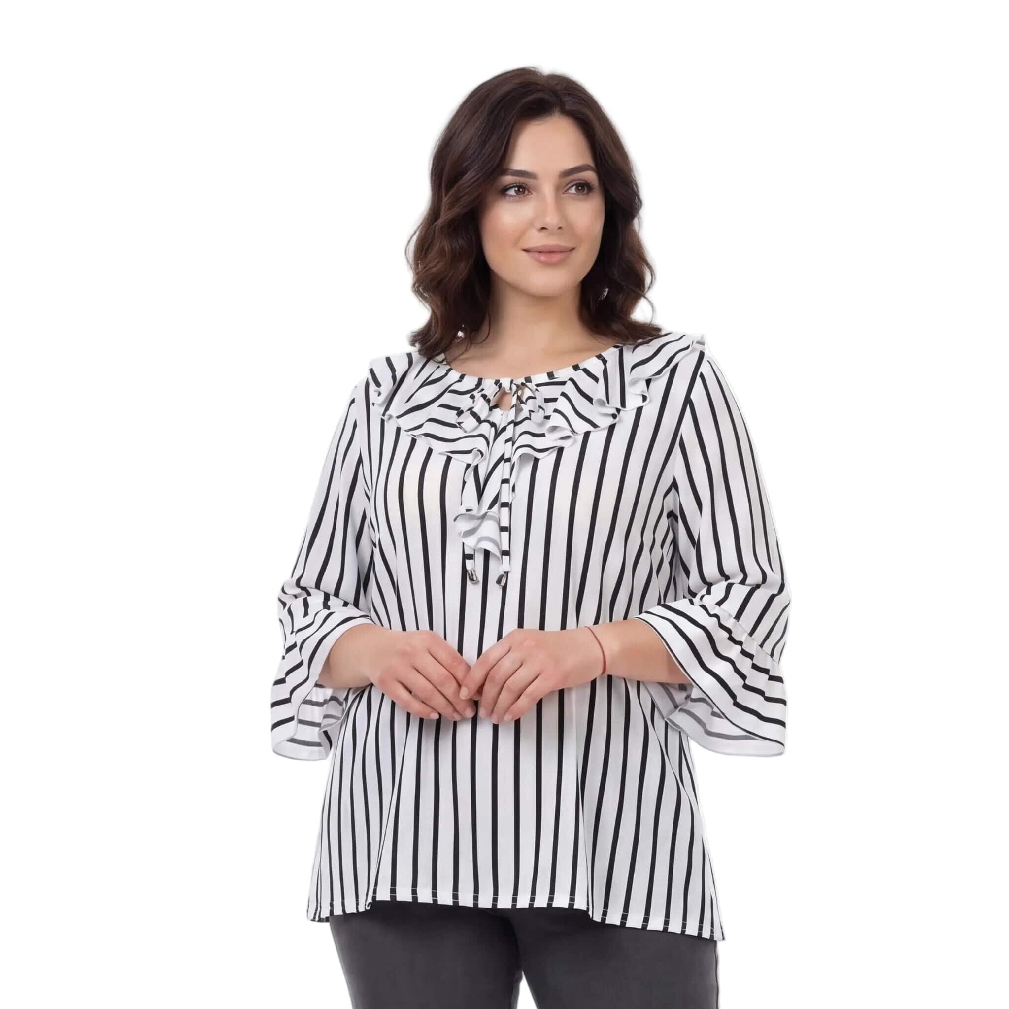 Представяме ви елегантна официална туника, създадена за вашите специални моменти. Този изискан модел в класическо бяло е освежен с фино тъмносиньо райе, което визуално издължава силуета. Дизайнът се отличава с ефектно набрано деколте с връзки, завършващи с красиви метални накрайници, и женствени 7/8 разкроени ръкави с нежни къдрици. Изработена от мека, ефирна и приятно падаща материя с лека еластичност, туниката предлага несравним комфорт и свобода на движението. Свободната кройка елегантно подчертава извивките, превръщайки модела в перфектния избор както за пролетно-летния, така и за преходния сезон. Съчетава се безупречно с елегантен панталон за завършена и стилна визия.