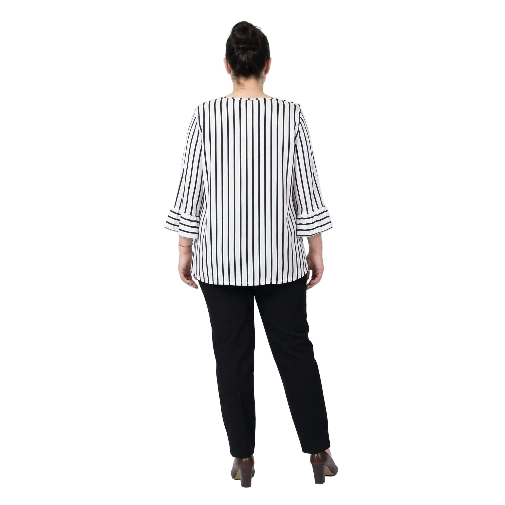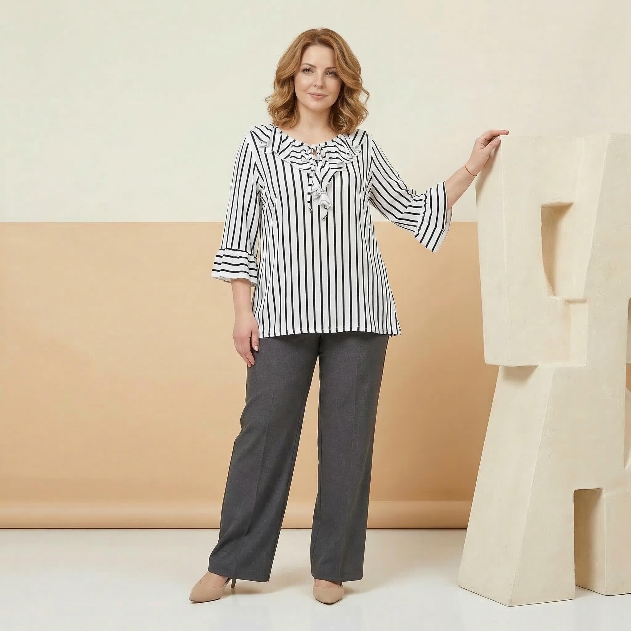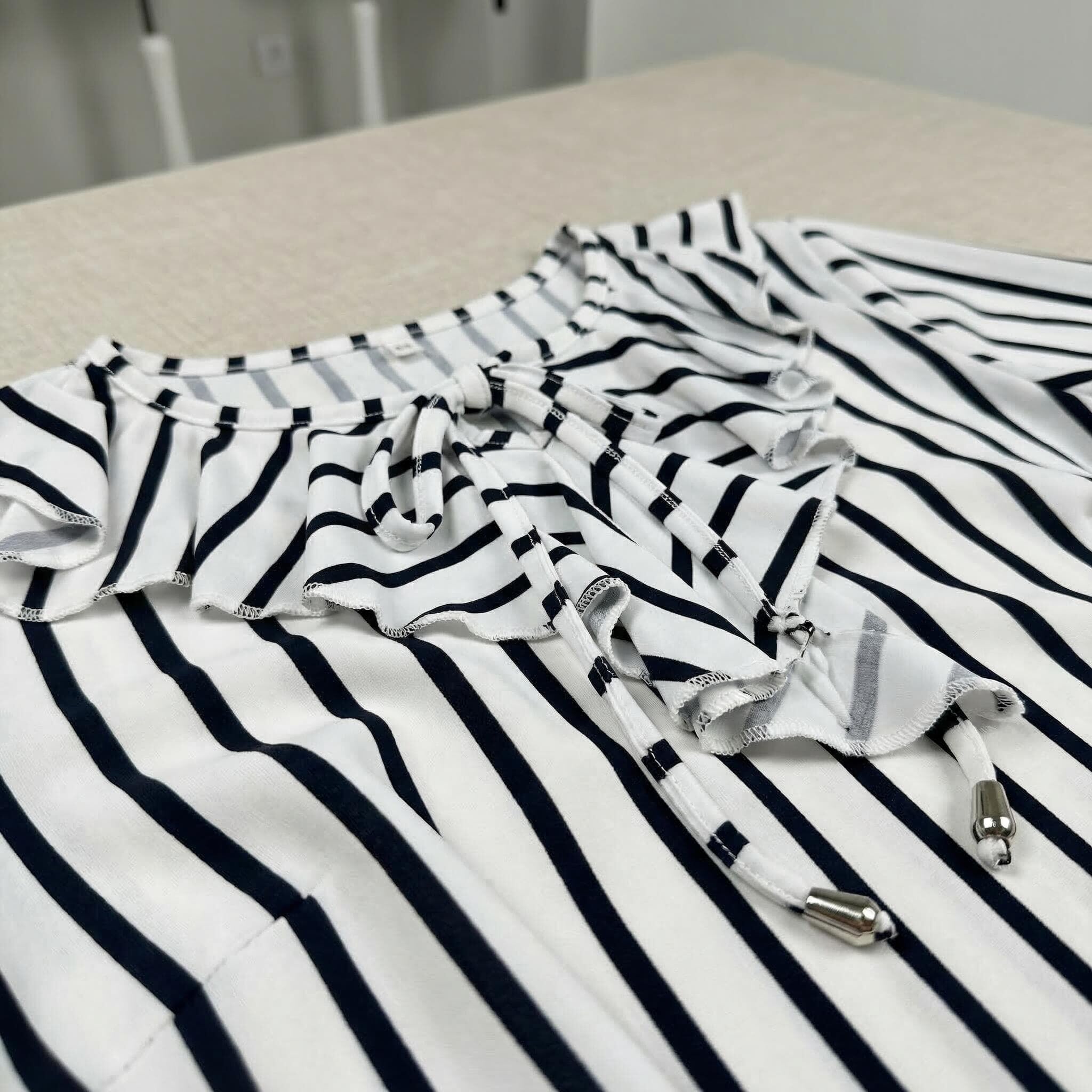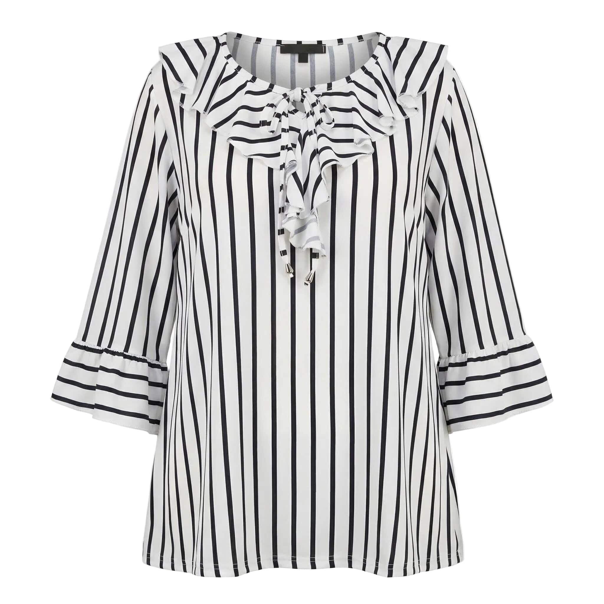 Представяме ви елегантна официална туника, създадена за вашите специални моменти. Този изискан модел в класическо бяло е освежен с фино тъмносиньо райе, което визуално издължава силуета. Дизайнът се отличава с ефектно набрано деколте с връзки, завършващи с красиви метални накрайници, и женствени 7/8 разкроени ръкави с нежни къдрици. Изработена от мека, ефирна и приятно падаща материя с лека еластичност, туниката предлага несравним комфорт и свобода на движението. Свободната кройка елегантно подчертава извивките, превръщайки модела в перфектния избор както за пролетно-летния, така и за преходния сезон. Съчетава се безупречно с елегантен панталон за завършена и стилна визия.