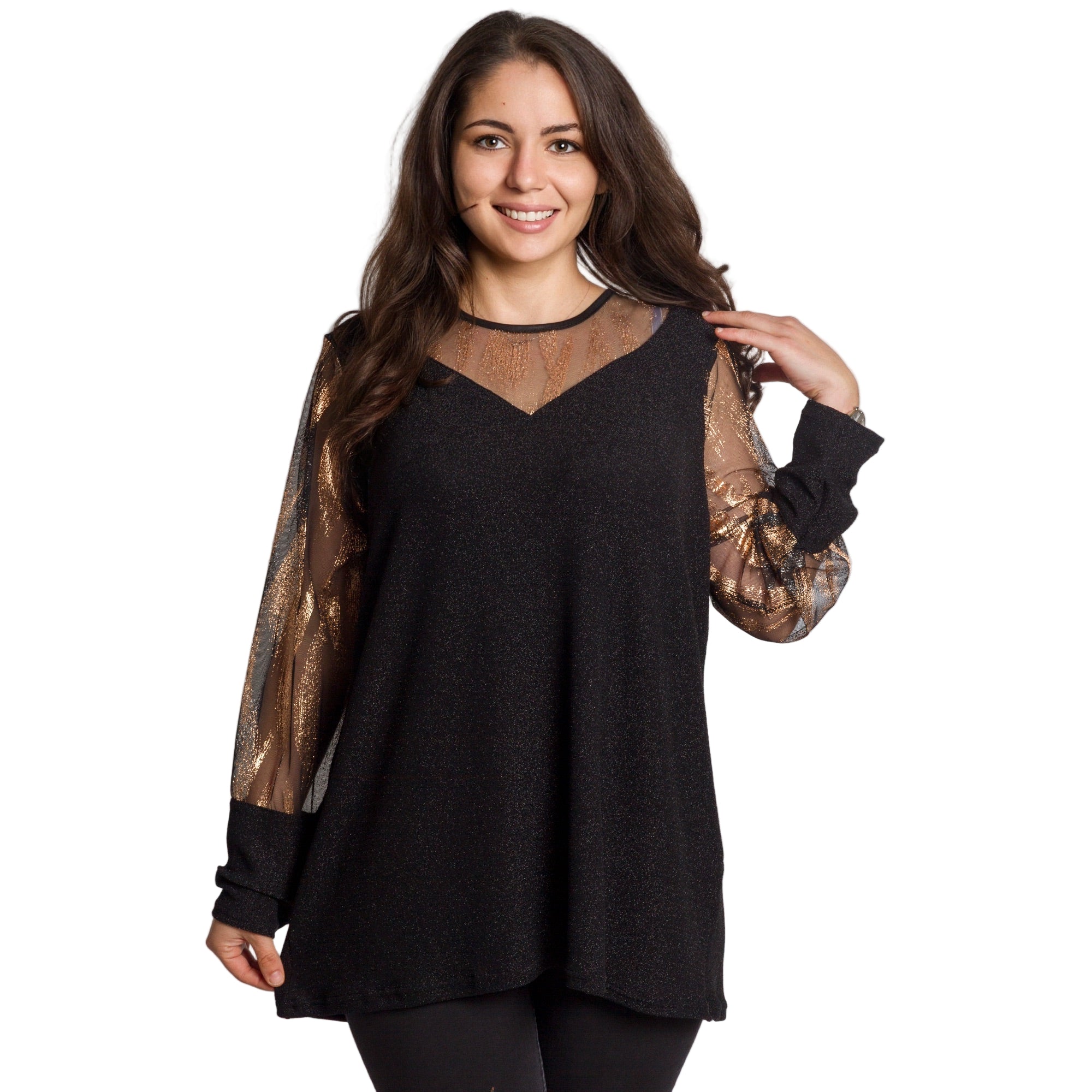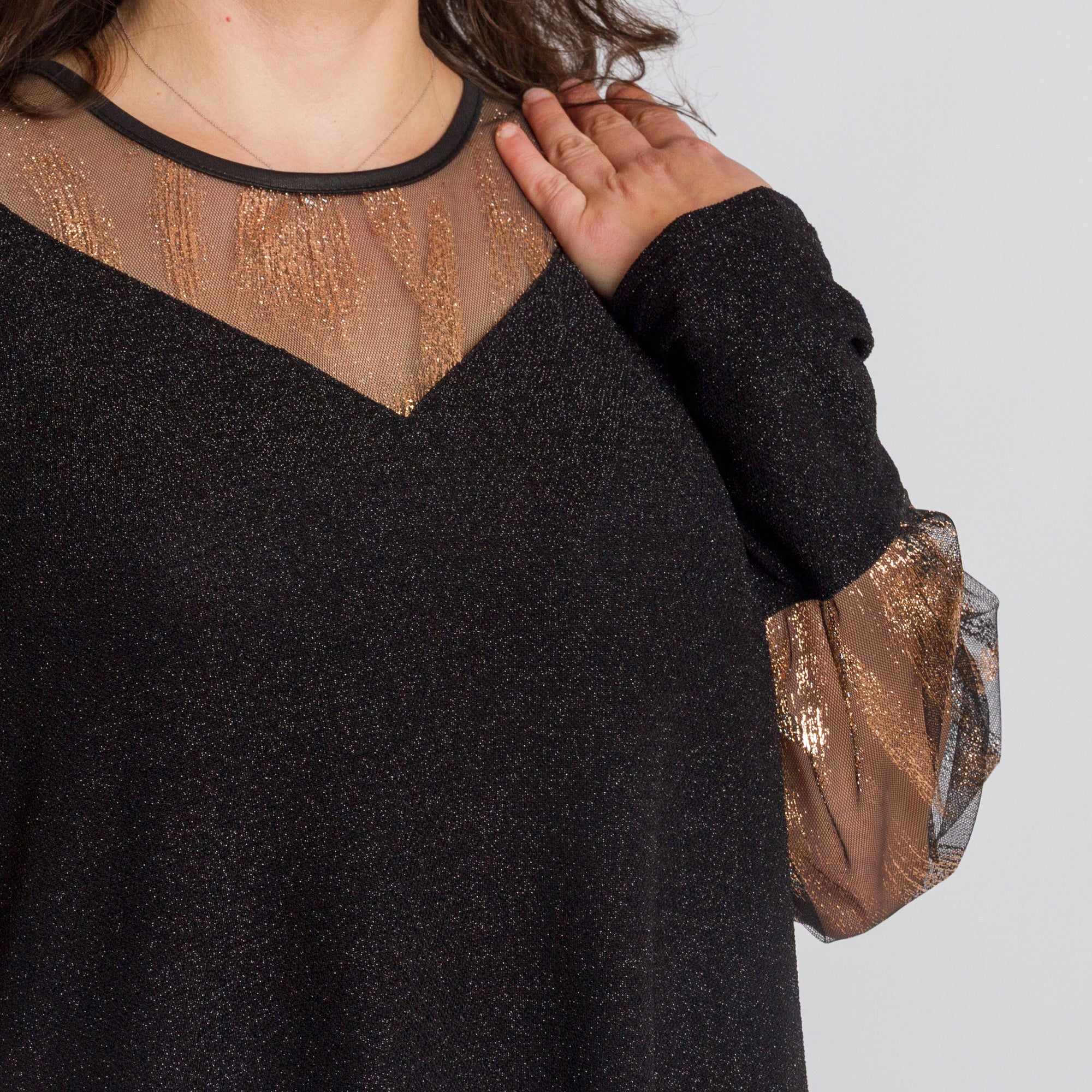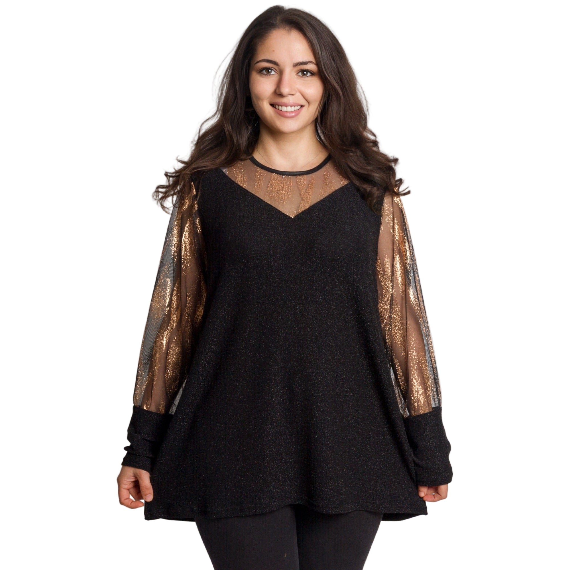 Стилна и ефектна туника в черен цвят със златист абстрактен принт в горната част и по ръкавите. Благодарение на металическия отблясък и прозрачните ръкави, моделът създава празнично и елегантно излъчване. Основната част е от мека, еластична материя, която пада свободно и осигурява комфорт, без да очертава тялото. Крoйката е леко разкроена към долната част и визуално издължава силуета. Перфектна за официални поводи, вечерни събития и празнични излизания през есенно-зимния сезон.