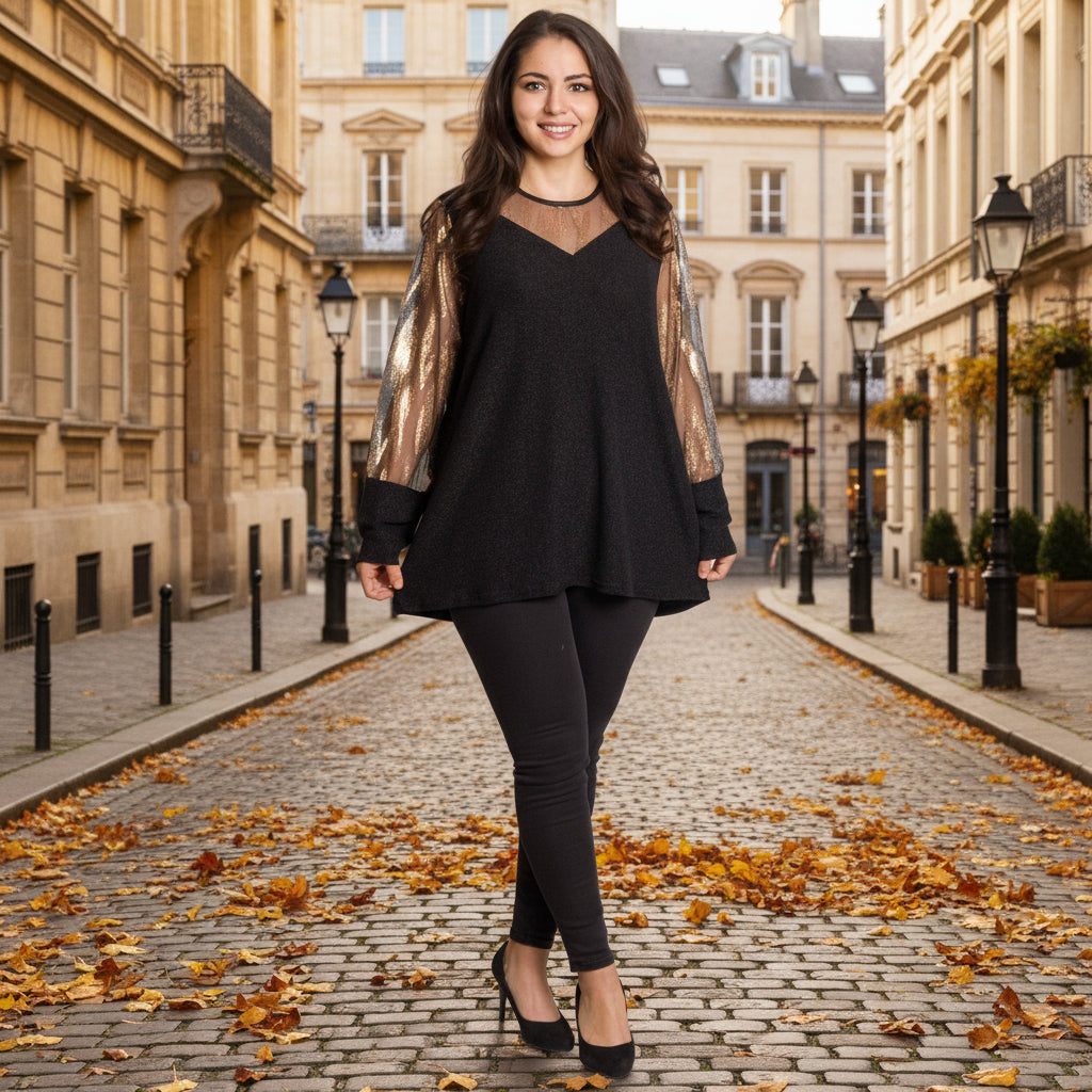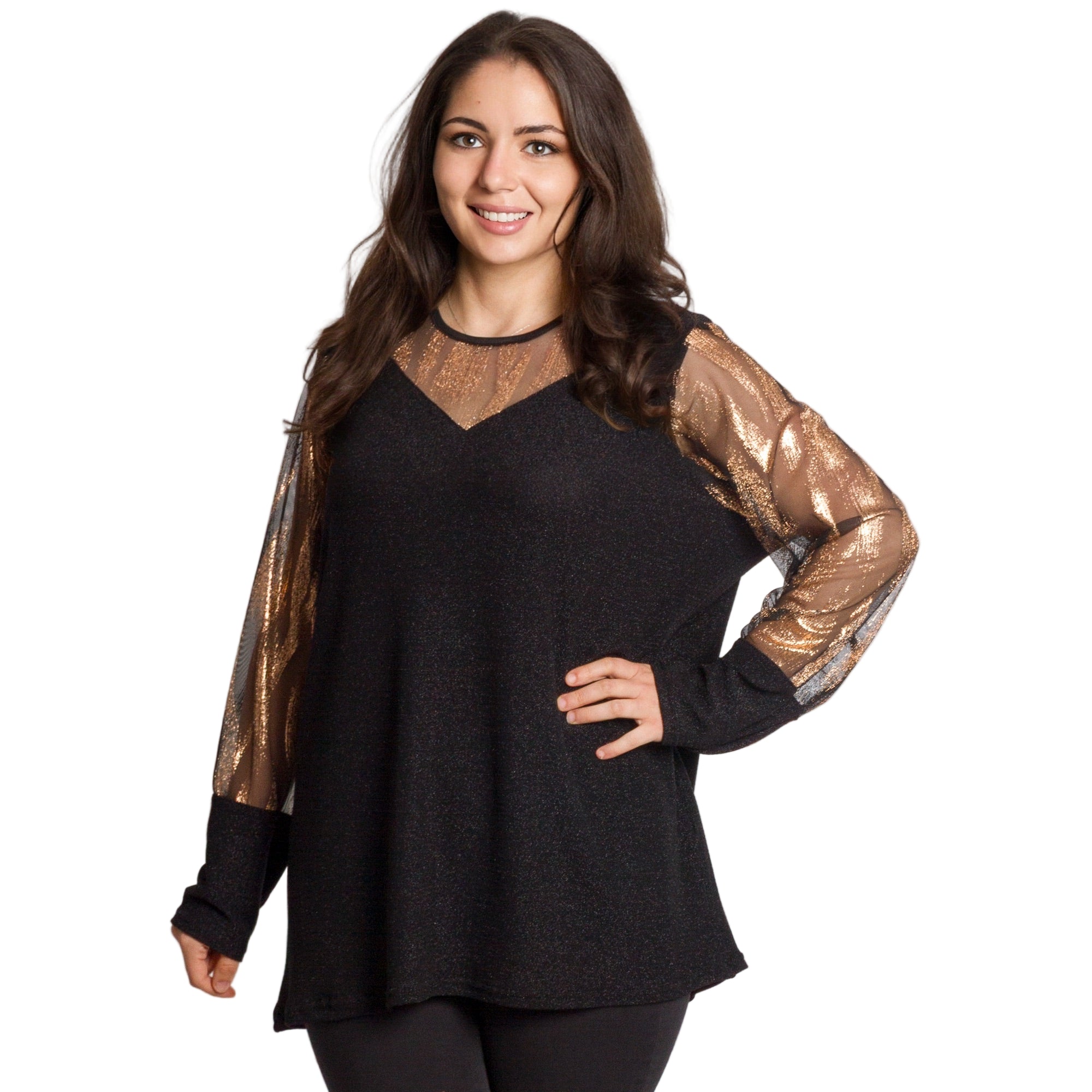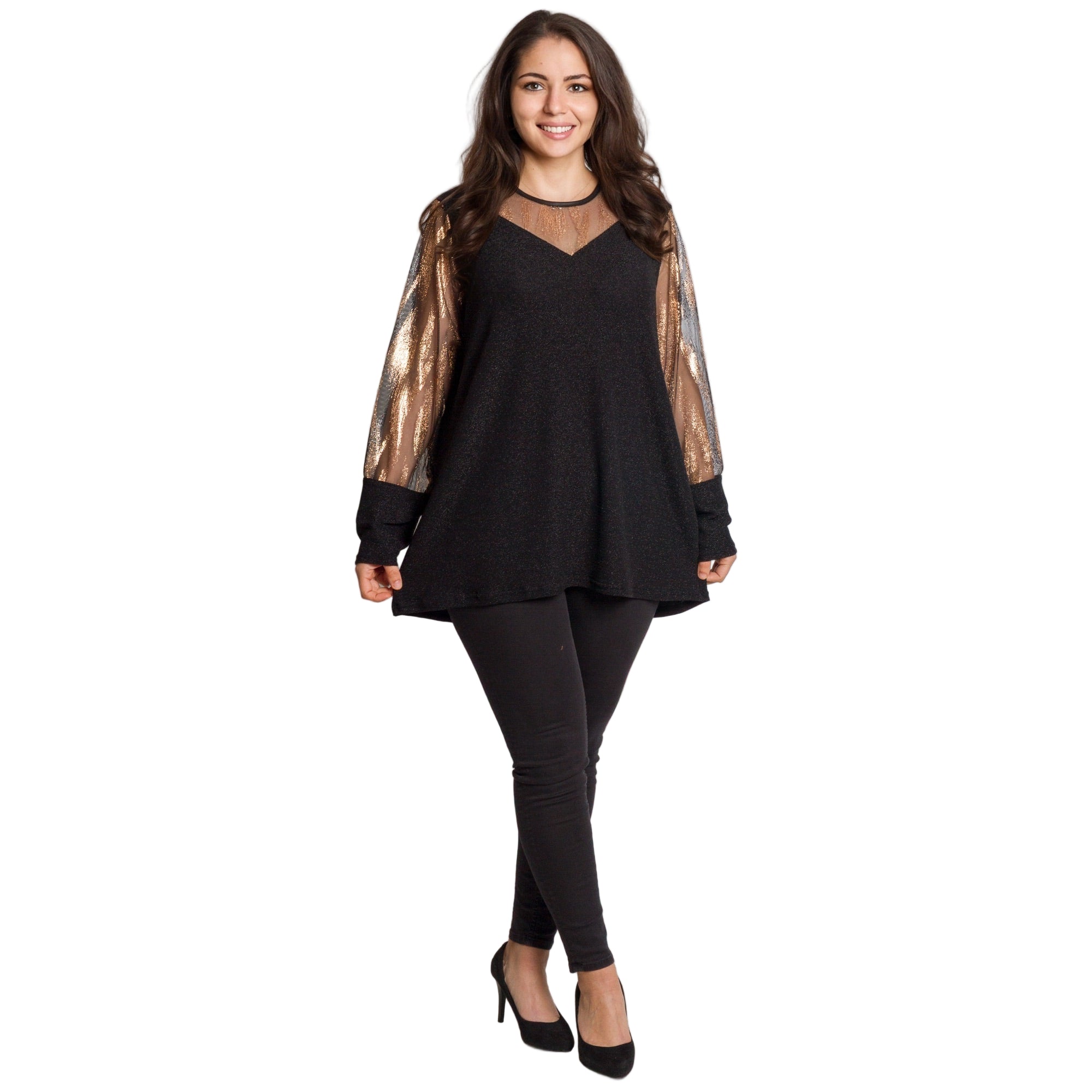 Стилна и ефектна туника в черен цвят със златист абстрактен принт в горната част и по ръкавите. Благодарение на металическия отблясък и прозрачните ръкави, моделът създава празнично и елегантно излъчване. Основната част е от мека, еластична материя, която пада свободно и осигурява комфорт, без да очертава тялото. Крoйката е леко разкроена към долната част и визуално издължава силуета. Перфектна за официални поводи, вечерни събития и празнични излизания през есенно-зимния сезон.