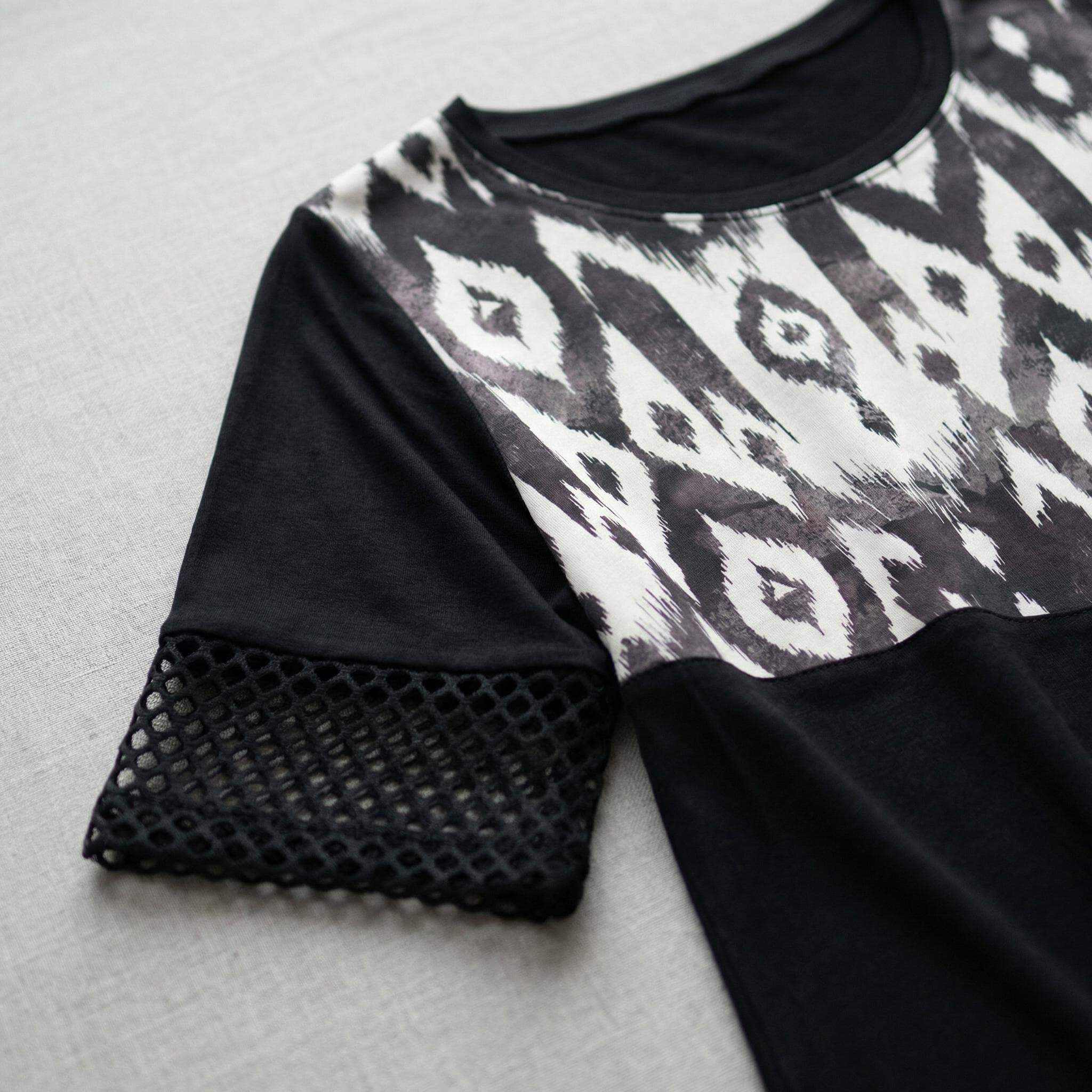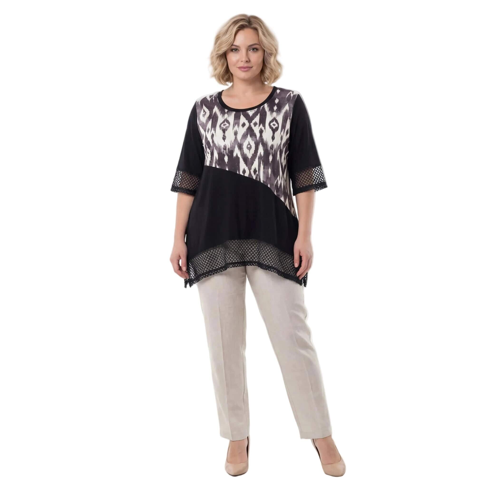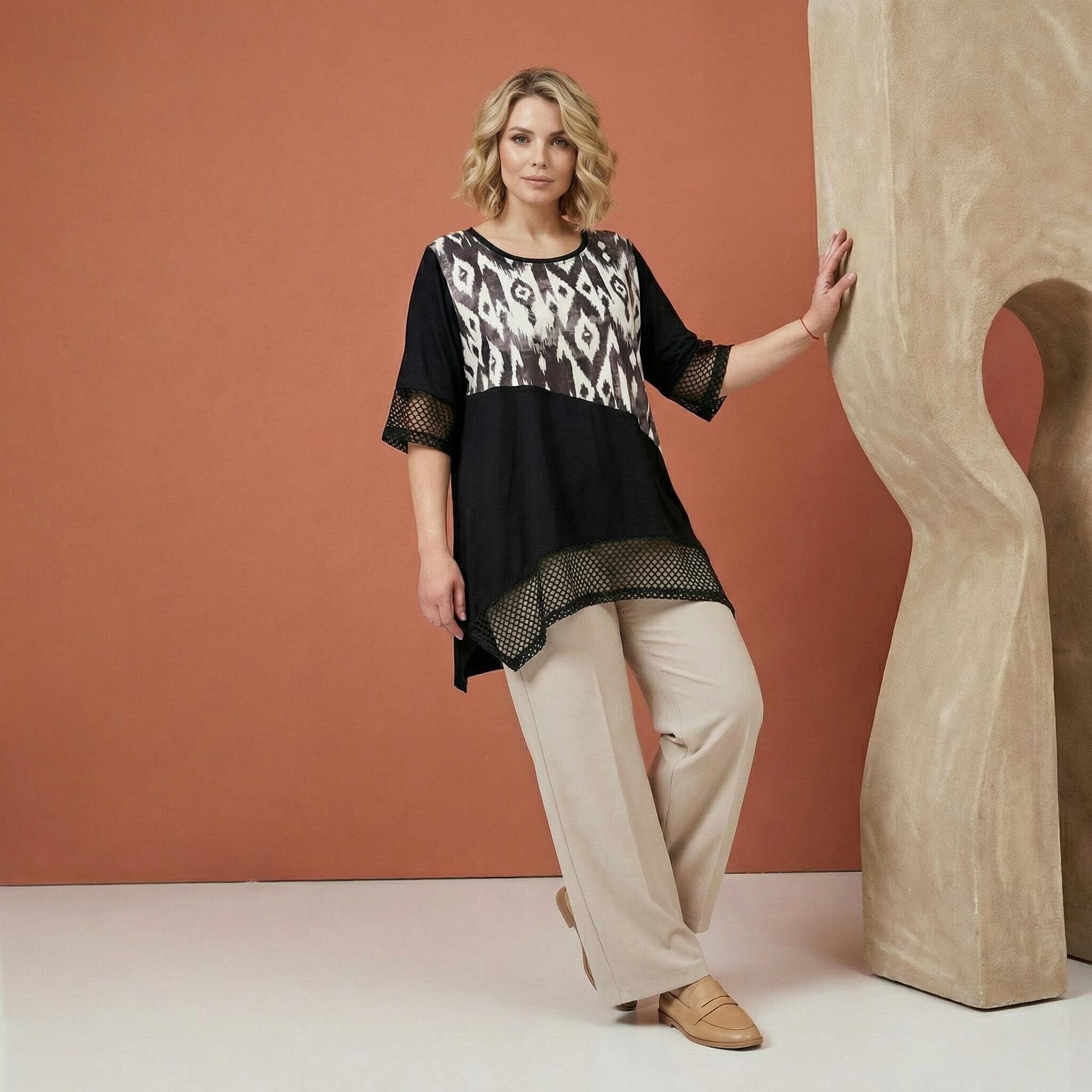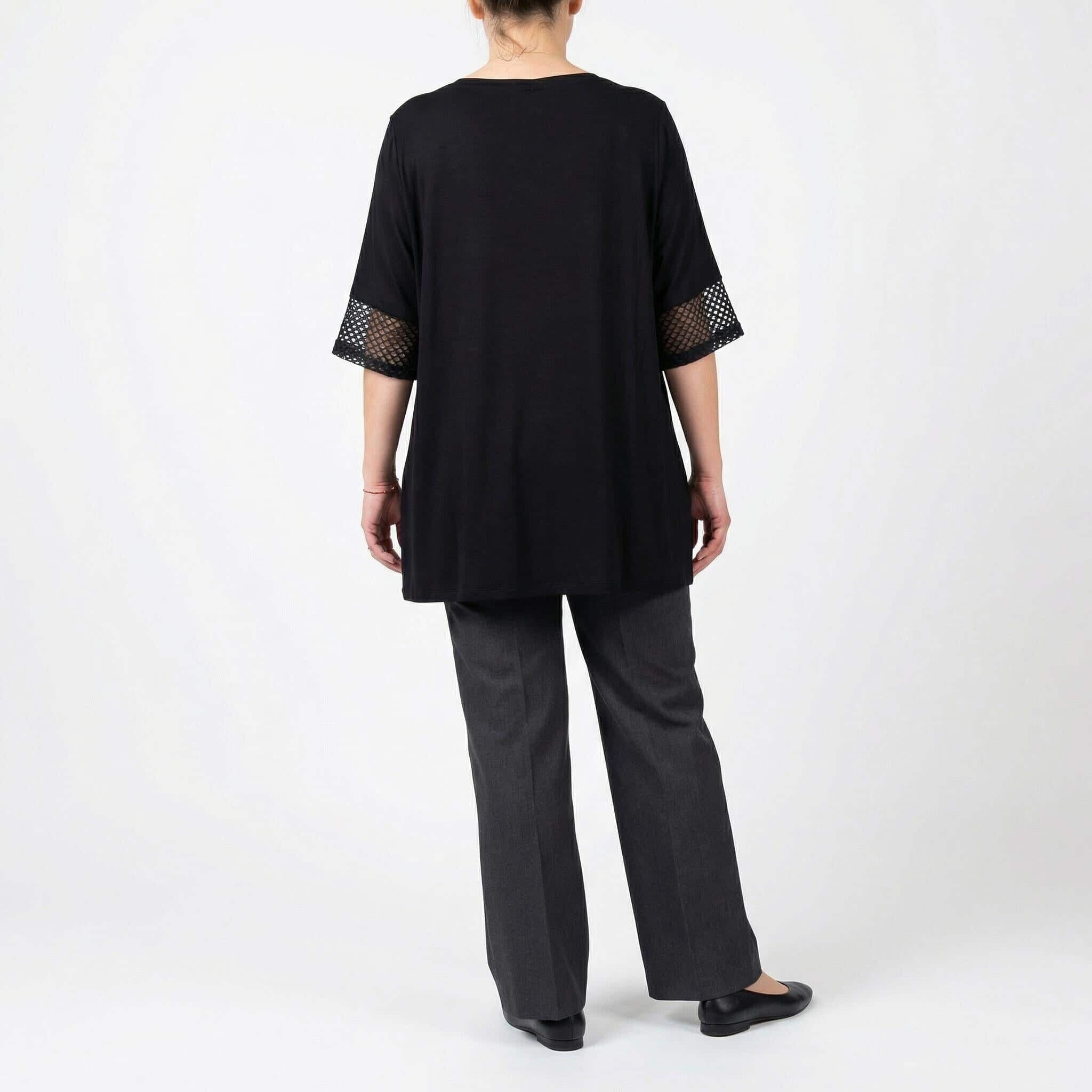 Представяме ви изключително елегантен и практичен модел за топлите пролетно-летни дни – официална макси туника в класическо черно. Дизайнът впечатлява с модерна асиметрична кройка и красиви детайли от фина мрежа в долната част и на късите ръкави. Моделът се отличава с ефектен диагонален цветен блок и абстрактен принт в горната предна част, който придава съвременна и динамична визия, докато гърбът остава в плътно, изчистено черно. Изработена от мека, лека и ефирна вискоза, материята пада тежко и осигурява безупречен комфорт. Свободният, разкроен силует носи усещане за лекота, увереност и изящество, превръщайки тази туника в перфектния избор за всяко ваше специално събитие.