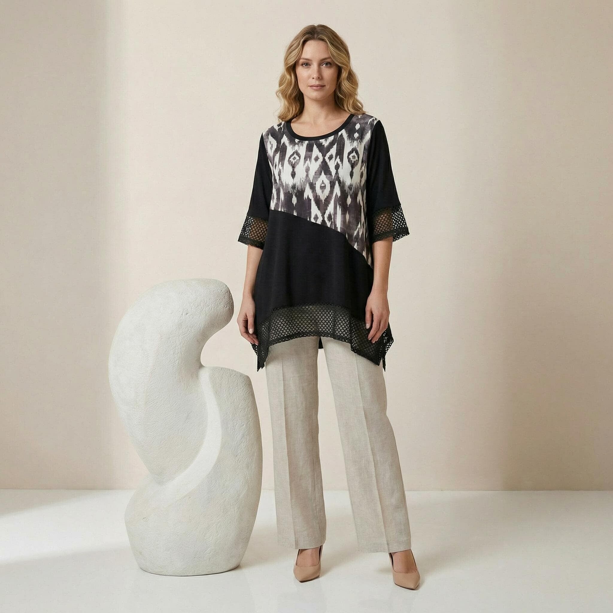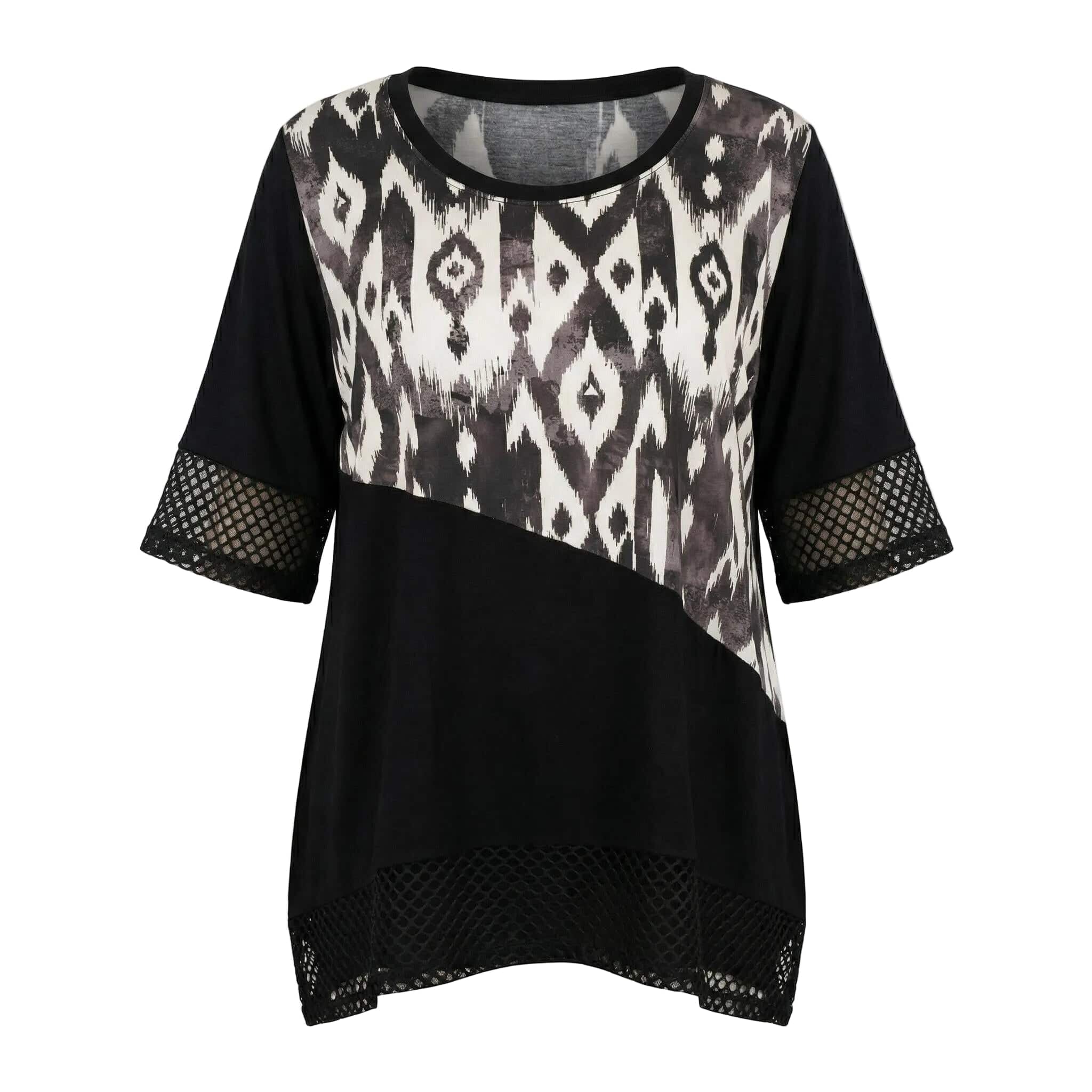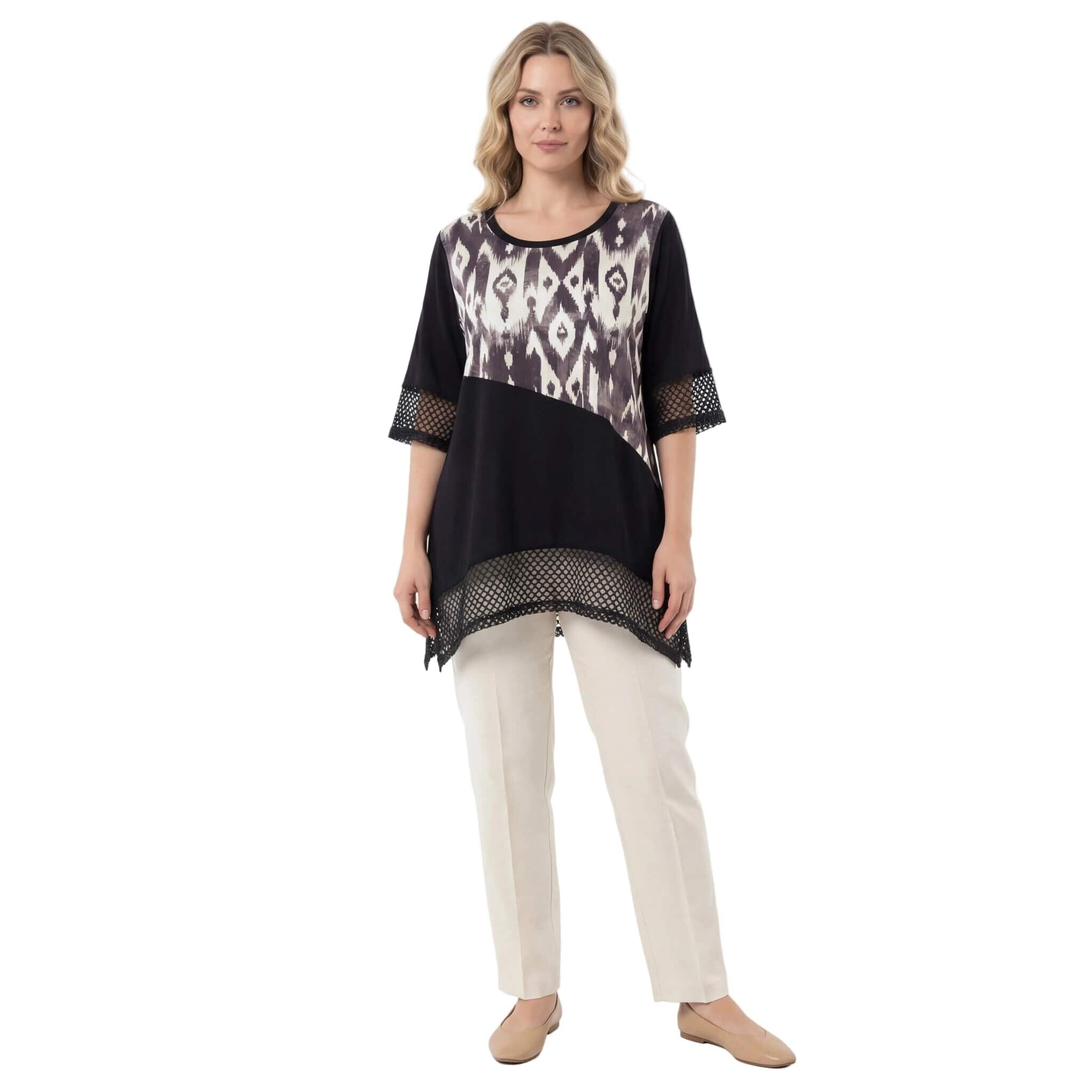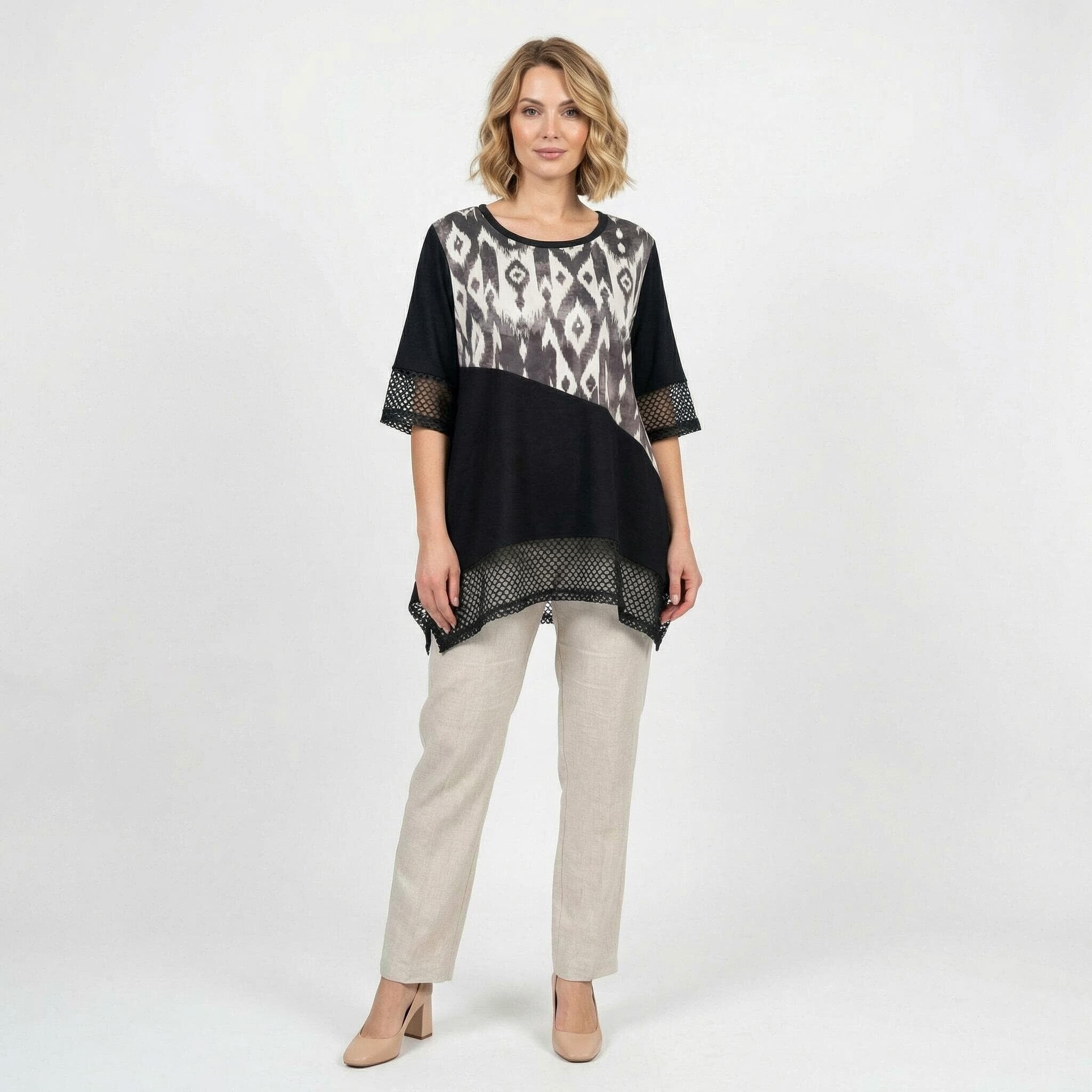 Представяме ви изключително елегантен и практичен модел за топлите пролетно-летни дни – официална макси туника в класическо черно. Дизайнът впечатлява с модерна асиметрична кройка и красиви детайли от фина мрежа в долната част и на късите ръкави. Моделът се отличава с ефектен диагонален цветен блок и абстрактен принт в горната предна част, който придава съвременна и динамична визия, докато гърбът остава в плътно, изчистено черно. Изработена от мека, лека и ефирна вискоза, материята пада тежко и осигурява безупречен комфорт. Свободният, разкроен силует носи усещане за лекота, увереност и изящество, превръщайки тази туника в перфектния избор за всяко ваше специално събитие.