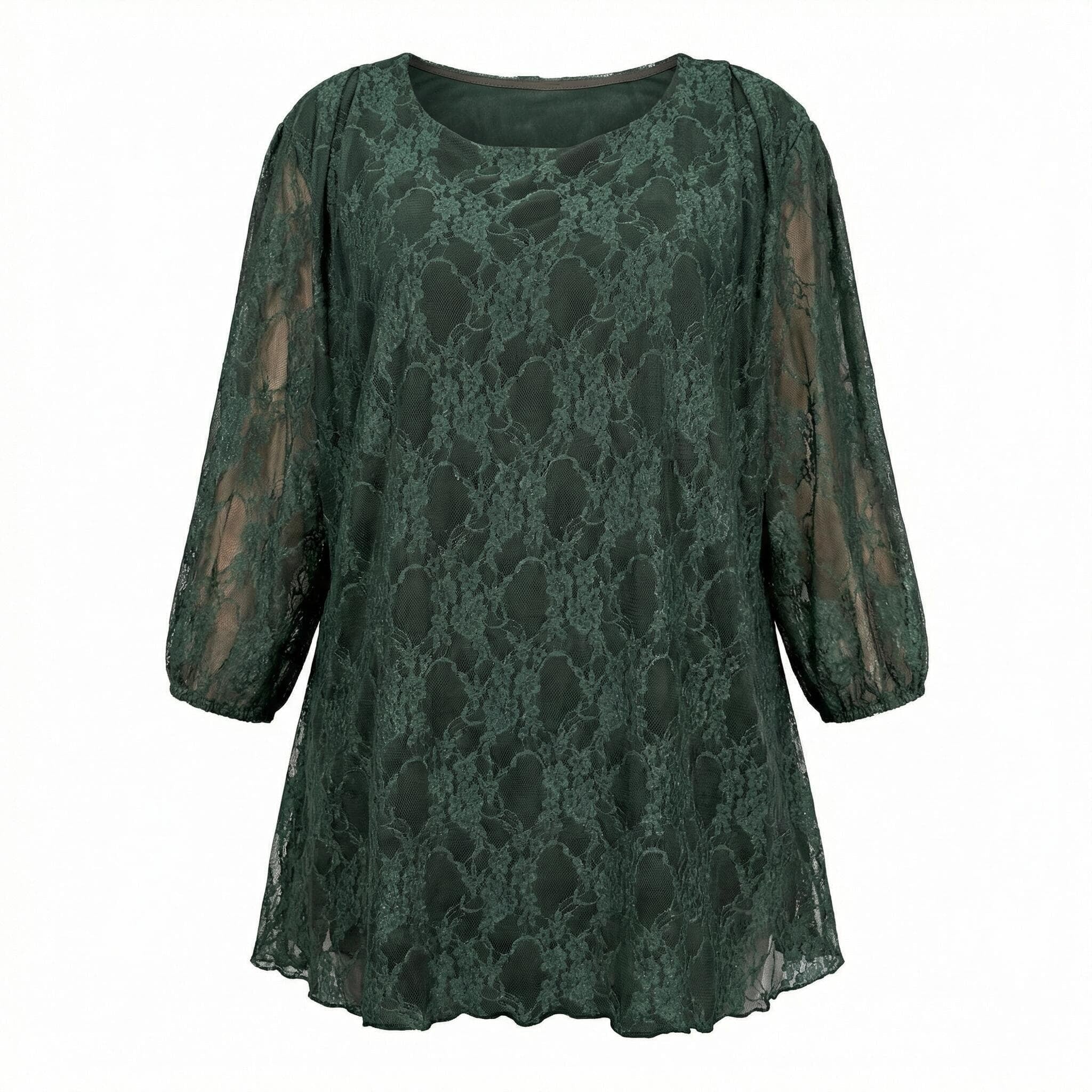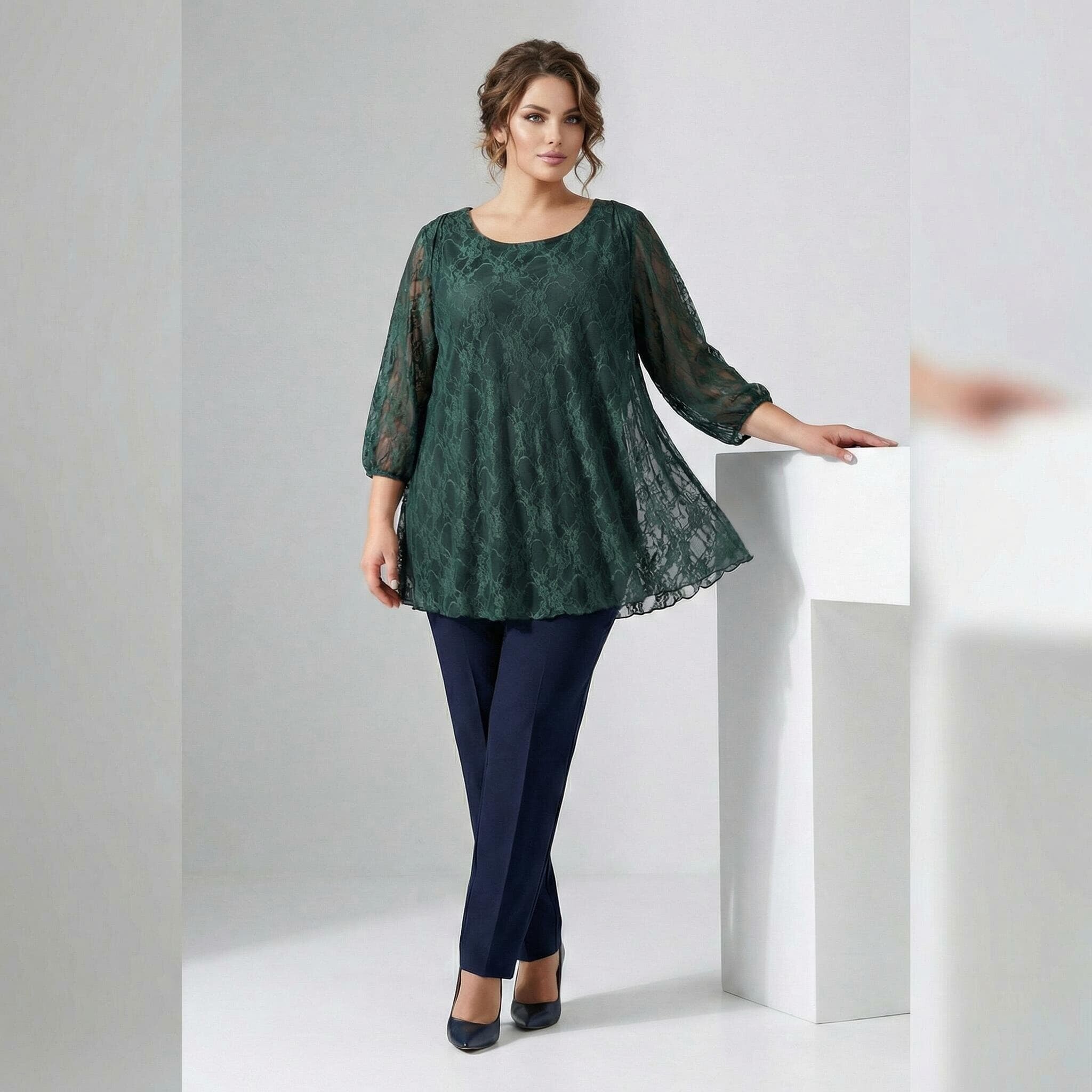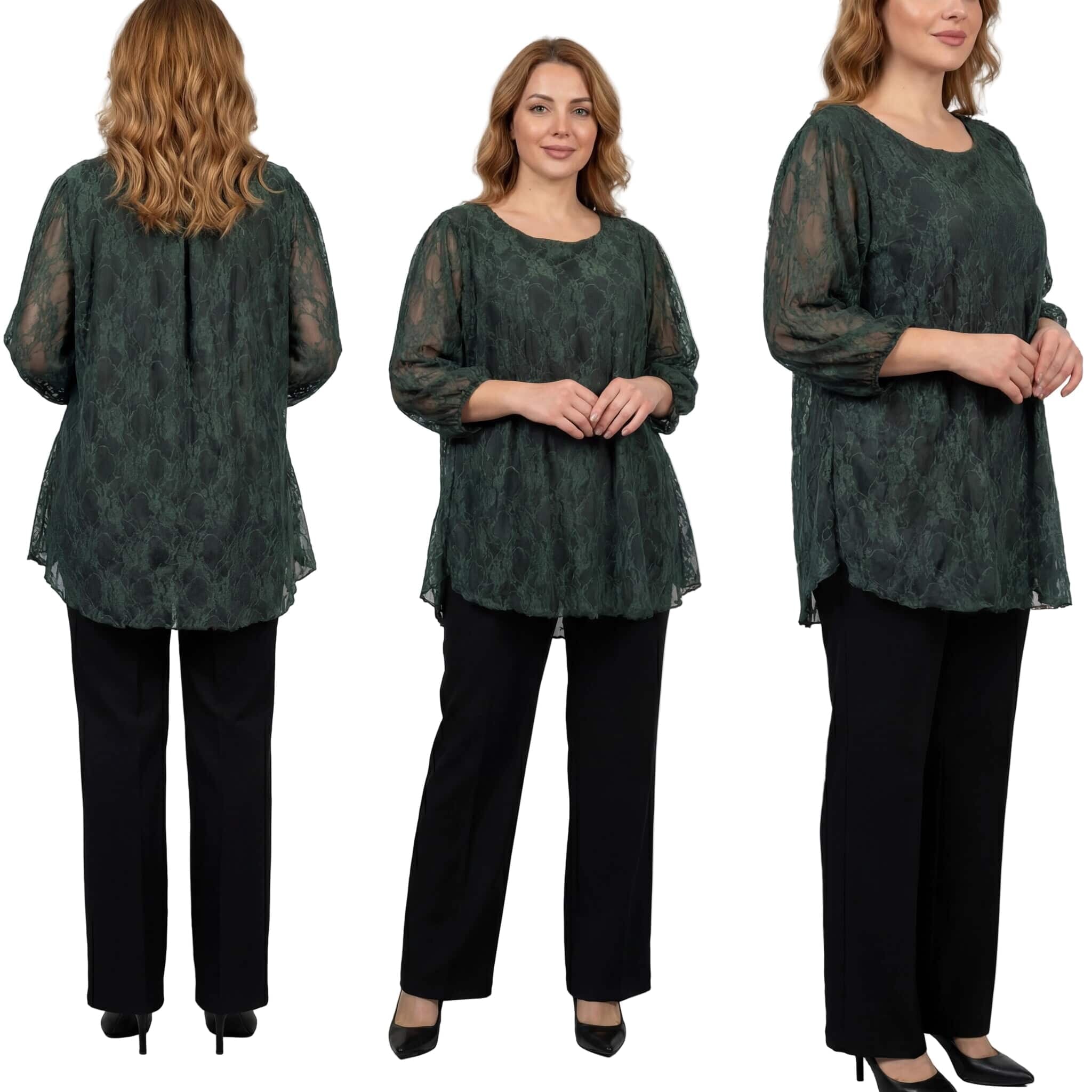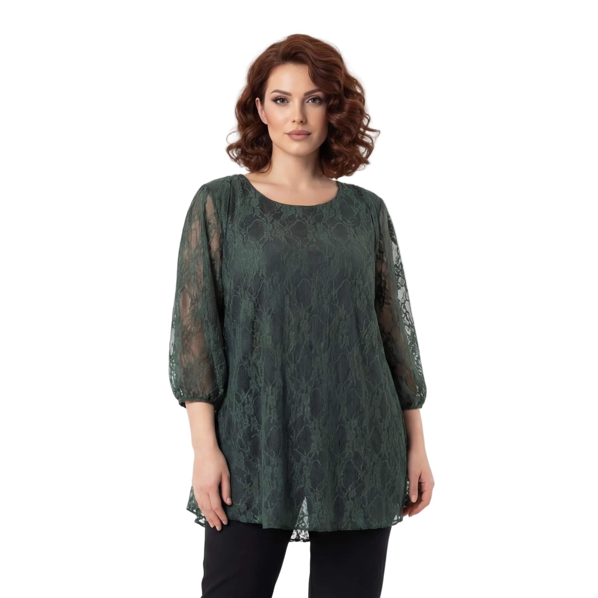 Открийте елегантността и комфорта с тази официална дантелена туника в масленозелен цвят, създадена специално за дами, които ценят изтънчения стил. Моделът впечатлява с красива флорална дантела, която пада меко върху контрастна черна подплата, придаваща дълбочина и структура на силуета. Свободната разкроена кройка осигурява свобода на движение, а еластичната материя гарантира удобство през целия ден. Дизайнът е завършен с обло деколте и прозрачни 7/8 ръкави, които добавят нотка на ефирност и женственост. Тази туника е перфектният избор за сватби, официални вечери или други специални поводи през пролетно-летния сезон.
