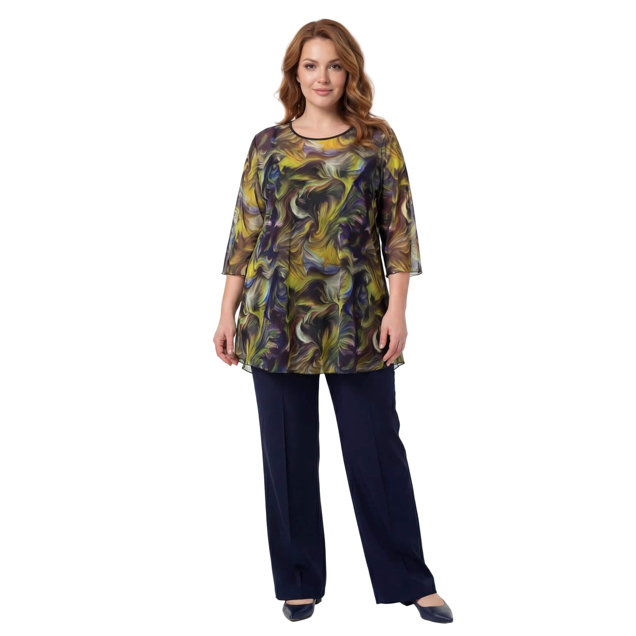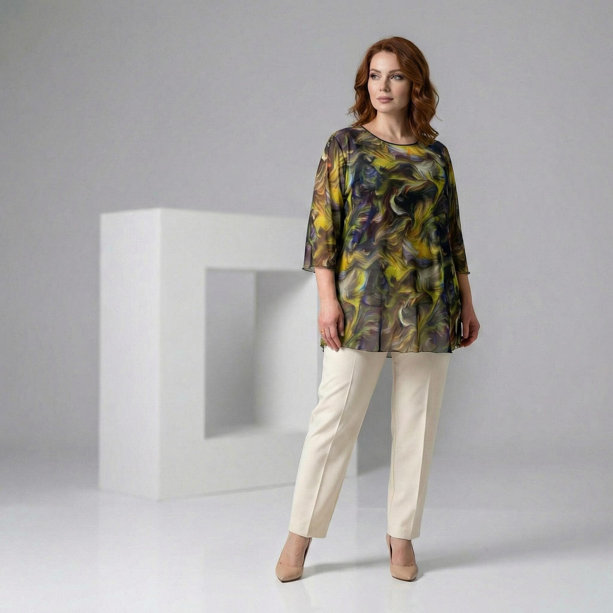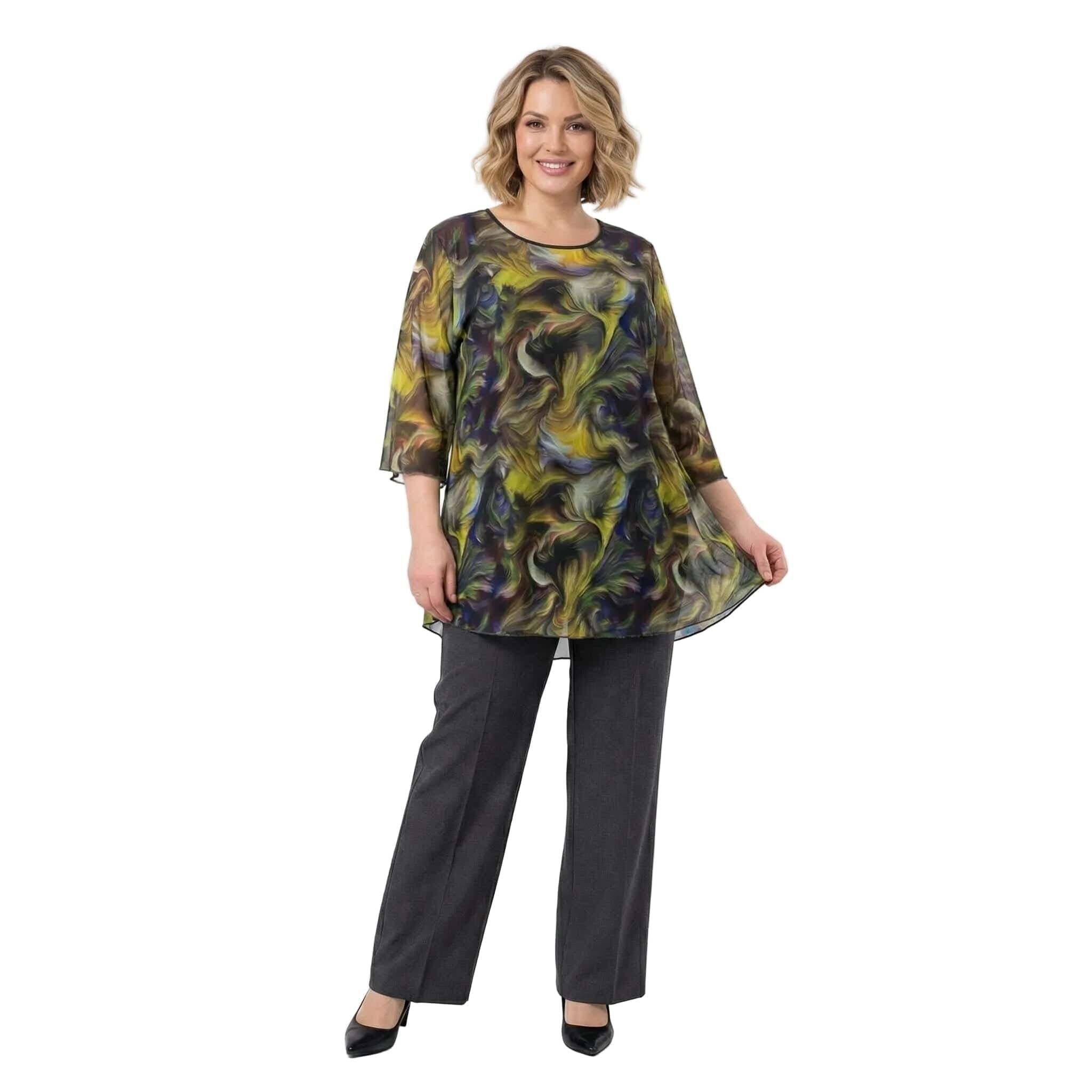 Представяме ви изискана официална макси туника от две части, създадена специално за дами, които ценят стила и комфорта. Този елегантен модел съчетава удобството на долна част тип потник с широка презрамка и ефирността на горна част от красив, пъстър шифон. Благодарение на високото съдържание на памук в състава, туниката е изключително приятна на допир и позволява на кожата да диша през топлите дни на пролетта и лятото. Разкроената кройка пада свободно около тялото, осигурявайки женствен силует и безупречна визия за всеки специален повод. Моделът е с 7/8 ръкав, който добавя допълнителна нотка на изтънченост.