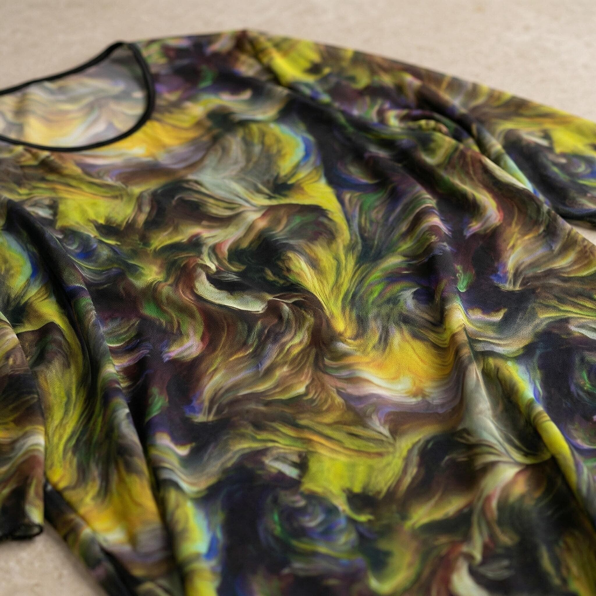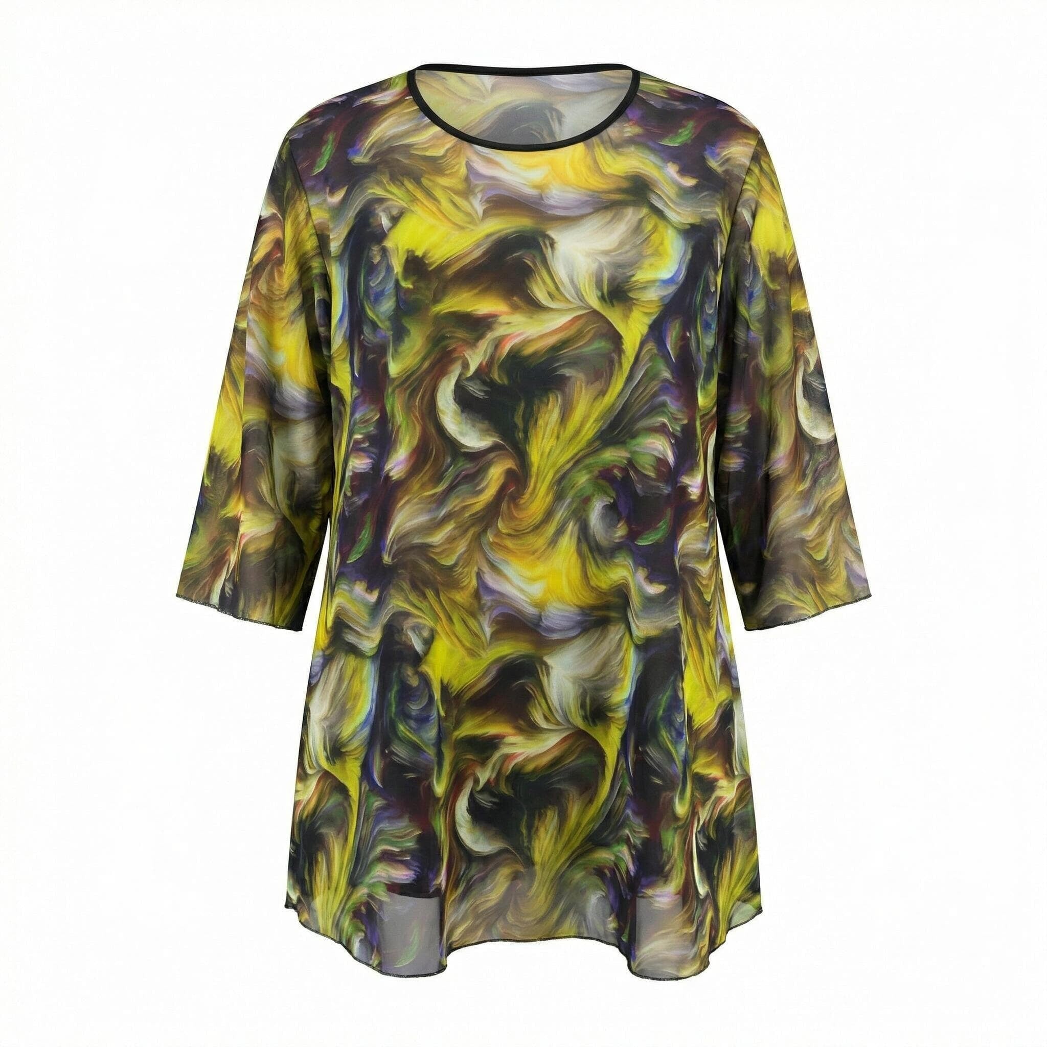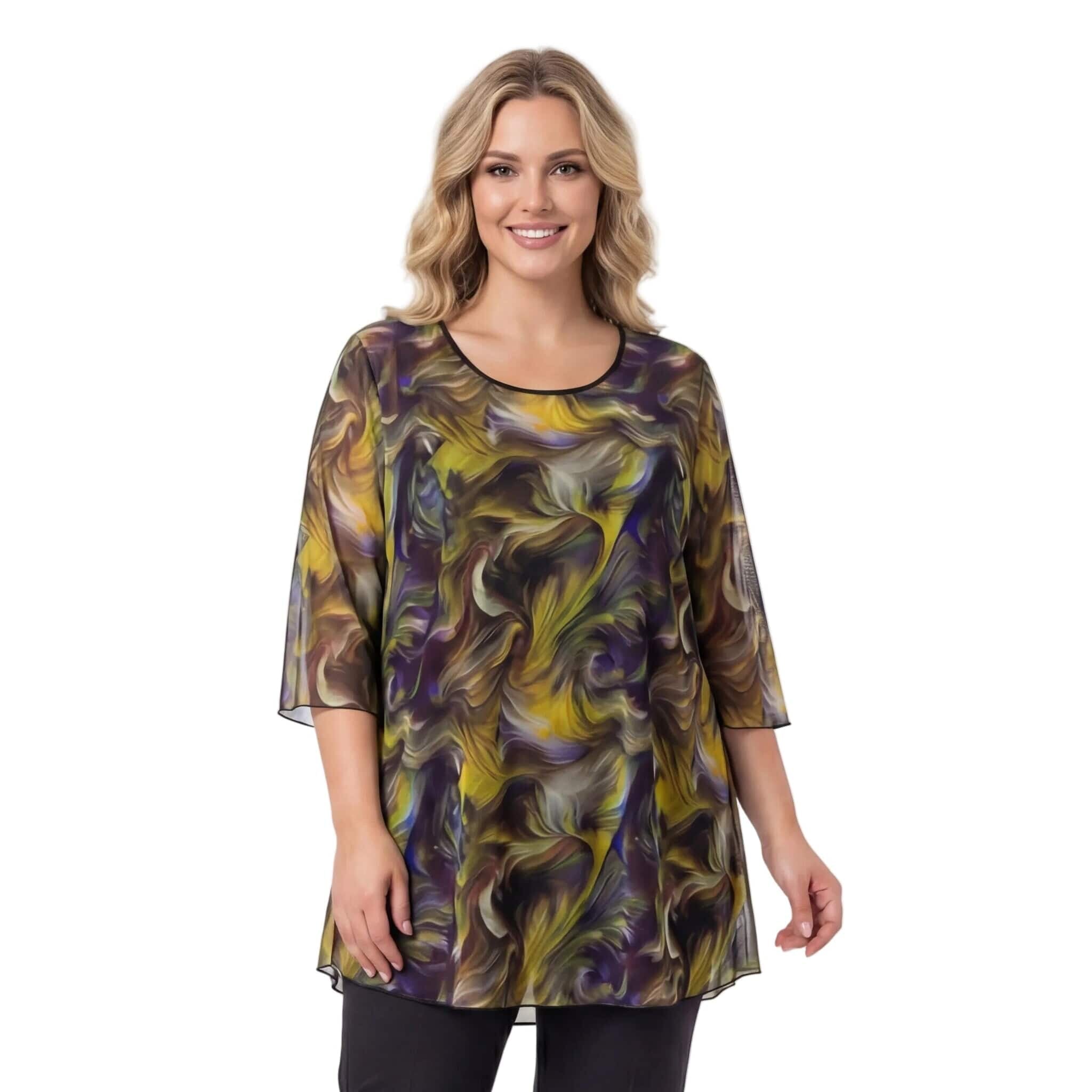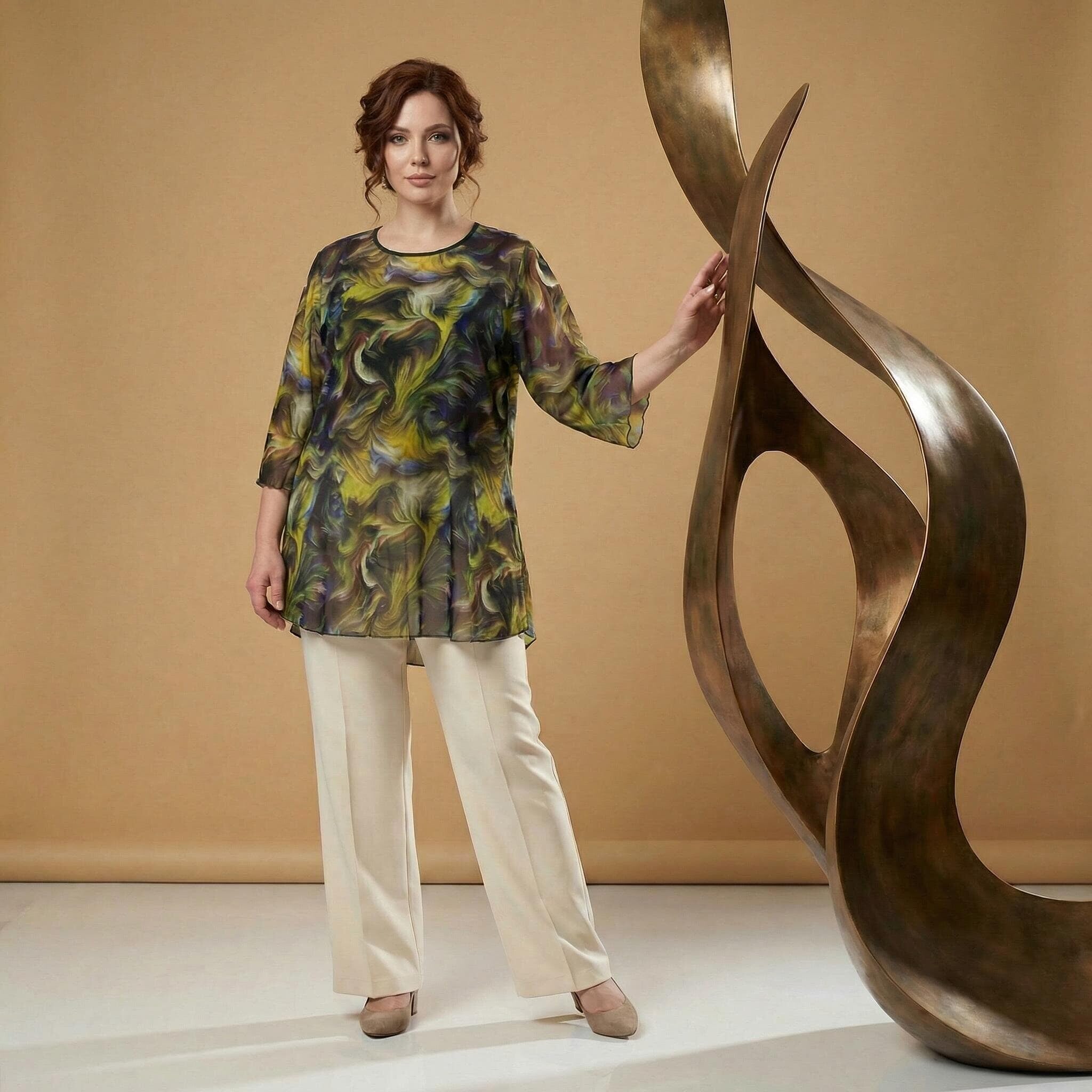 Представяме ви изискана официална макси туника от две части, създадена специално за дами, които ценят стила и комфорта. Този елегантен модел съчетава удобството на долна част тип потник с широка презрамка и ефирността на горна част от красив, пъстър шифон. Благодарение на високото съдържание на памук в състава, туниката е изключително приятна на допир и позволява на кожата да диша през топлите дни на пролетта и лятото. Разкроената кройка пада свободно около тялото, осигурявайки женствен силует и безупречна визия за всеки специален повод. Моделът е с 7/8 ръкав, който добавя допълнителна нотка на изтънченост.
