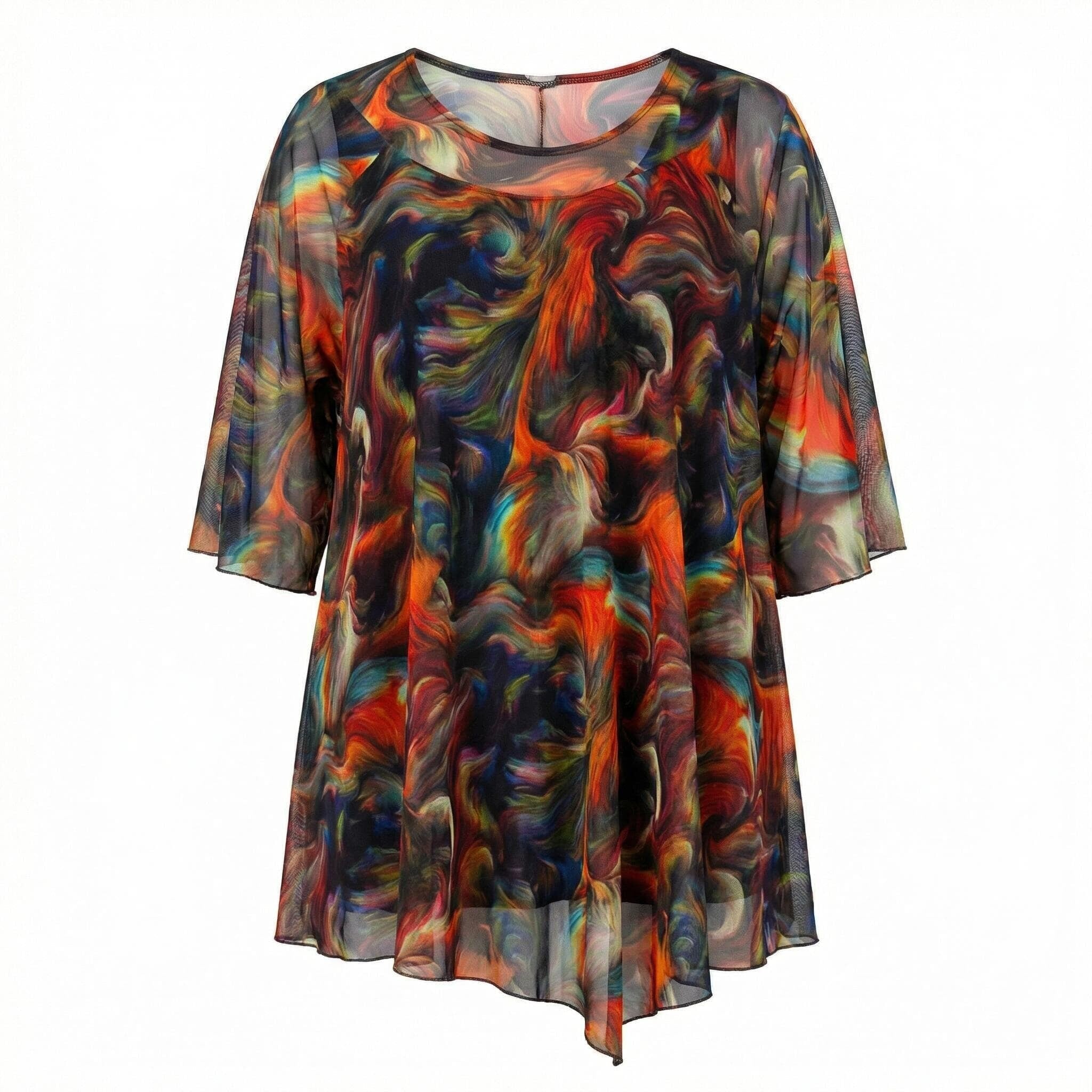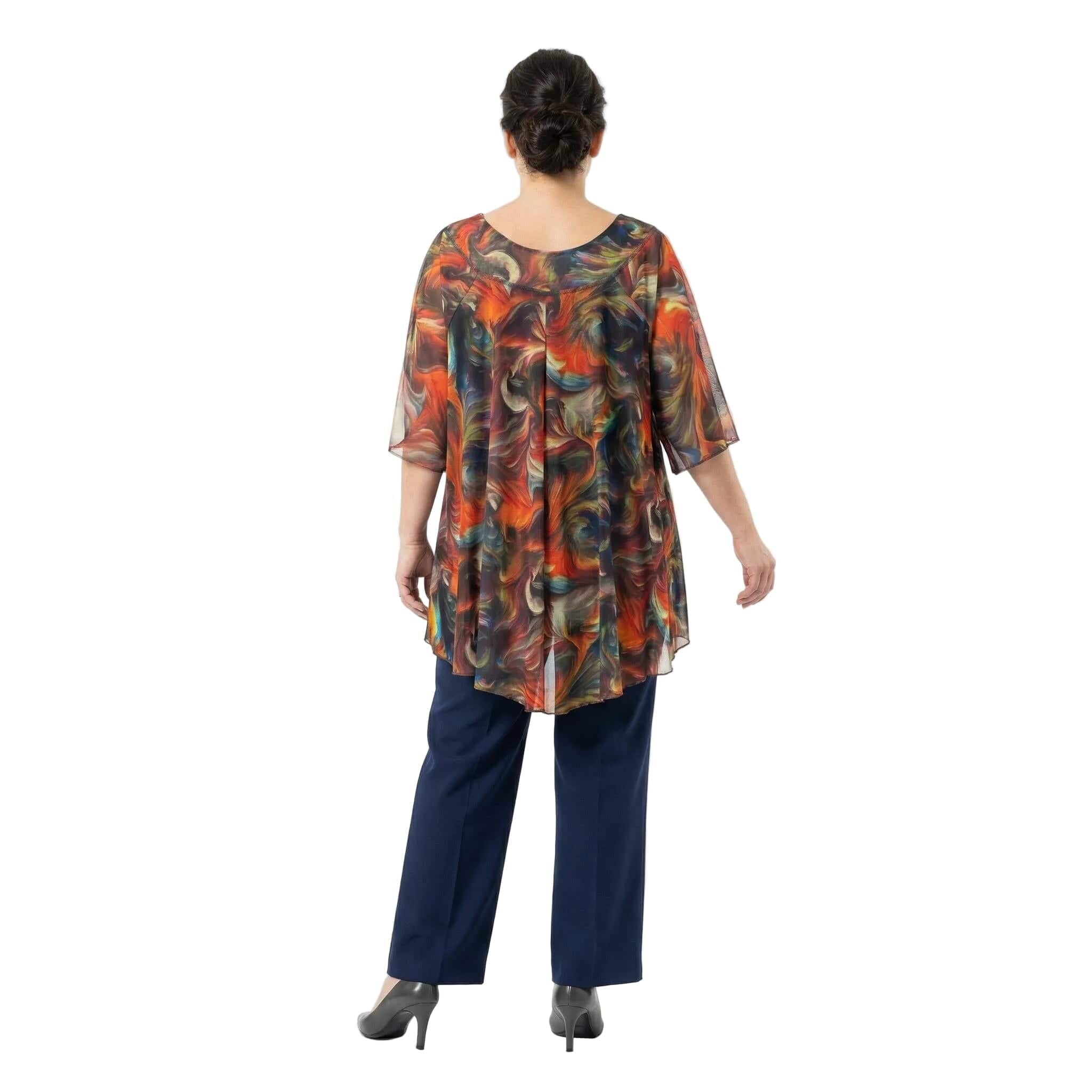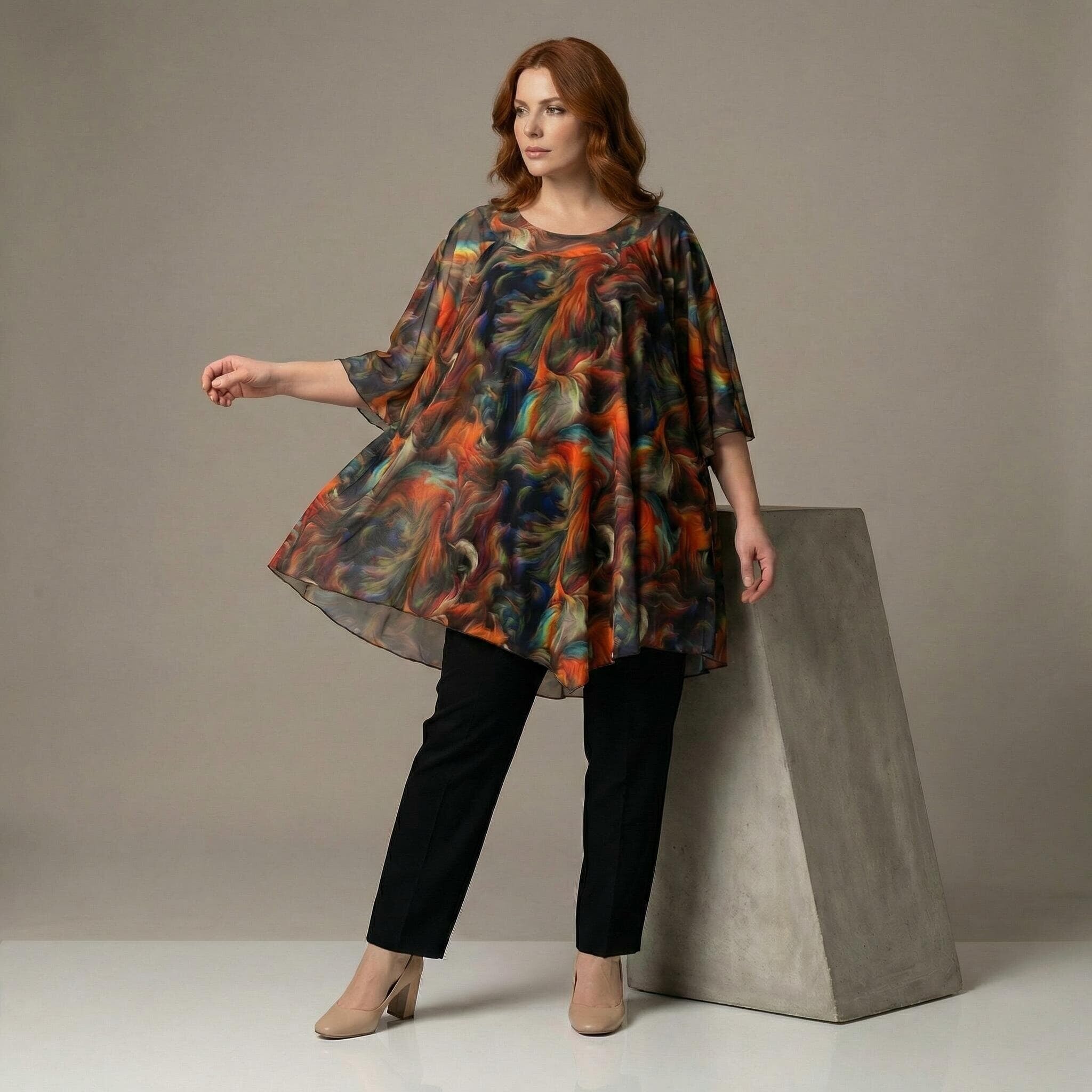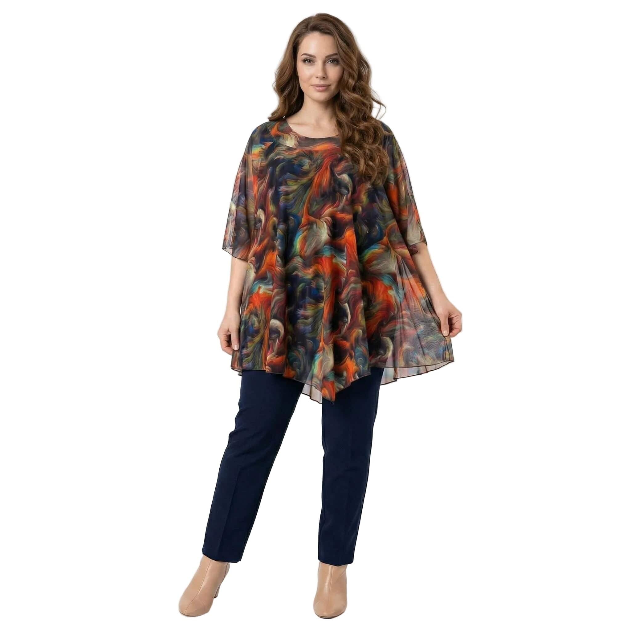 Преобразете празничната си визия с тази изящна официална туника, проектирана да носи усещане за лекота и увереност. Моделът е решен в модерна и практична конструкция от две части, съчетаваща удобен черен потник, който пада свободно по тялото, и ефирен горен слой от шифон в преливащи червени нюанси. Асиметричната дължина и разкроената кройка създават елегантен силует, изпълнен с движение, а ефектните цепки на ръкавите добавят допълнителен комфорт и усещане за прохлада. Тази дълга и впечатляваща туника е идеалният избор за официални поводи и специални събития през пролетно-летния сезон.