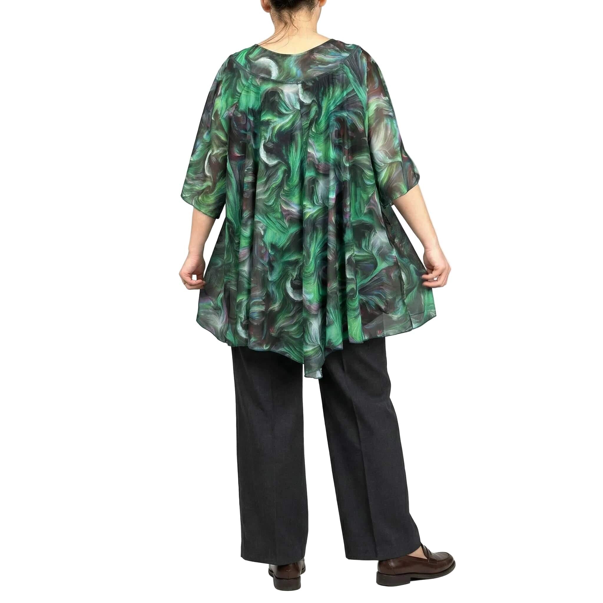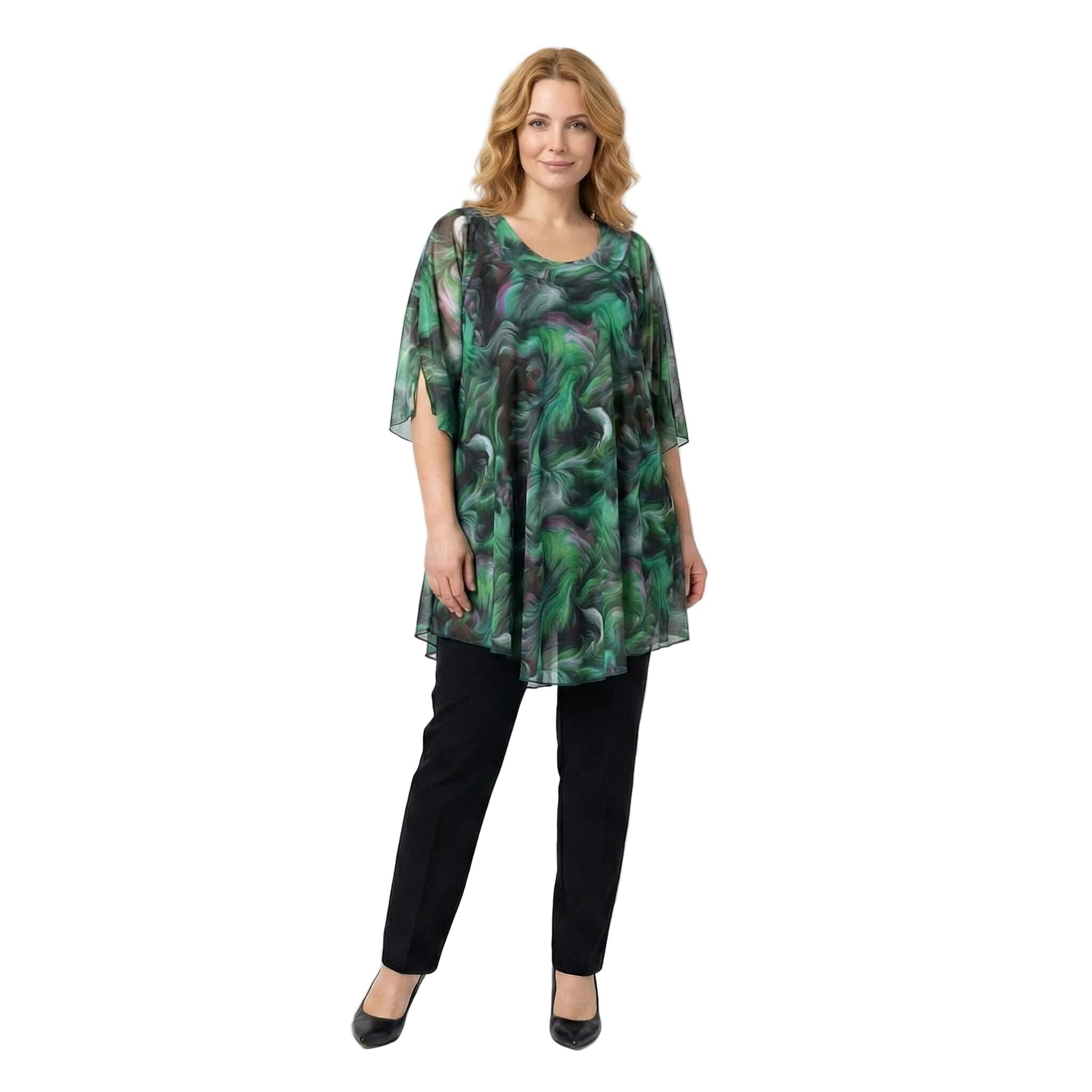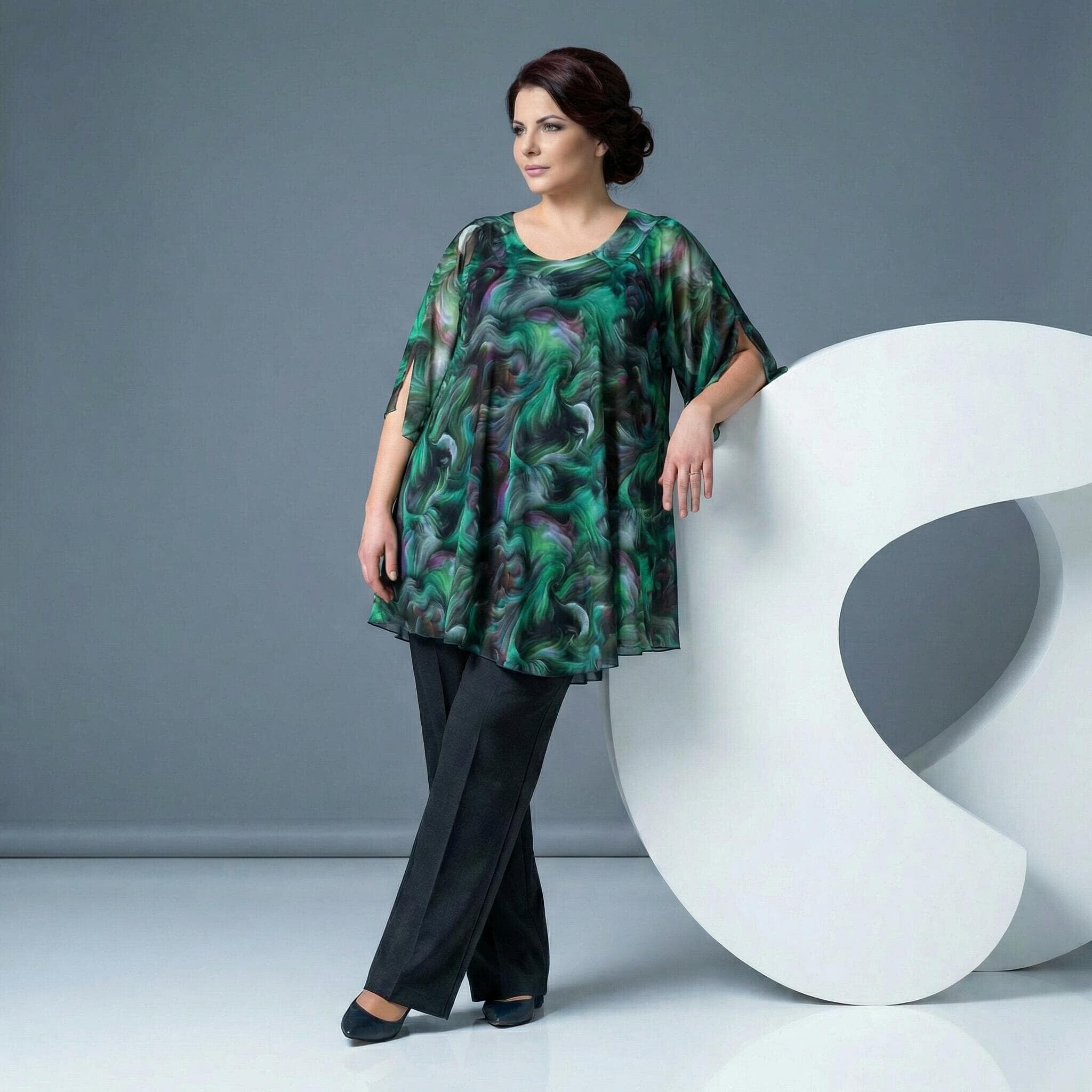 Преобразете визията си за всеки специален повод с тази елегантна макси туника, създадена да носи усещане за лекота и увереност. Моделът впечатлява със своя свеж цветен принт и модерна асиметрична линия, която издължава силуета. Конструкцията от две части съчетава комфортен основен потник с дебела презрамка и ефирна горна част, падаща свободно около тялото. Разкроената кройка и ръкавите с ефектни цепки осигуряват несравнима свобода на движението, превръщайки тази туника в идеален избор за официални събития през пролетно-летния сезон.