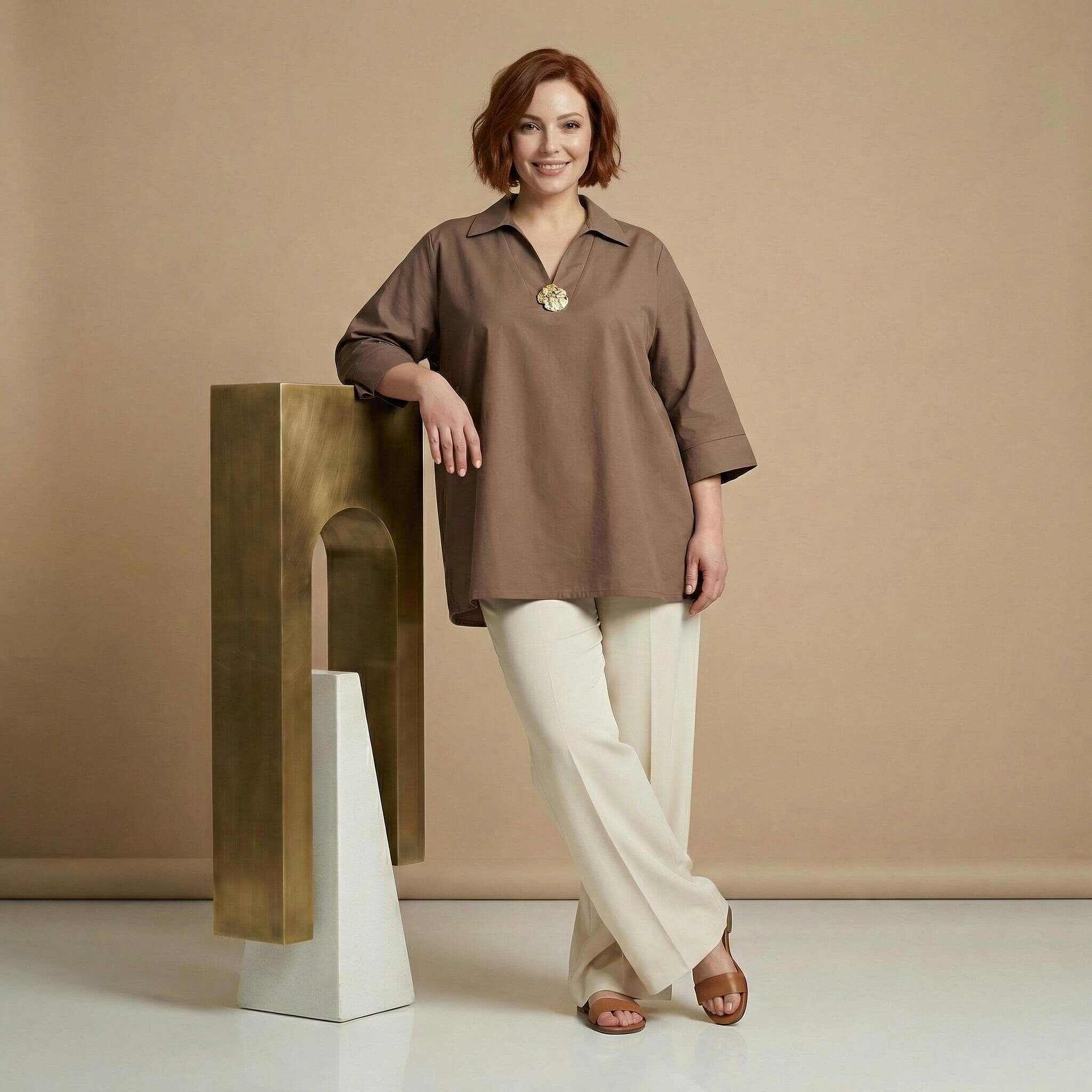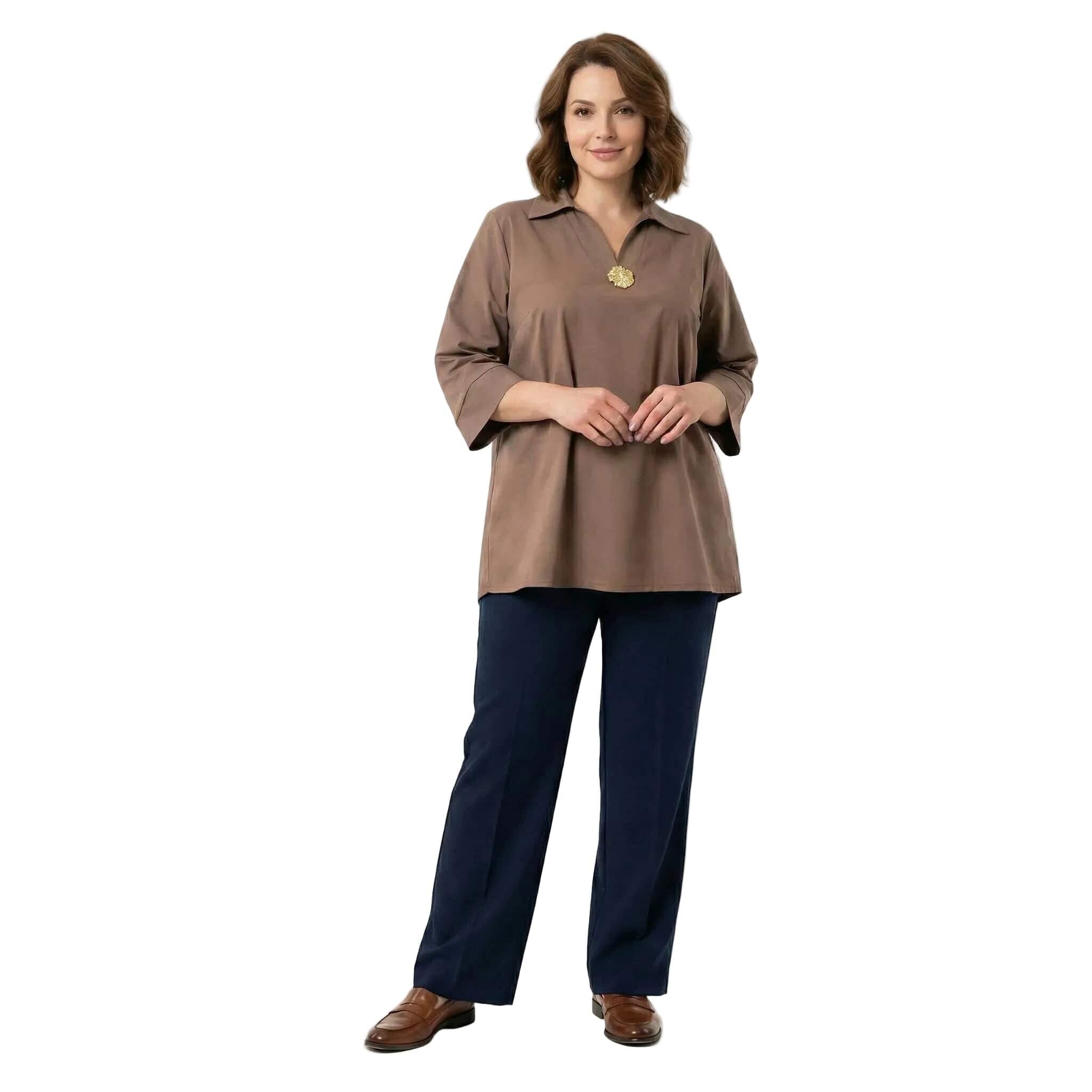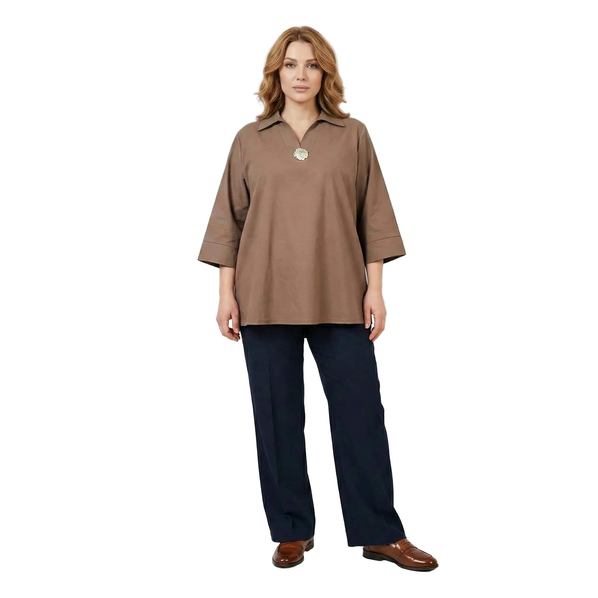 Открийте съвършения баланс между елегантност и комфорт с тази официална дамска макси риза в наситен и актуален цвят мока. Изработена от 100% висококачествен памук, материята е мека, дишаща и изключително приятна на допир, което я прави идеален избор за сезоните пролет и лято. Моделът се отличава със свободна, разкроена кройка, която пада тежко и създава красив, женствен силует, осигурявайки увереност и свобода на движението за дамите с пищни форми. Класическата якичка и V-образното деколте са допълнени от изящен декоративен елемент, който придава нотка лукс и завършеност на визията. Тази риза е перфектното решение както за деловия гардероб, така и за специални поводи, съчетавайки стил и удобство в едно.