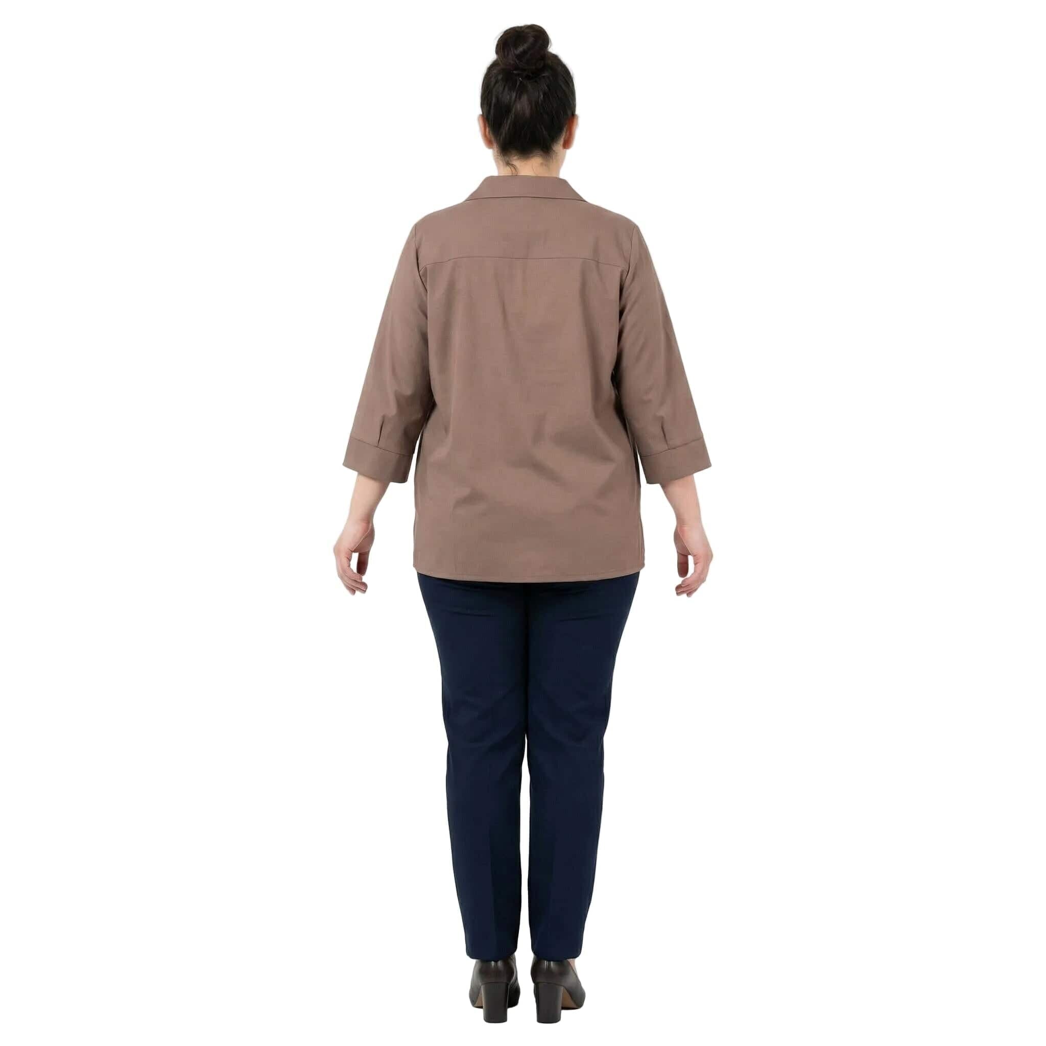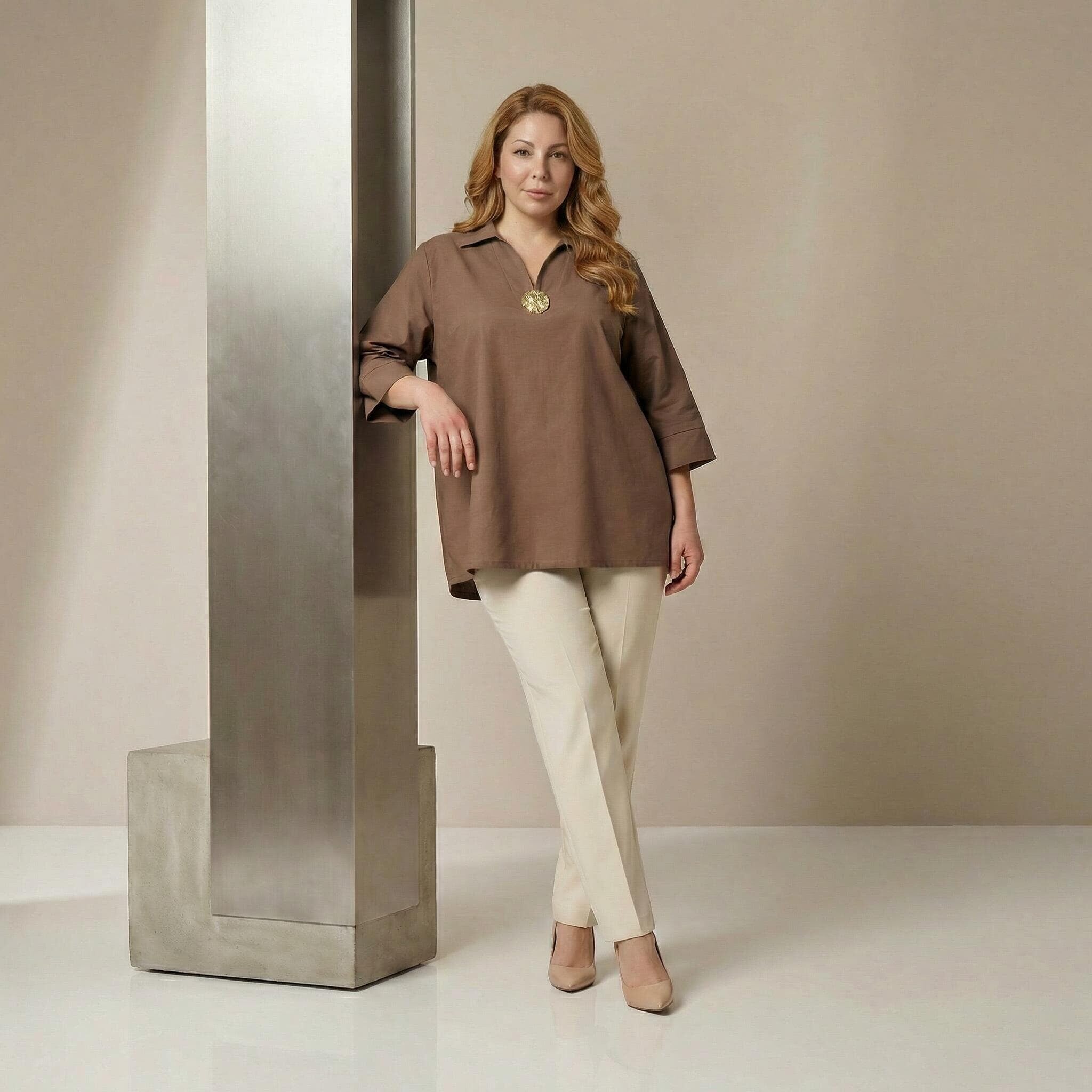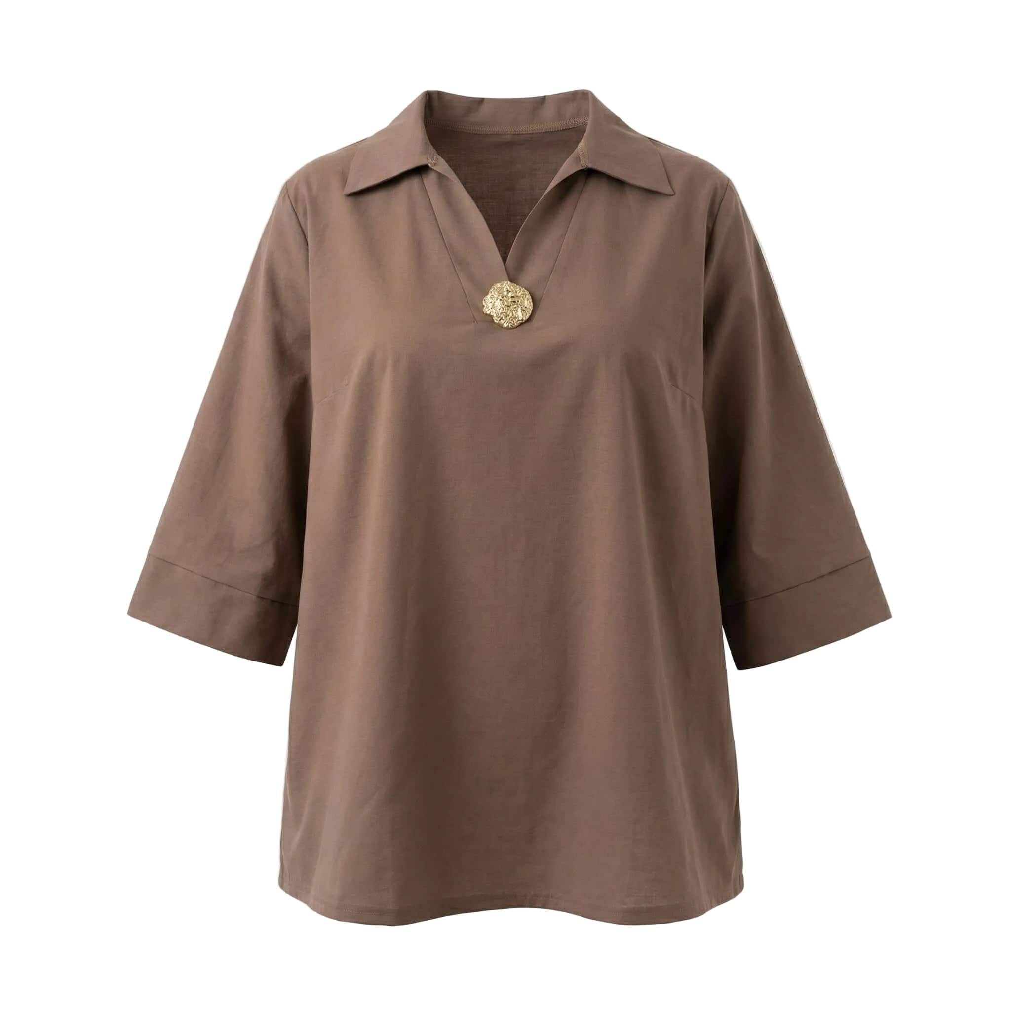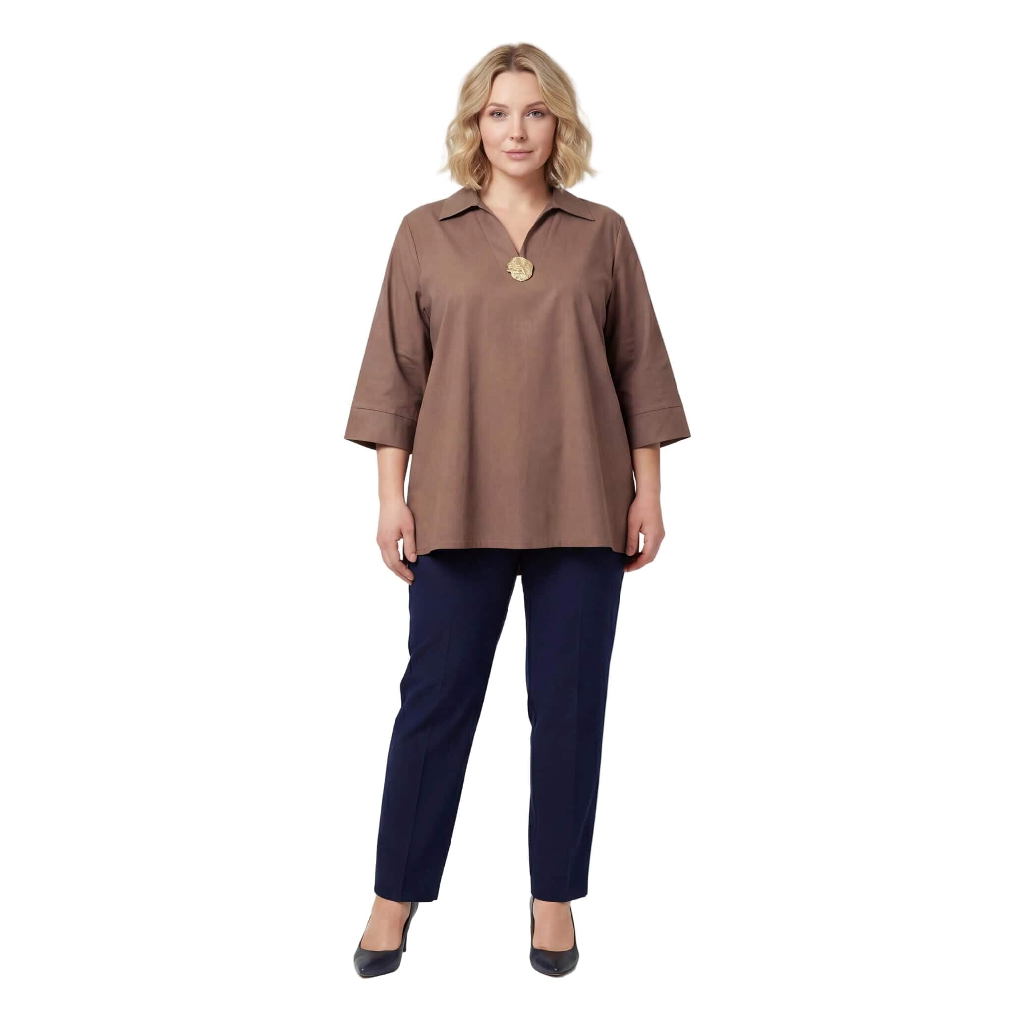 Открийте съвършения баланс между елегантност и комфорт с тази официална дамска макси риза в наситен и актуален цвят мока. Изработена от 100% висококачествен памук, материята е мека, дишаща и изключително приятна на допир, което я прави идеален избор за сезоните пролет и лято. Моделът се отличава със свободна, разкроена кройка, която пада тежко и създава красив, женствен силует, осигурявайки увереност и свобода на движението за дамите с пищни форми. Класическата якичка и V-образното деколте са допълнени от изящен декоративен елемент, който придава нотка лукс и завършеност на визията. Тази риза е перфектното решение както за деловия гардероб, така и за специални поводи, съчетавайки стил и удобство в едно.
