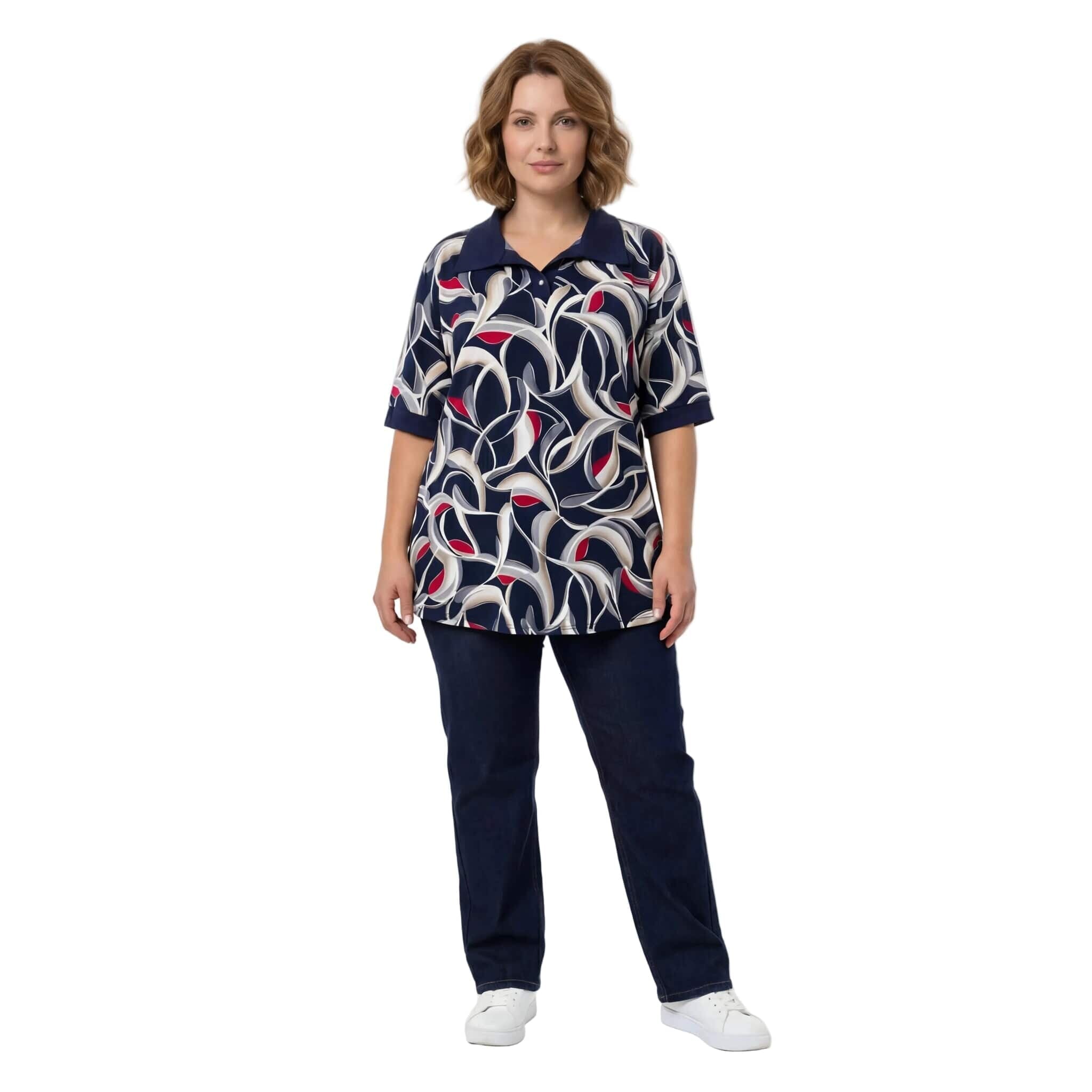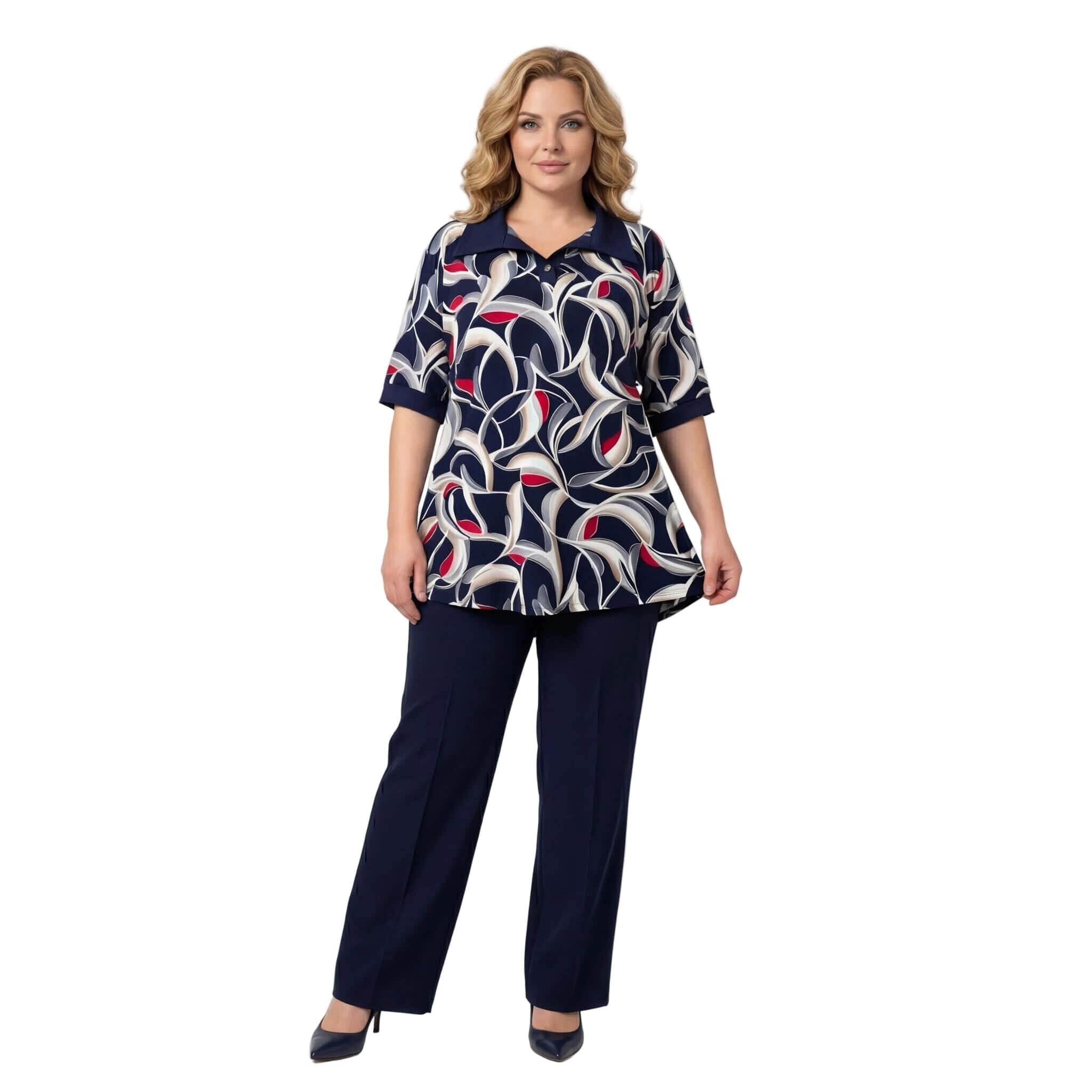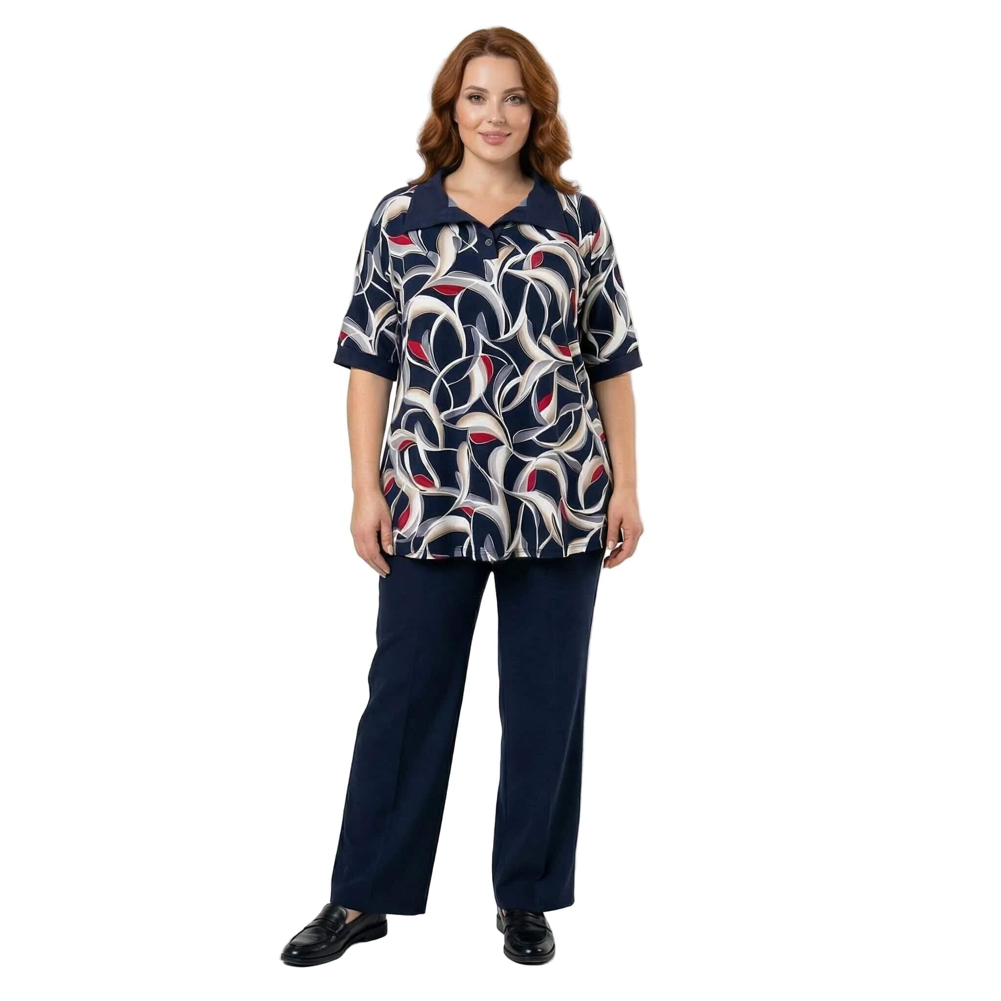 Открийте перфектното съчетание на елегантност и ненадминат комфорт с тази официална туника големи размери, създадена специално за дами с пищни форми. Моделът впечатлява със своя живописен абстрактен геометричен десен с детайли на точки, който внася свежест и изтънченост във вашата пролетно-лятна визия. Изработена от гладко, леко еластично трико с високо съдържание на вискоза, туниката предлага красиво падане на материята и пълна свобода на движението. Дизайнът се отличава с елегантна якичка тип поло, допълнена от нежно декоративно копче, и къси ръкави, завършени с плътни маншети. Разкроеният силует и заобленият подгъв, който е леко удължен в задната част, осигуряват изключително женствено и хармонично излъчване, перфектно за вашите специални поводи.