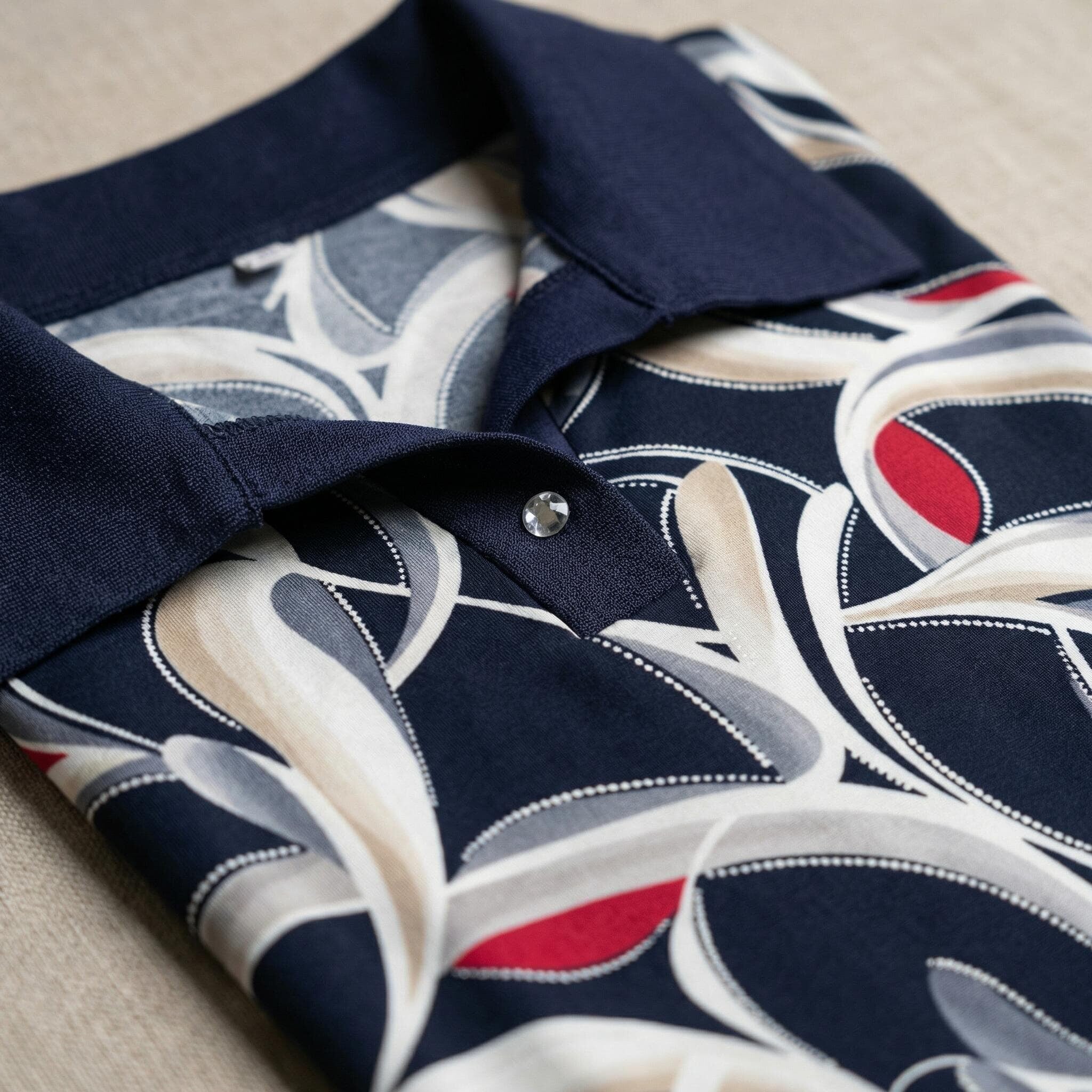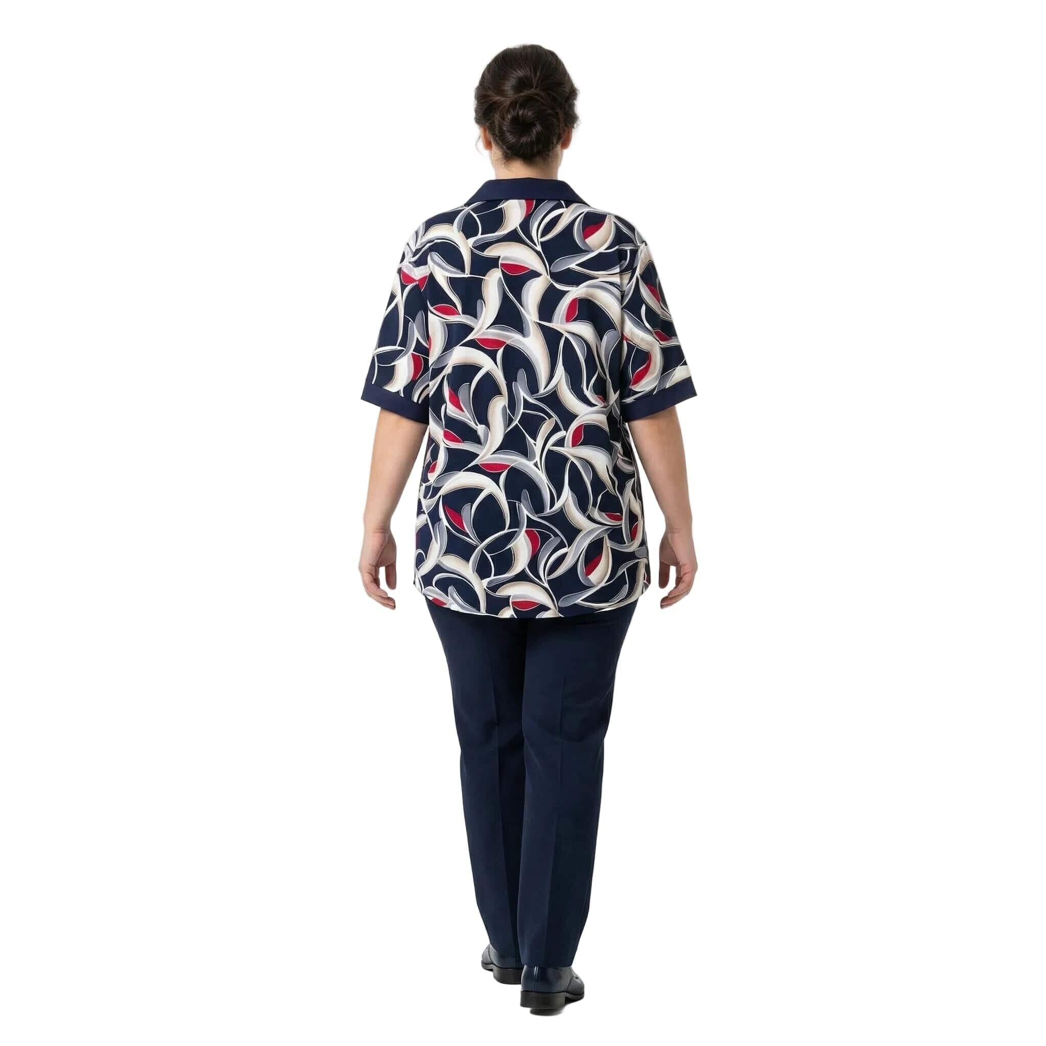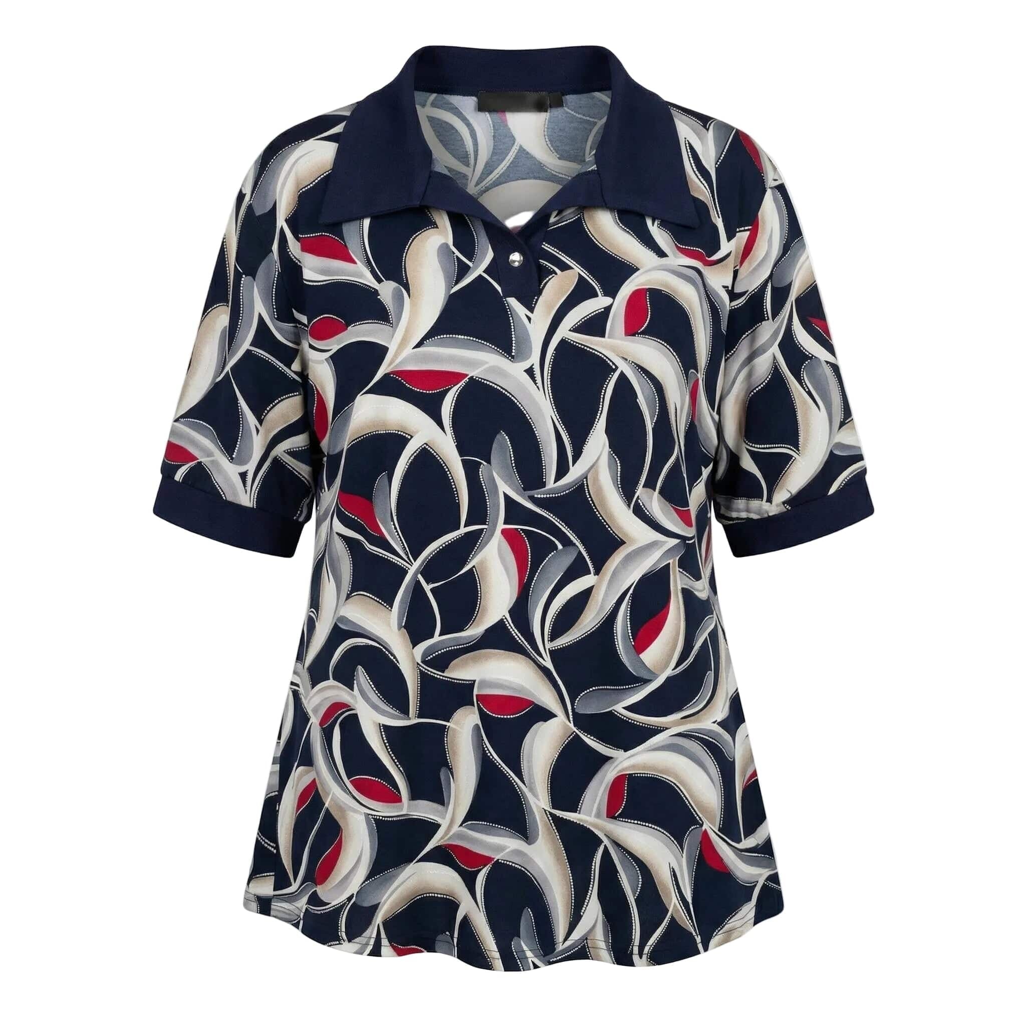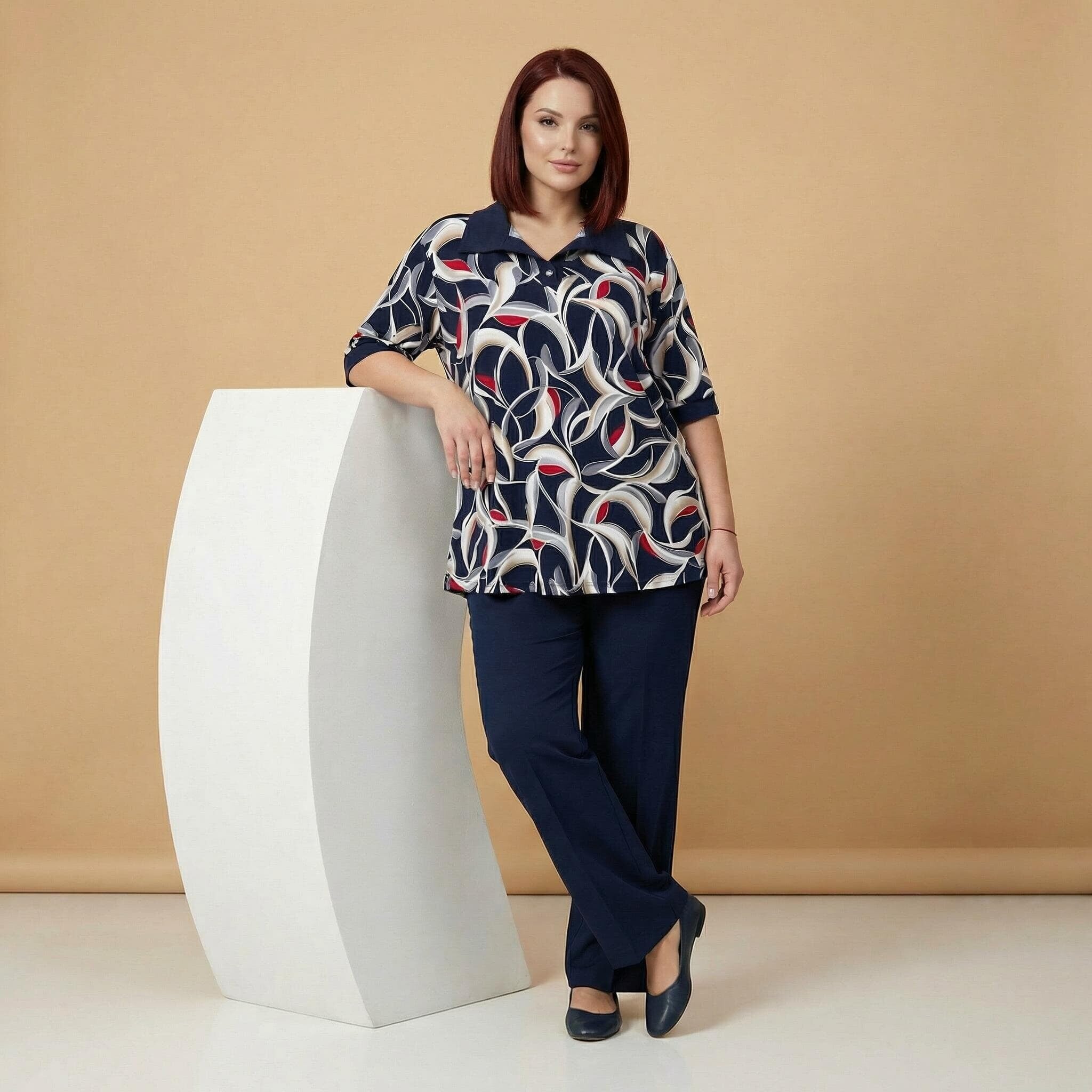 Открийте перфектното съчетание на елегантност и ненадминат комфорт с тази официална туника големи размери, създадена специално за дами с пищни форми. Моделът впечатлява със своя живописен абстрактен геометричен десен с детайли на точки, който внася свежест и изтънченост във вашата пролетно-лятна визия. Изработена от гладко, леко еластично трико с високо съдържание на вискоза, туниката предлага красиво падане на материята и пълна свобода на движението. Дизайнът се отличава с елегантна якичка тип поло, допълнена от нежно декоративно копче, и къси ръкави, завършени с плътни маншети. Разкроеният силует и заобленият подгъв, който е леко удължен в задната част, осигуряват изключително женствено и хармонично излъчване, перфектно за вашите специални поводи.